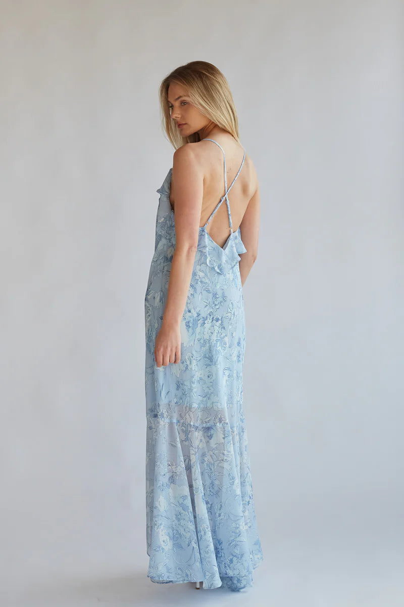 Raise a glass in the Ellery Floral Ruffle Maxi Dress! This feminine dress features a beautiful floral print, v neckline, adjustable spaghetti straps that criss-cross in the back, a front slit, and a ruffle trim that cascades from the neckline to the hem. Pair with a simple heel to complete this gorgeous look!