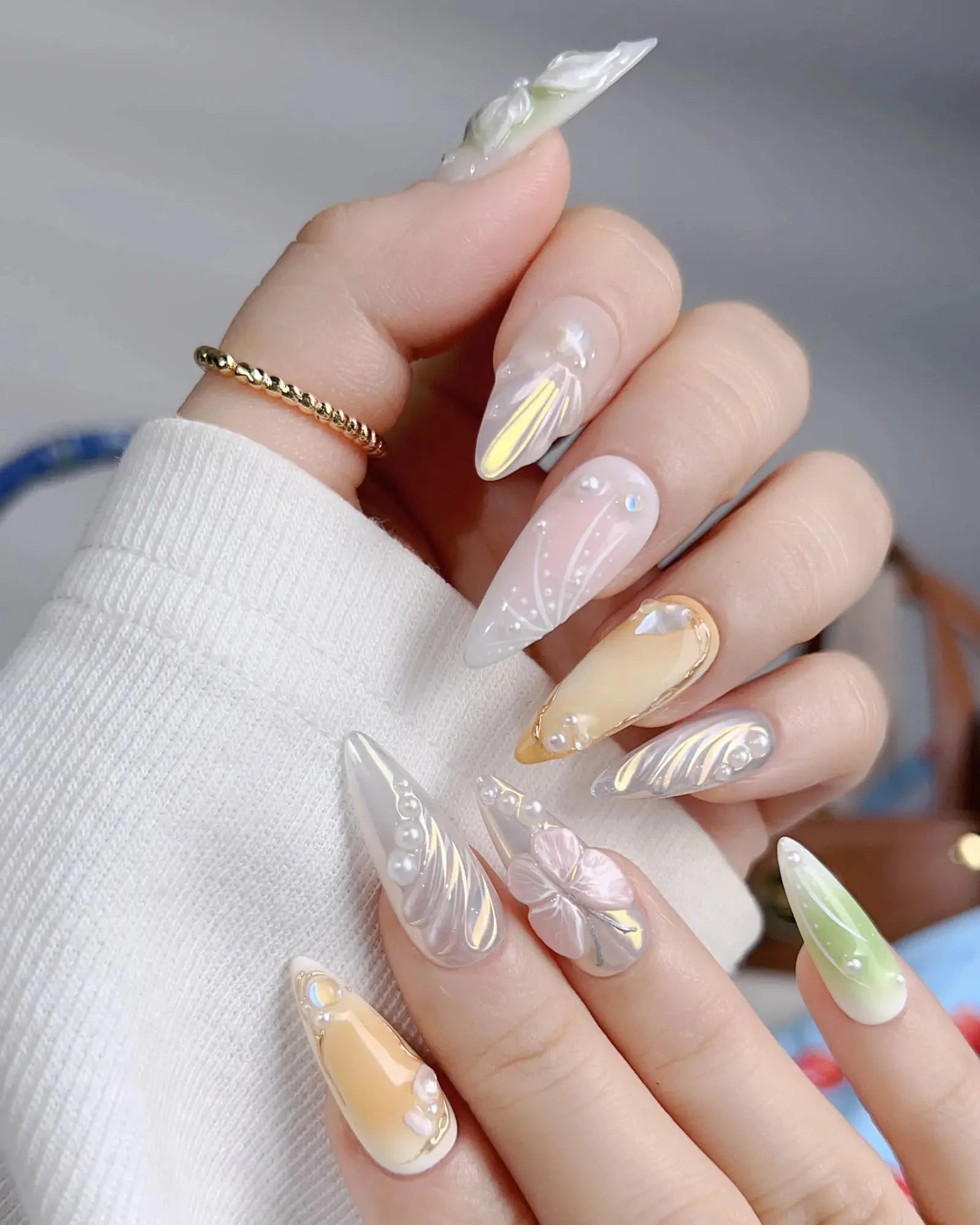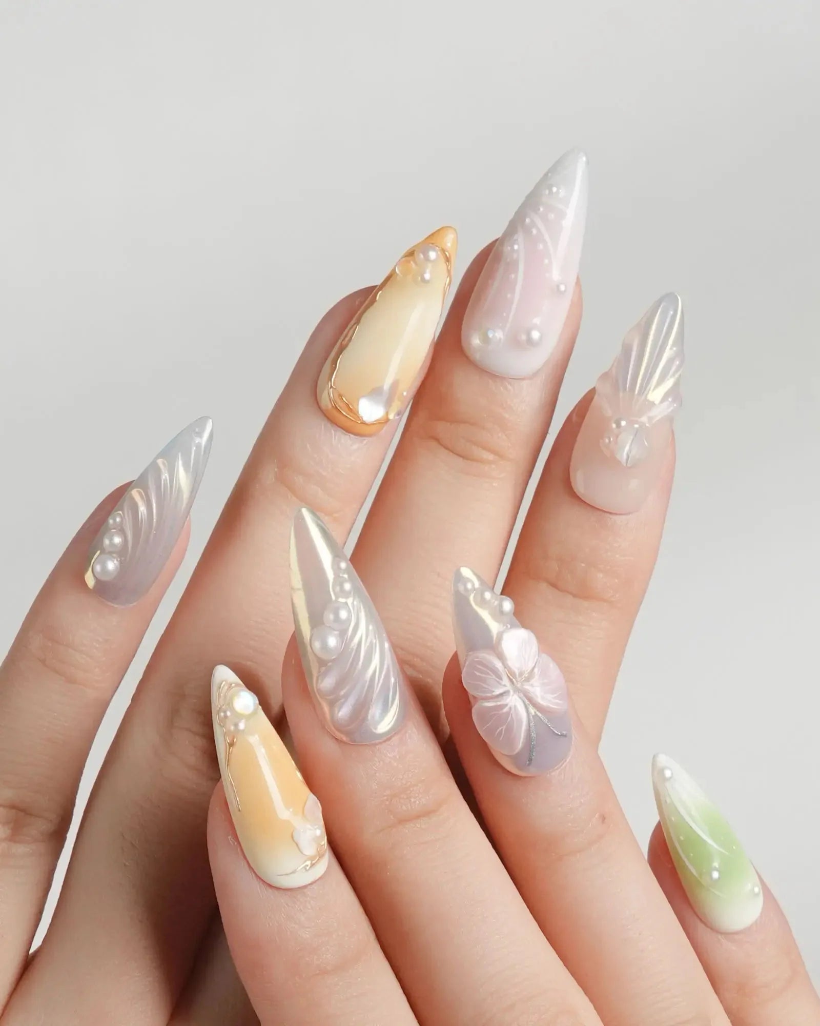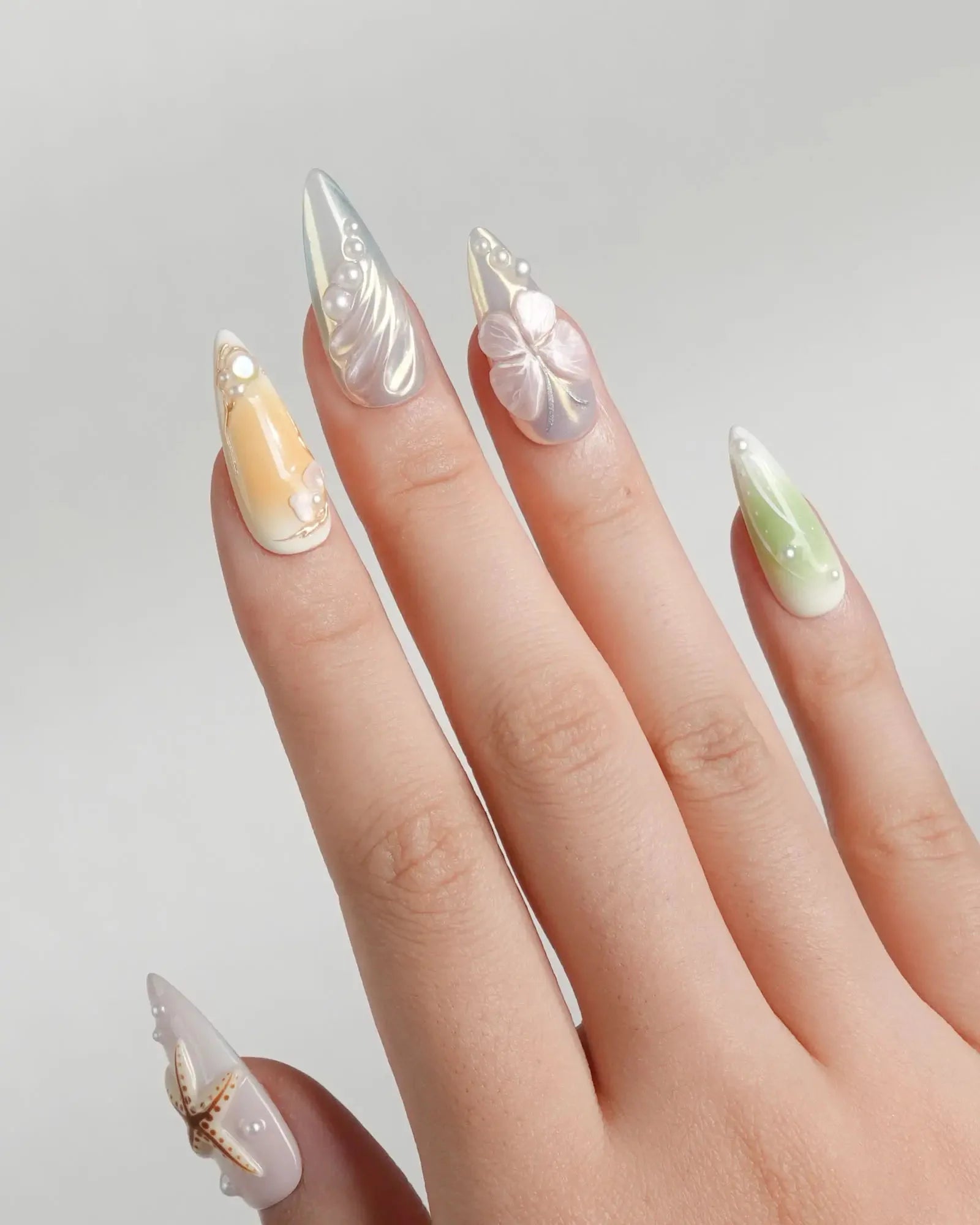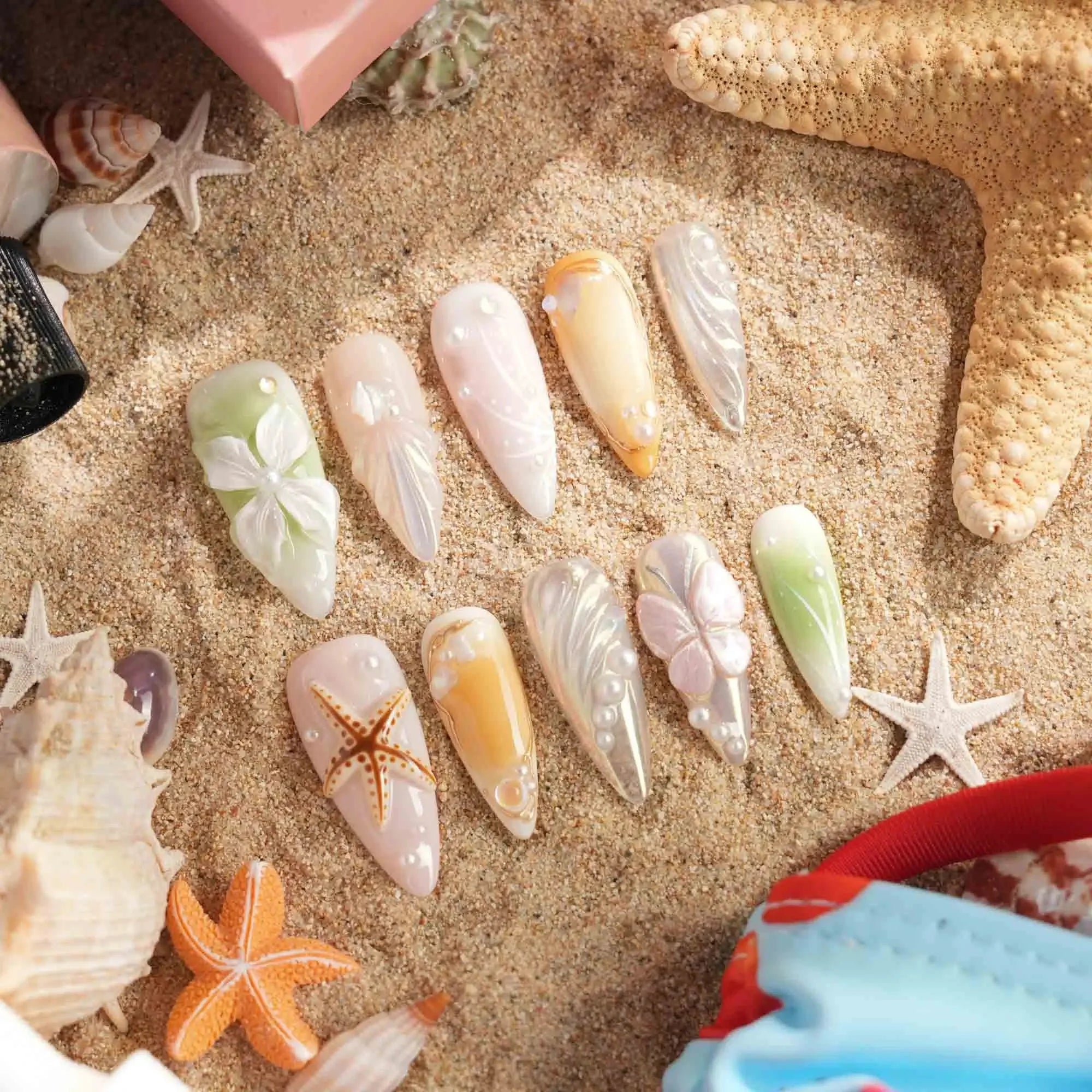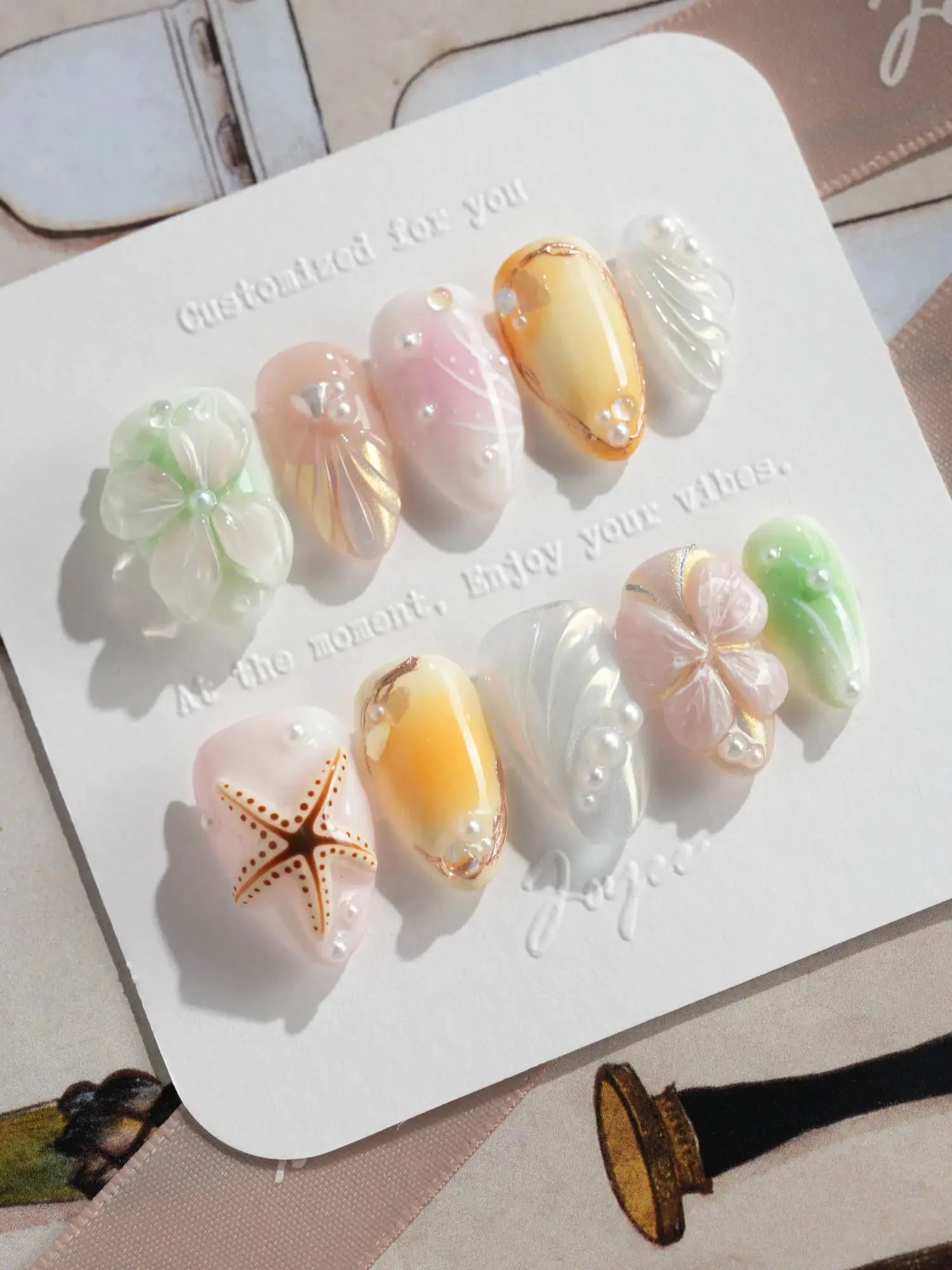 Like a tiny island from a dream, delicate flowers, butterflies, and starfish bloom quietly in the pastel sea breeze. Fairy Bay uses soft, harmonious shades to create a kind of effortless elegance—understated but unforgettable. Pair it with white dresses, straw hats, or just a romantic mood. It’s made for those who shine without shouting.
