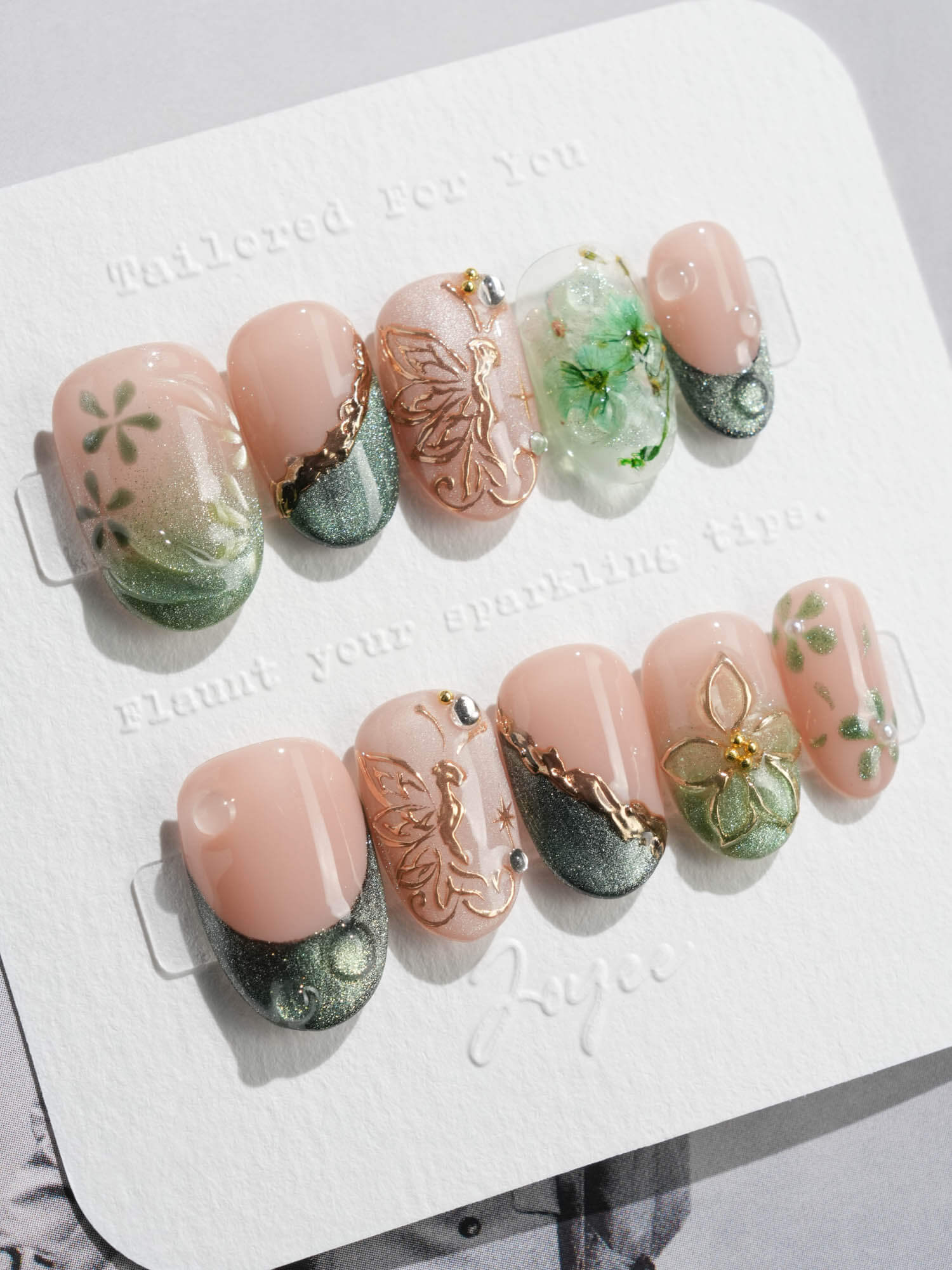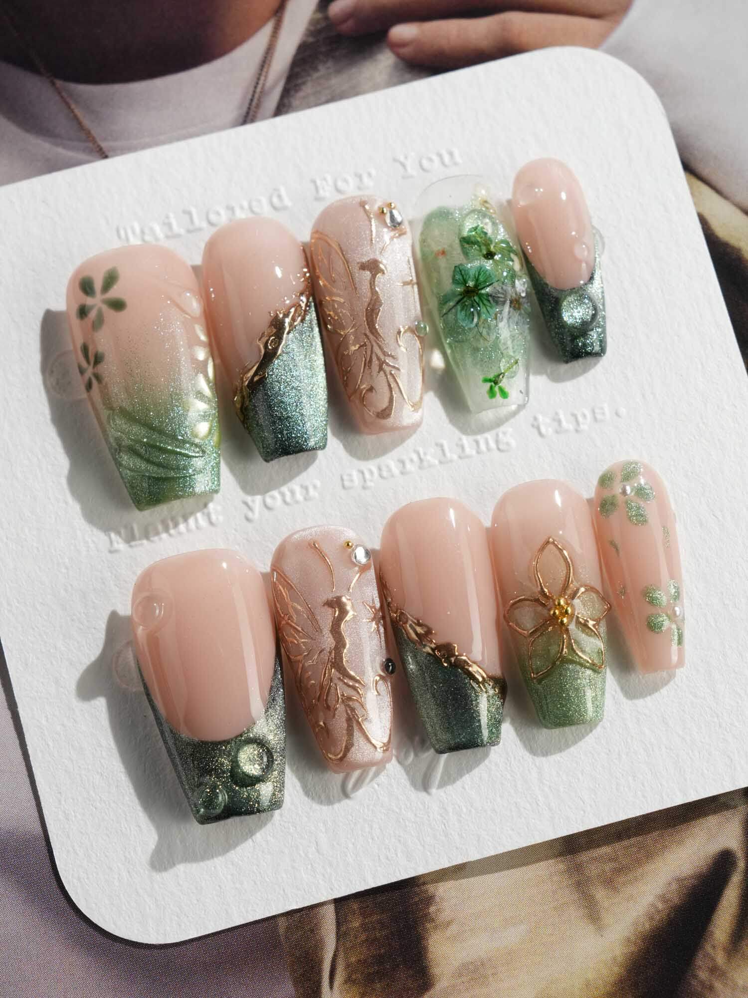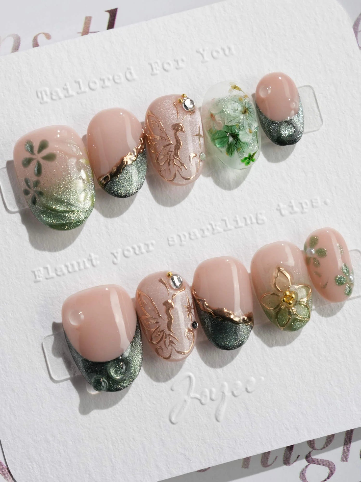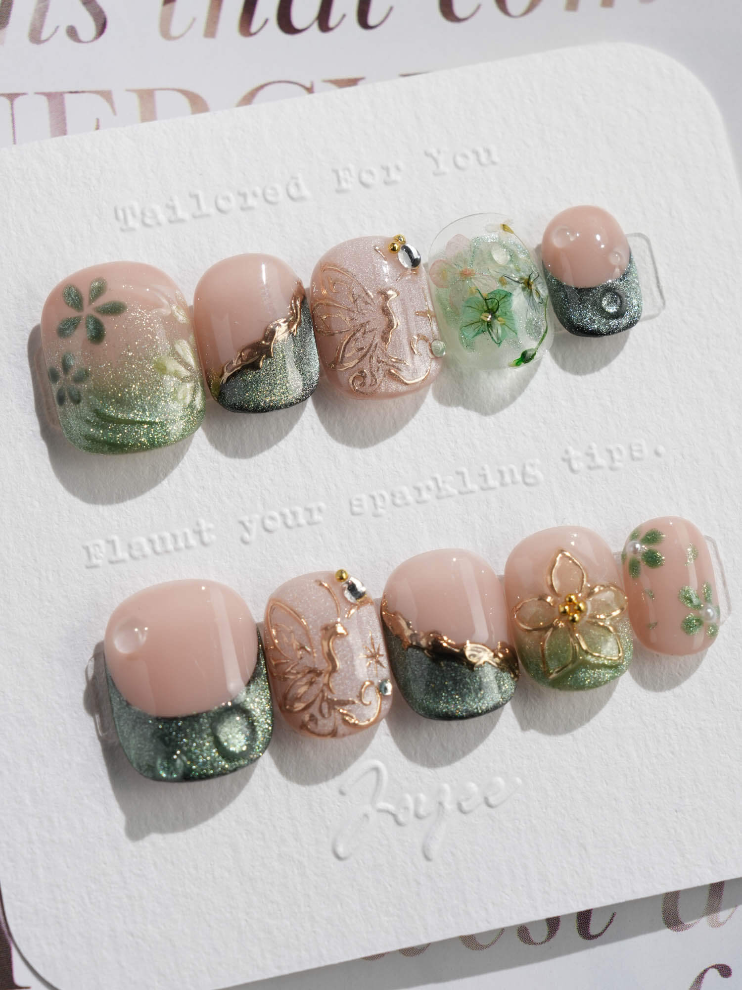 This JoyeeNails exclusive blends forestcore charm with fine gold detailing. Featuring deep forest green French tips, dewdrop-like glossy textures, and soft nude pink bases, each nail carries elements of hand-placed pressed flowers and delicate gold butterfly linework. A poetic harmony of nature and shimmer—this design channels the spirit of Photosynthesis 2.0.