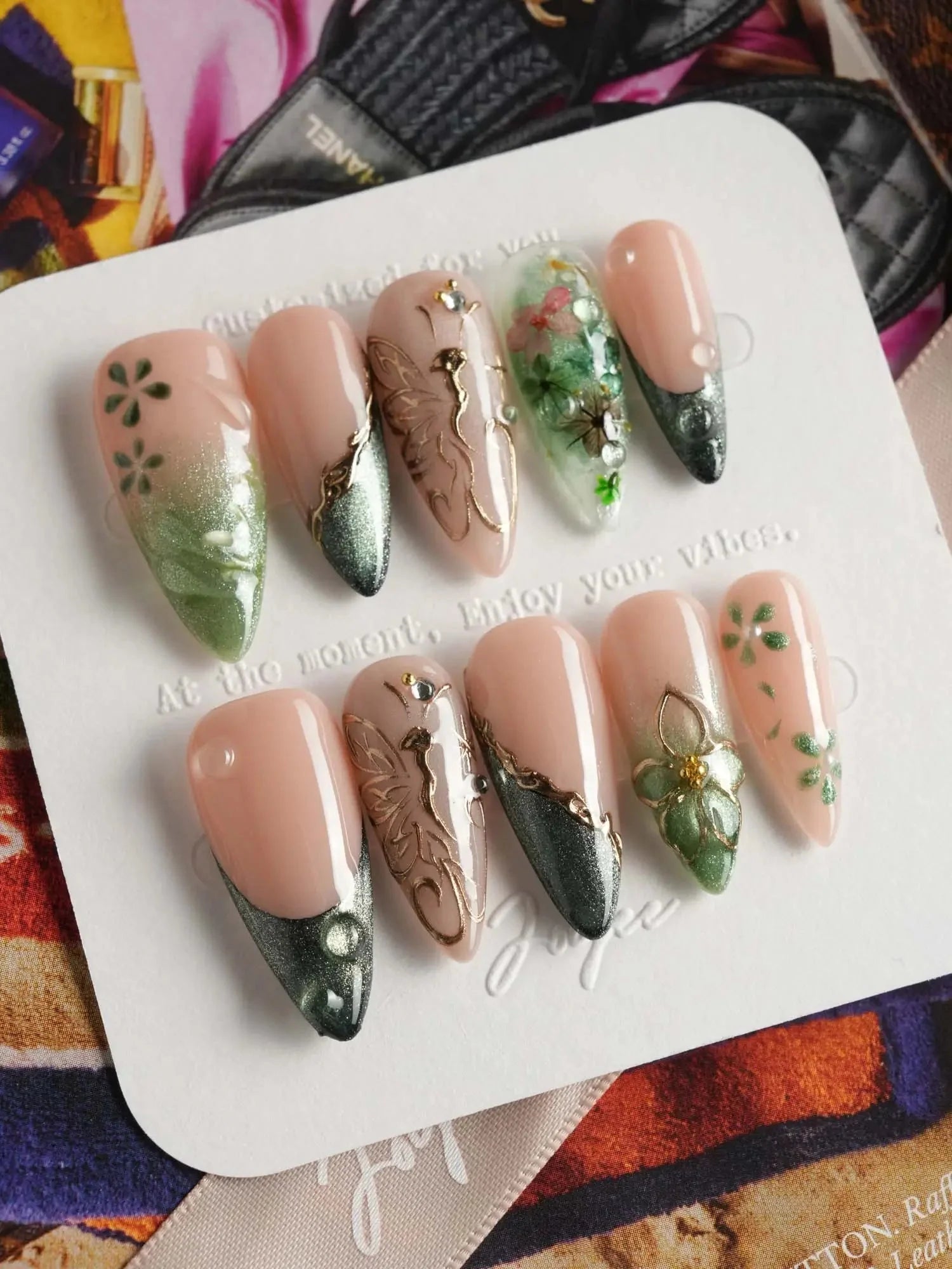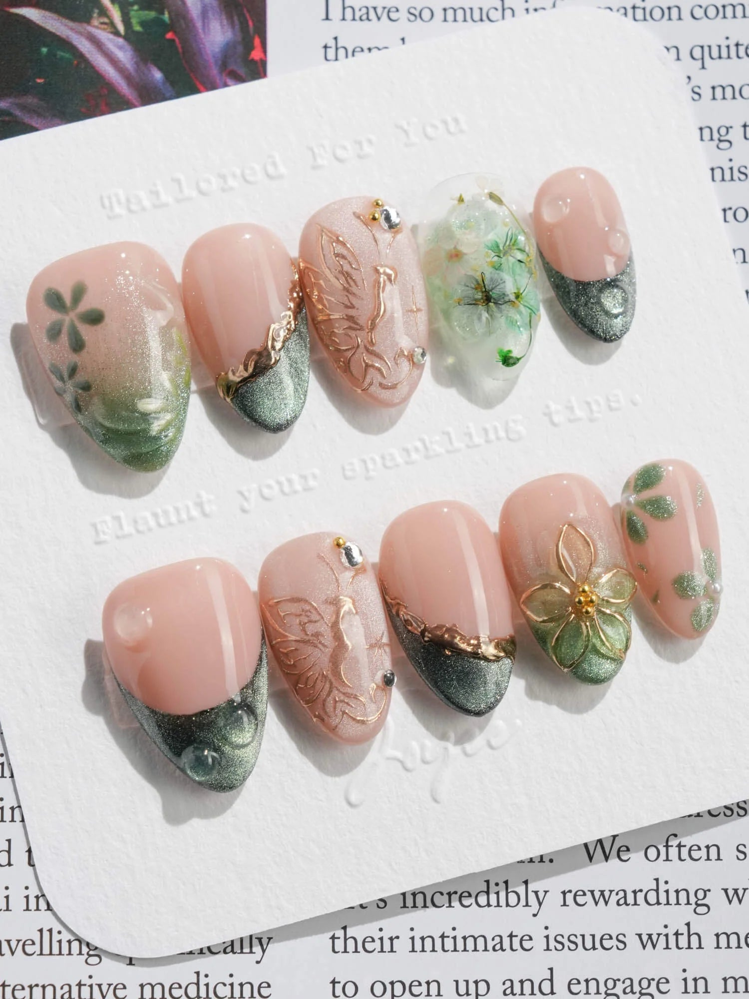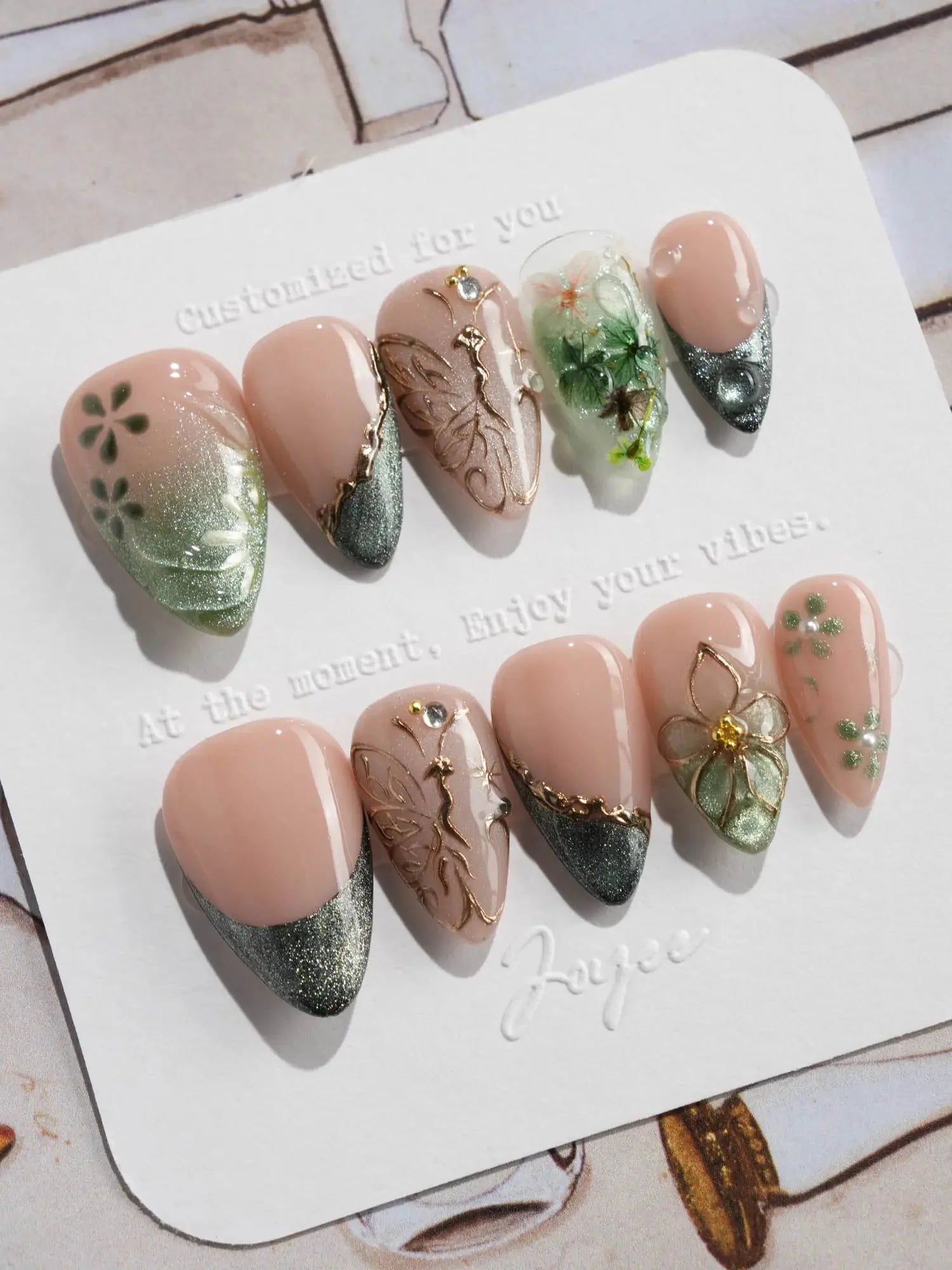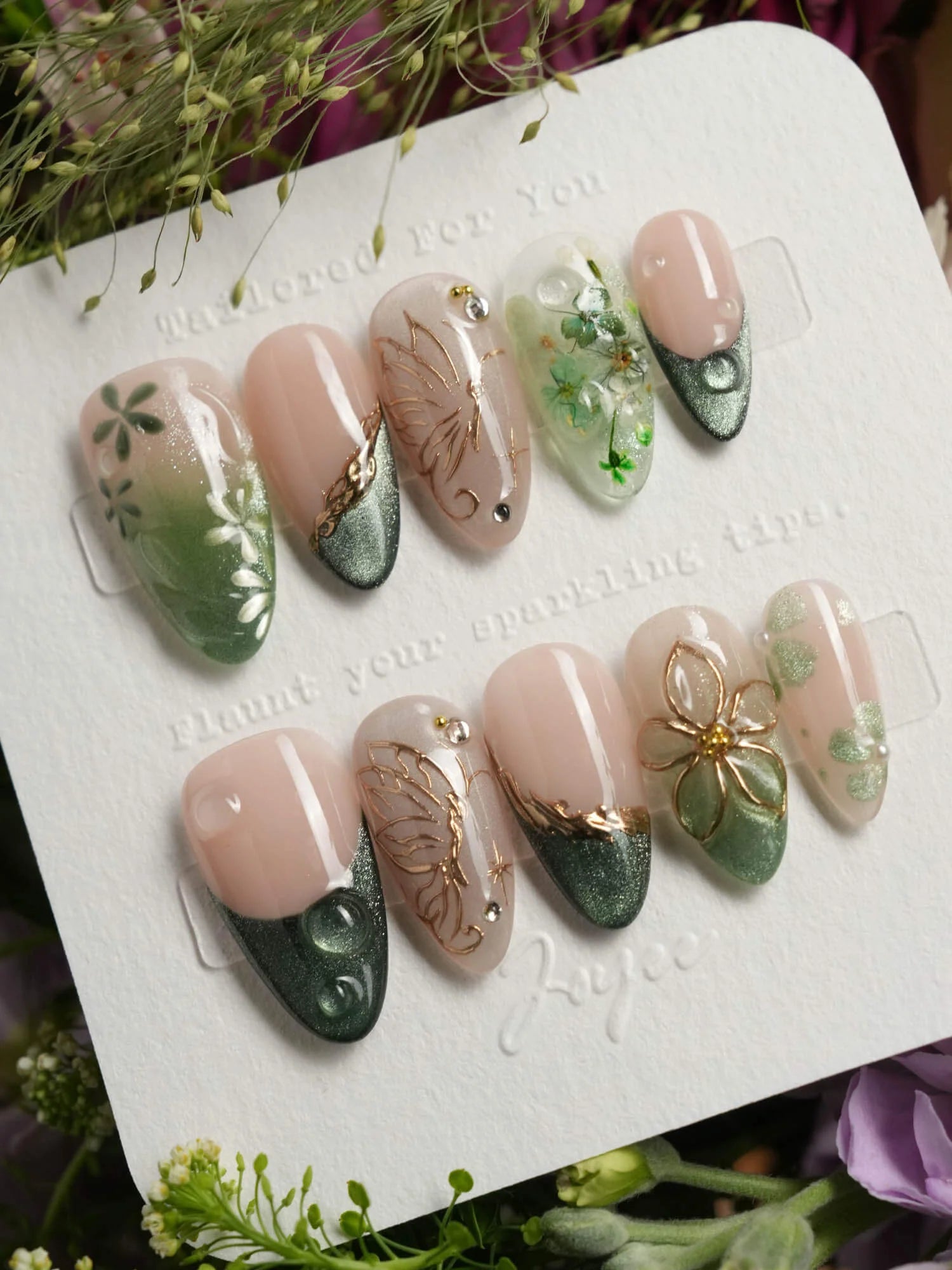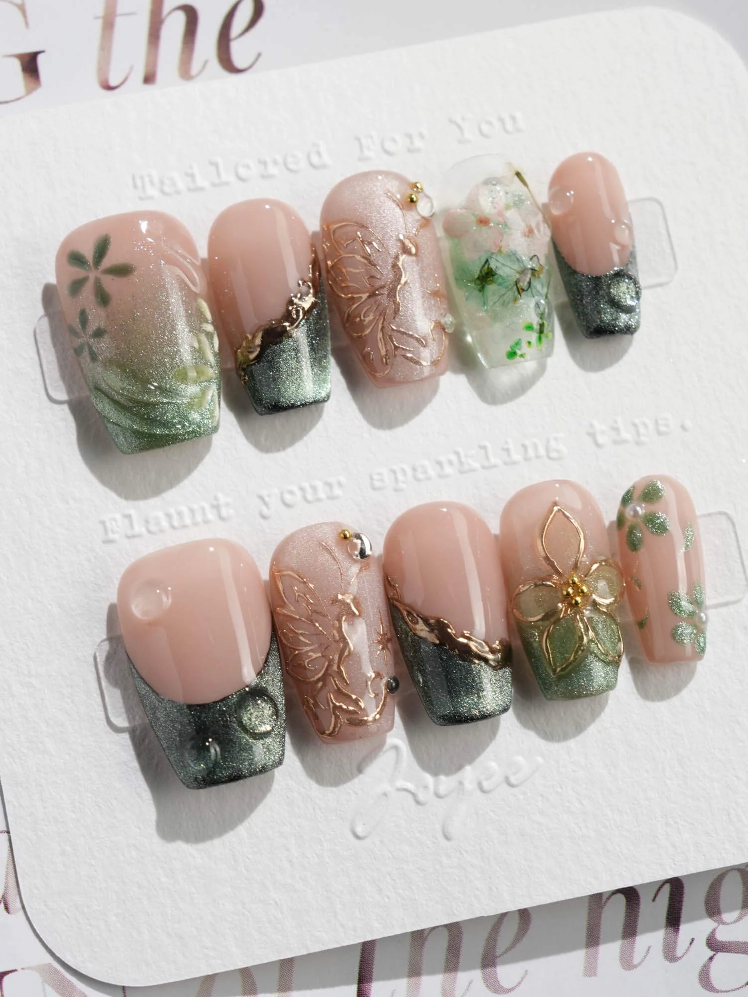 This JoyeeNails exclusive blends forestcore charm with fine gold detailing. Featuring deep forest green French tips, dewdrop-like glossy textures, and soft nude pink bases, each nail carries elements of hand-placed pressed flowers and delicate gold butterfly linework. A poetic harmony of nature and shimmer—this design channels the spirit of Photosynthesis 2.0.