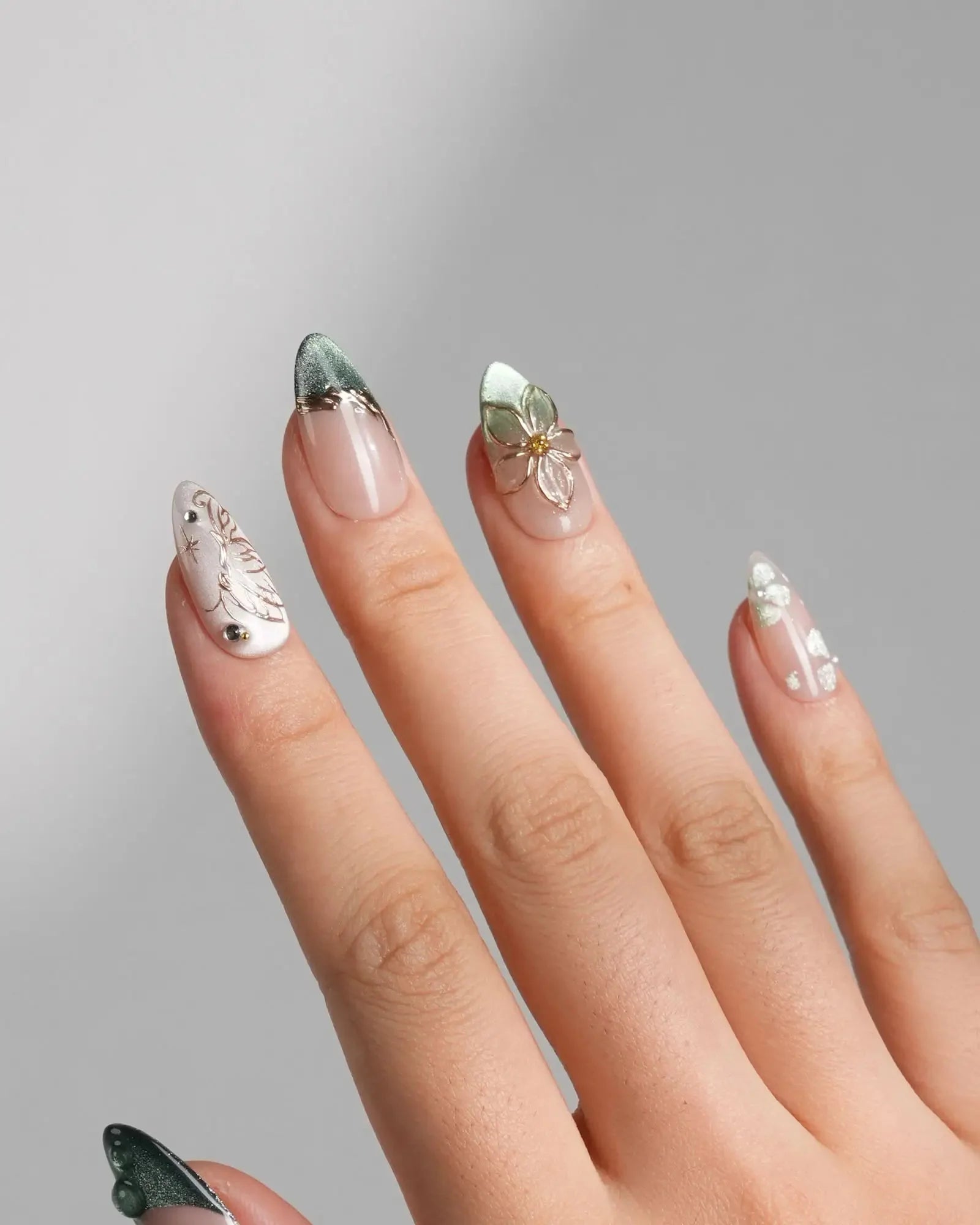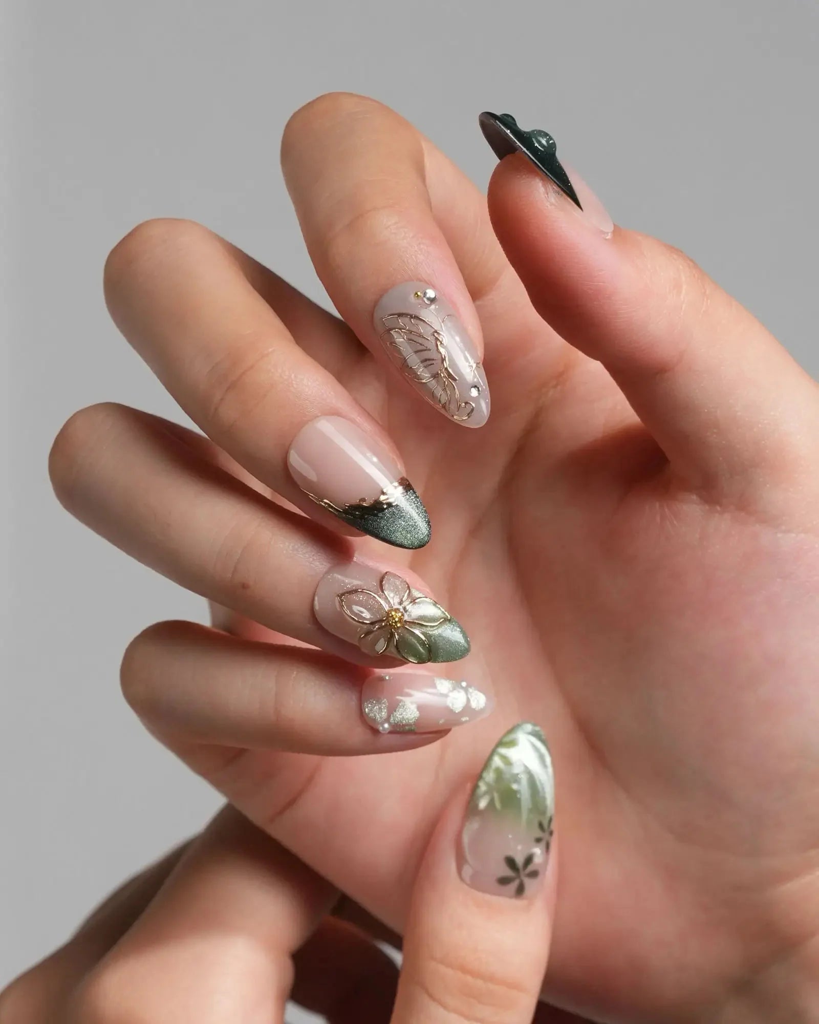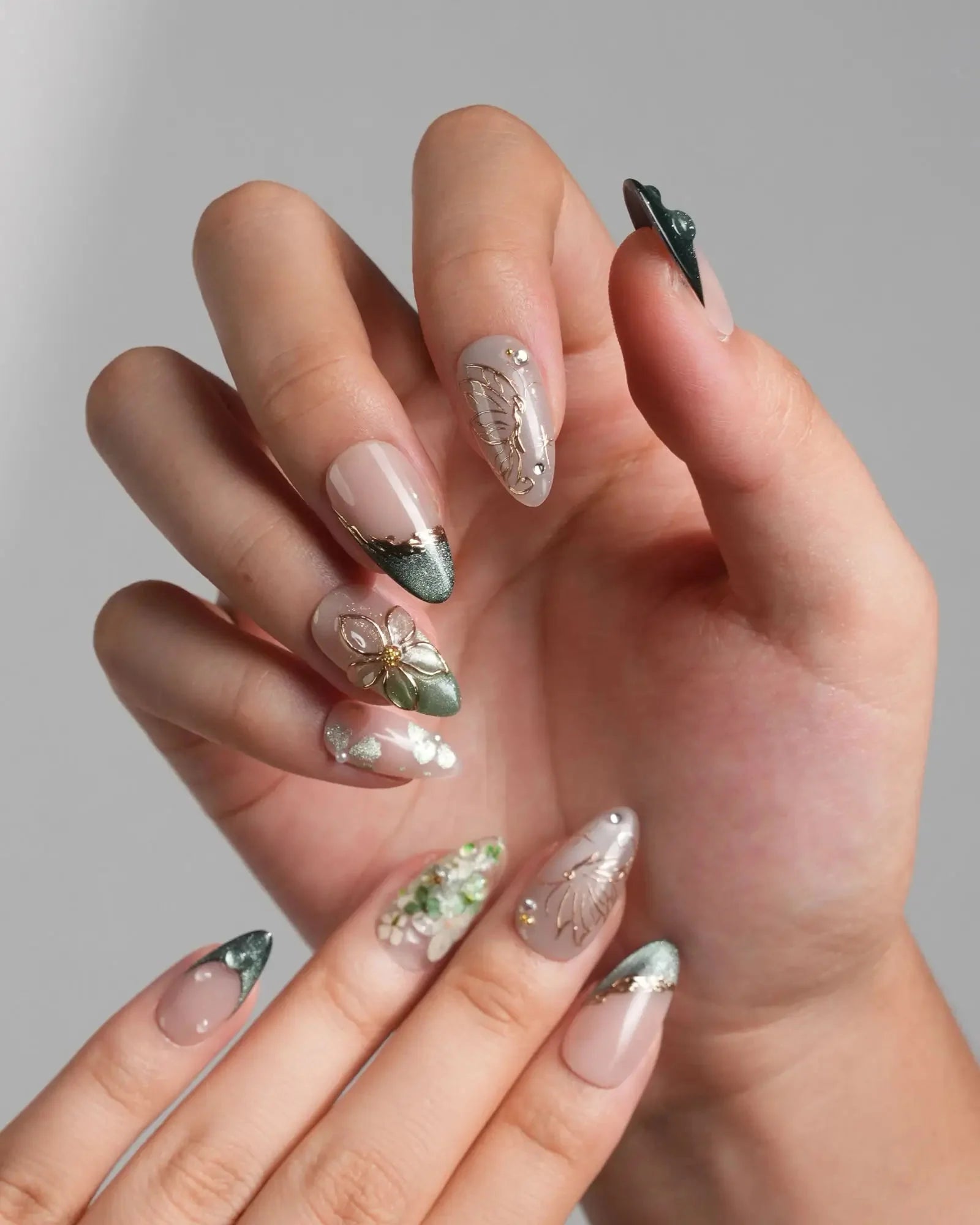 Forest Green French Nails with Gold Butterfly & Pressed Flower Accents