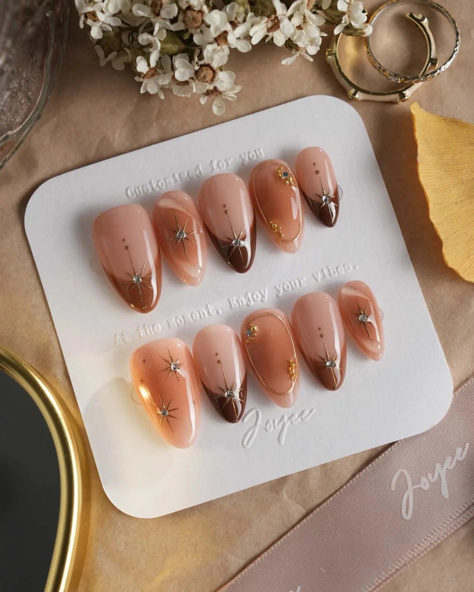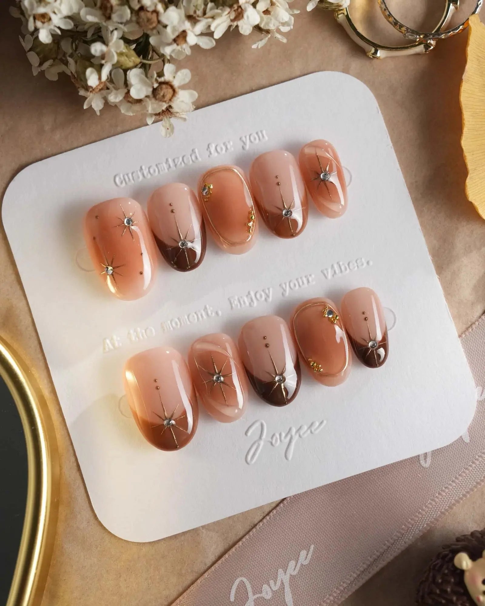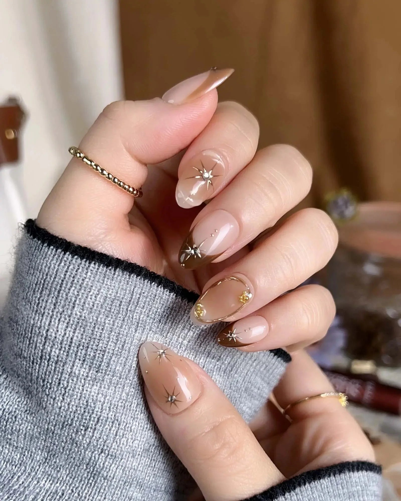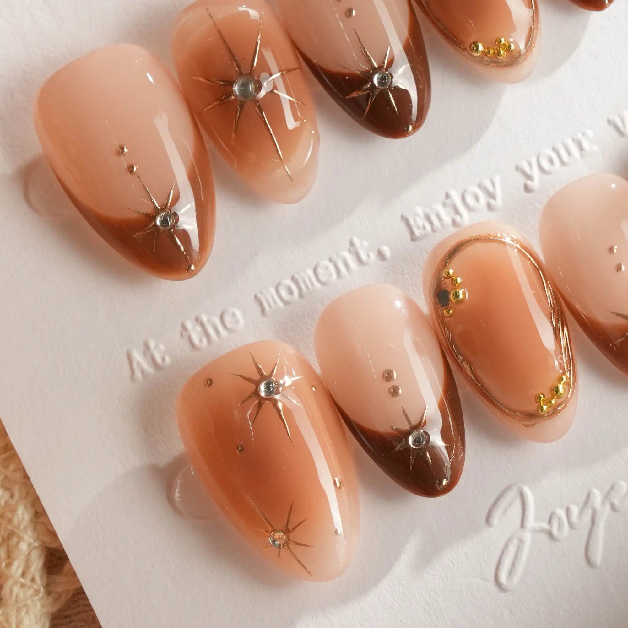 With soft brown gradients, blush-style smudges, and golden accents, this set feels like autumn makeup on nails. A touch of glam, perfect for date nights or a cozy café afternoon.