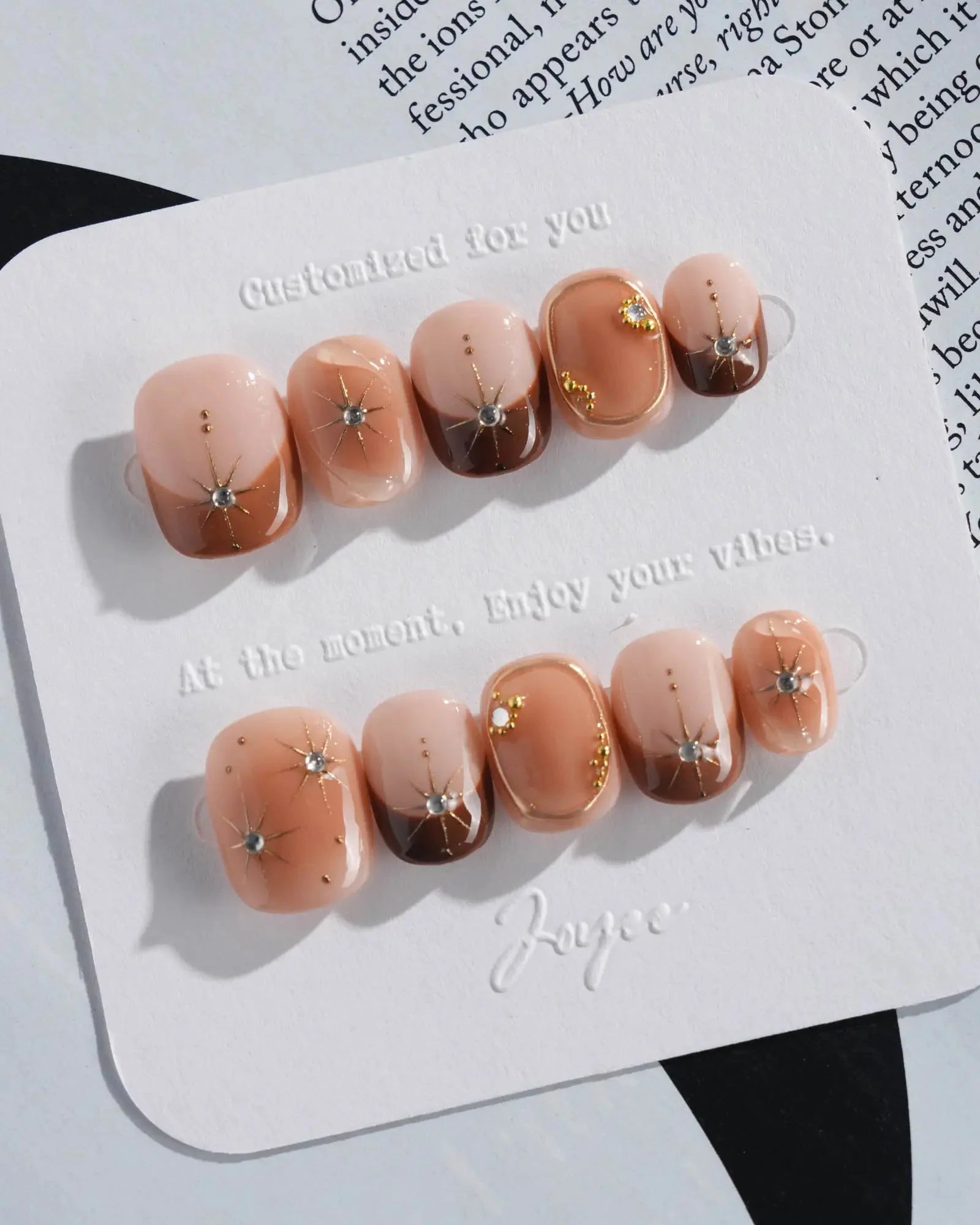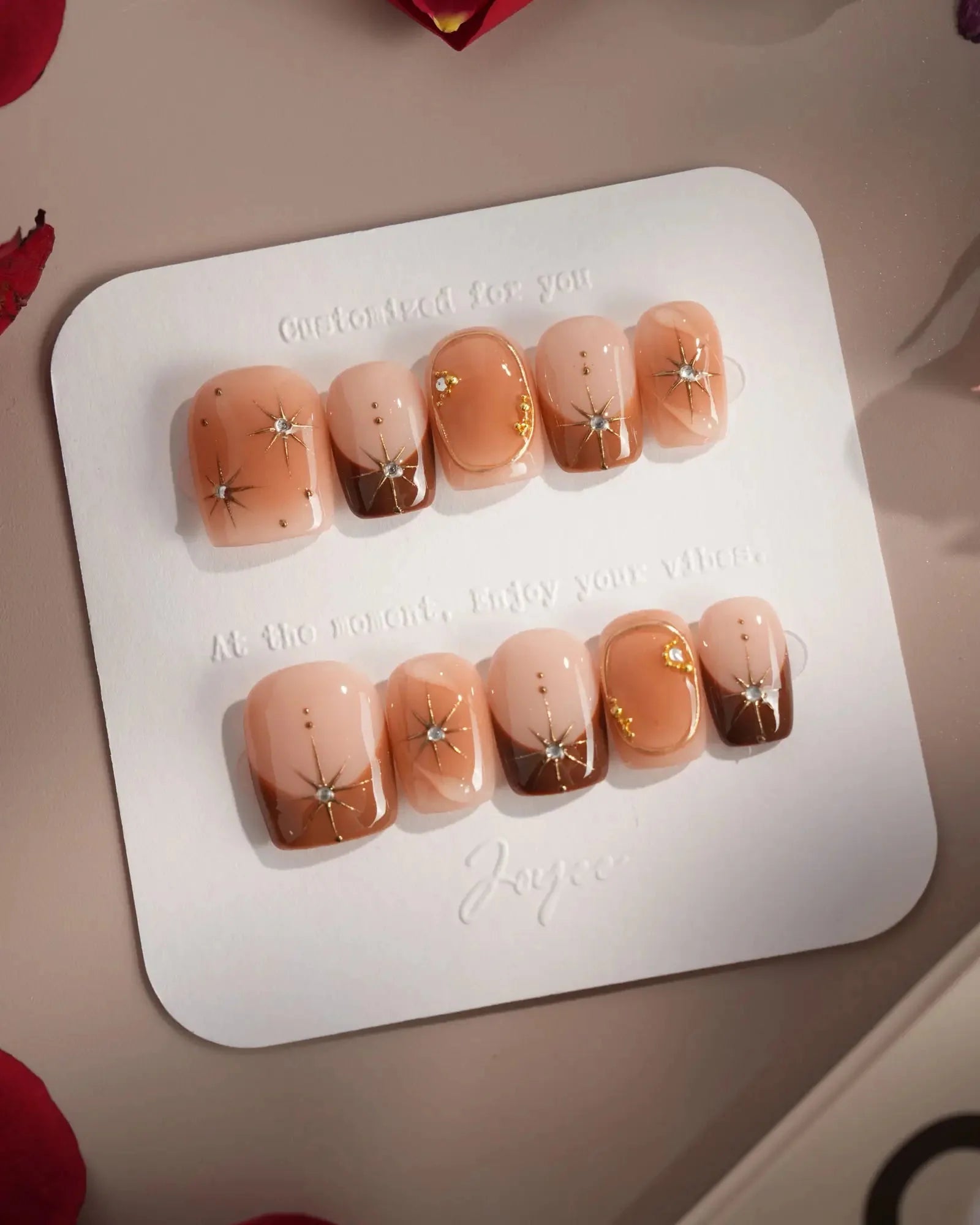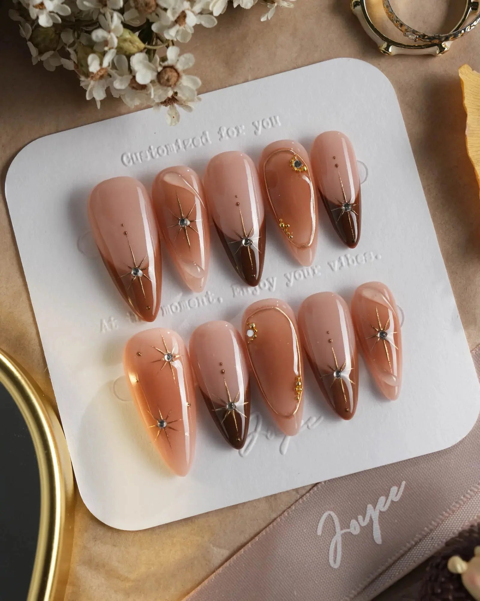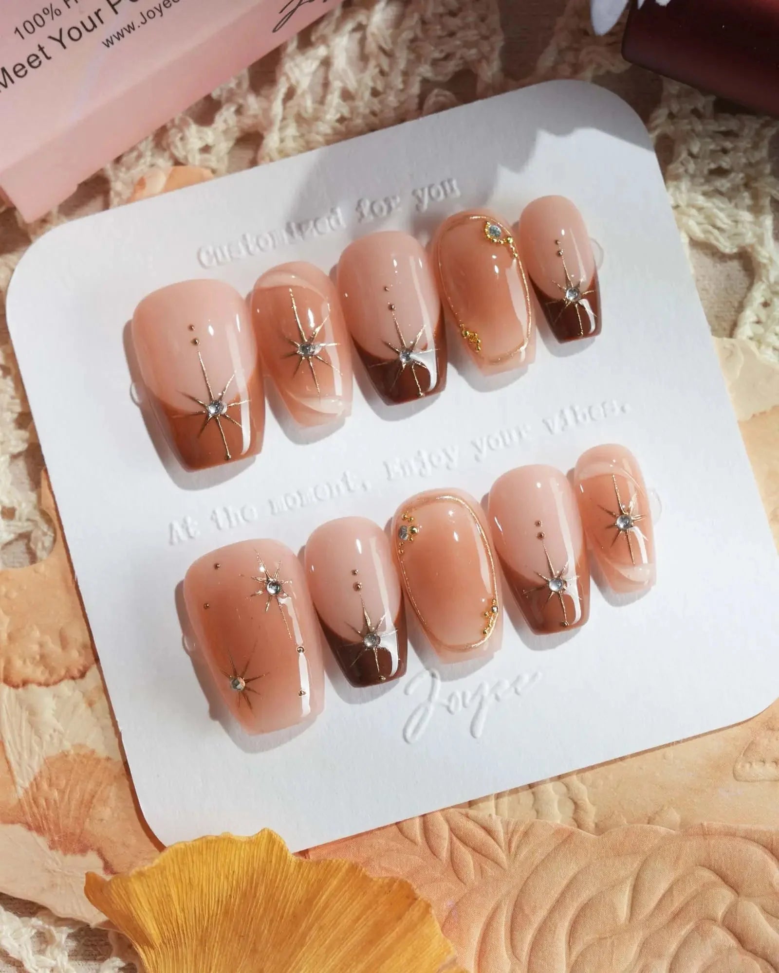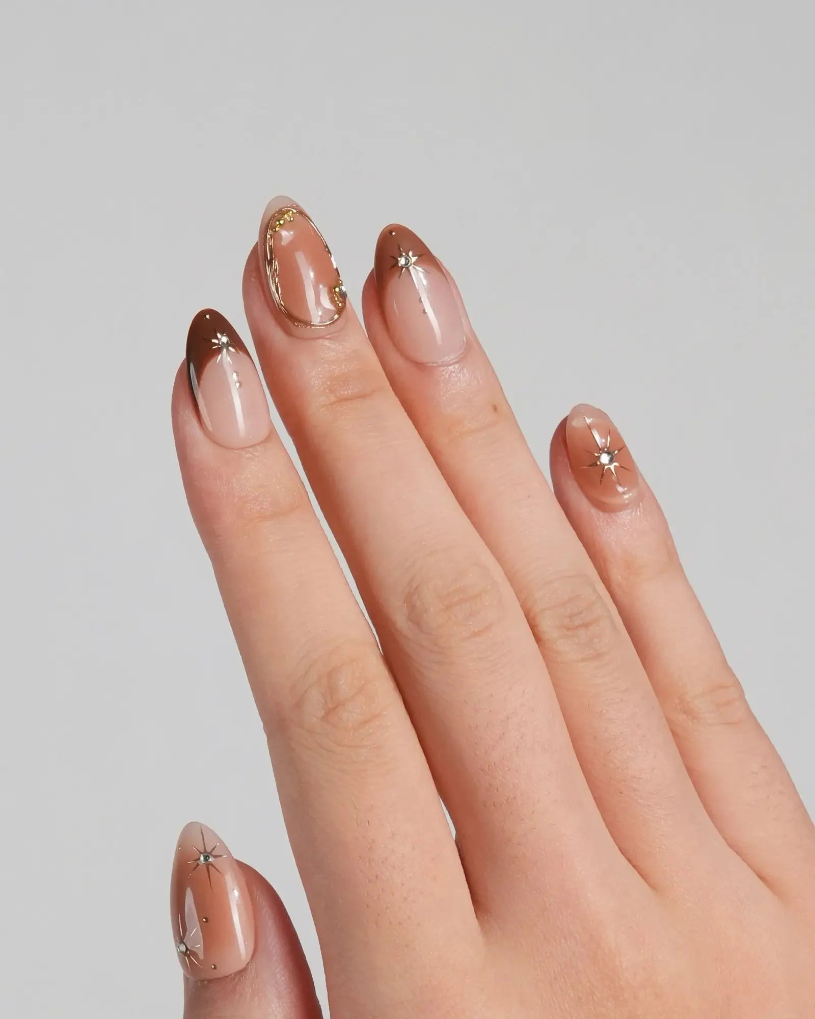 With soft brown gradients, blush-style smudges, and golden accents, this set feels like autumn makeup on nails. A touch of glam, perfect for date nights or a cozy café afternoon.