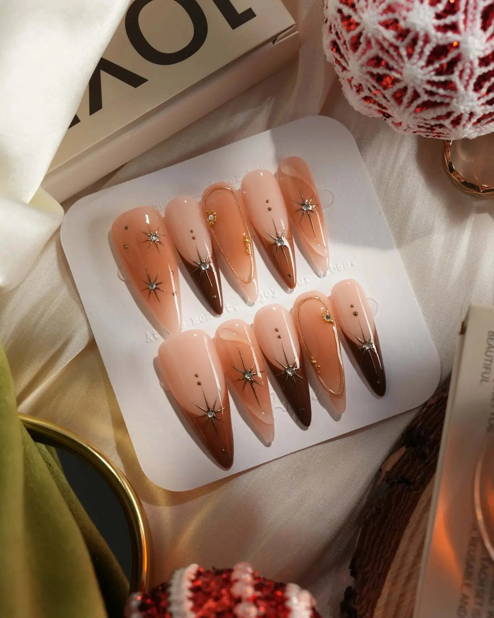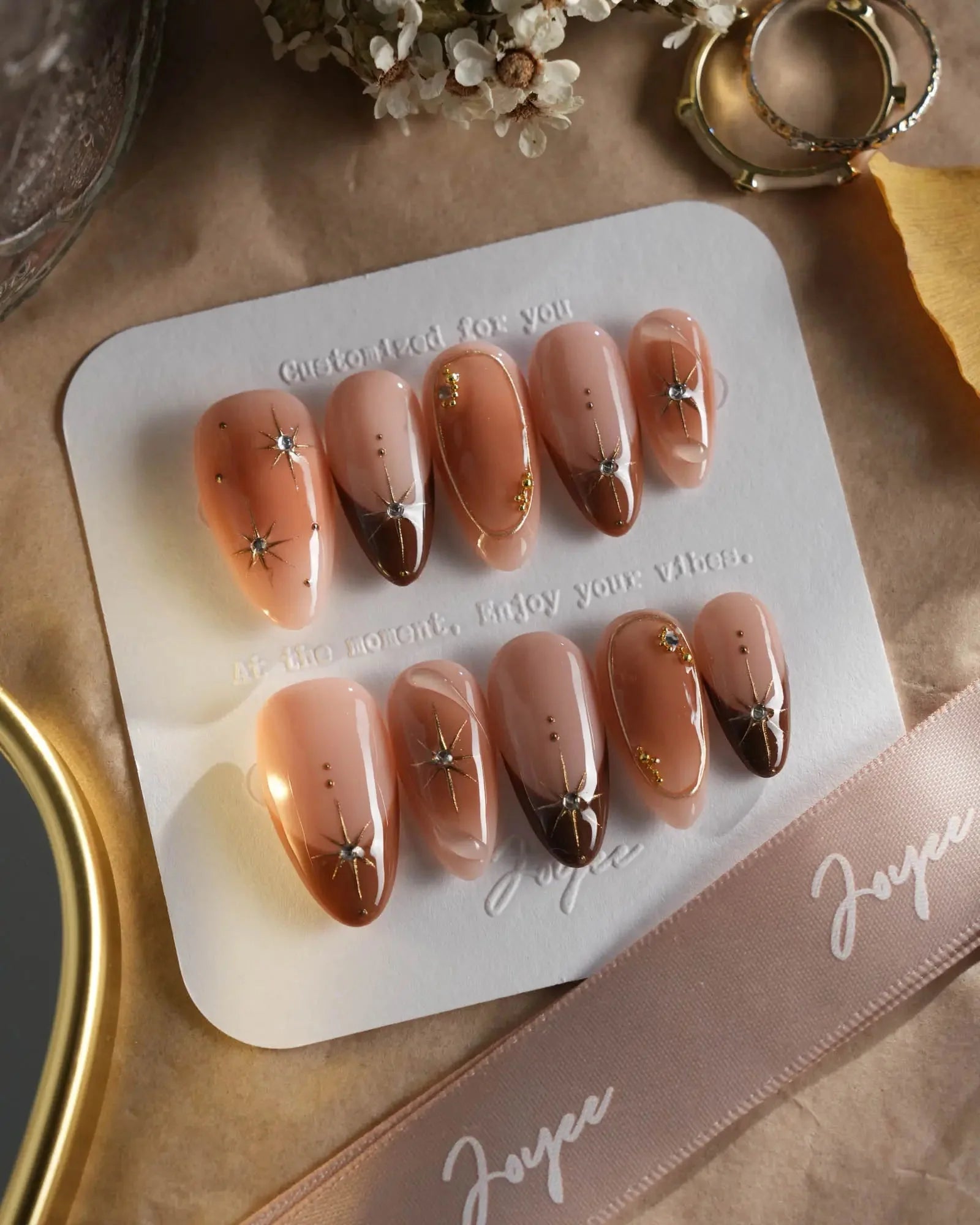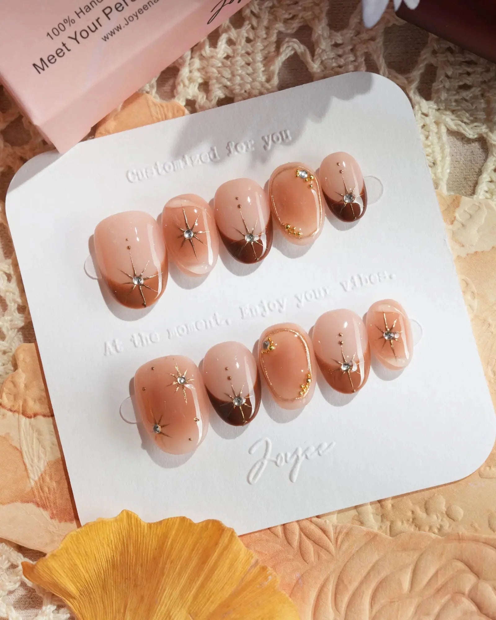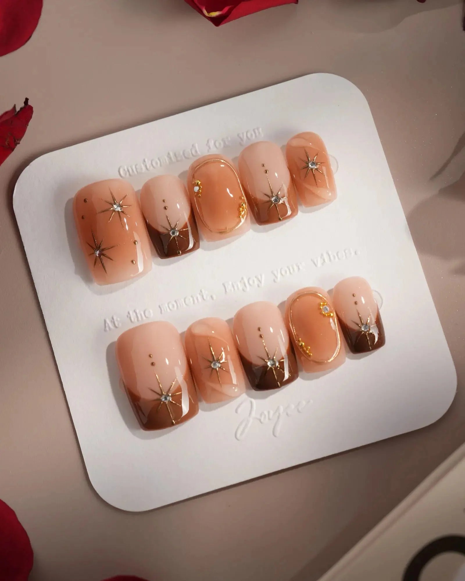 With soft brown gradients, blush-style smudges, and golden accents, this set feels like autumn makeup on nails. A touch of glam, perfect for date nights or a cozy café afternoon.