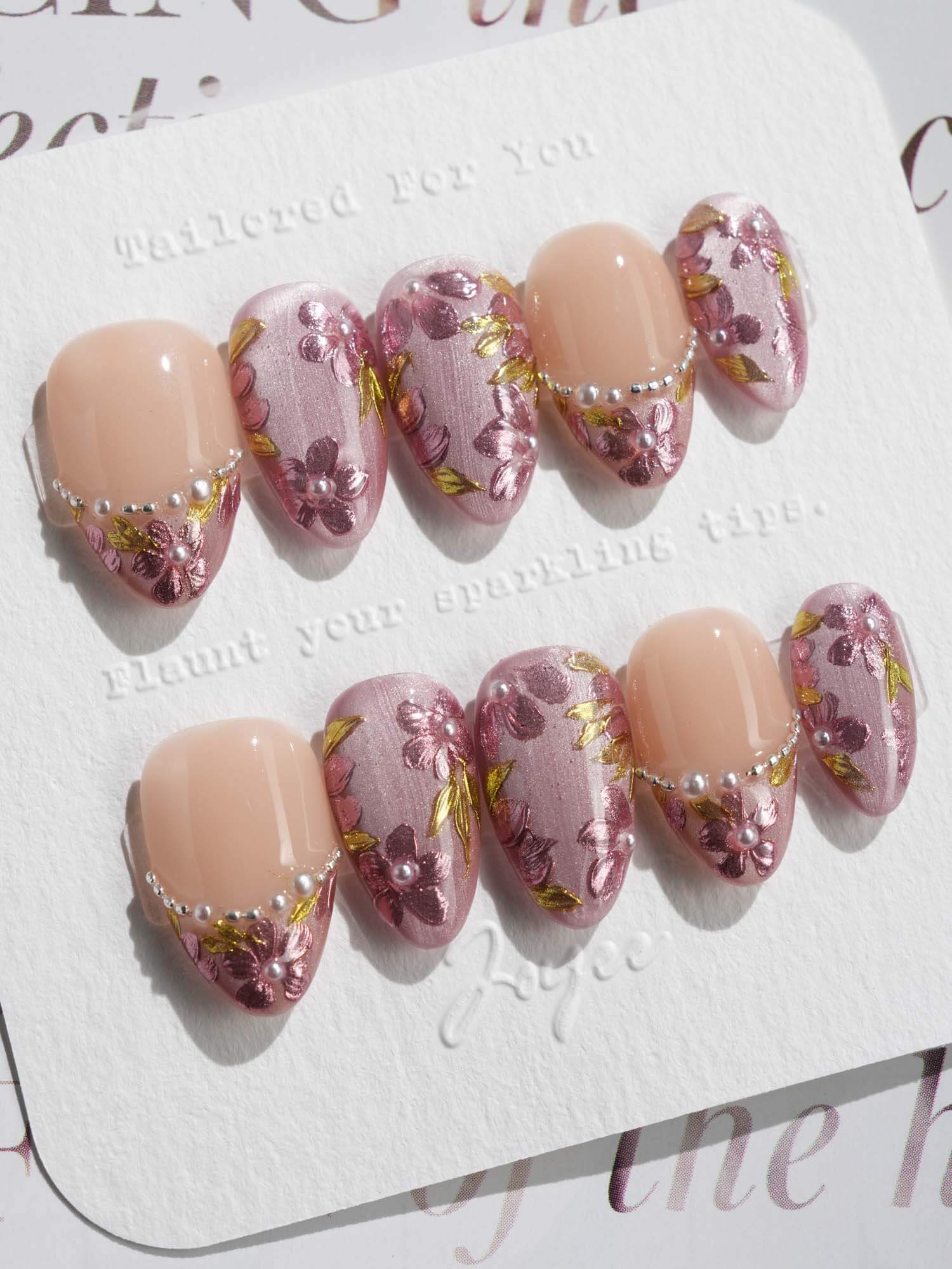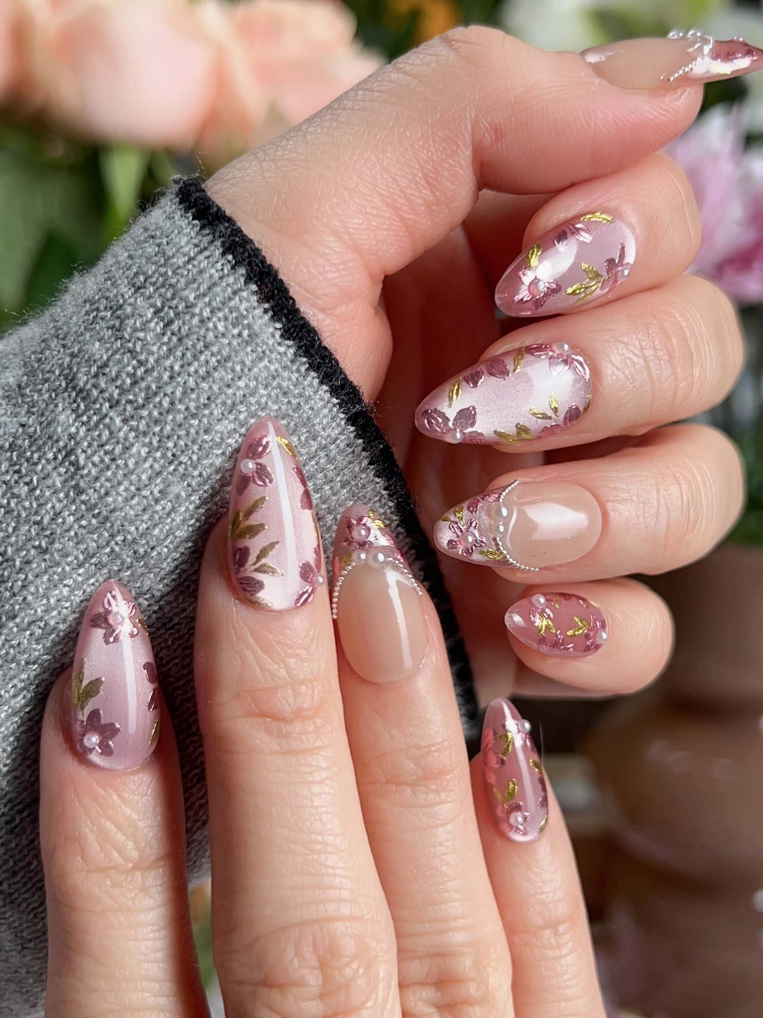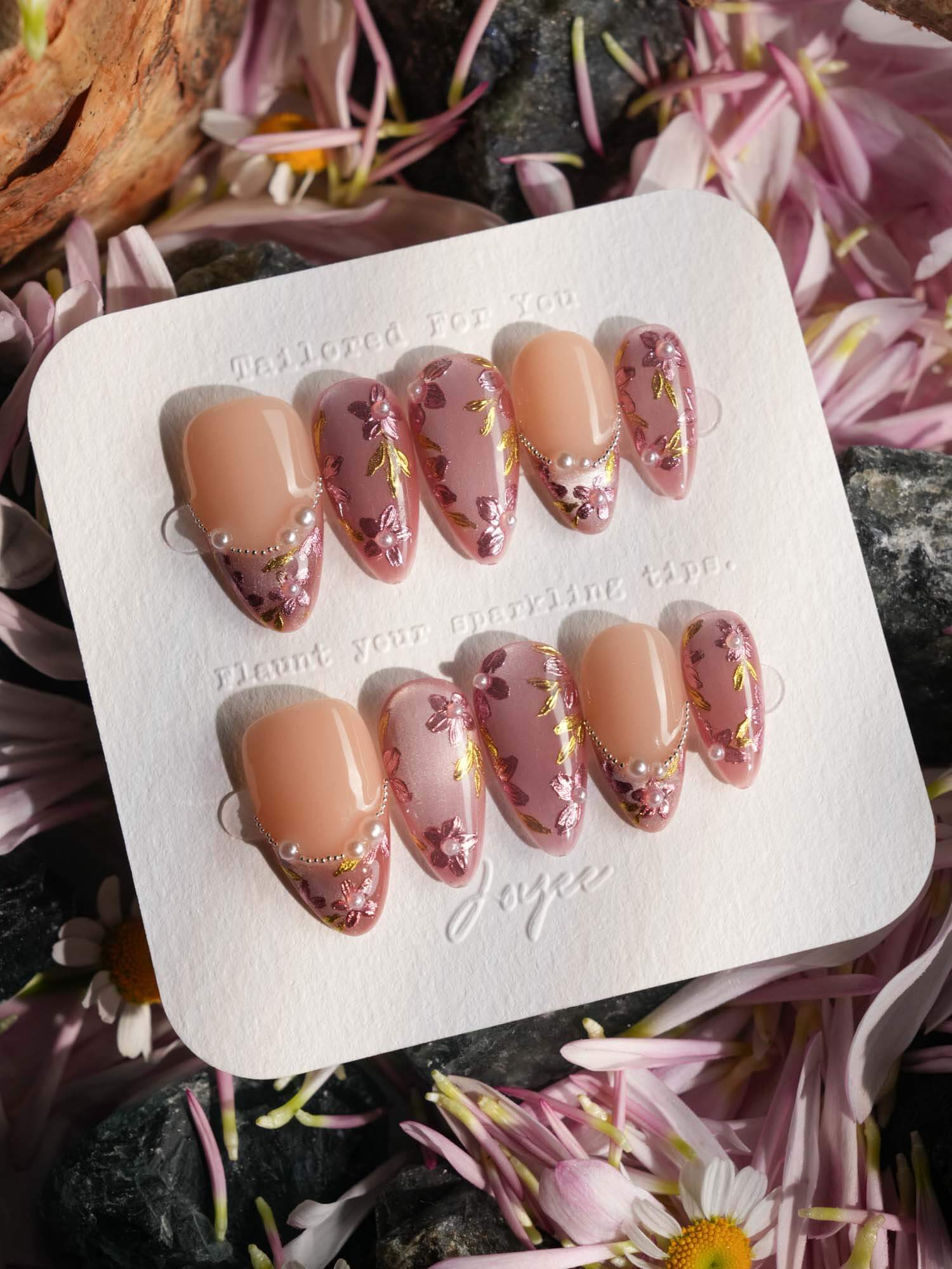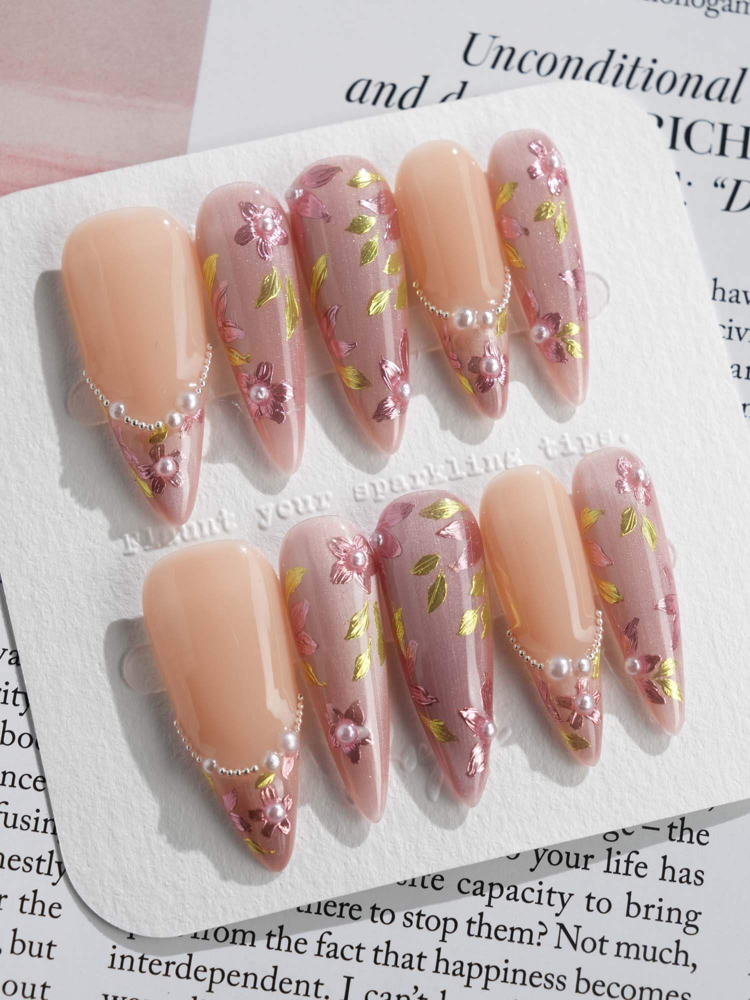 Celebrate cherry-blossom season all year with these soft nude-pink nails, scattered with hand-painted sakura petals and touches of gold leaf. Half of the set wears a curved pearl-bead French line, adding subtle luxury to the airy floral print. Perfect for garden dates, weddings, or whenever you want a whisper of romantic Japan on your fingertips.