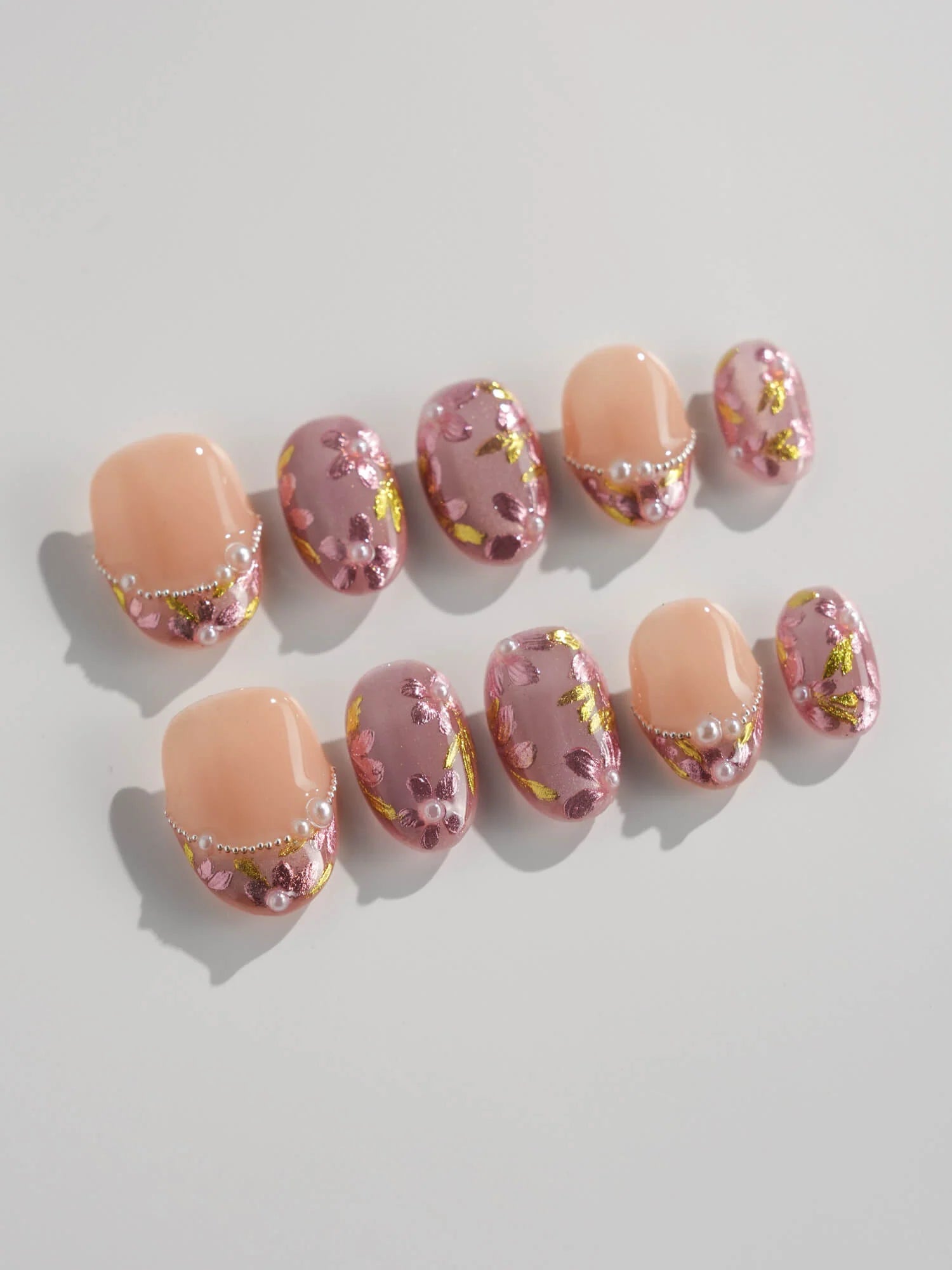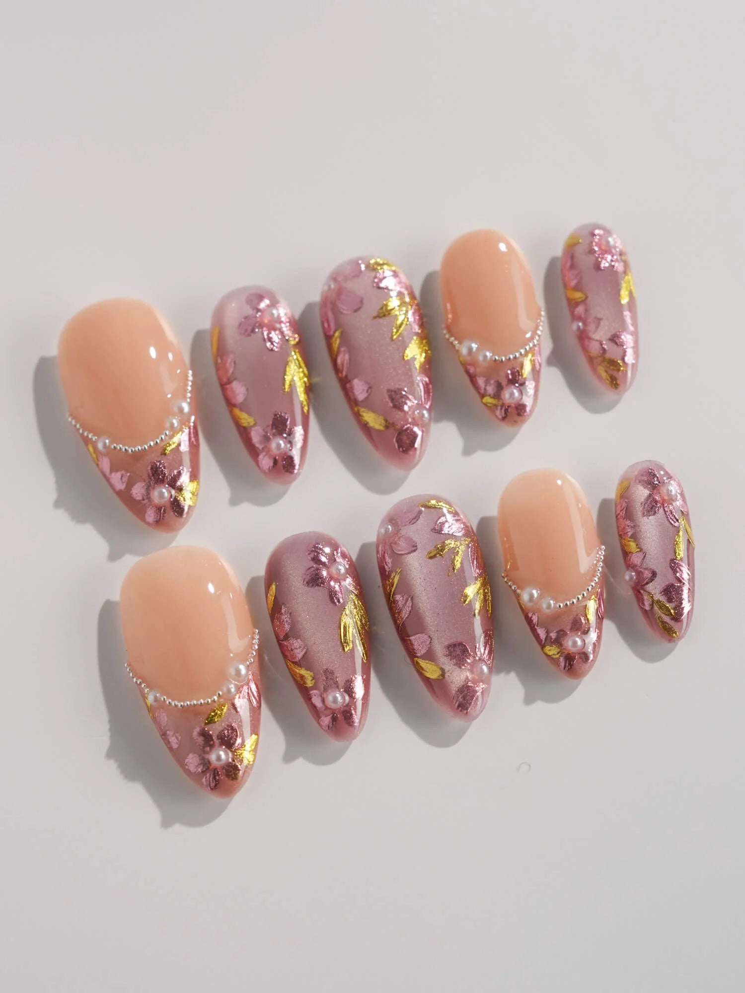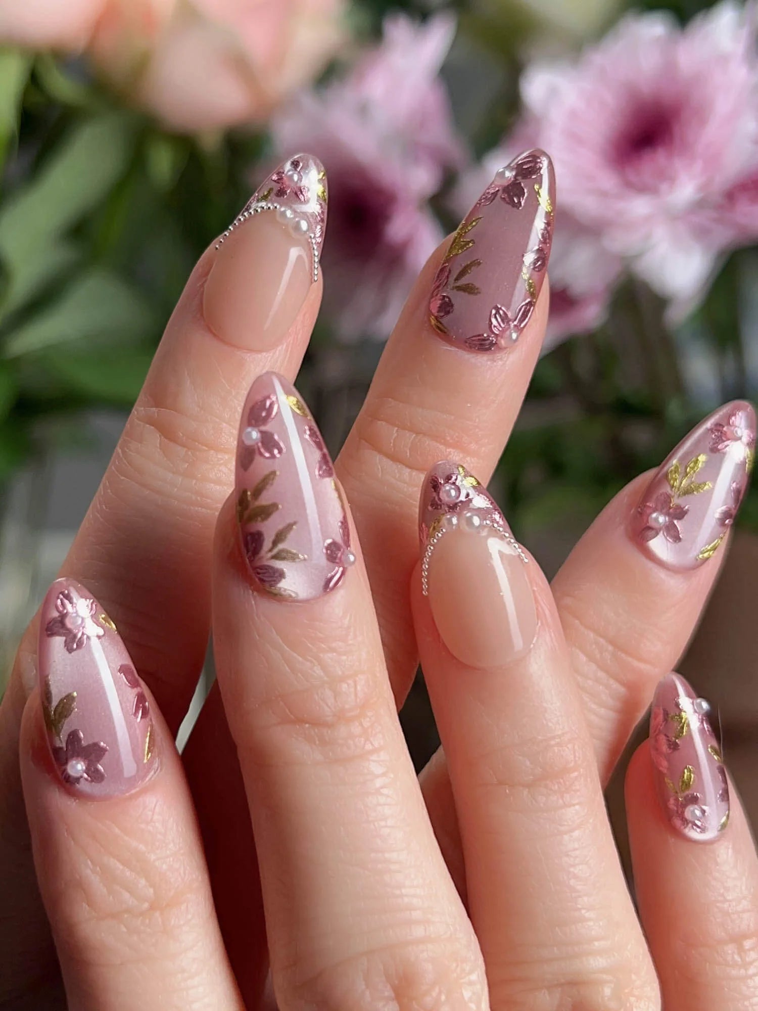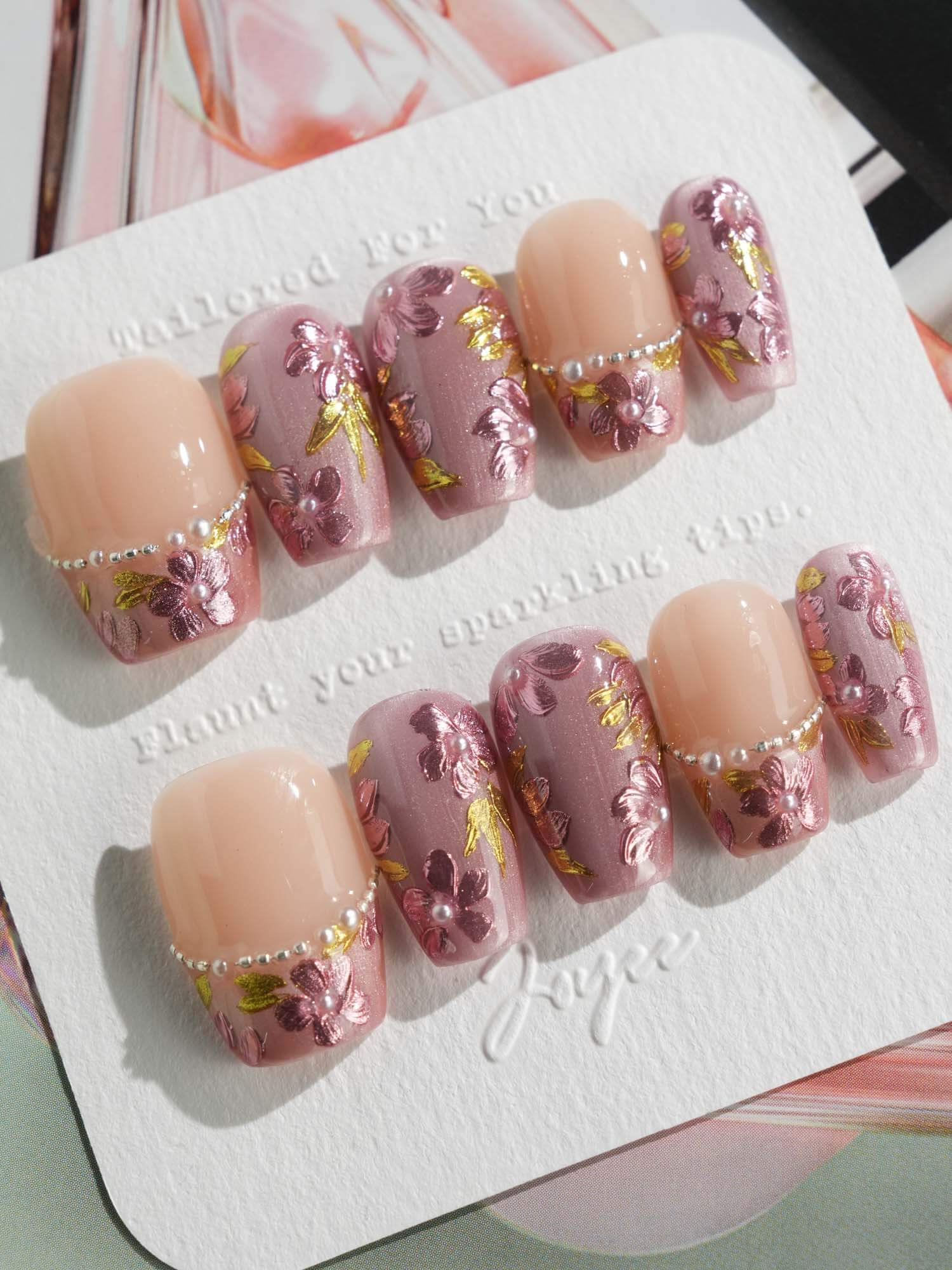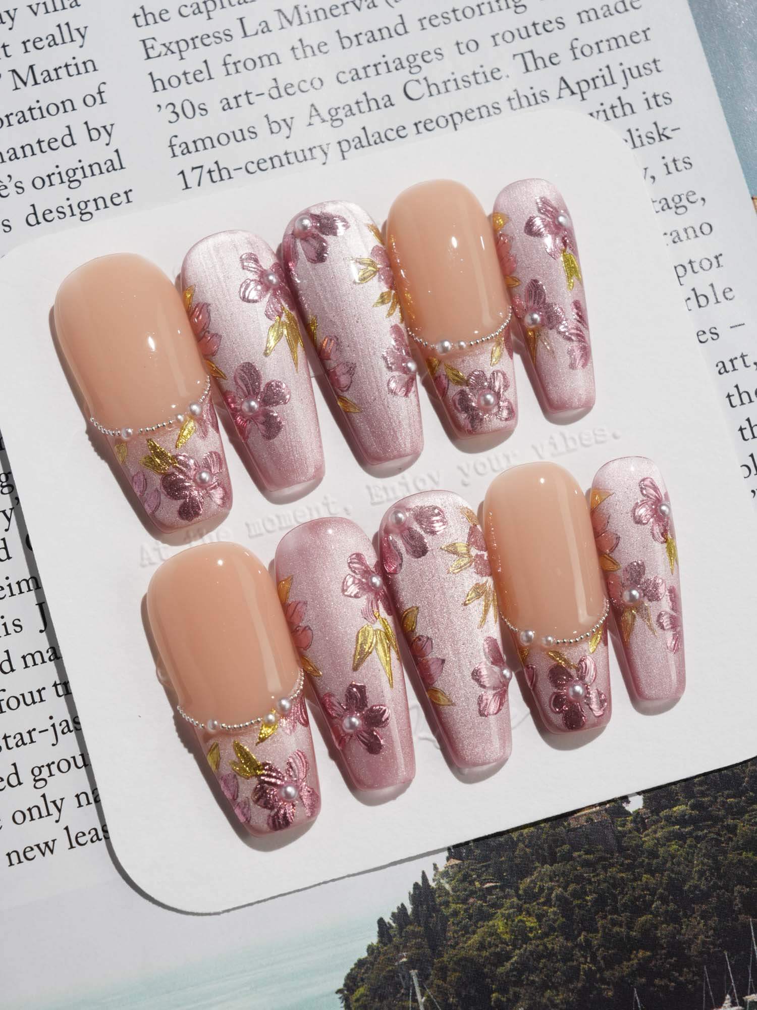 Celebrate cherry-blossom season all year with these soft nude-pink nails, scattered with hand-painted sakura petals and touches of gold leaf. Half of the set wears a curved pearl-bead French line, adding subtle luxury to the airy floral print. Perfect for garden dates, weddings, or whenever you want a whisper of romantic Japan on your fingertips.