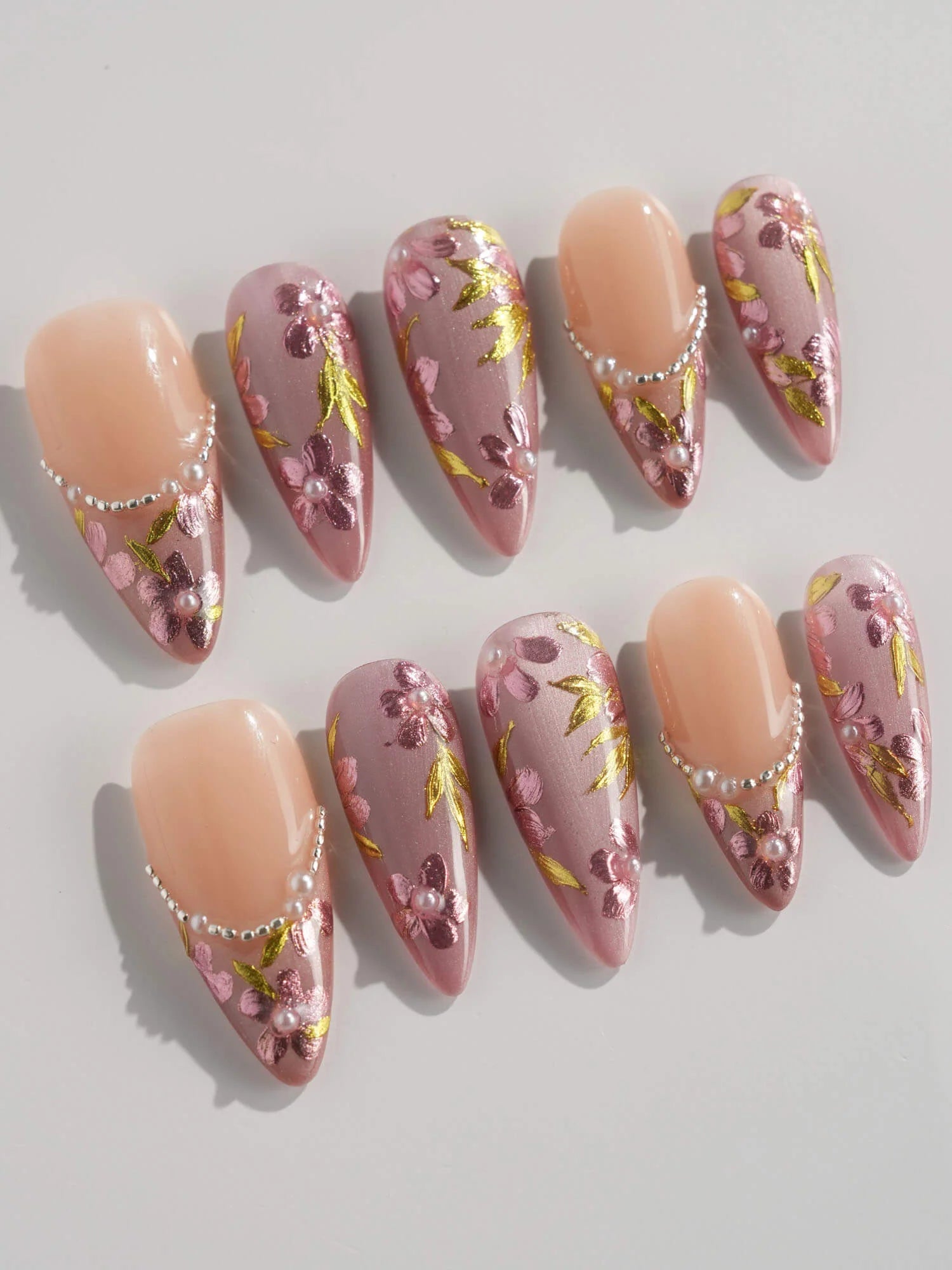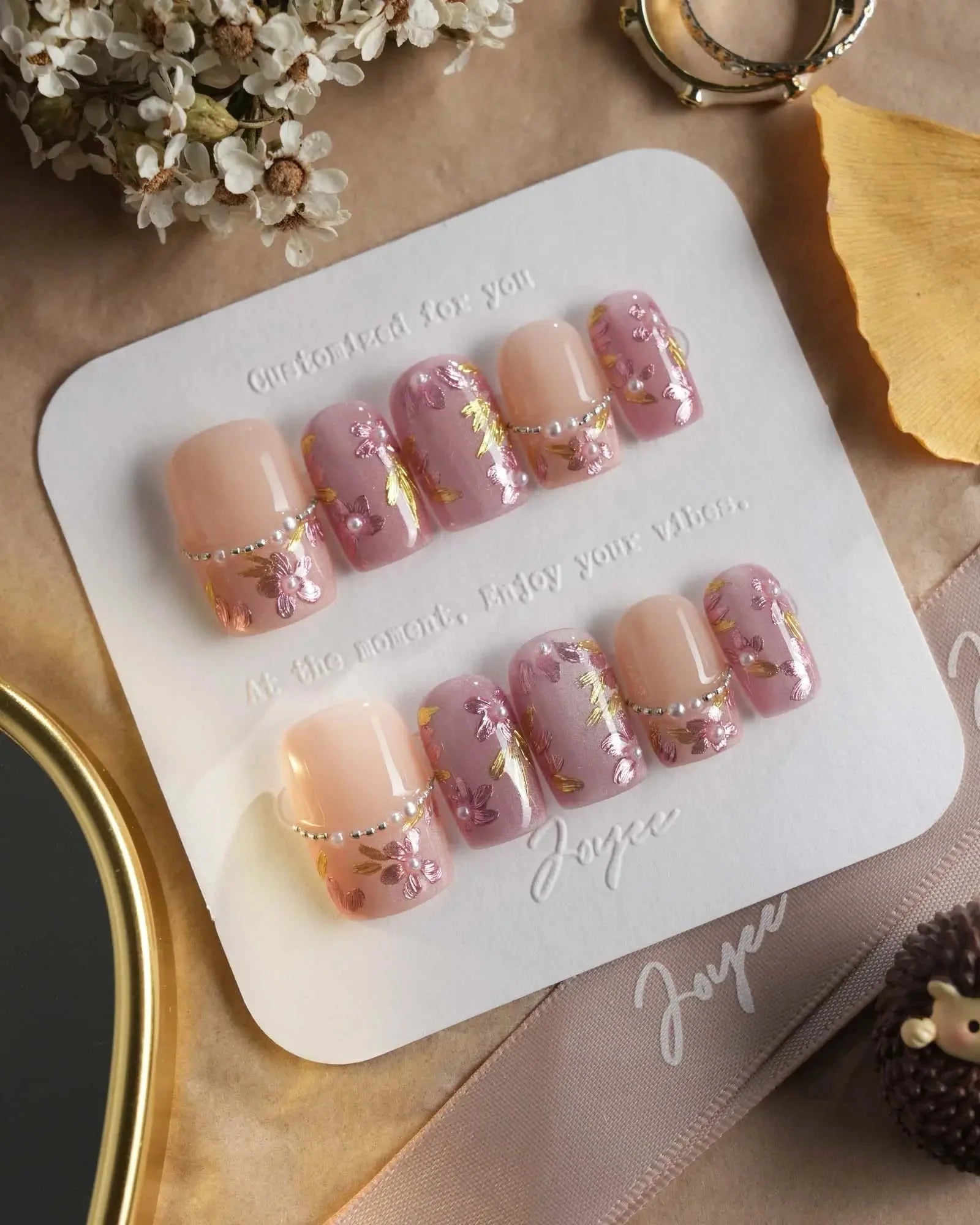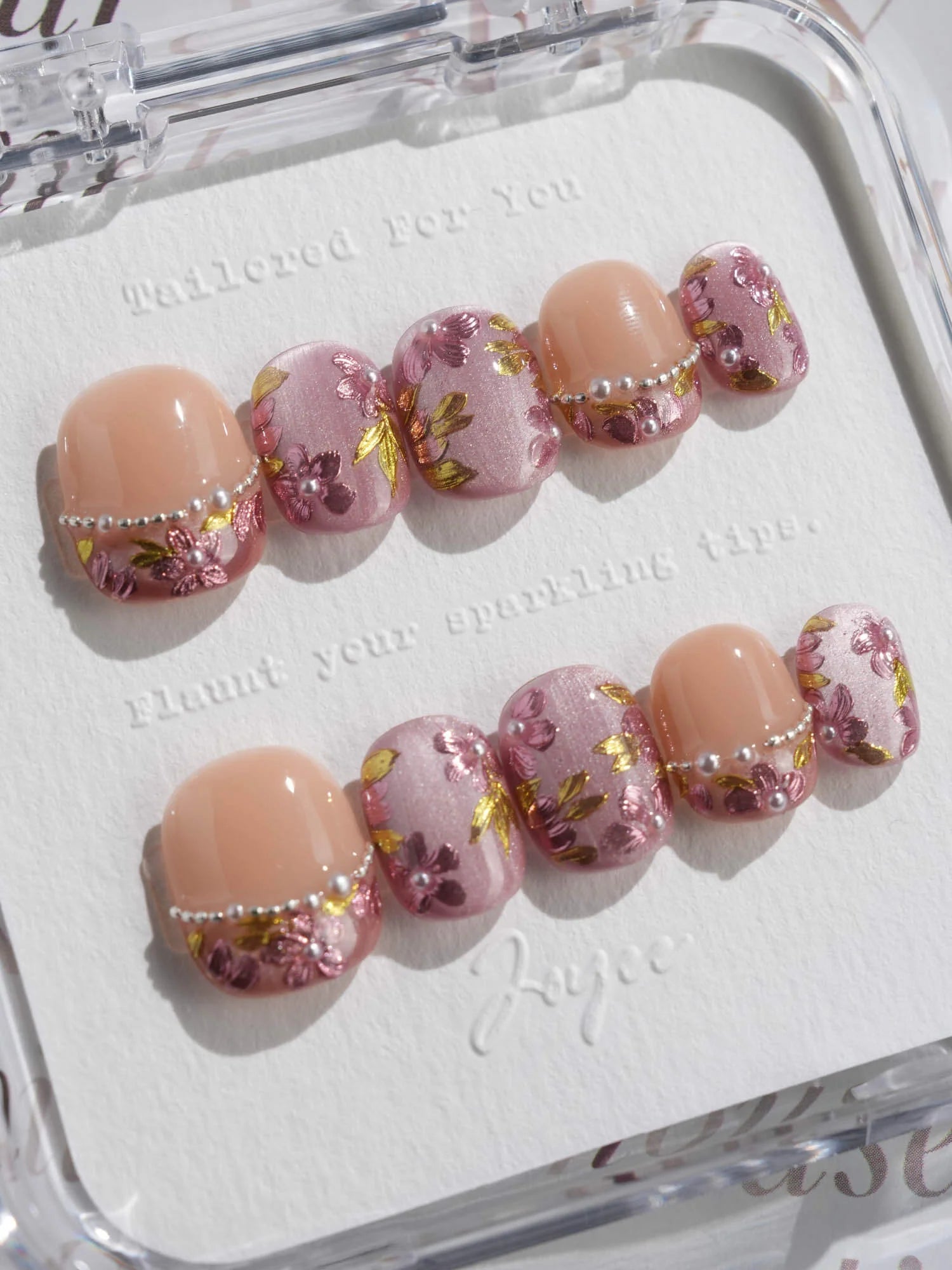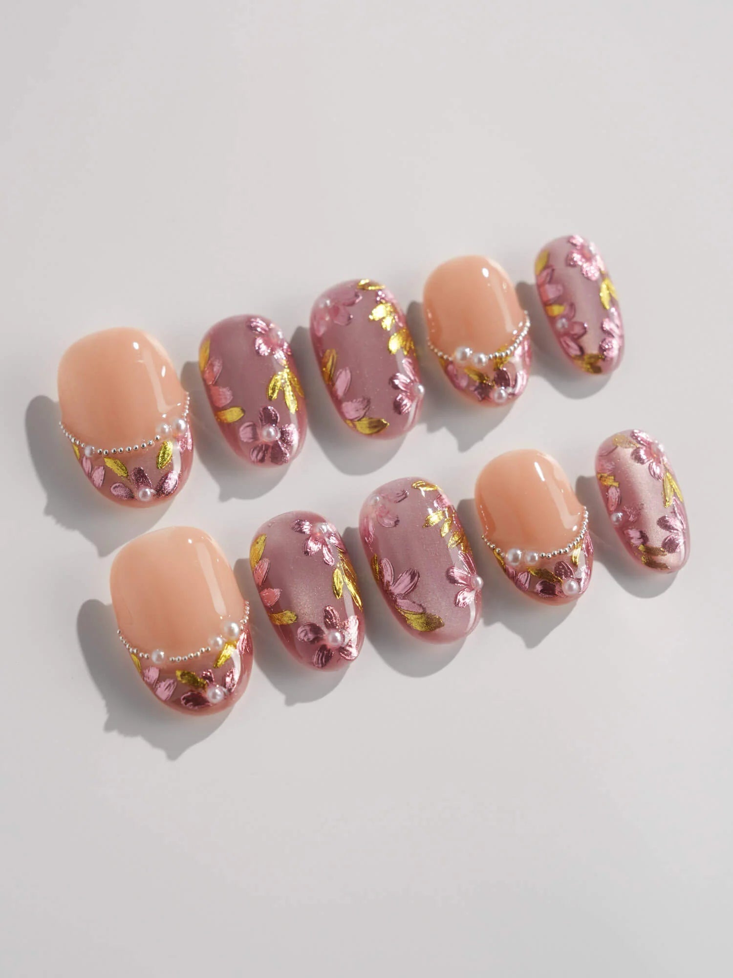 Celebrate cherry-blossom season all year with these soft nude-pink nails, scattered with hand-painted sakura petals and touches of gold leaf. Half of the set wears a curved pearl-bead French line, adding subtle luxury to the airy floral print. Perfect for garden dates, weddings, or whenever you want a whisper of romantic Japan on your fingertips.