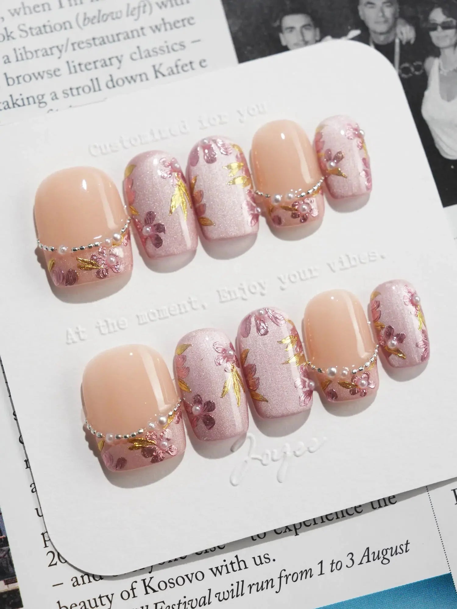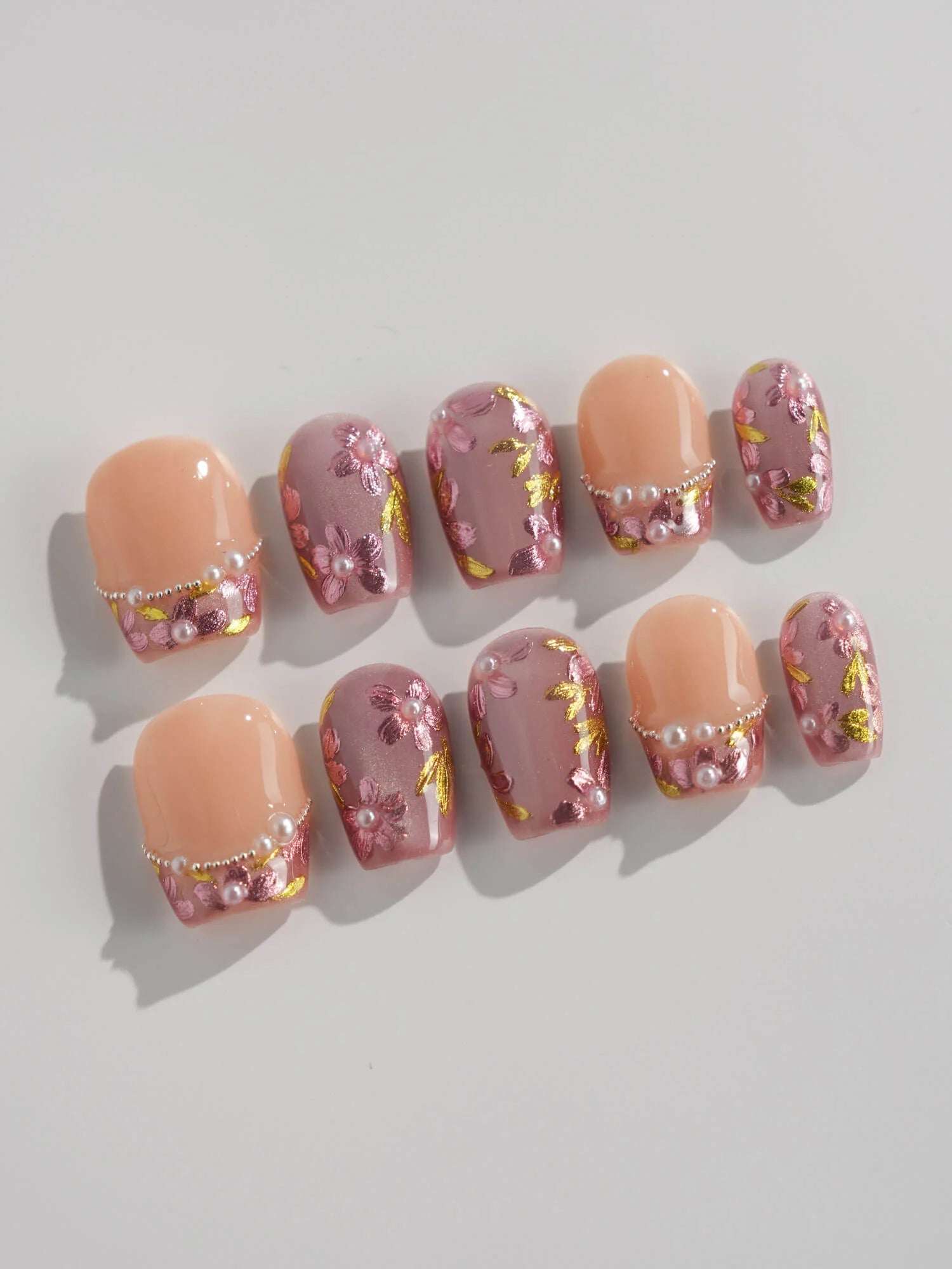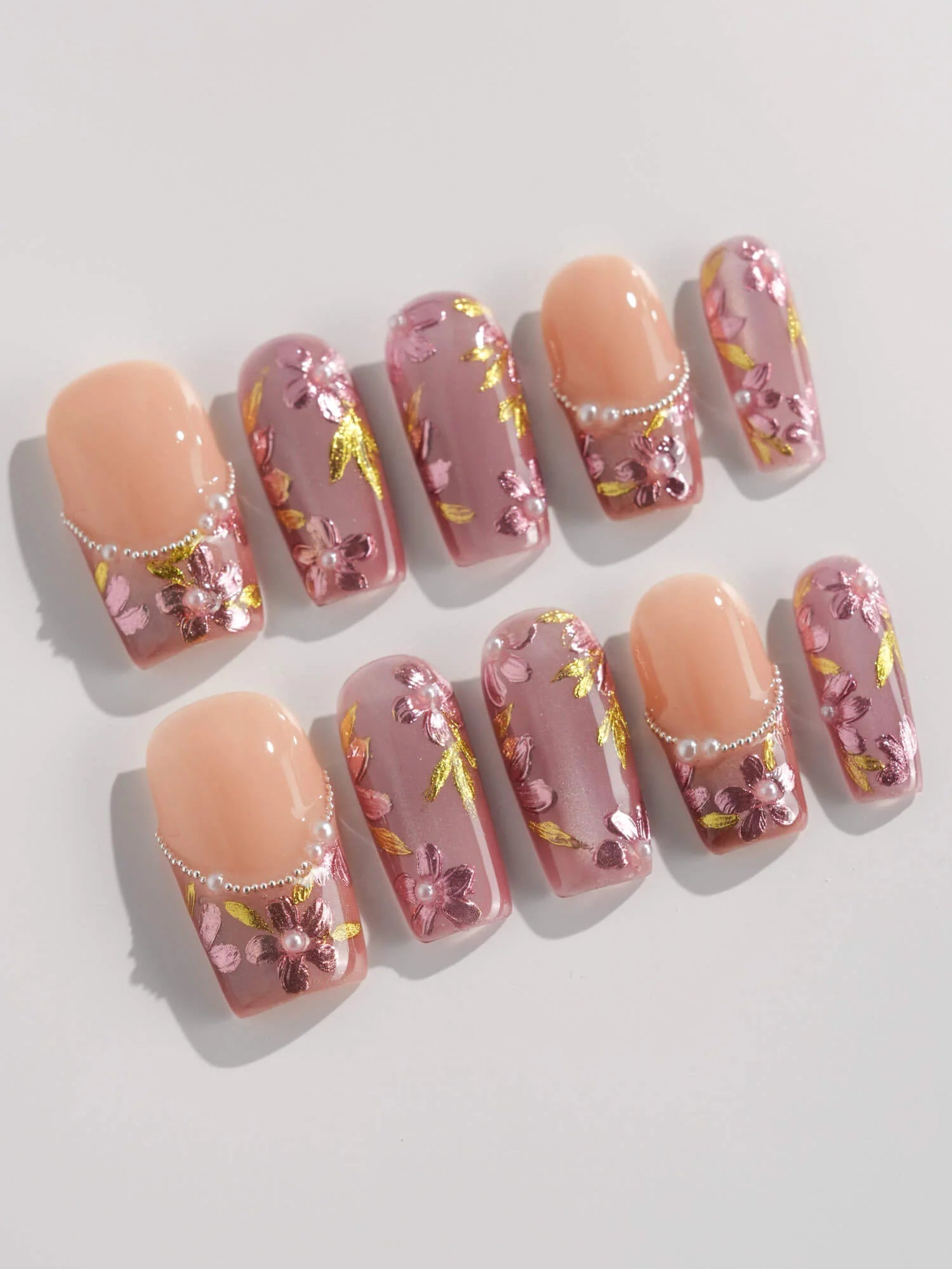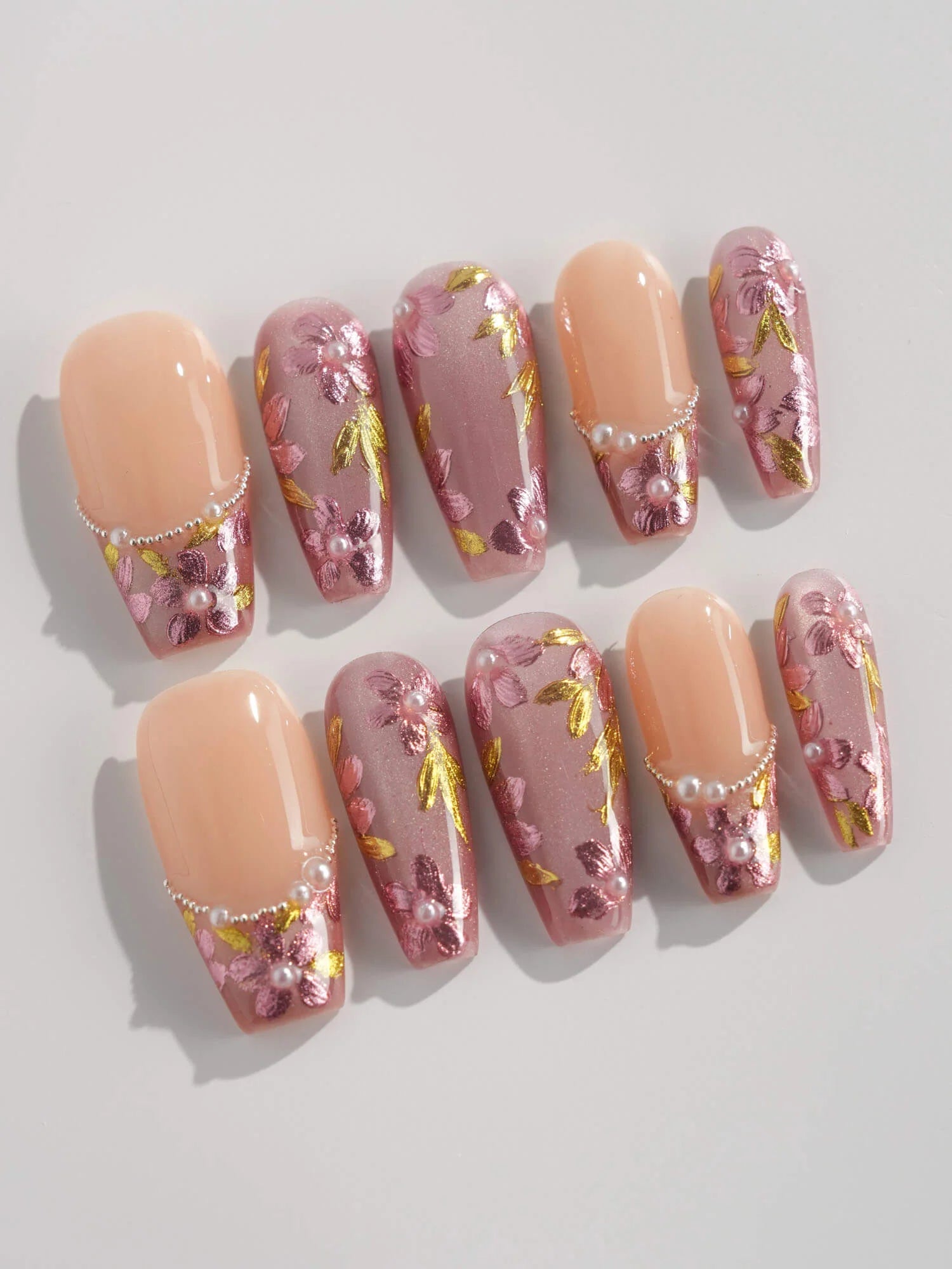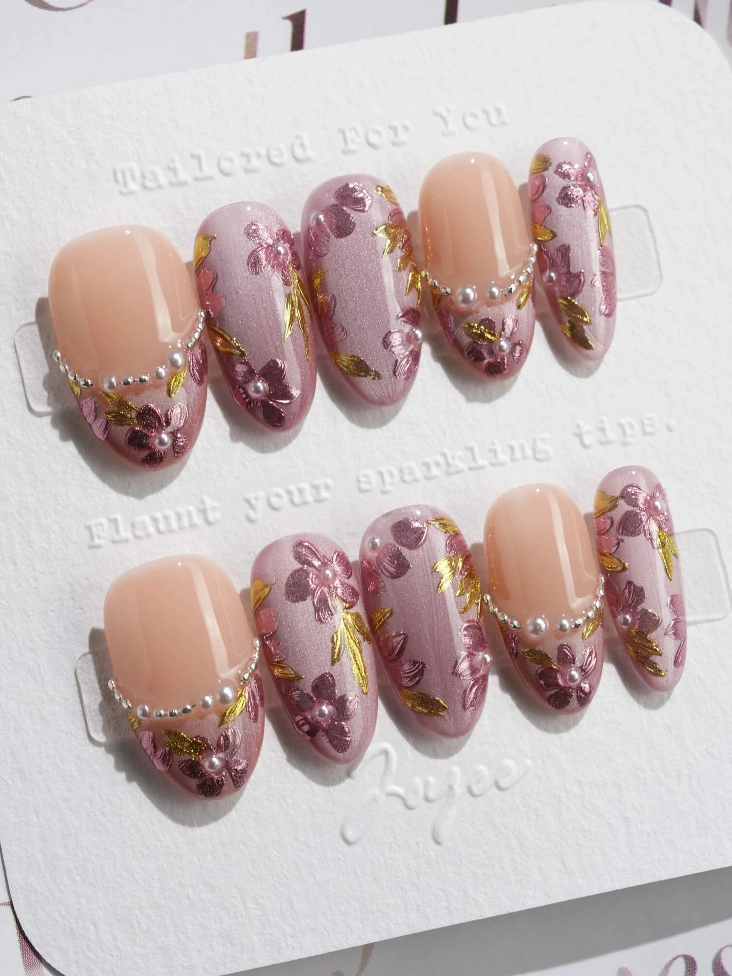 Celebrate cherry-blossom season all year with these soft nude-pink nails, scattered with hand-painted sakura petals and touches of gold leaf. Half of the set wears a curved pearl-bead French line, adding subtle luxury to the airy floral print. Perfect for garden dates, weddings, or whenever you want a whisper of romantic Japan on your fingertips.