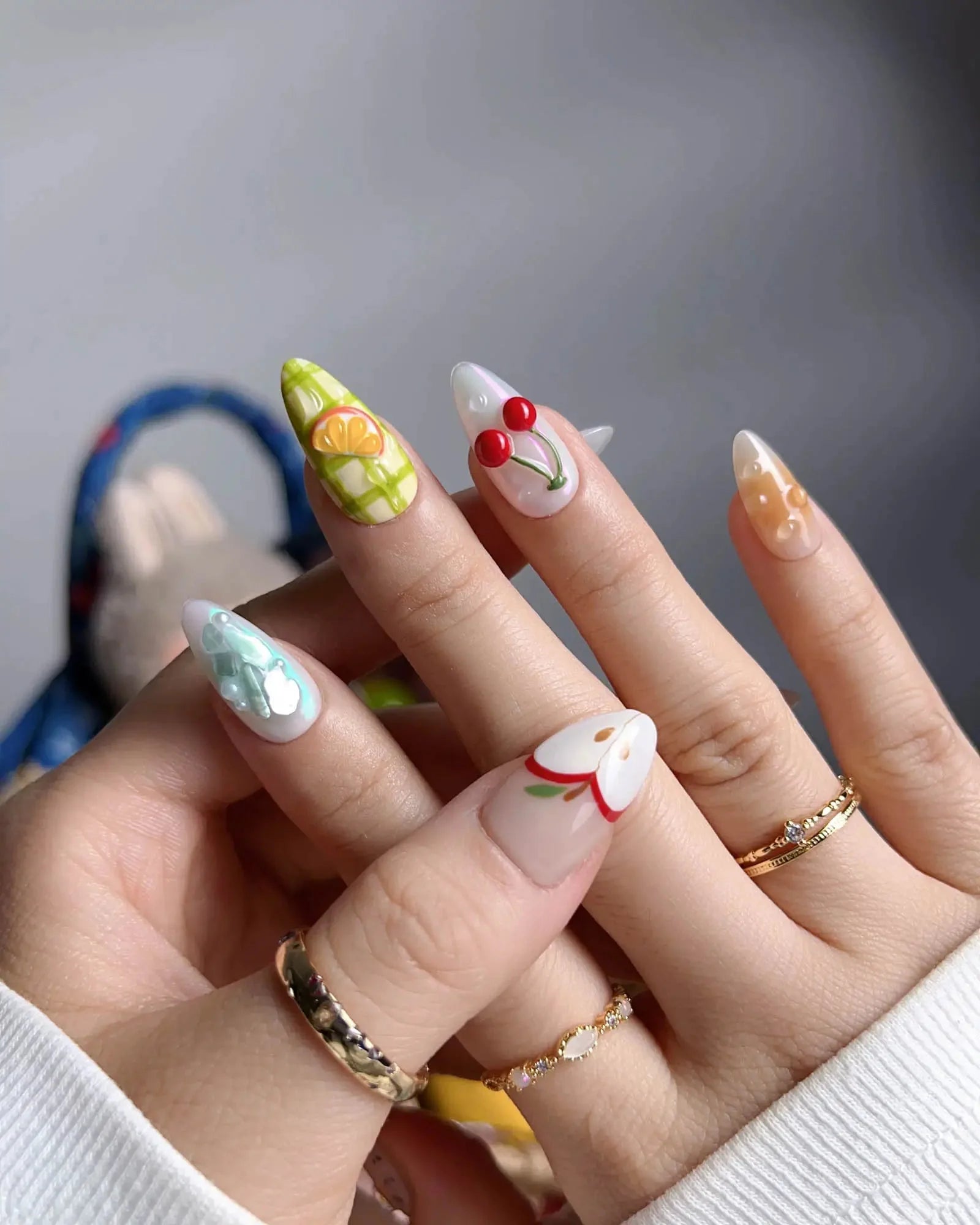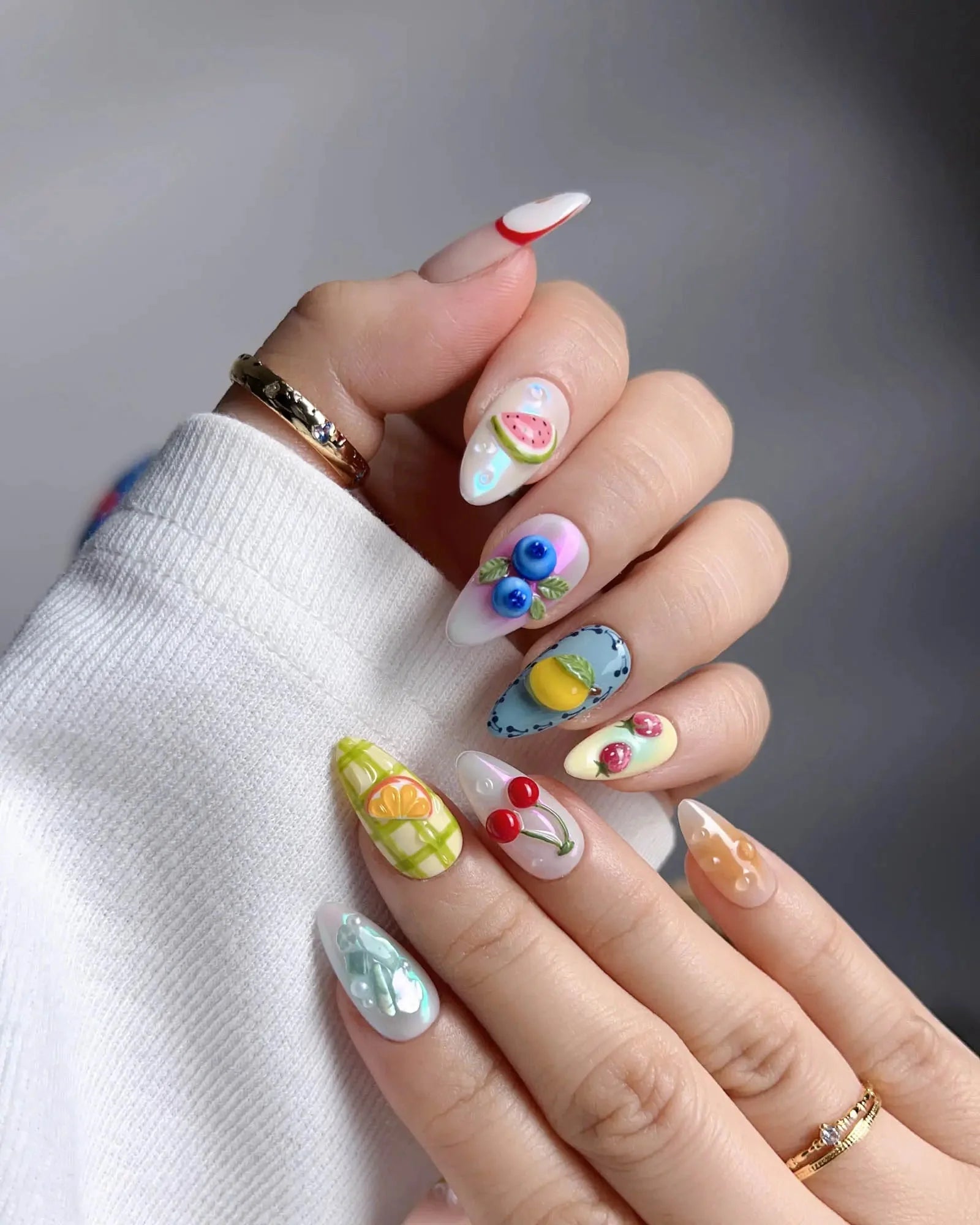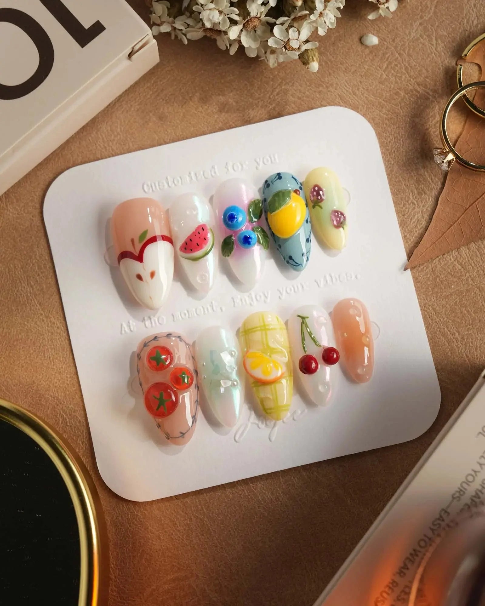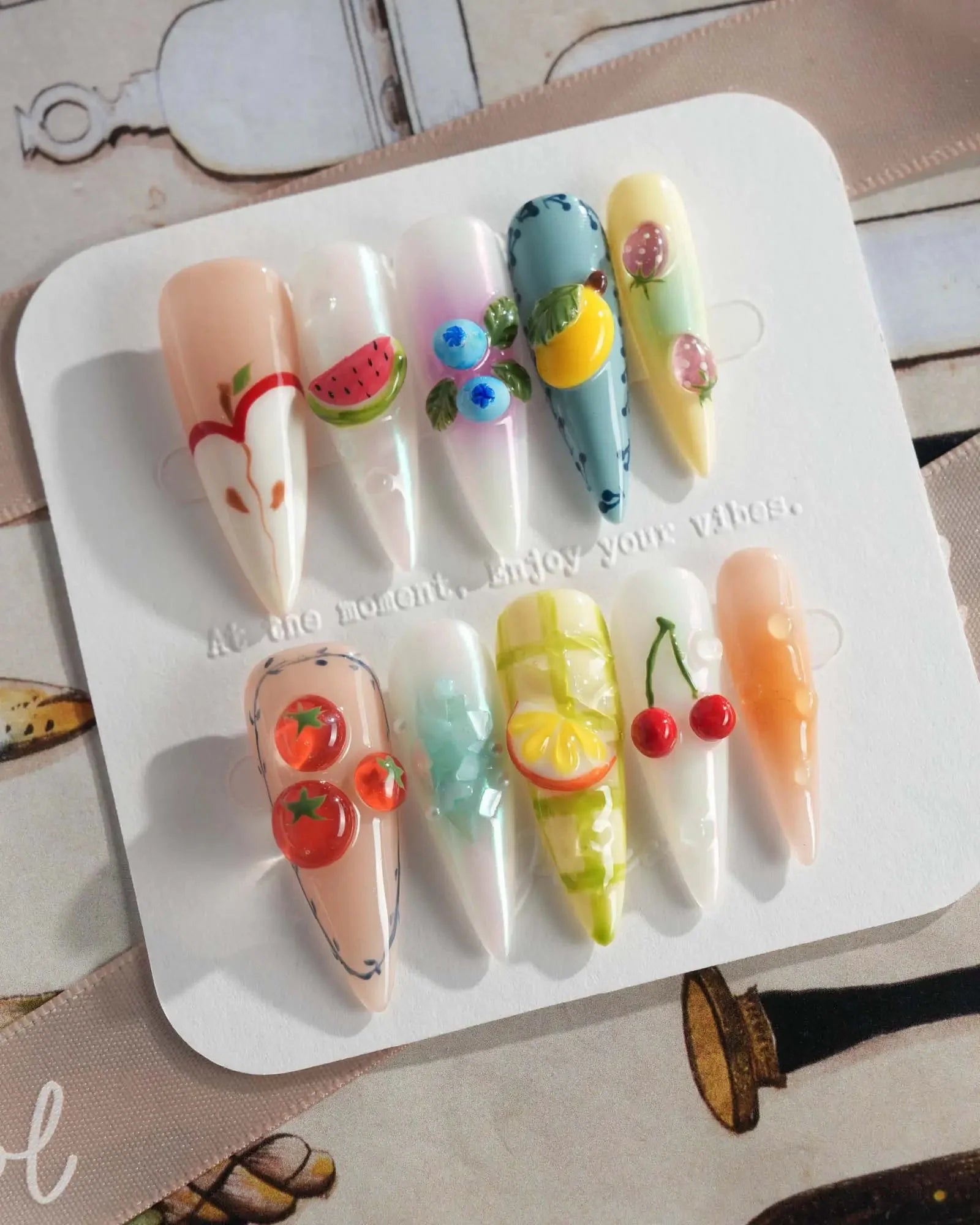 Like a perfect picnic spread—this design blends bright summer fruits across all nails with a colorful yet airy layout. Throw on a floral skirt, grab a tote bag, and take your juicy look outside.