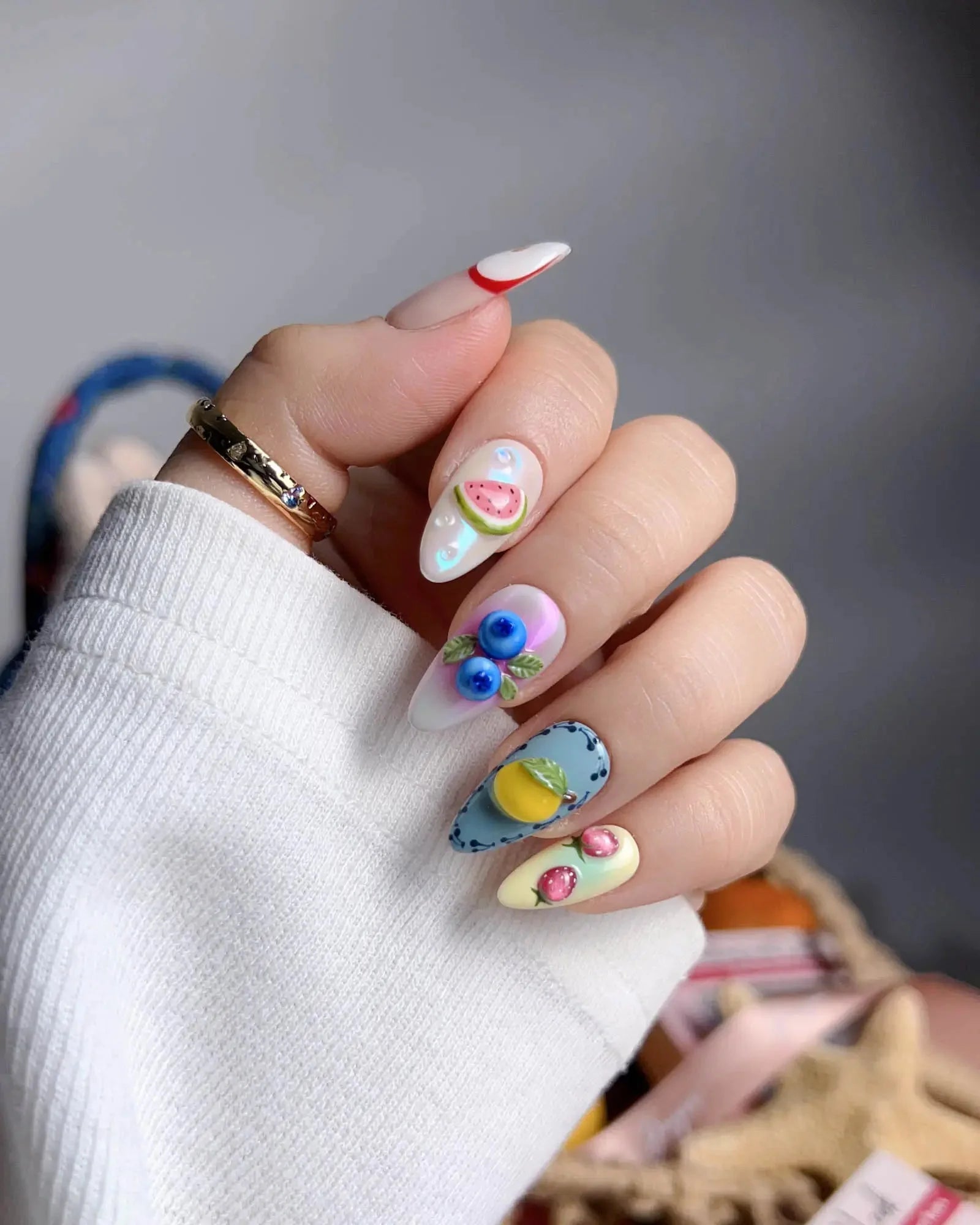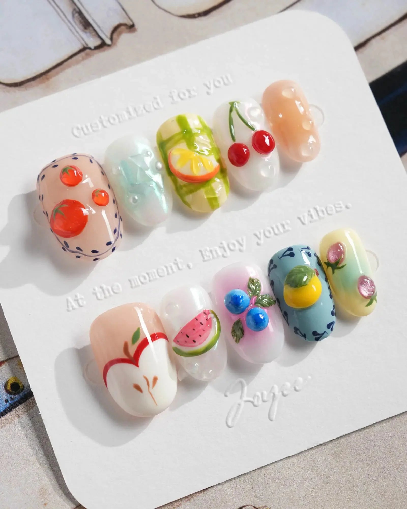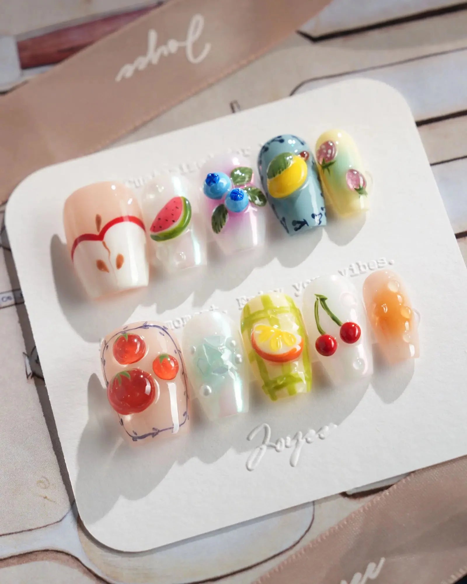 Like a perfect picnic spread—this design blends bright summer fruits across all nails with a colorful yet airy layout. Throw on a floral skirt, grab a tote bag, and take your juicy look outside.