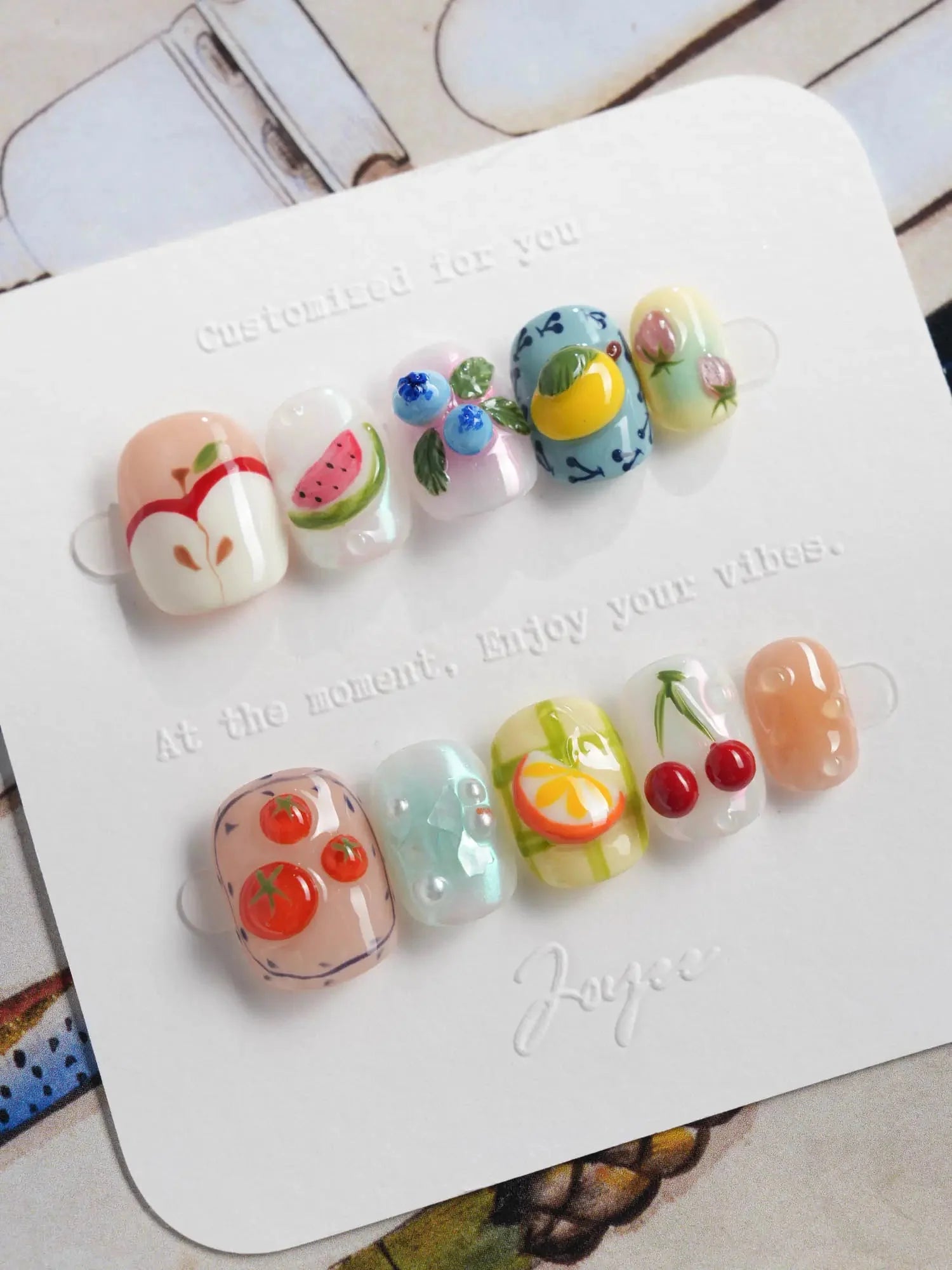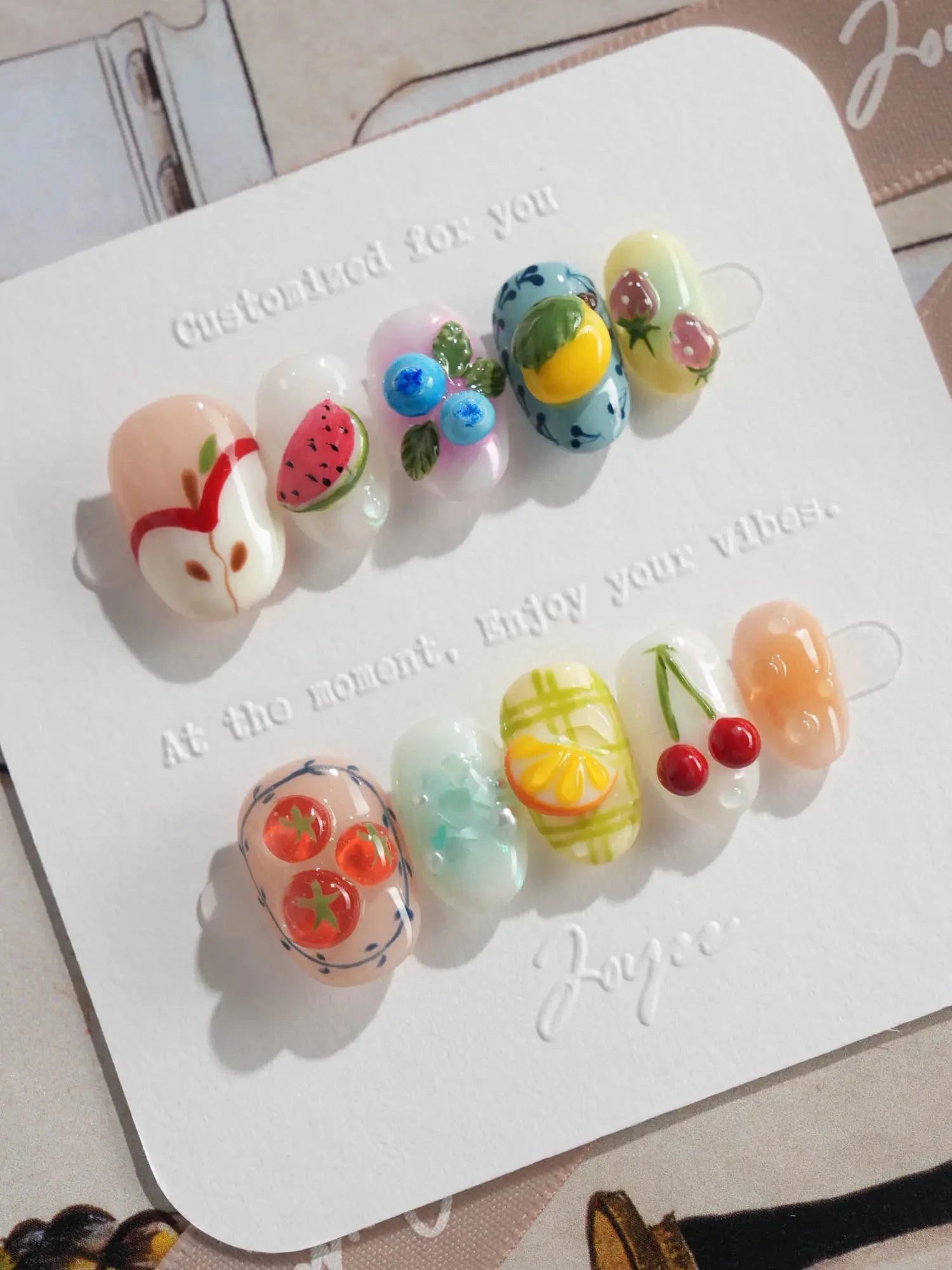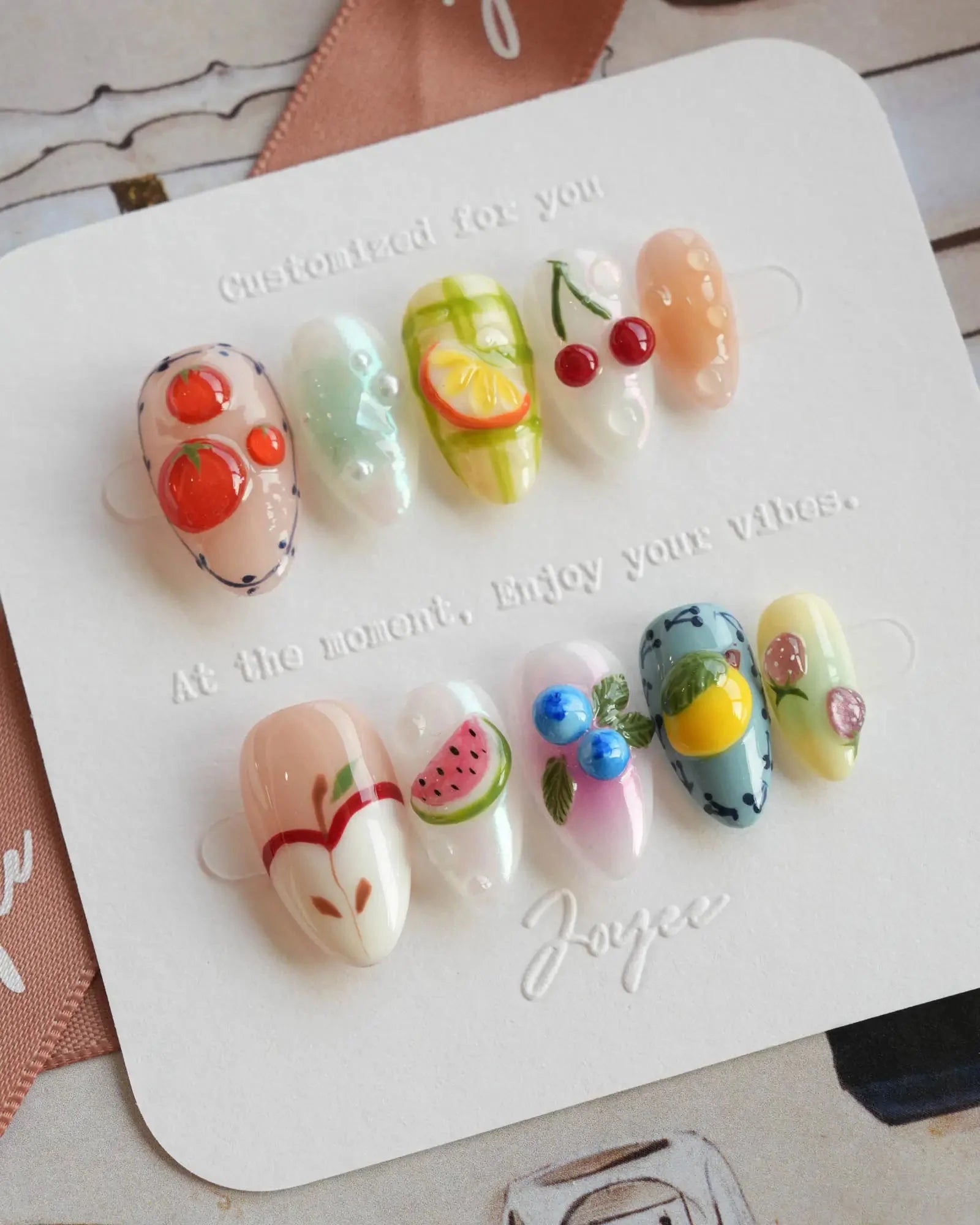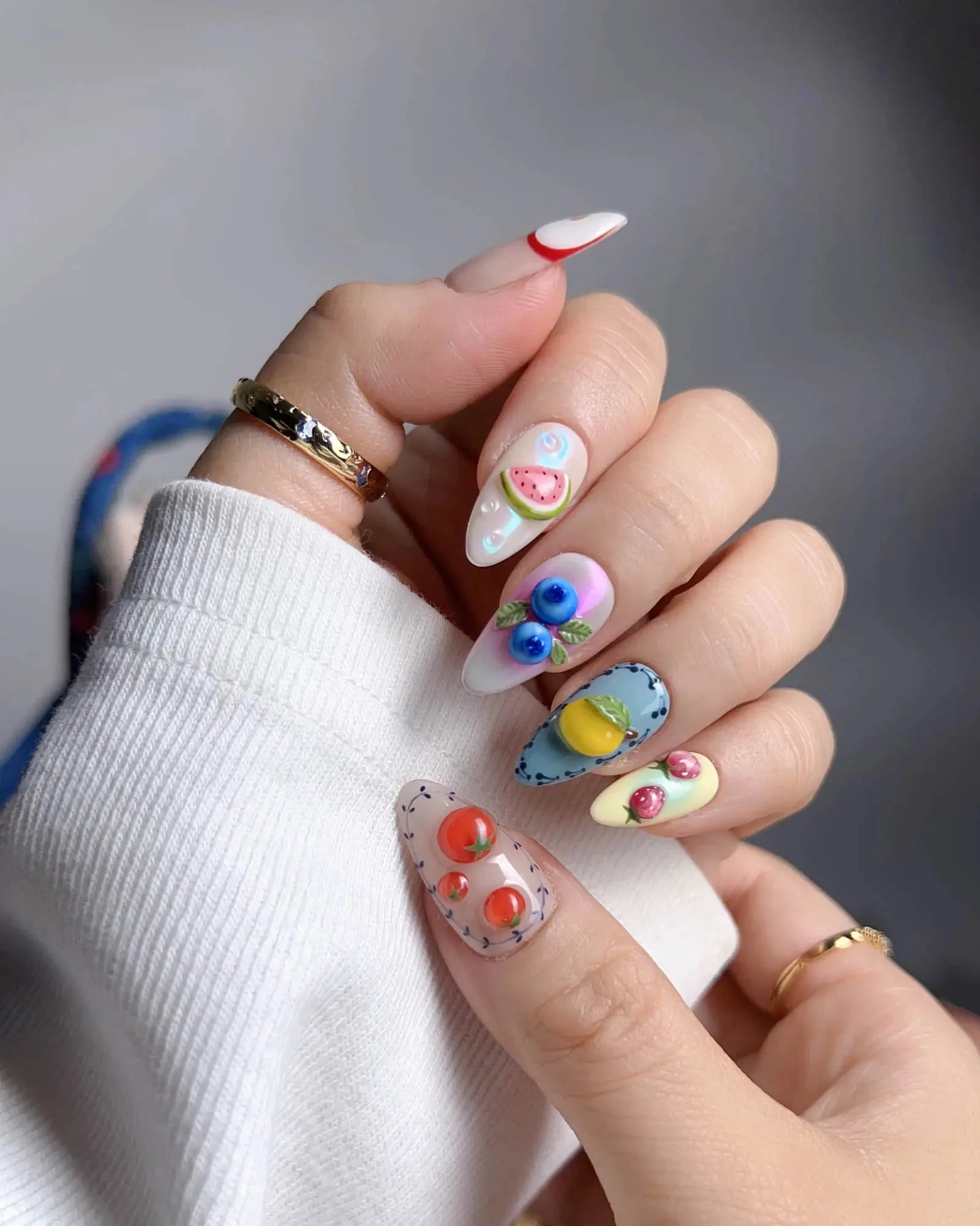 Like a perfect picnic spread—this design blends bright summer fruits across all nails with a colorful yet airy layout. Throw on a floral skirt, grab a tote bag, and take your juicy look outside.