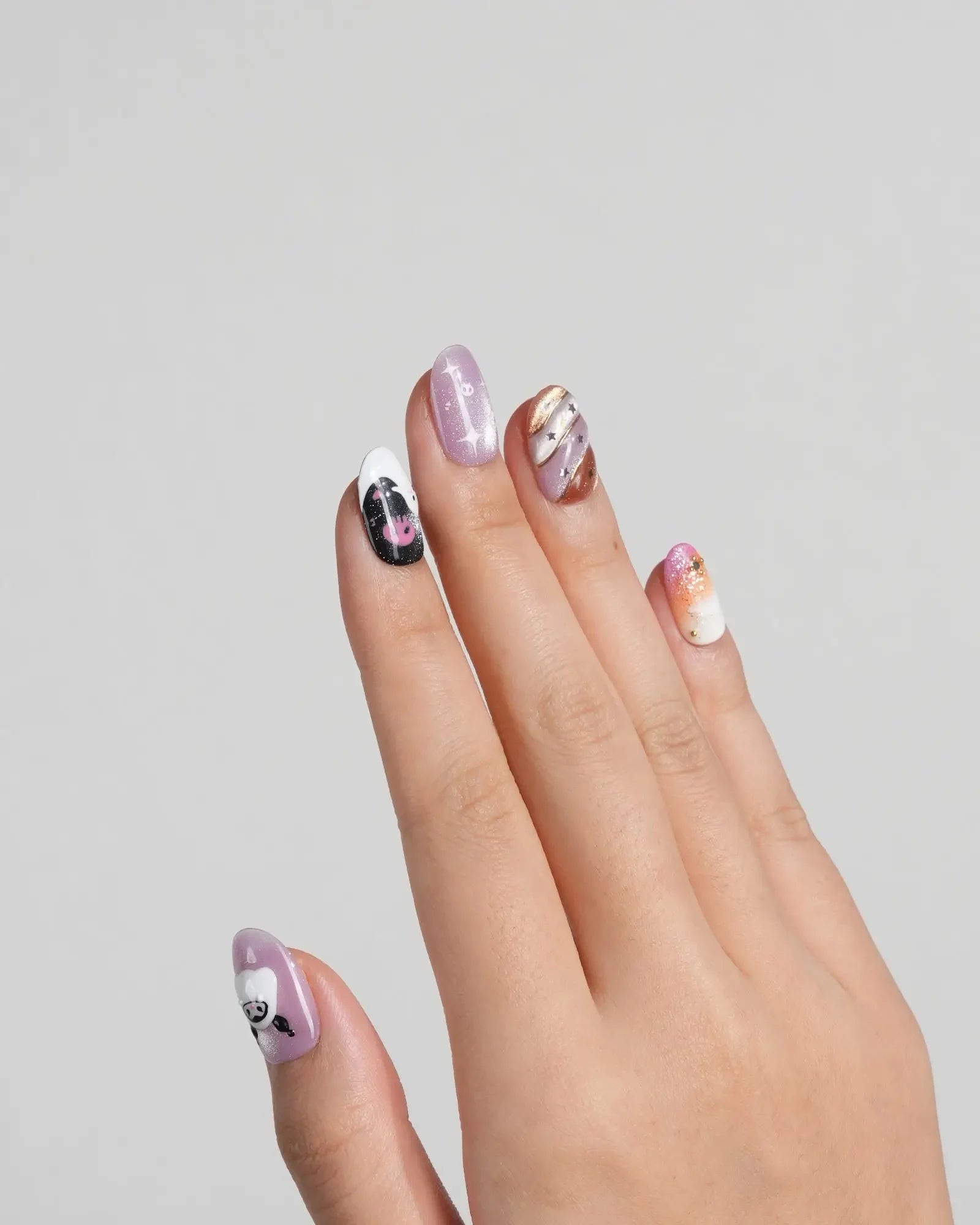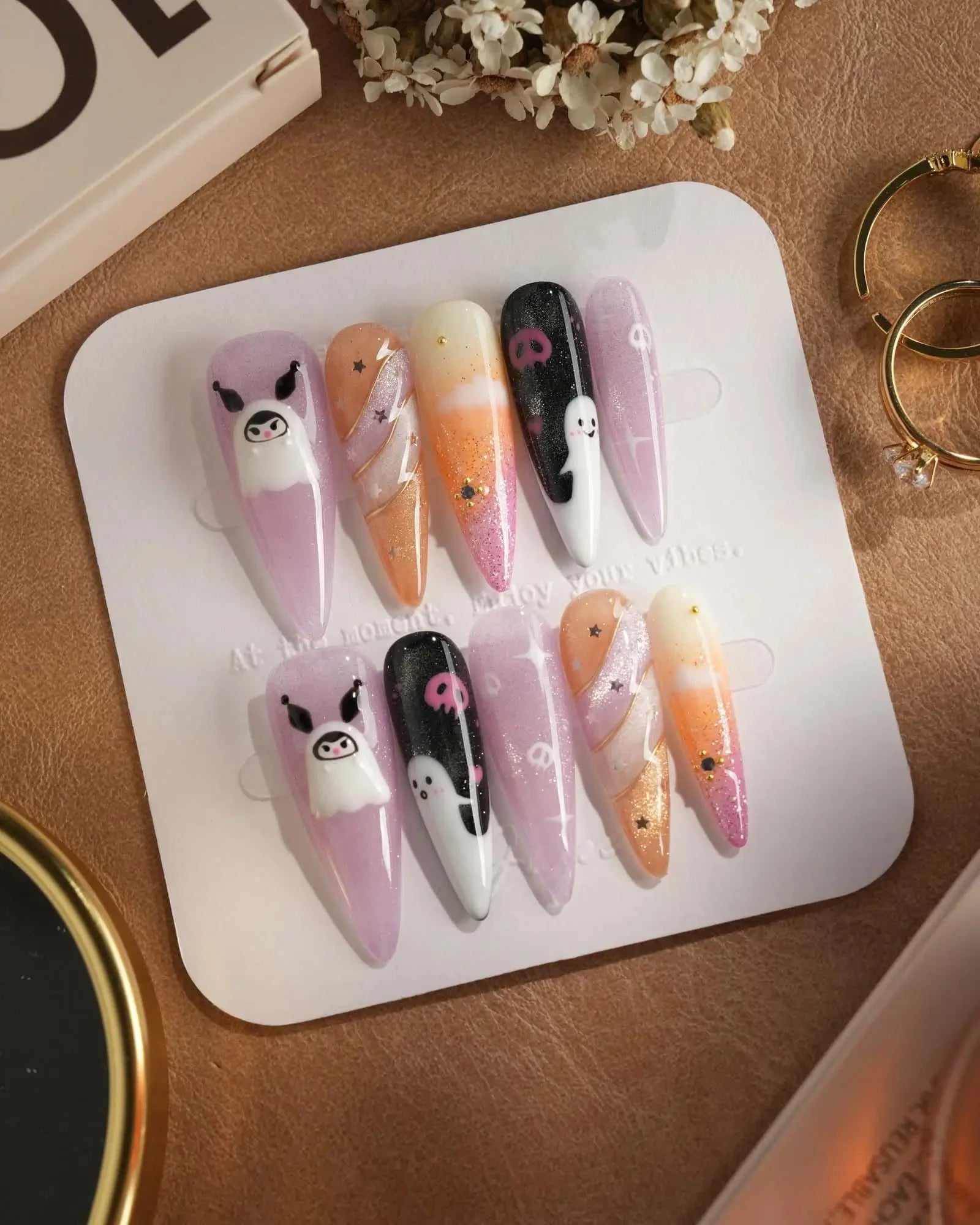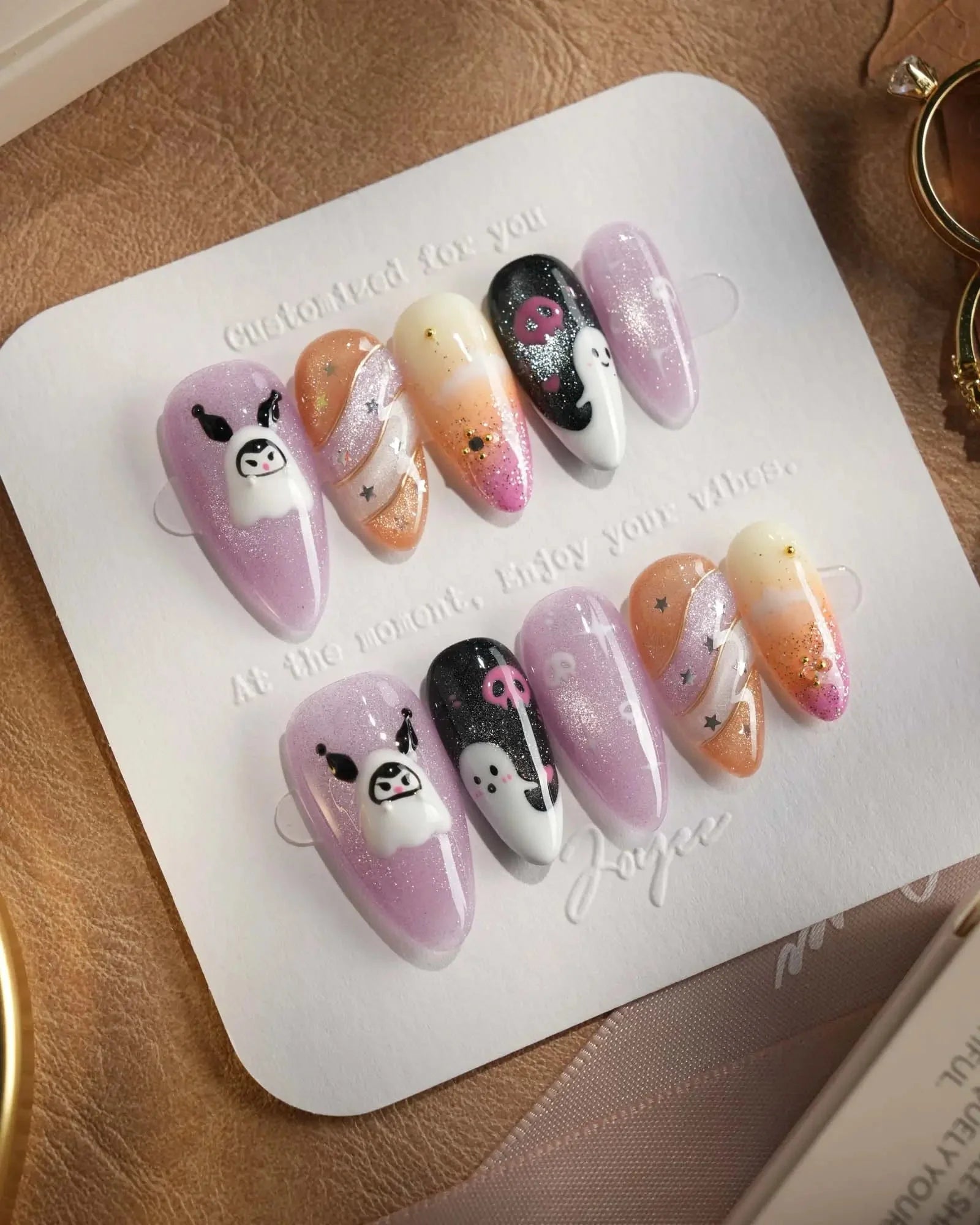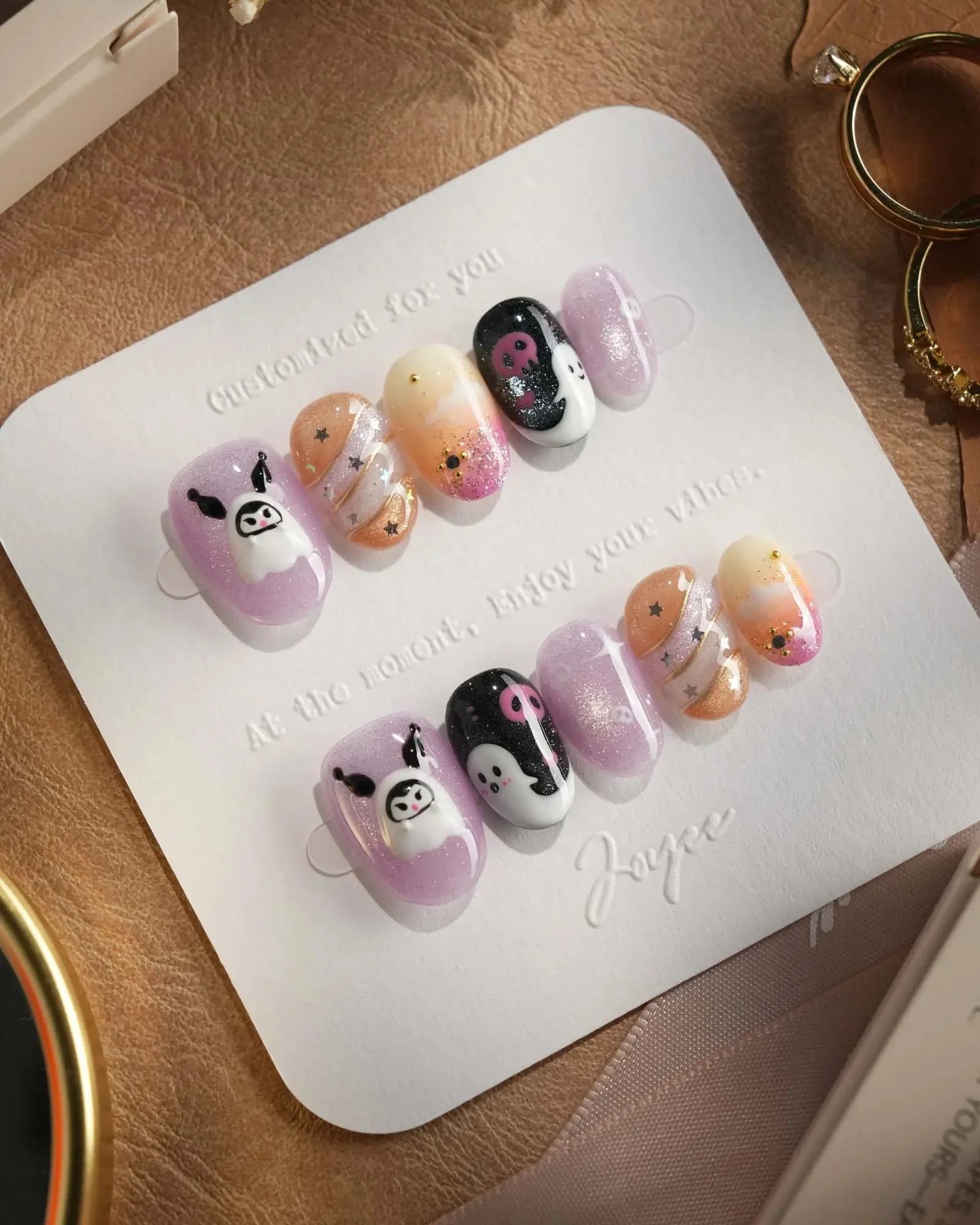 Celebrate Halloween in style with these lavender ghost starry nails. Featuring 3D ghost art, golden edges, and cat eye shimmer, each nail is handmade for a fun and chic look. Customizable in shape and length, this short oval set is also reusable—perfect for parties, masquerades, and festive events.