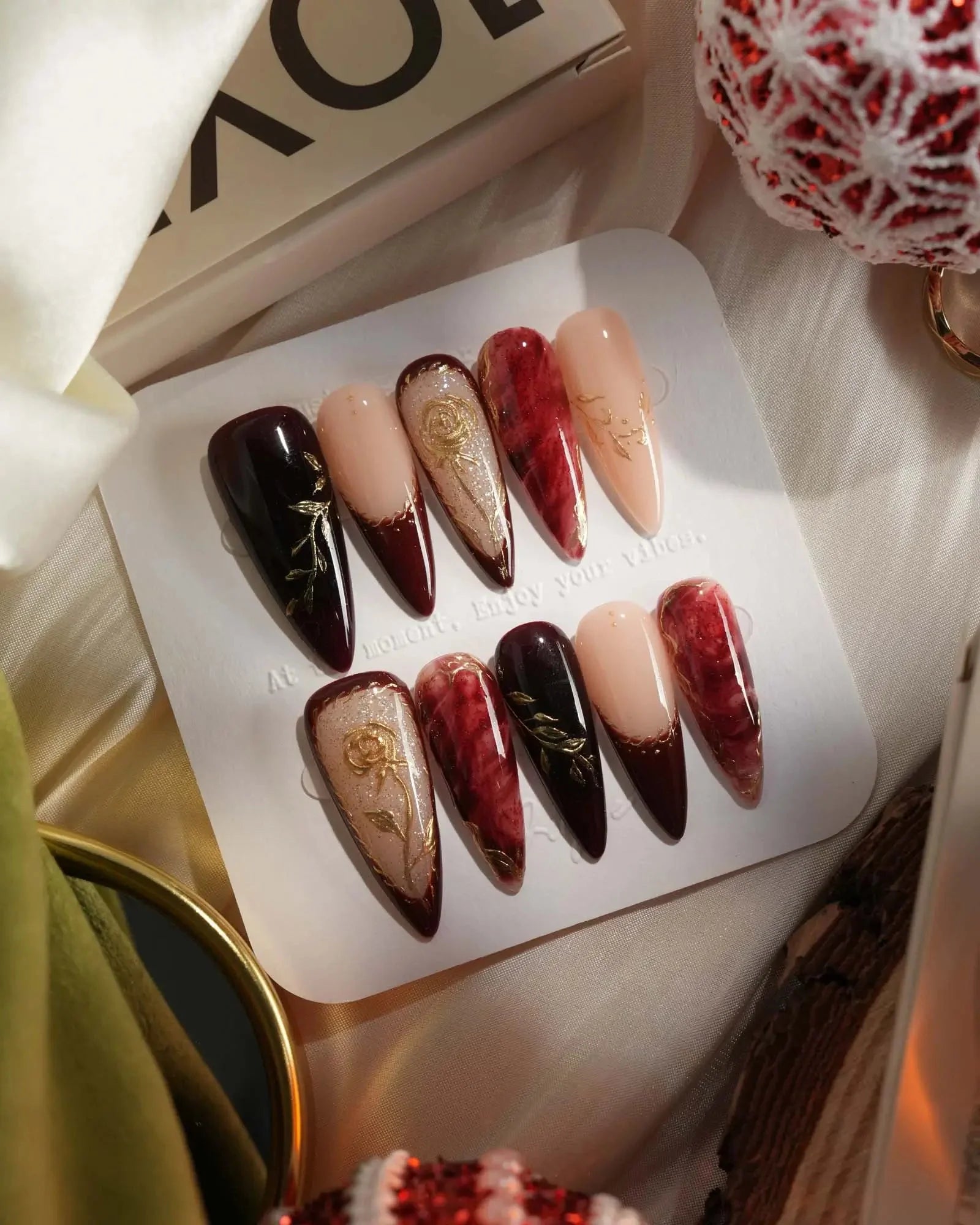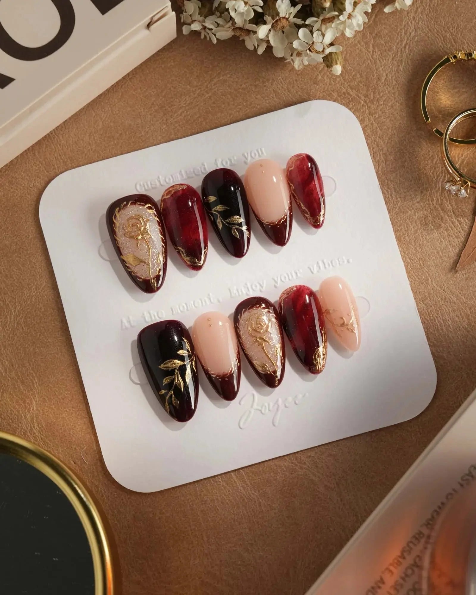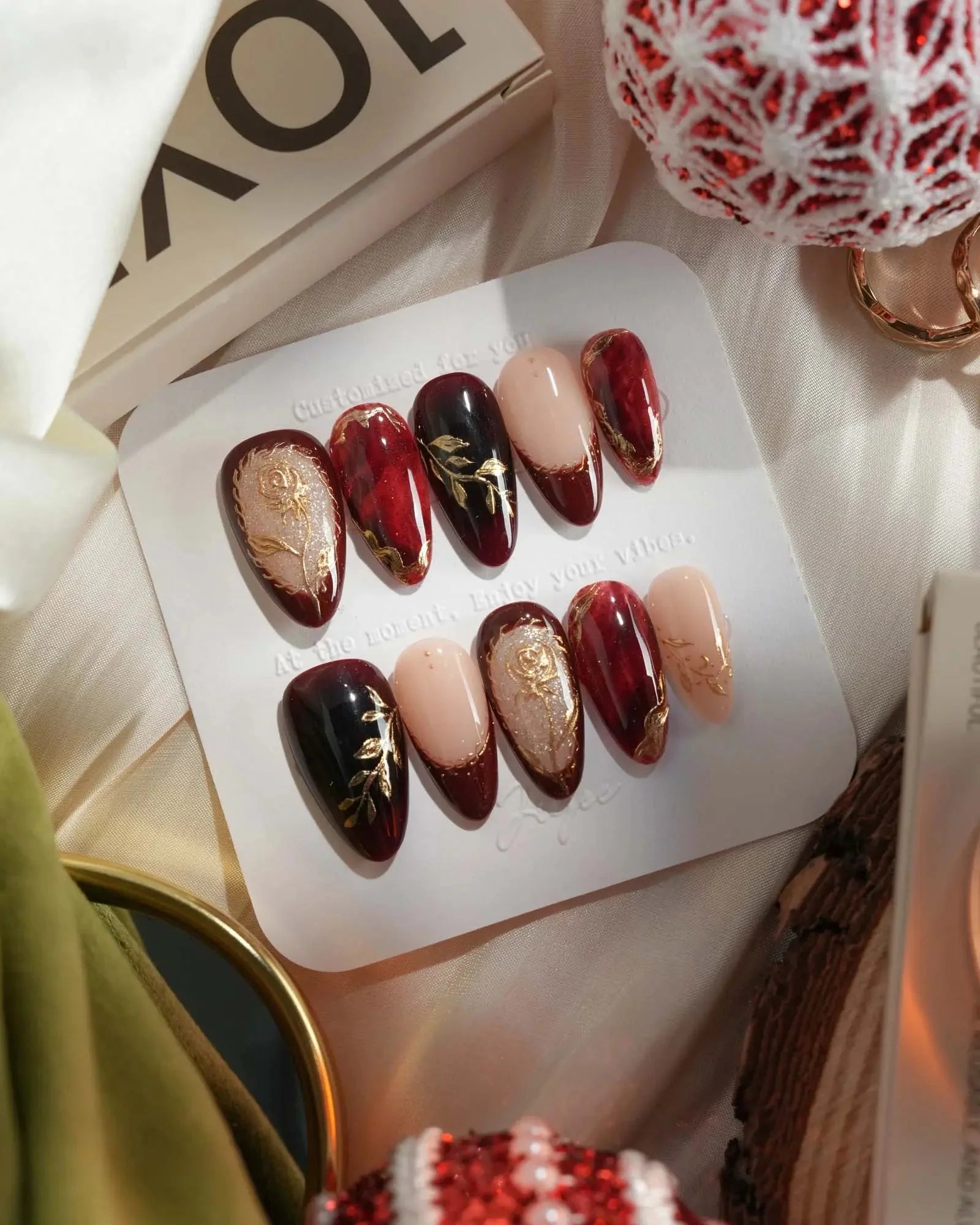 A deep red cat-eye press-on nail set adorned with golden roses, embossed leaves, and intricate baroque frames. The glossy layered finish combines vintage elegance with modern glamour—perfect for Christmas, parties, or any festive occasion.