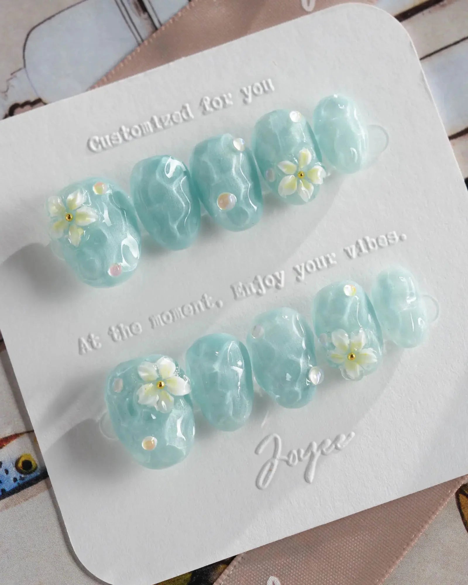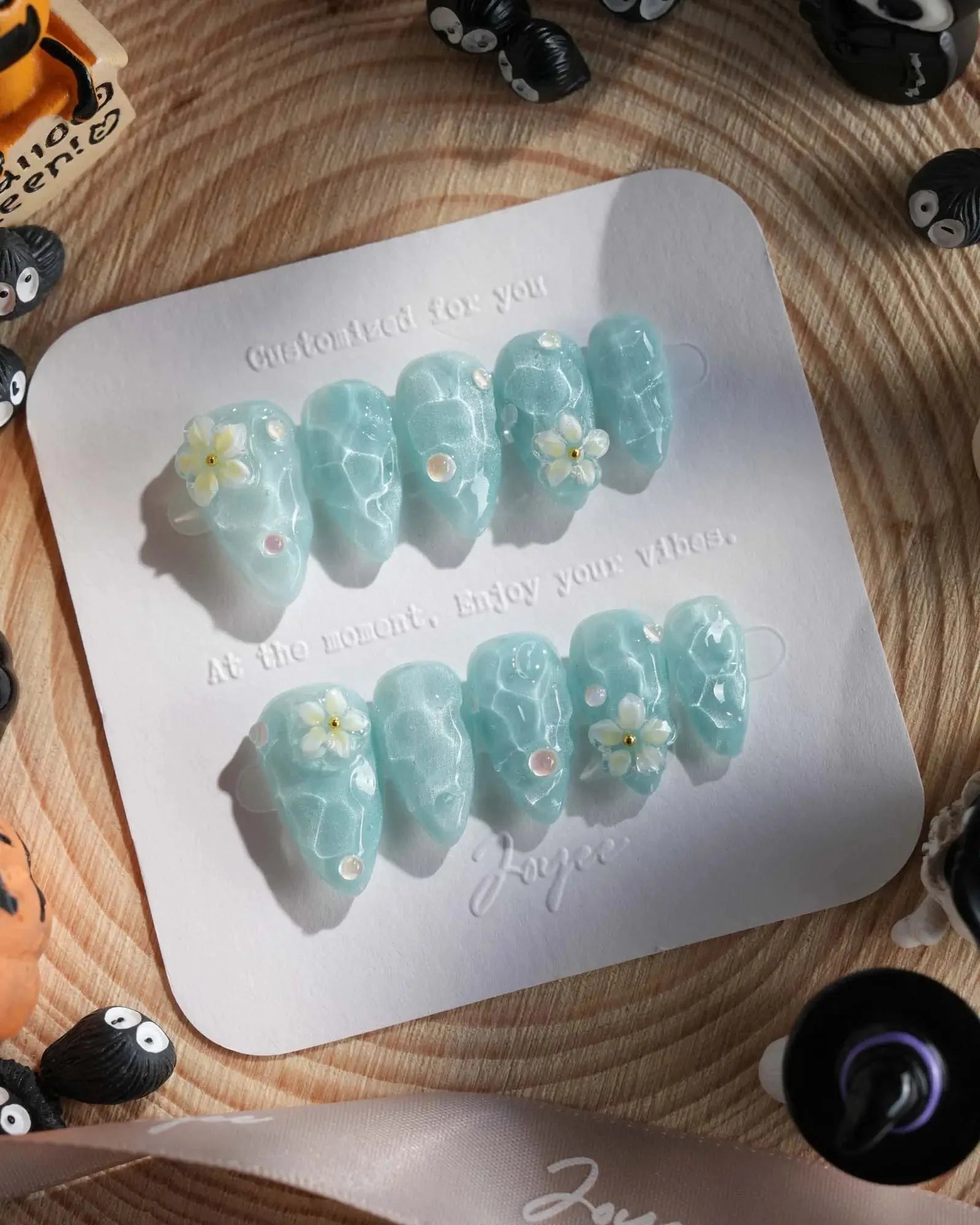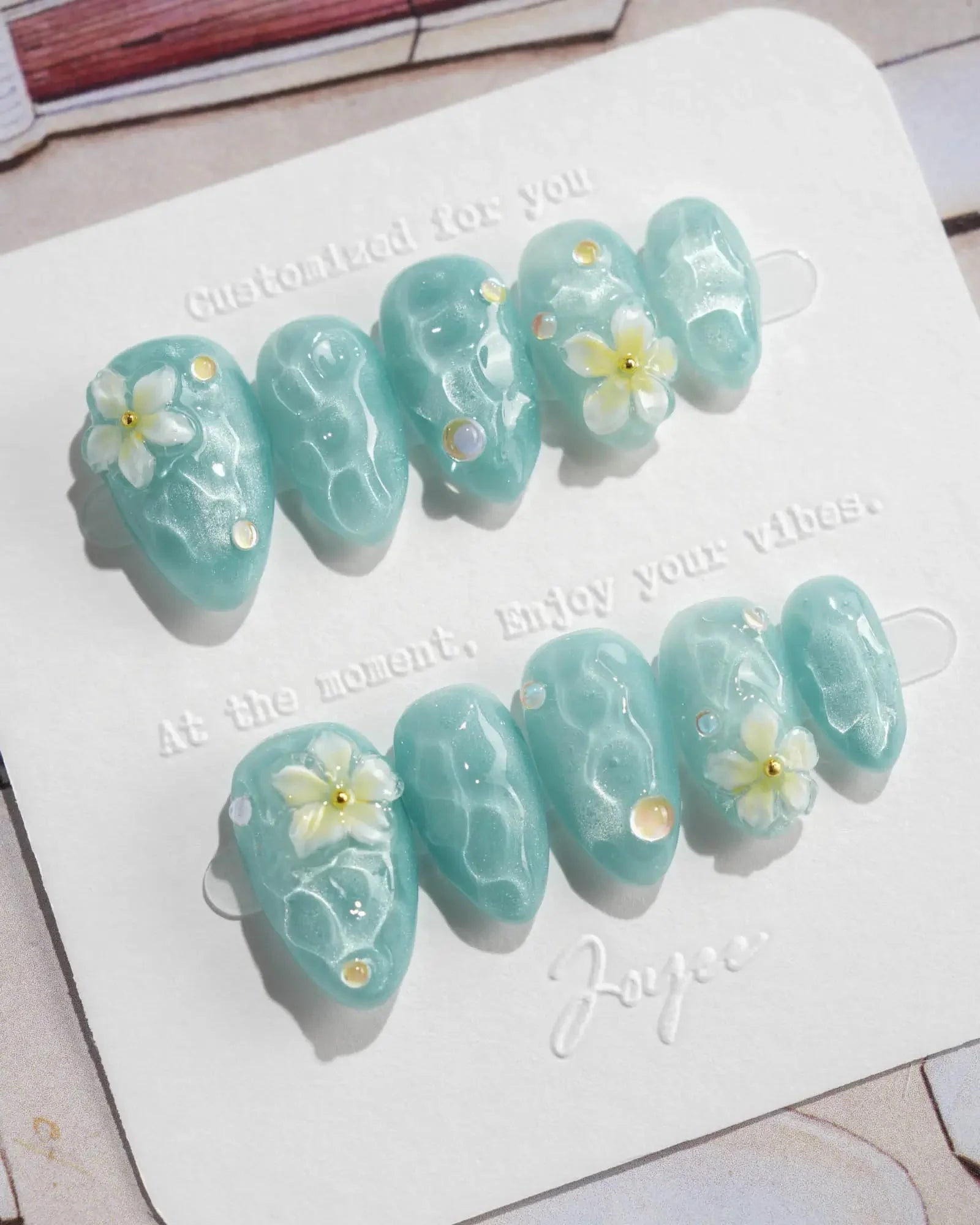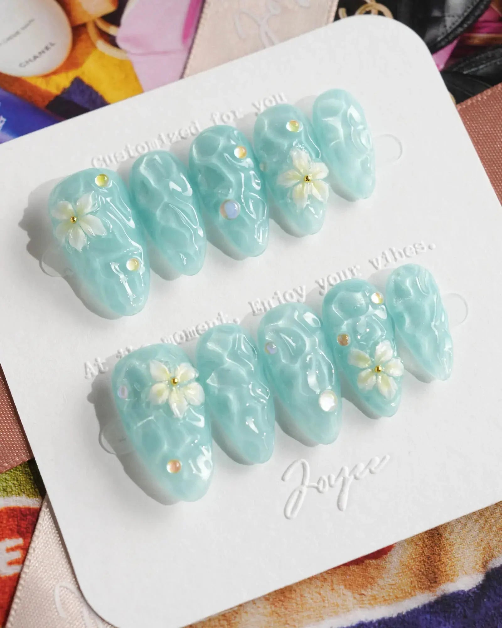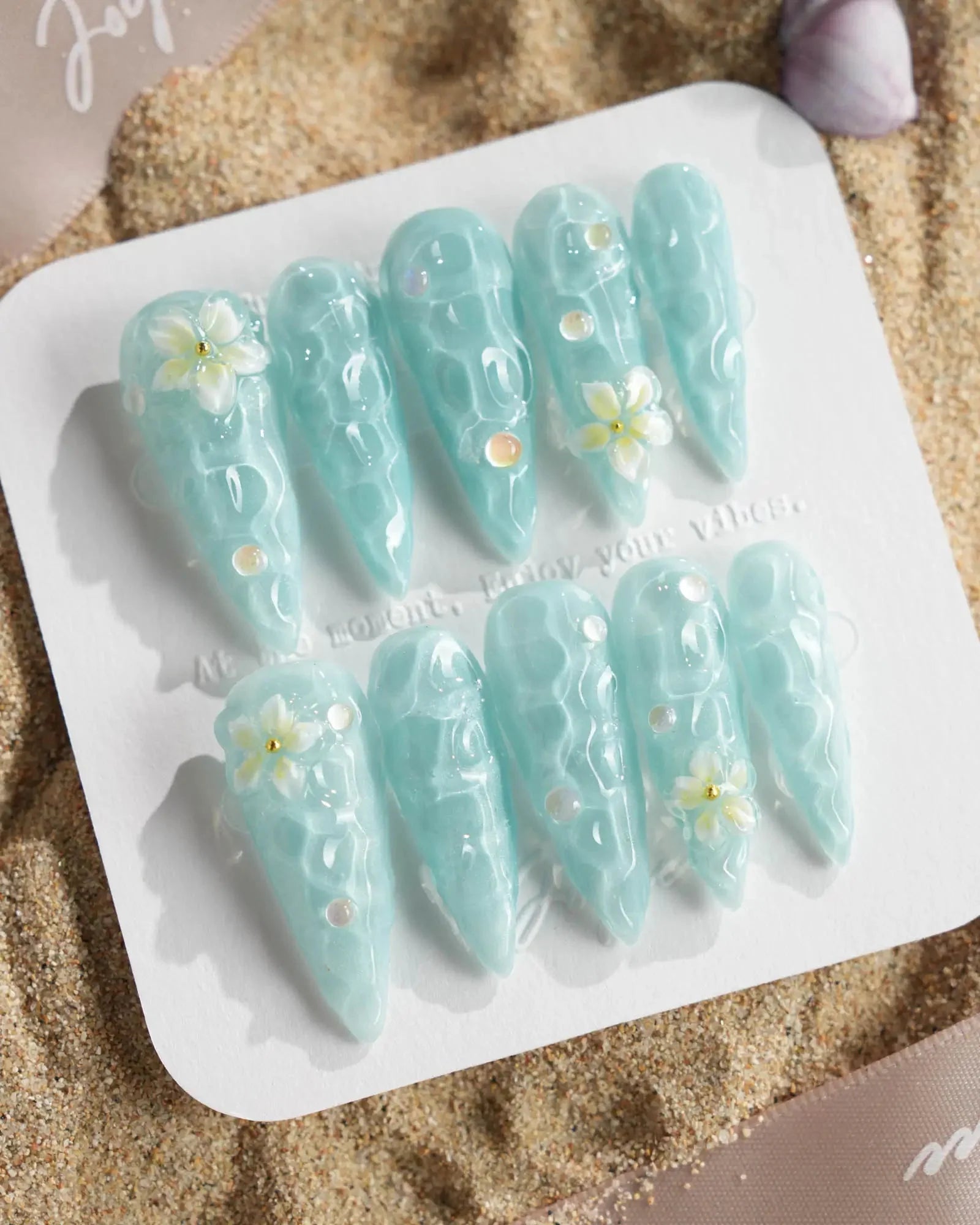 Dive into a serene seascape with these ocean wave nails, featuring aqua cat-eye textures and sculpted 3D floral details. The surface mimics the shimmer and flow of water ripples, finished with iridescent pearl embellishments for a light-catching effect. Perfectly balancing natural beauty with artistic texture, this set brings a refreshing coastal vibe to your fingertips—ideal for beach vacations, summer escapes, or simply channeling mermaidcore elegance.