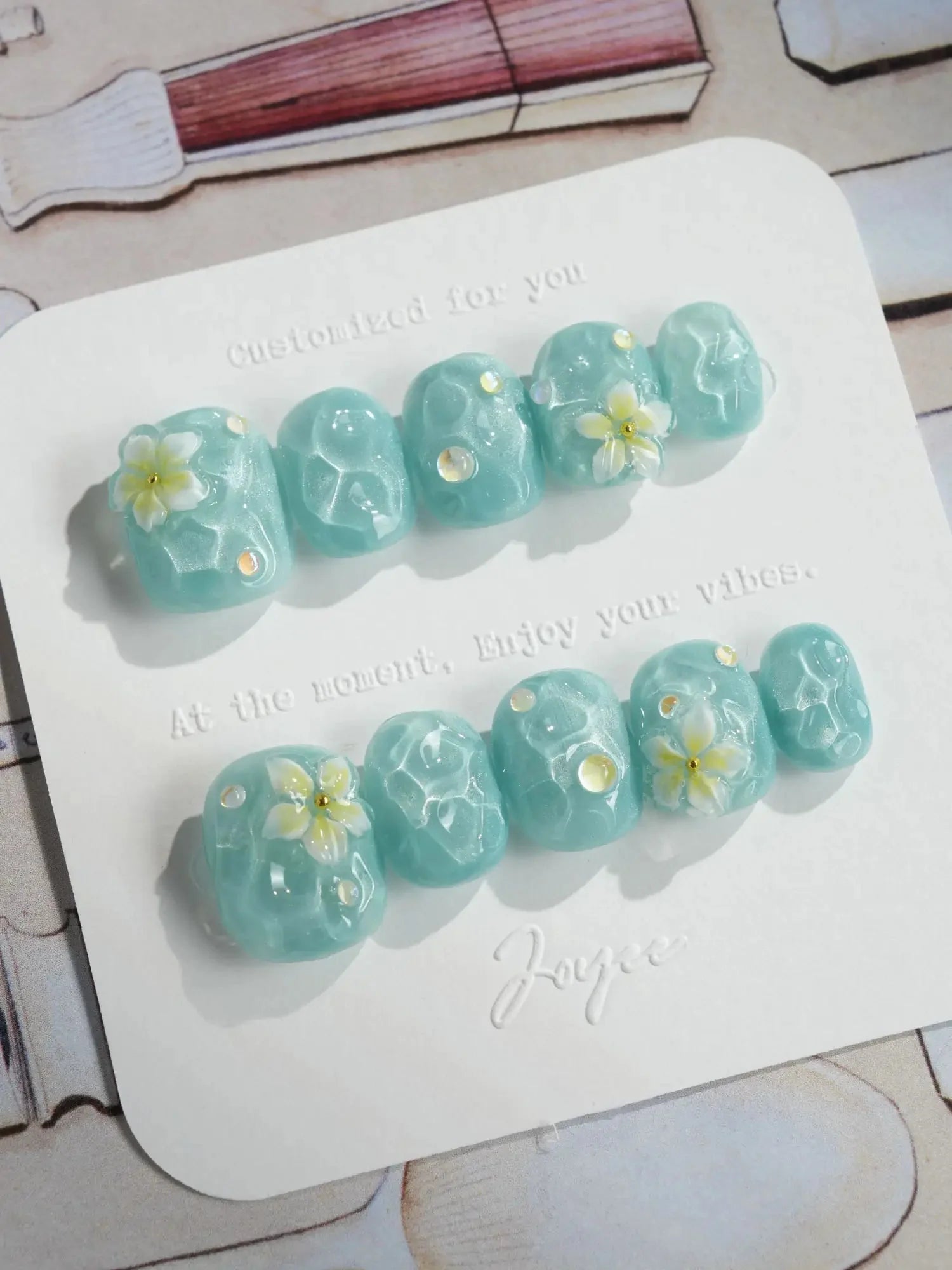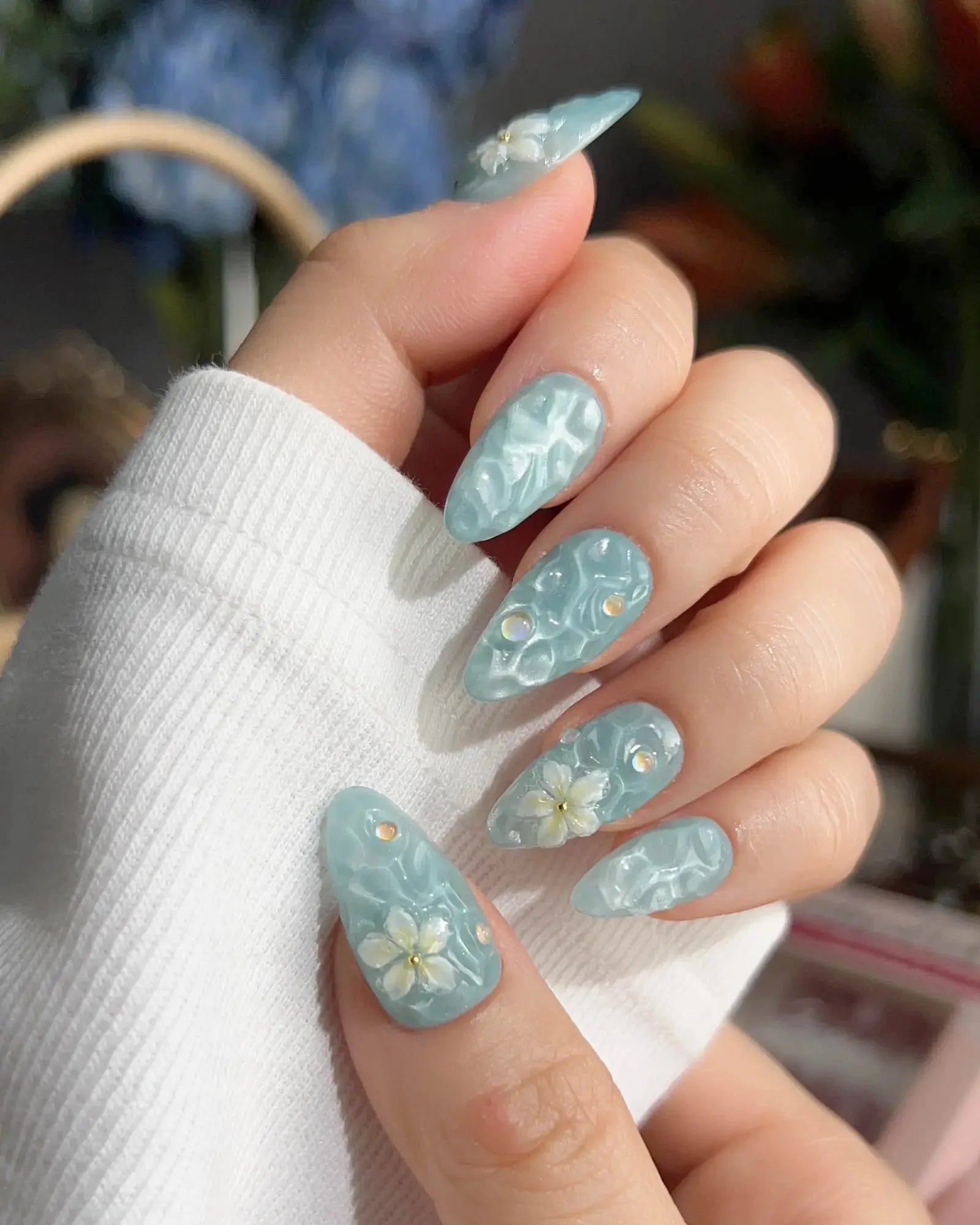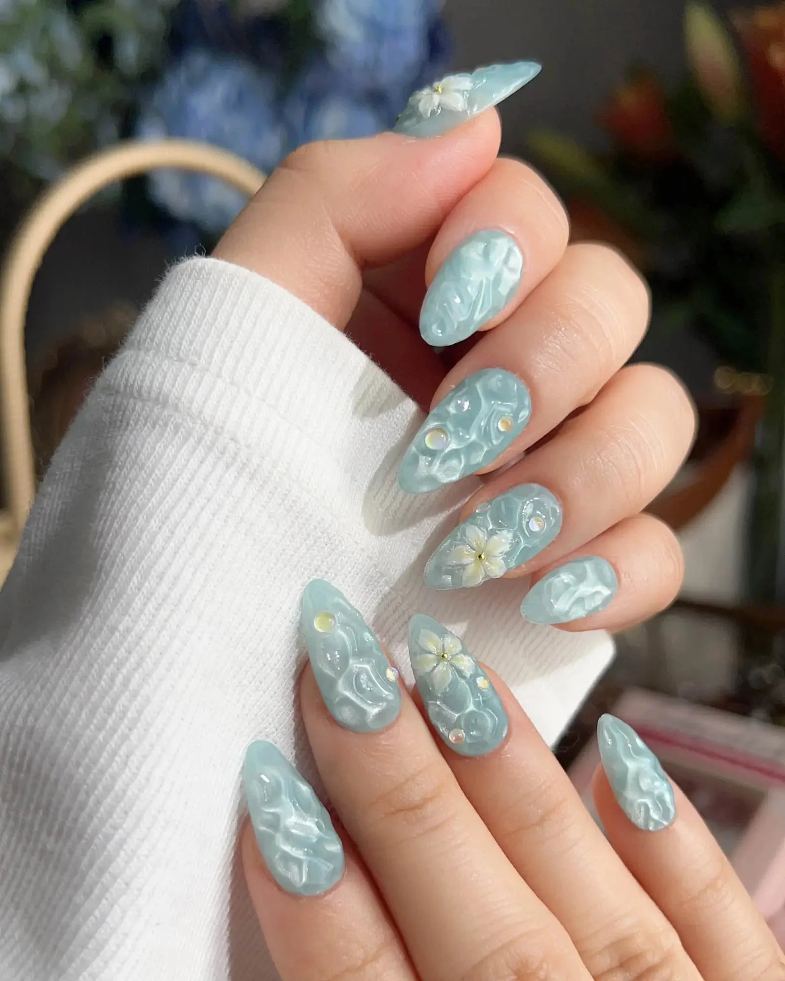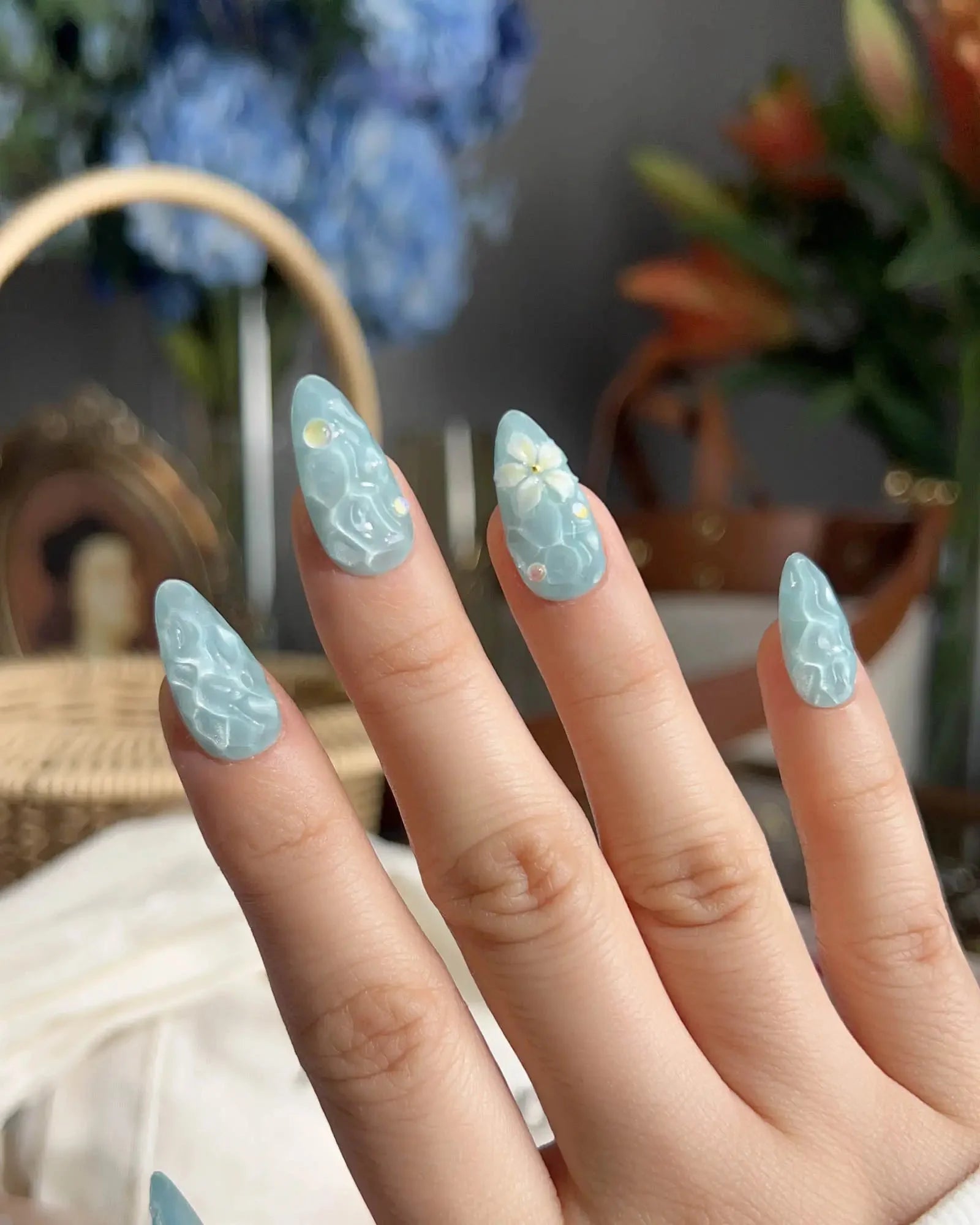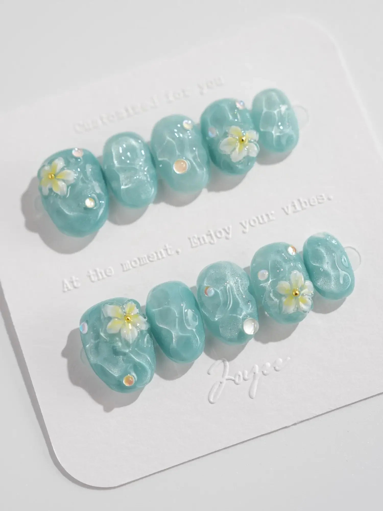 Dive into a serene seascape with these ocean wave nails, featuring aqua cat-eye textures and sculpted 3D floral details. The surface mimics the shimmer and flow of water ripples, finished with iridescent pearl embellishments for a light-catching effect. Perfectly balancing natural beauty with artistic texture, this set brings a refreshing coastal vibe to your fingertips—ideal for beach vacations, summer escapes, or simply channeling mermaidcore elegance.