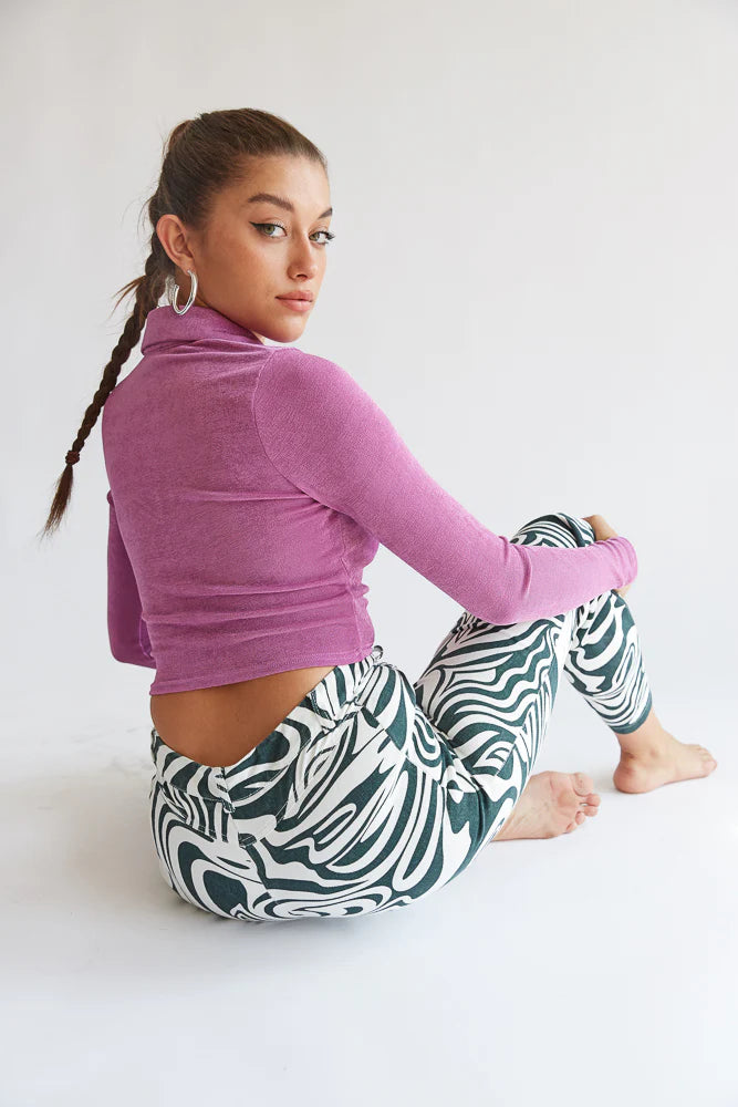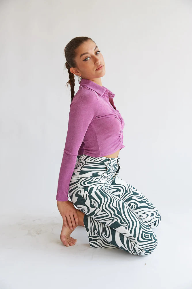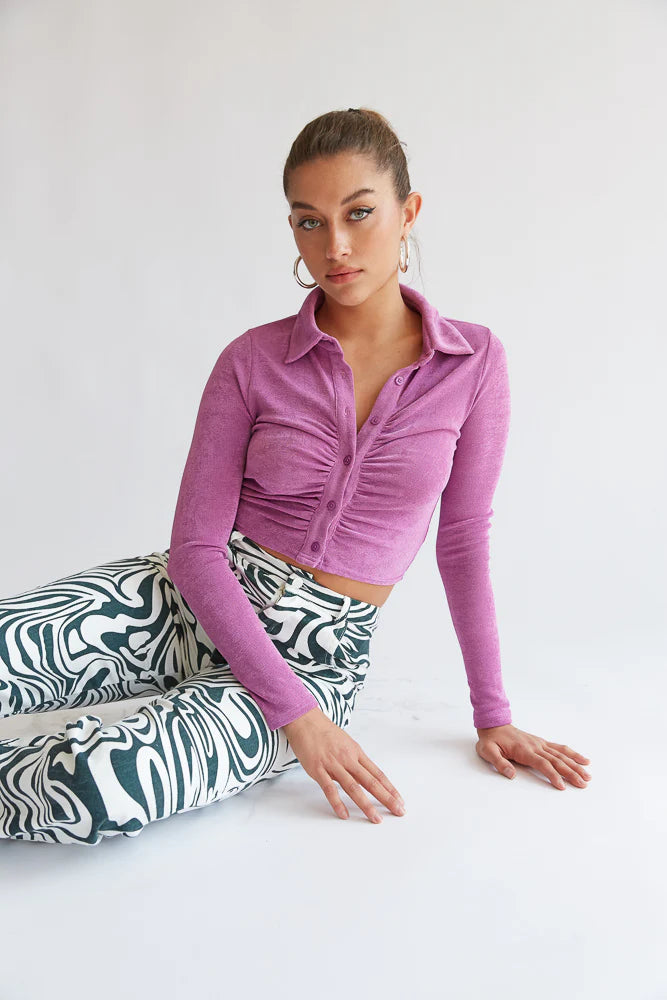 Hey groovy babe, meet the Glendale Collared Crop Top! This piece is complete with a ruched button up front, a pointed collar, and a slinky metallic material. Available in purple and taupe.