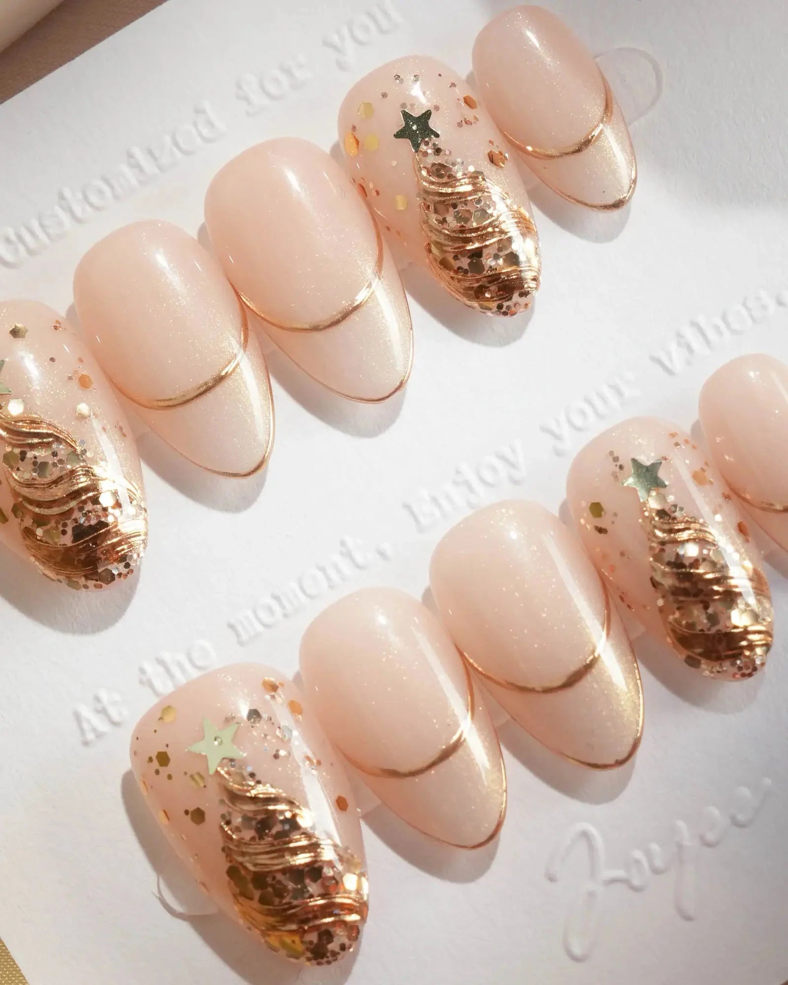 These gold French Christmas nails bring a timeless elegance with nude cat-eye finish, metallic tree accents, and fine gold edges. The blend of soft nude and shimmering gold makes this set perfect for daily wear, winter parties, and chic holiday gatherings.