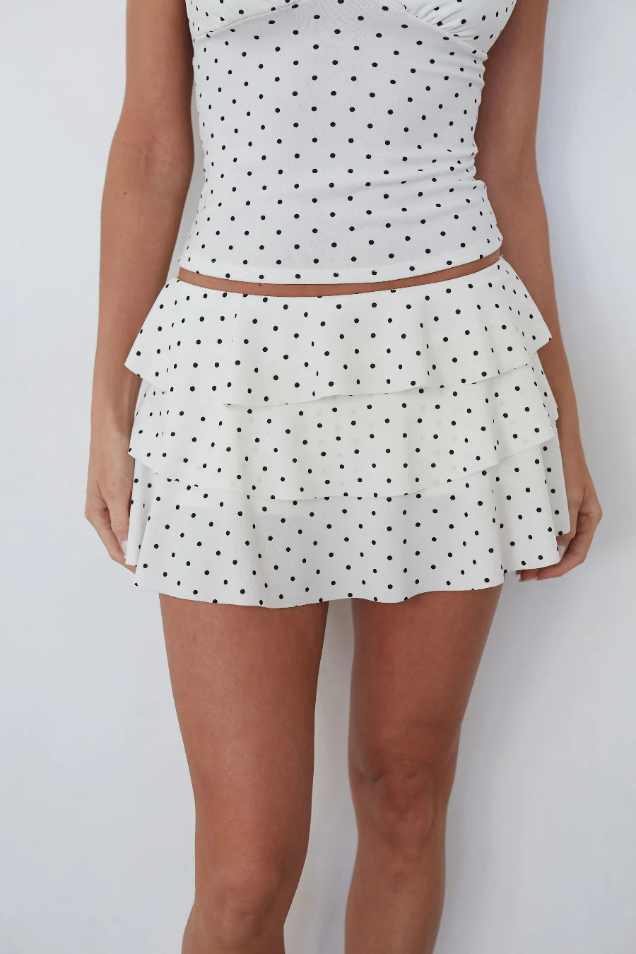 Stay classic in the Gracie Polka Dot Ruffle Mini Skort This mini features a tiered ruffle skirt, flare silhouette, and built-in shorts. in Black with White Polka Dot Print, pair with the matching Gracie Polka Dot Halter Top to complete the look!