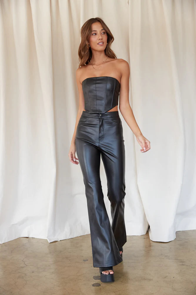 Trending for fall: the Harley Faux Leather Corset Top! This flattering corset features a straight across strapless neckline, lace up back, and inner boning. Available in black and red. Pair this top with the Kourt Faux Leather Mini Skirt for a total baddie look!