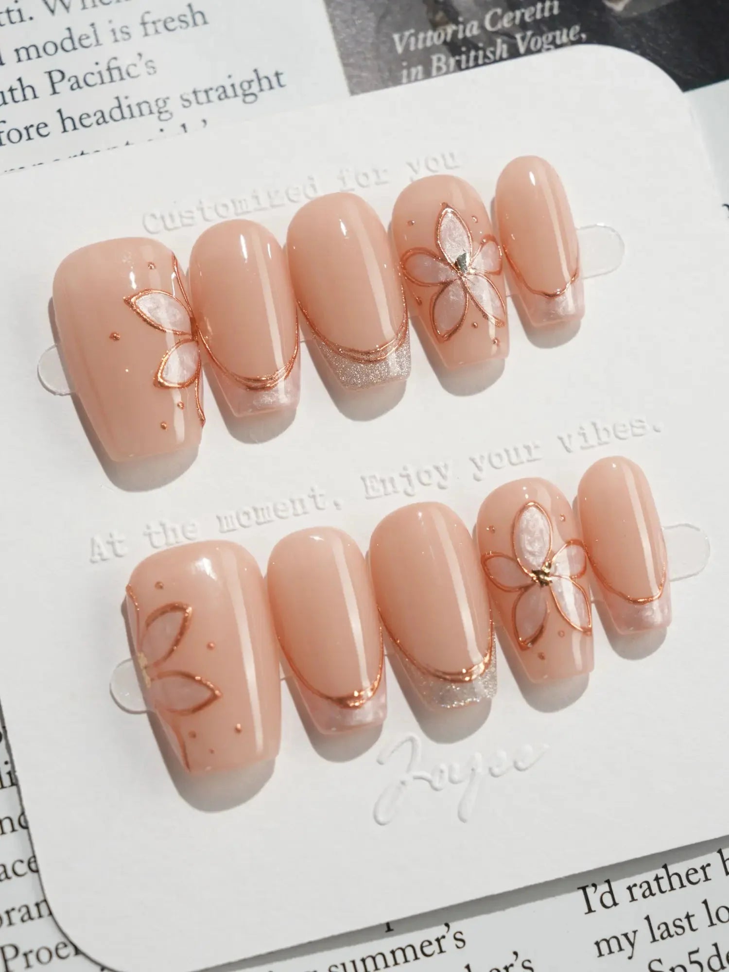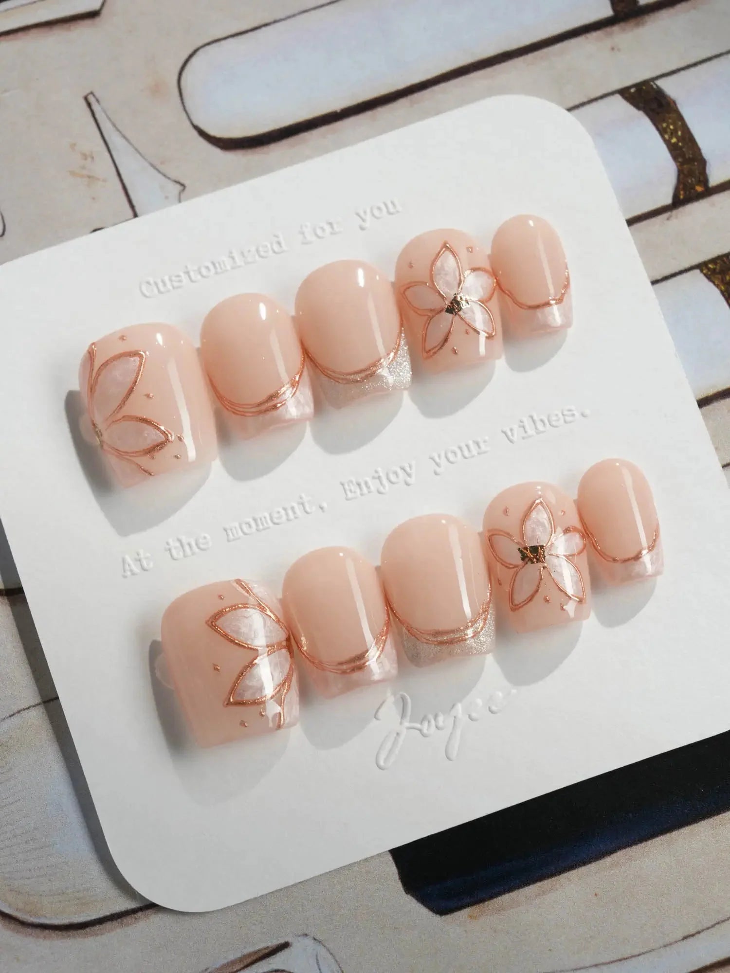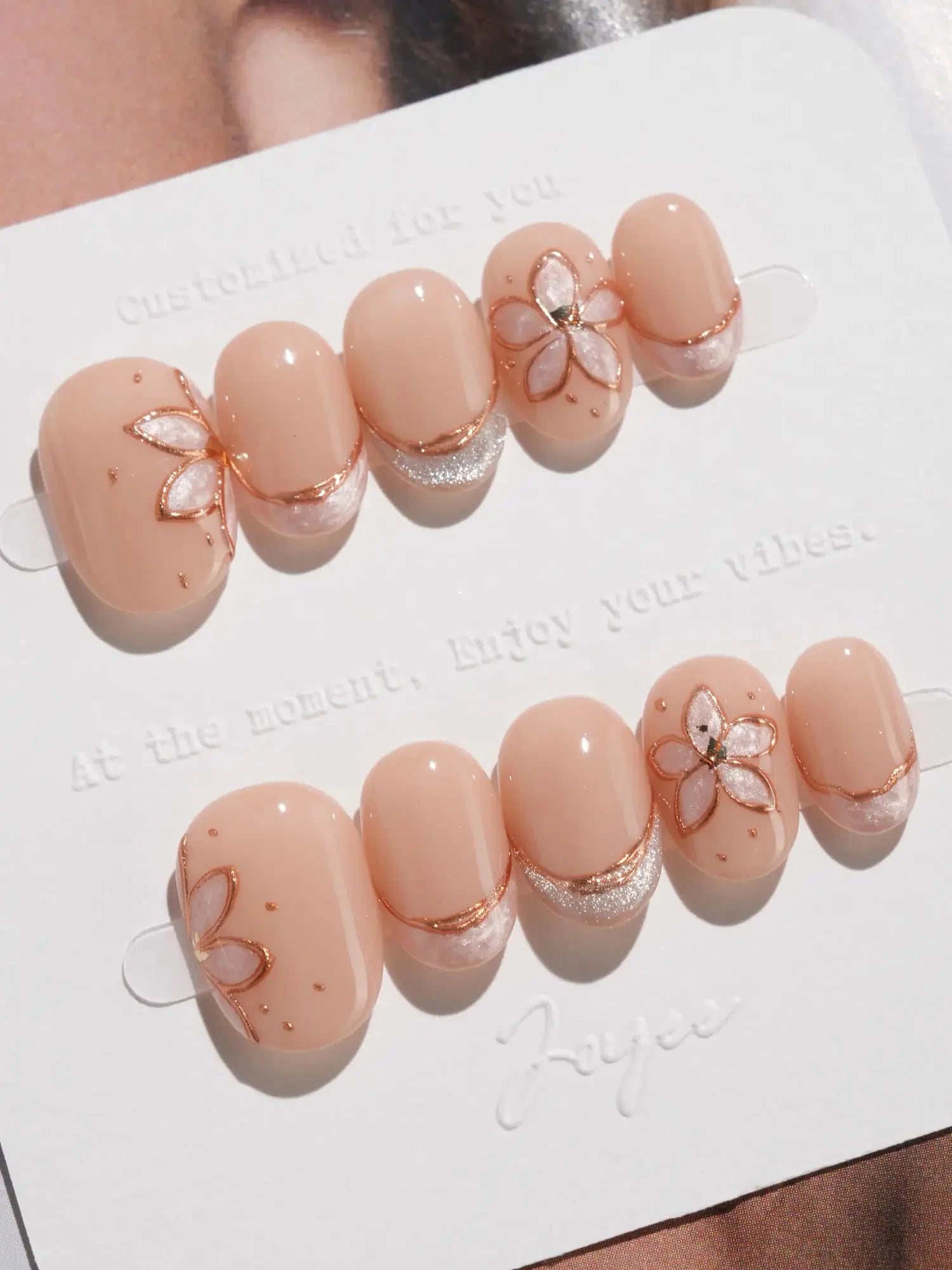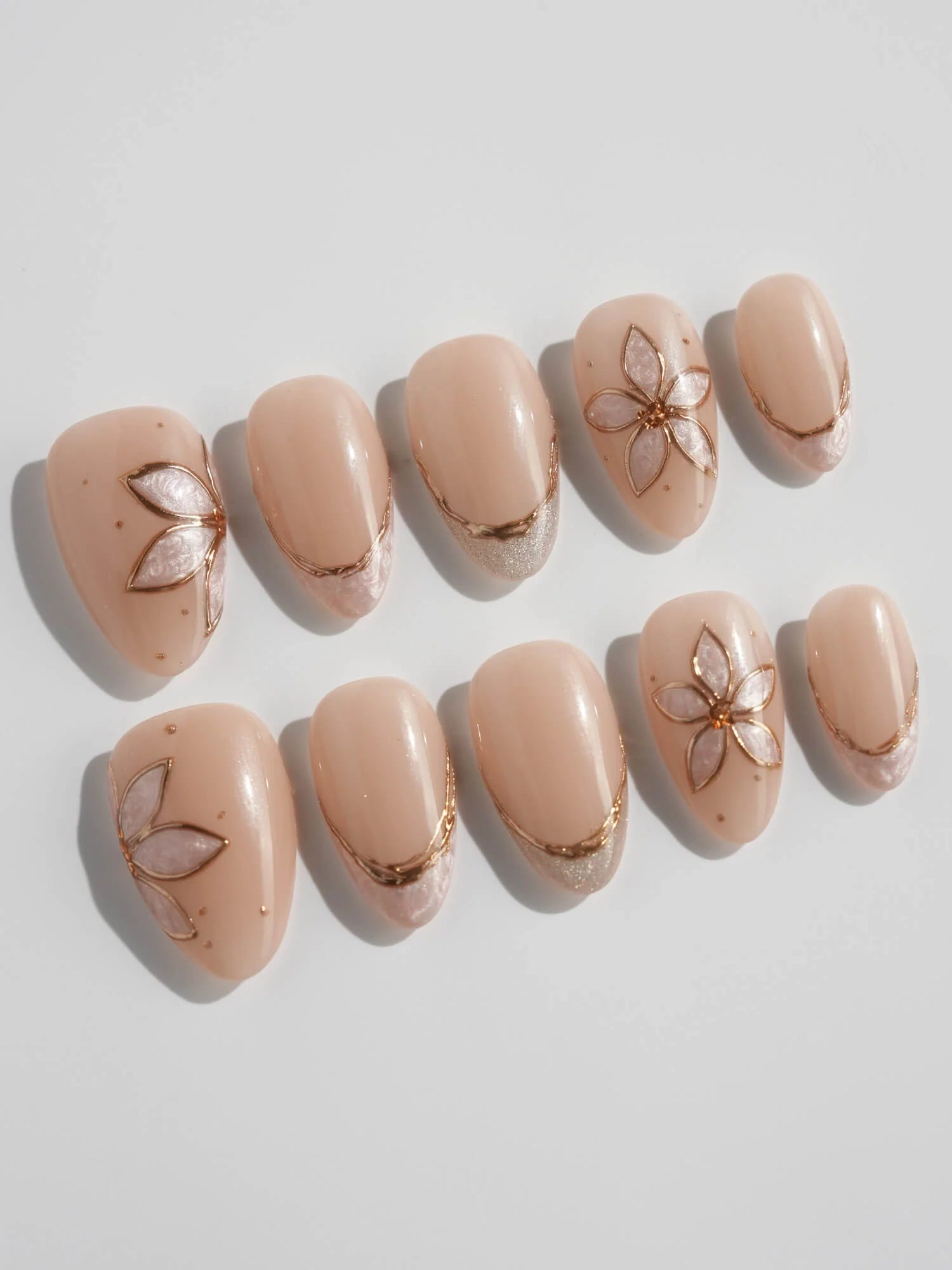 Elegant and understated, this set brings natural beige tones to life with delicate gold-outlined petals and soft shimmer accents. Each nail is handcrafted to reflect gentle light, while the embedded floral designs add a graceful, jewelry-like charm. A perfect blend of minimalism and luxury in one wearable piece.