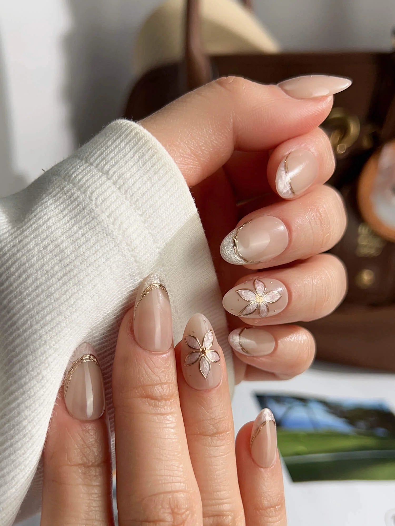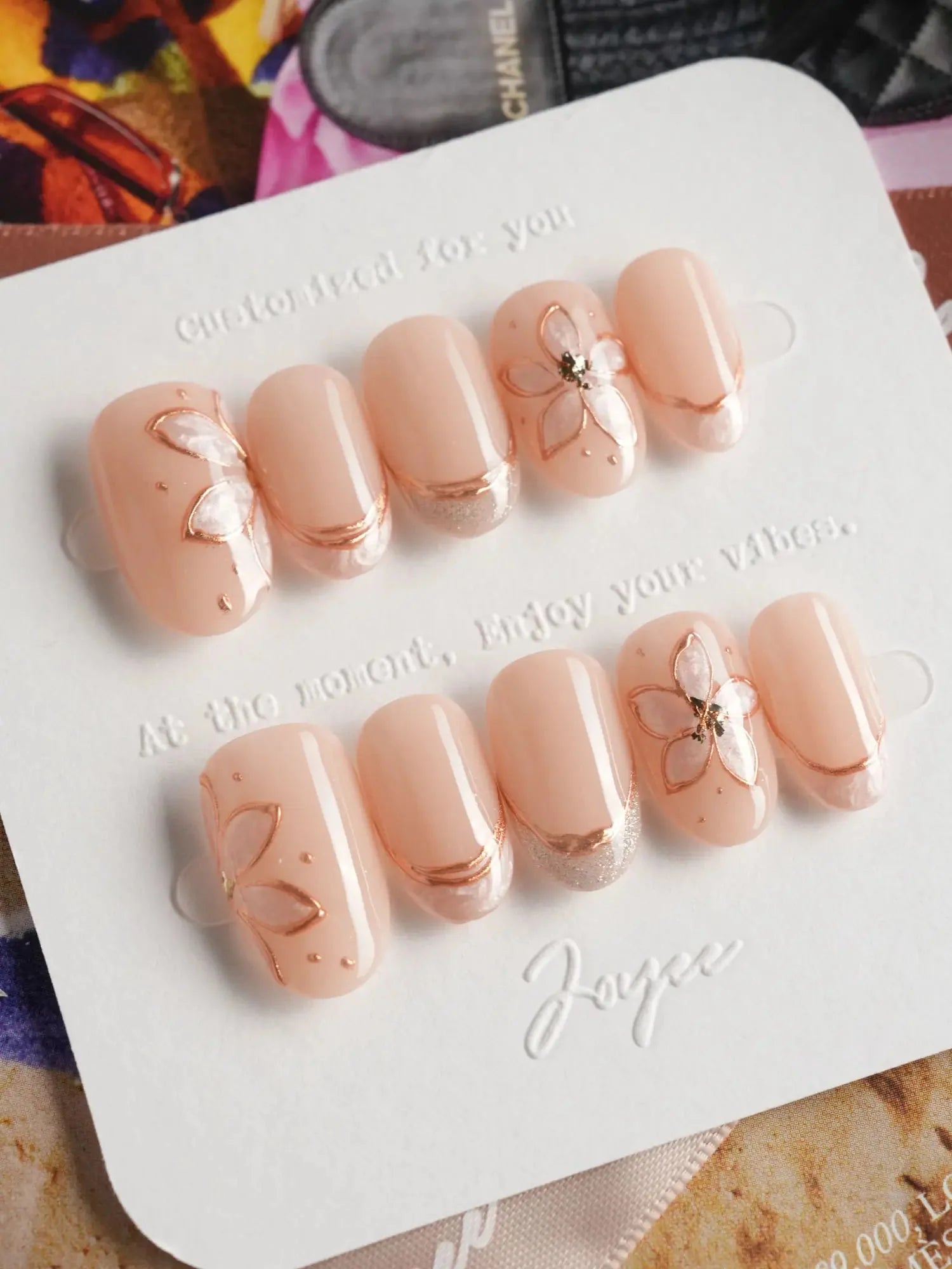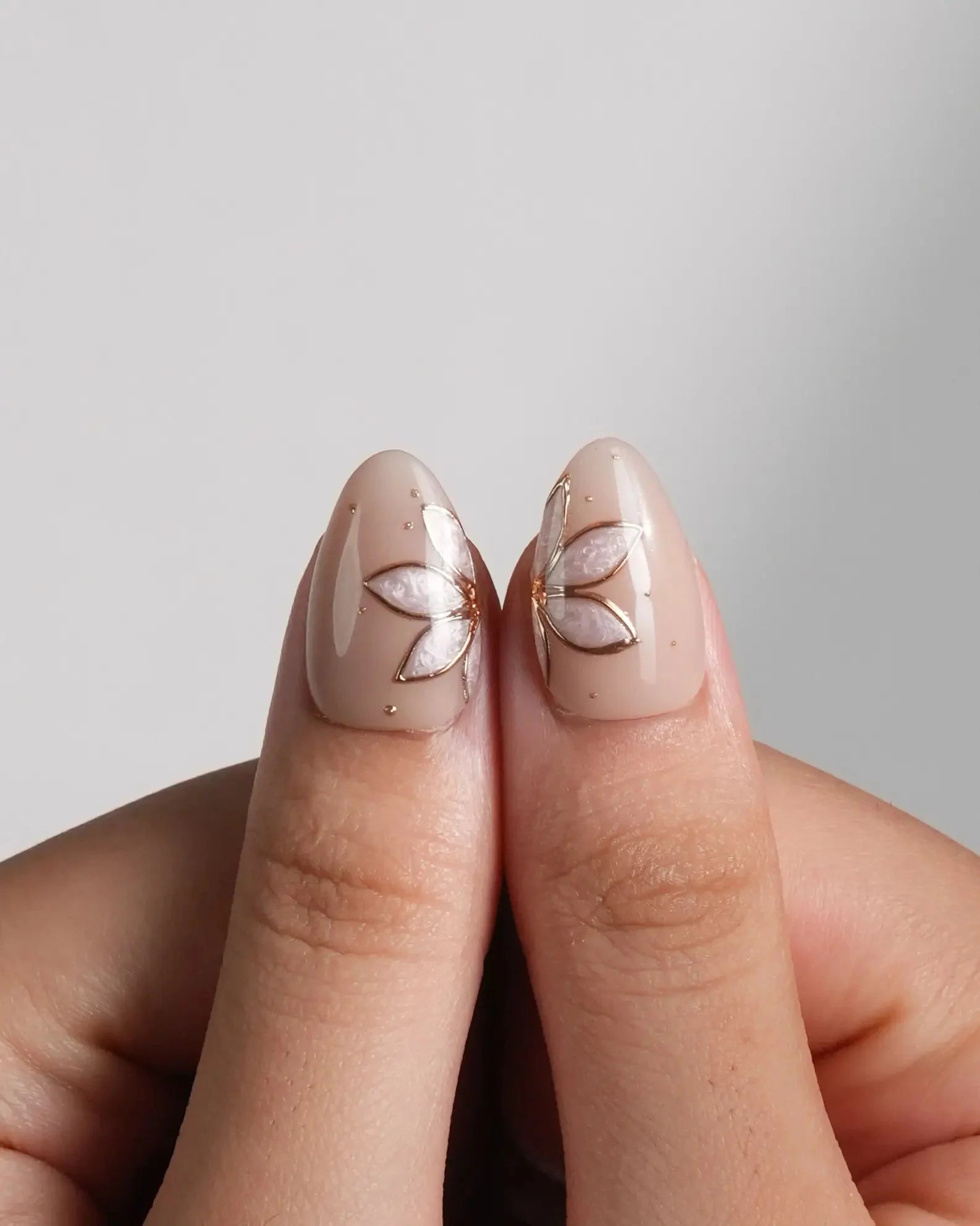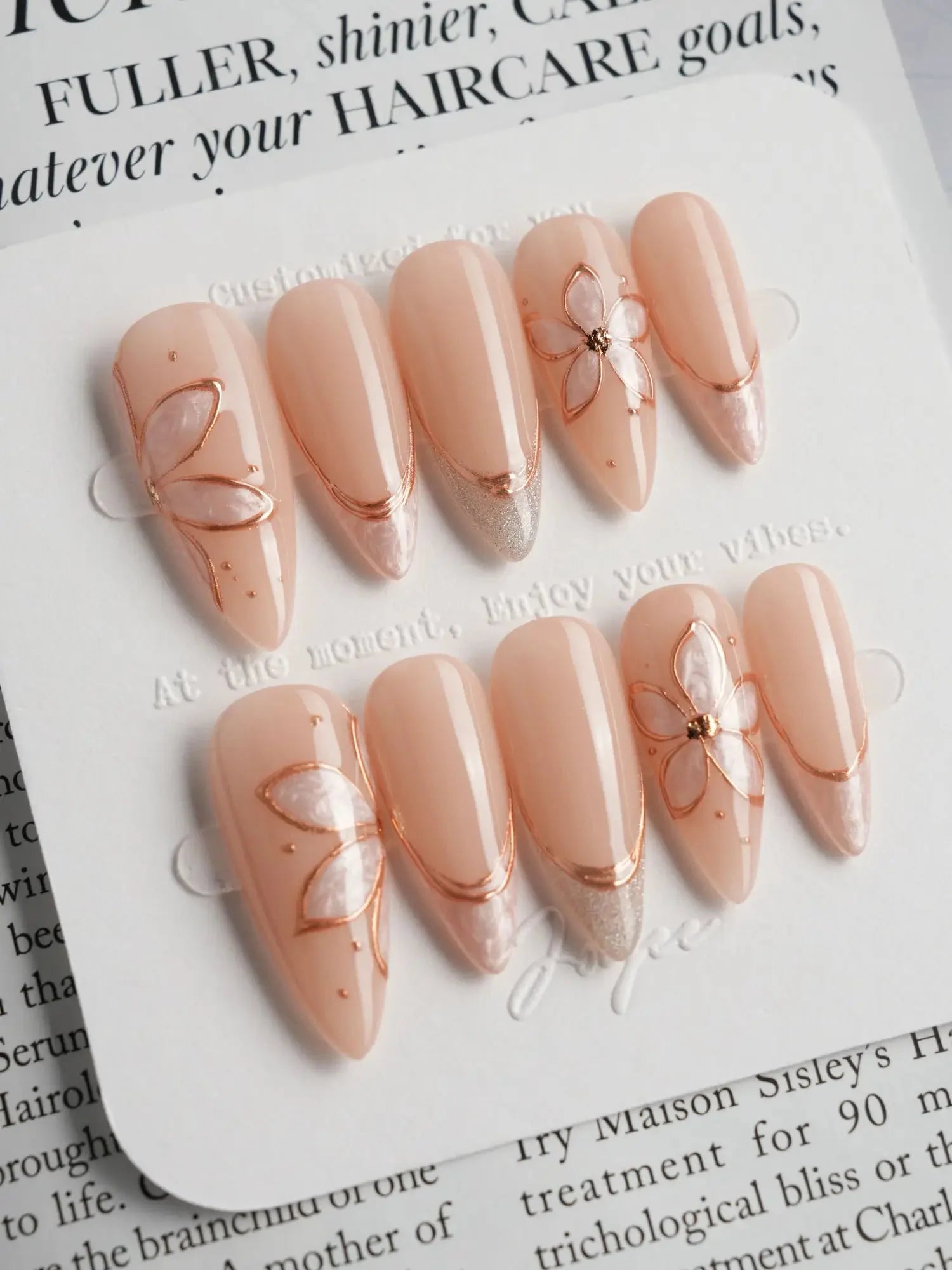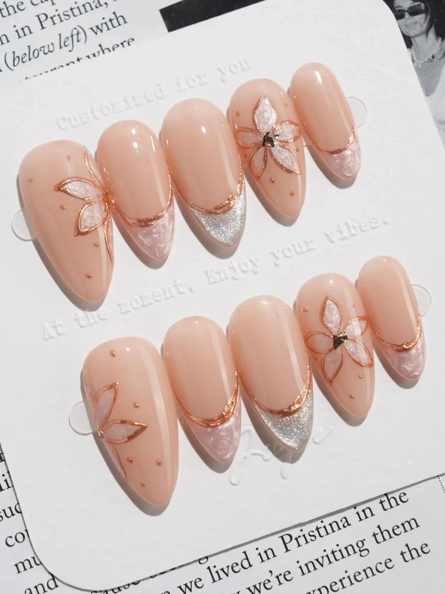 Elegant and understated, this set brings natural beige tones to life with delicate gold-outlined petals and soft shimmer accents. Each nail is handcrafted to reflect gentle light, while the embedded floral designs add a graceful, jewelry-like charm. A perfect blend of minimalism and luxury in one wearable piece.