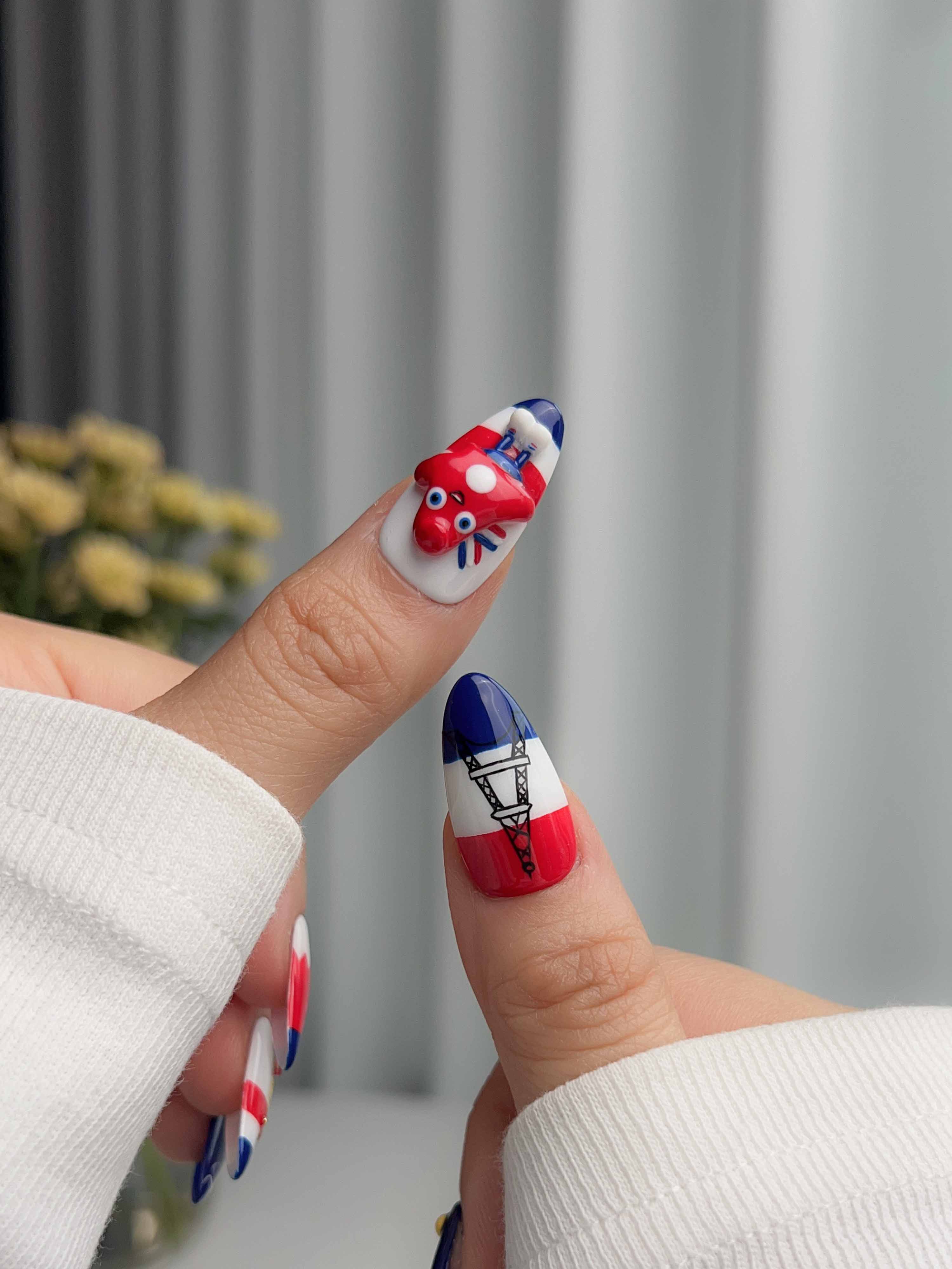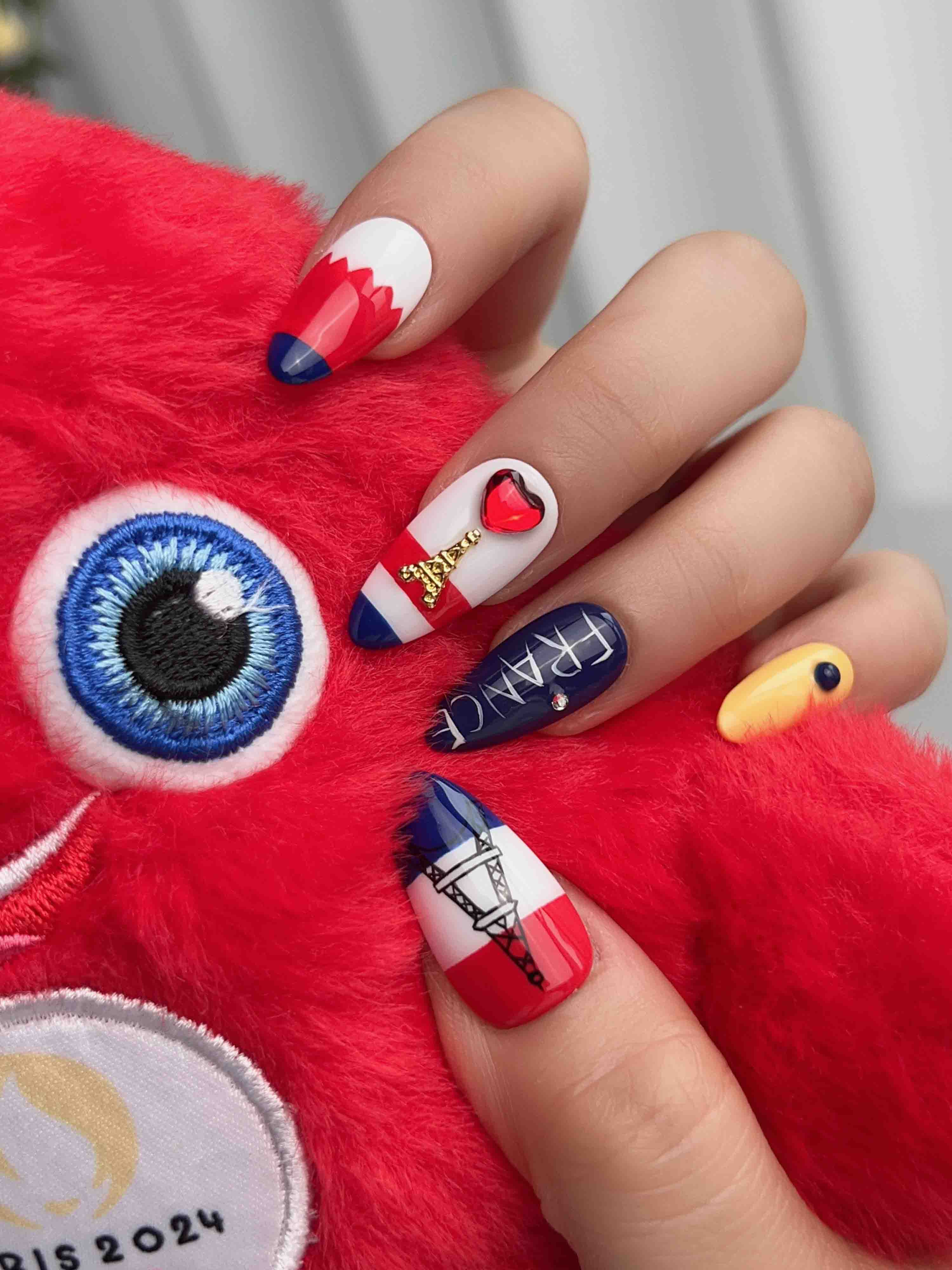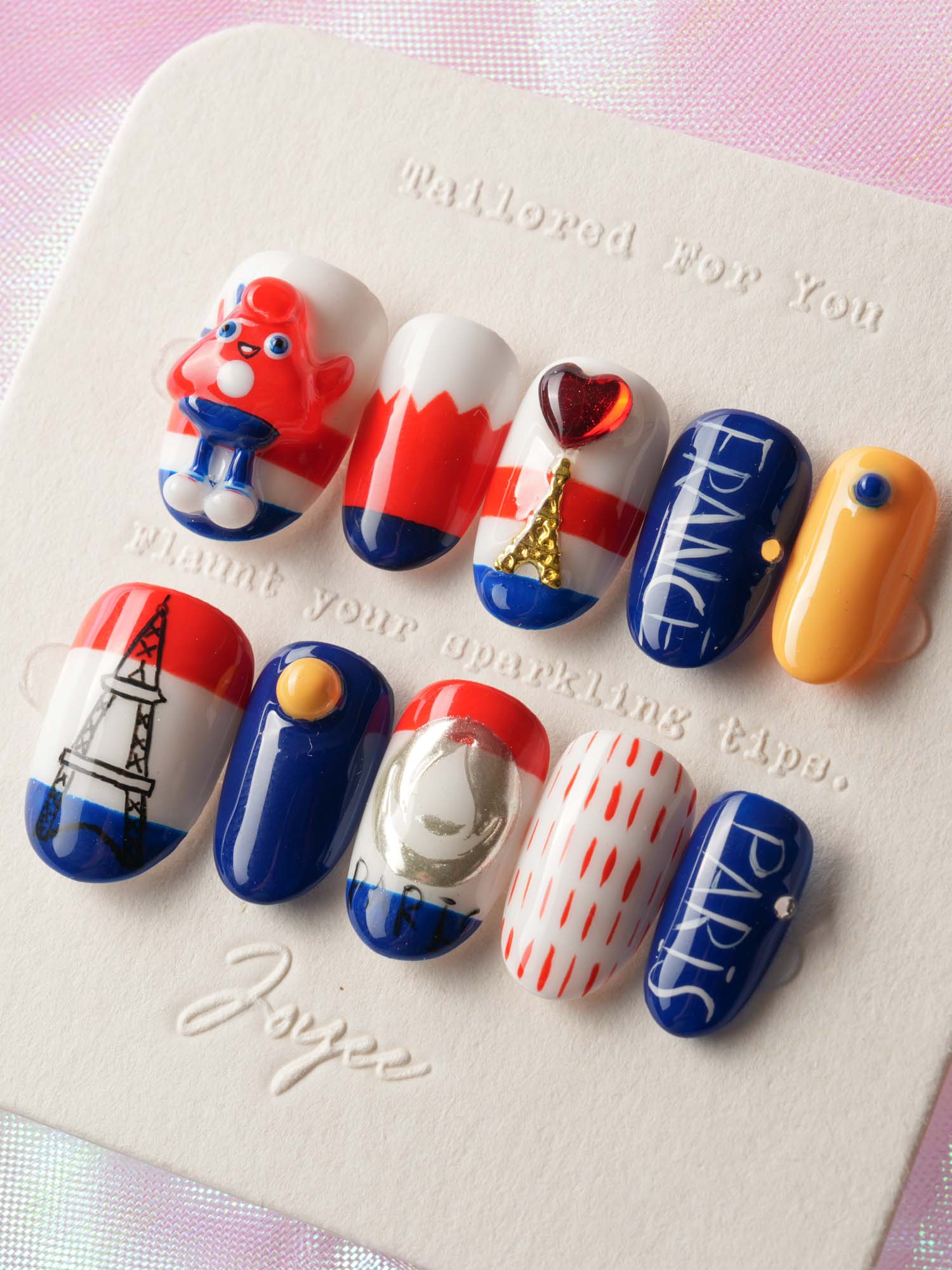 Meet "I’m Phryge" – where the fun of the Olympics meets French flair! Celebrate the joy of Paris 2024 with our design inspired by the lively Olympic mascot. Decked out in the French tricolor, these nails are your way to show Olympic spirit with style. Ready to cheer in red, white and blue?