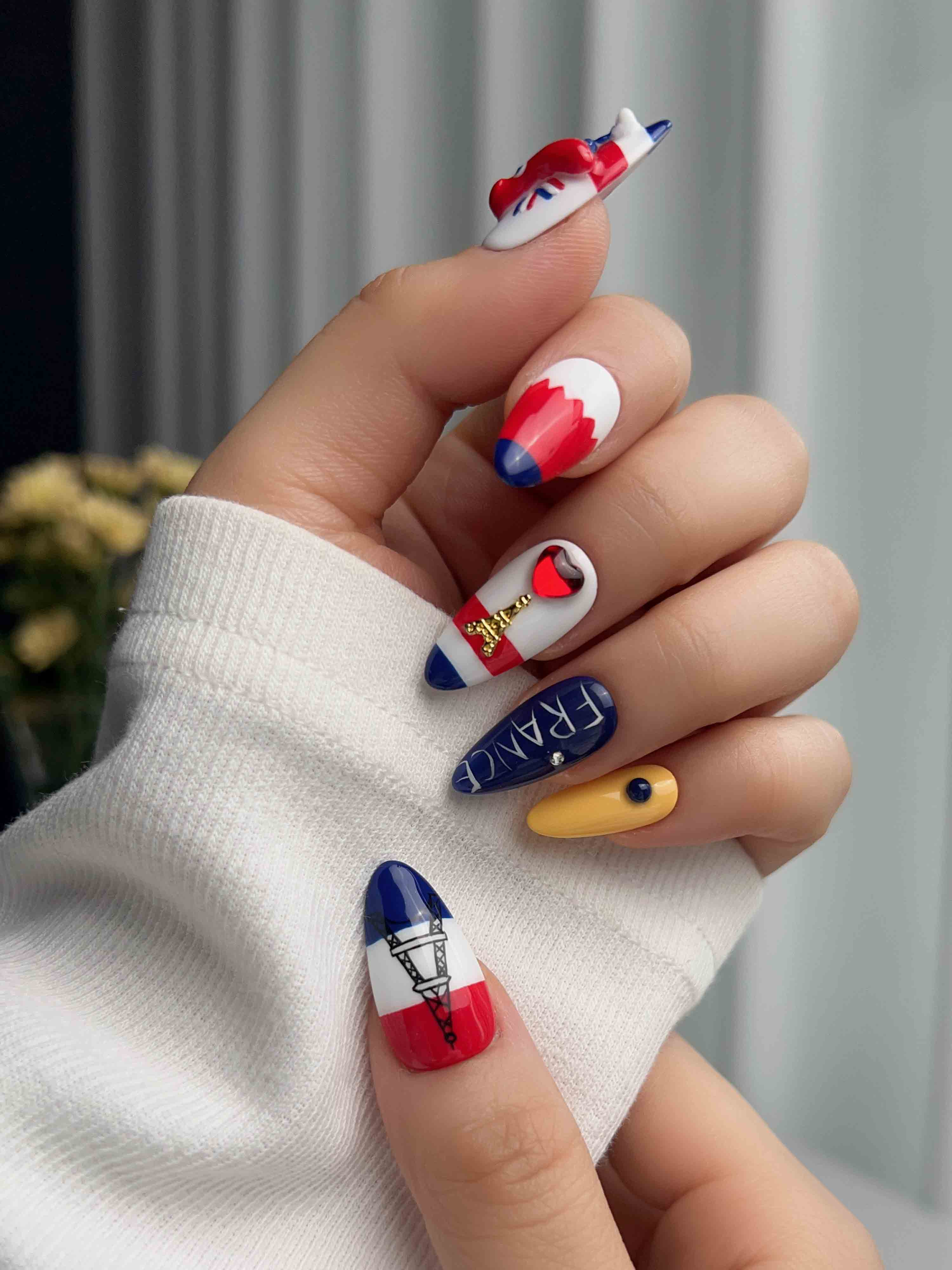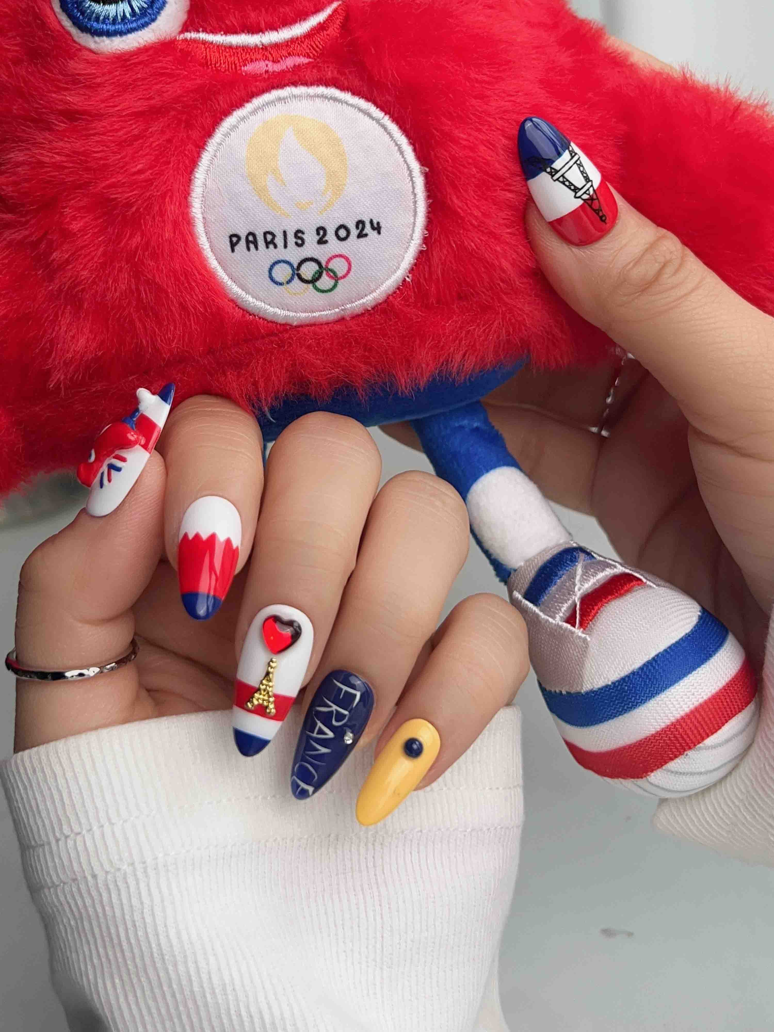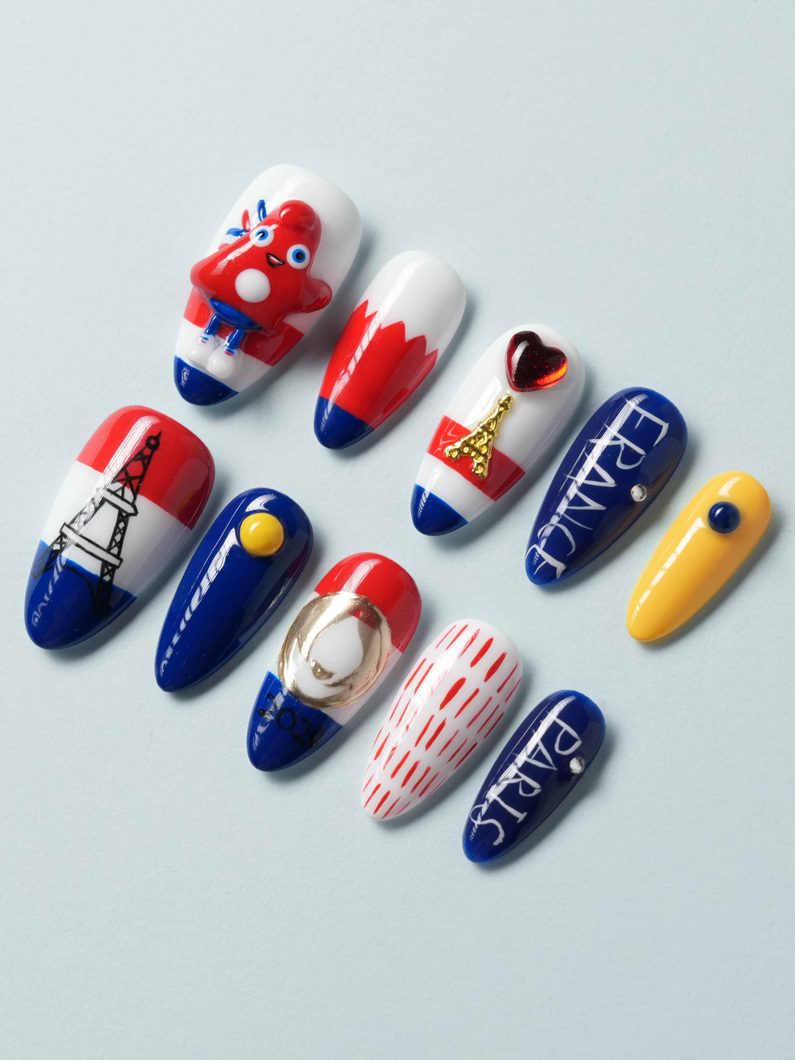 Meet "I’m Phryge" – where the fun of the Olympics meets French flair! Celebrate the joy of Paris 2024 with our design inspired by the lively Olympic mascot. Decked out in the French tricolor, these nails are your way to show Olympic spirit with style. Ready to cheer in red, white and blue?