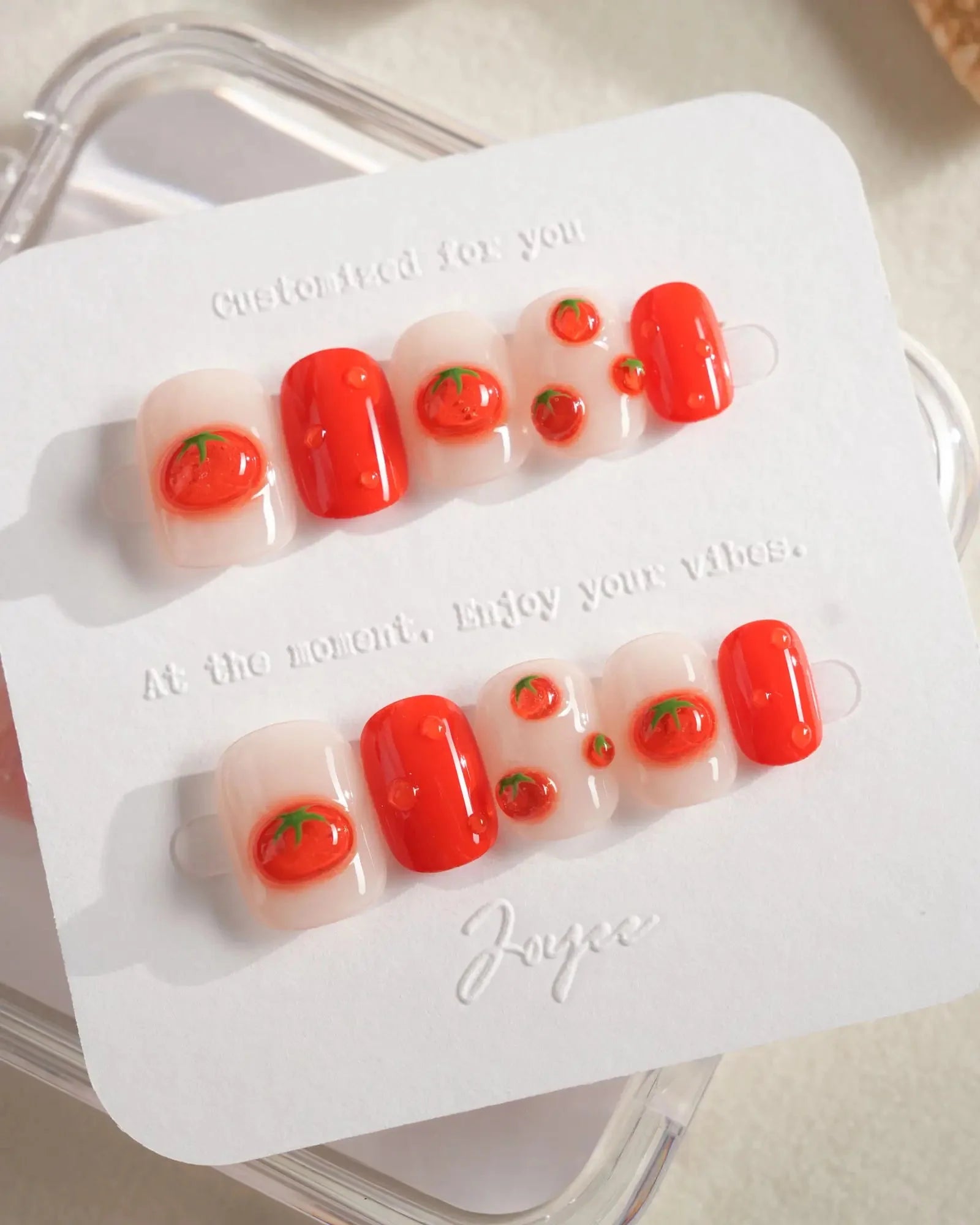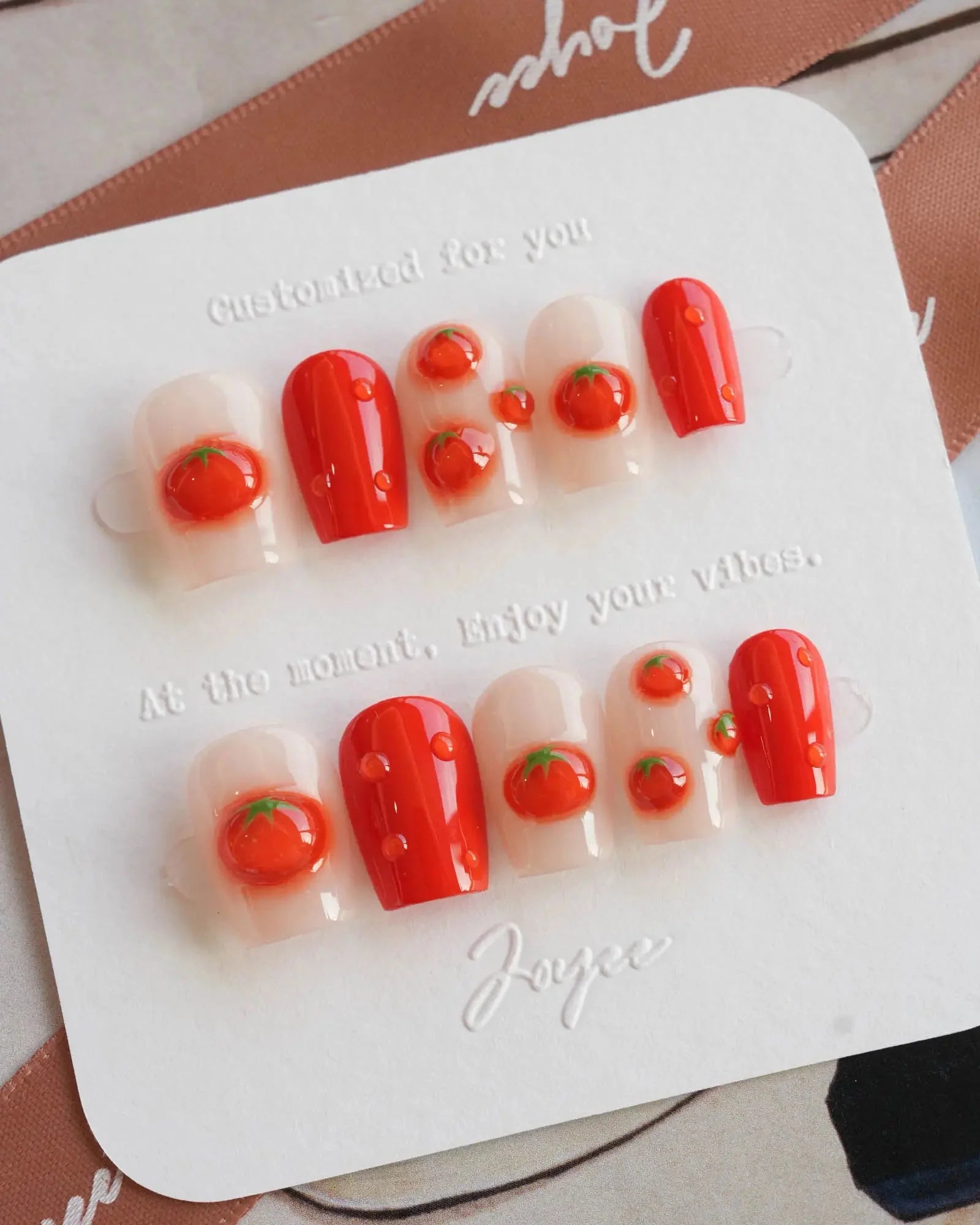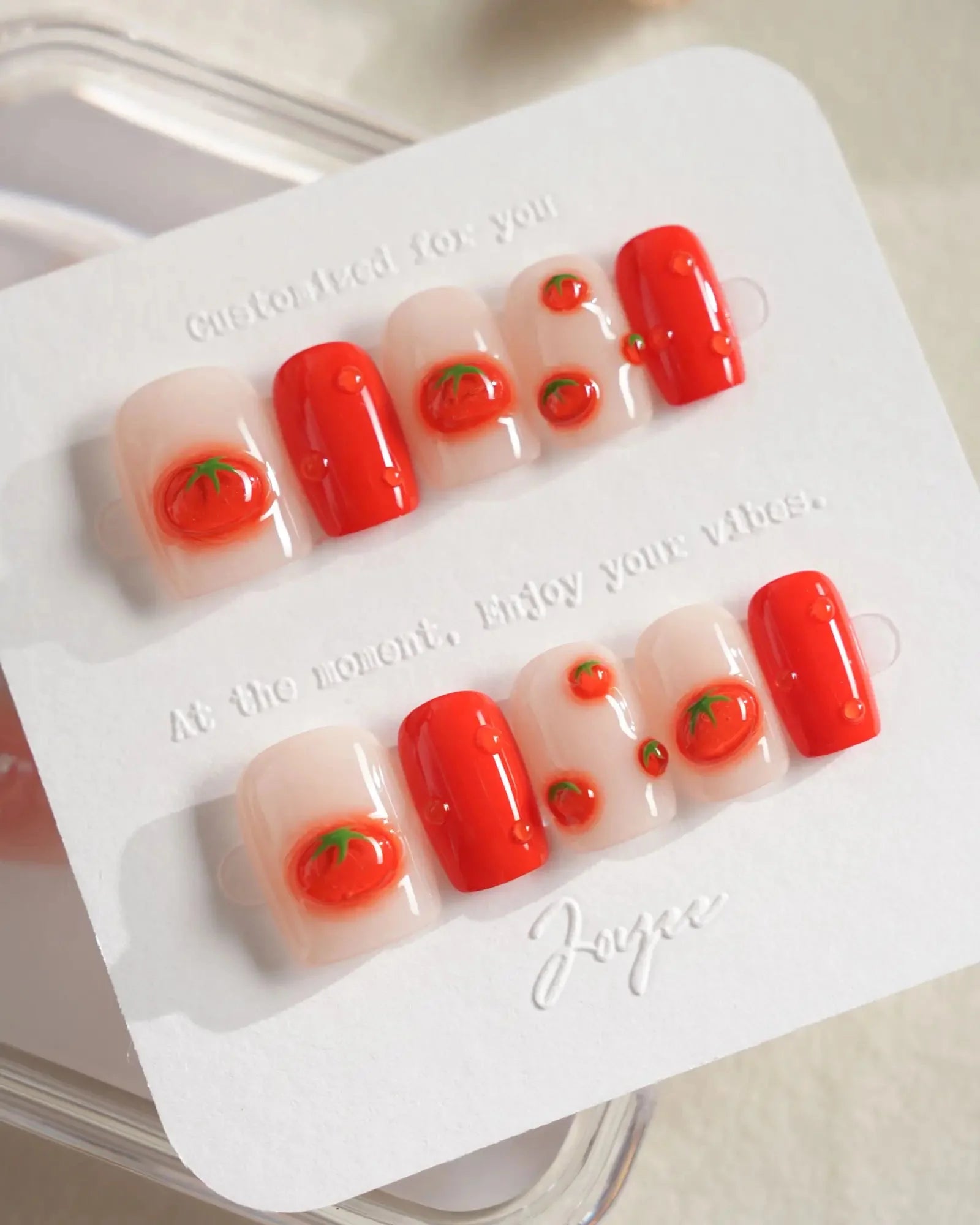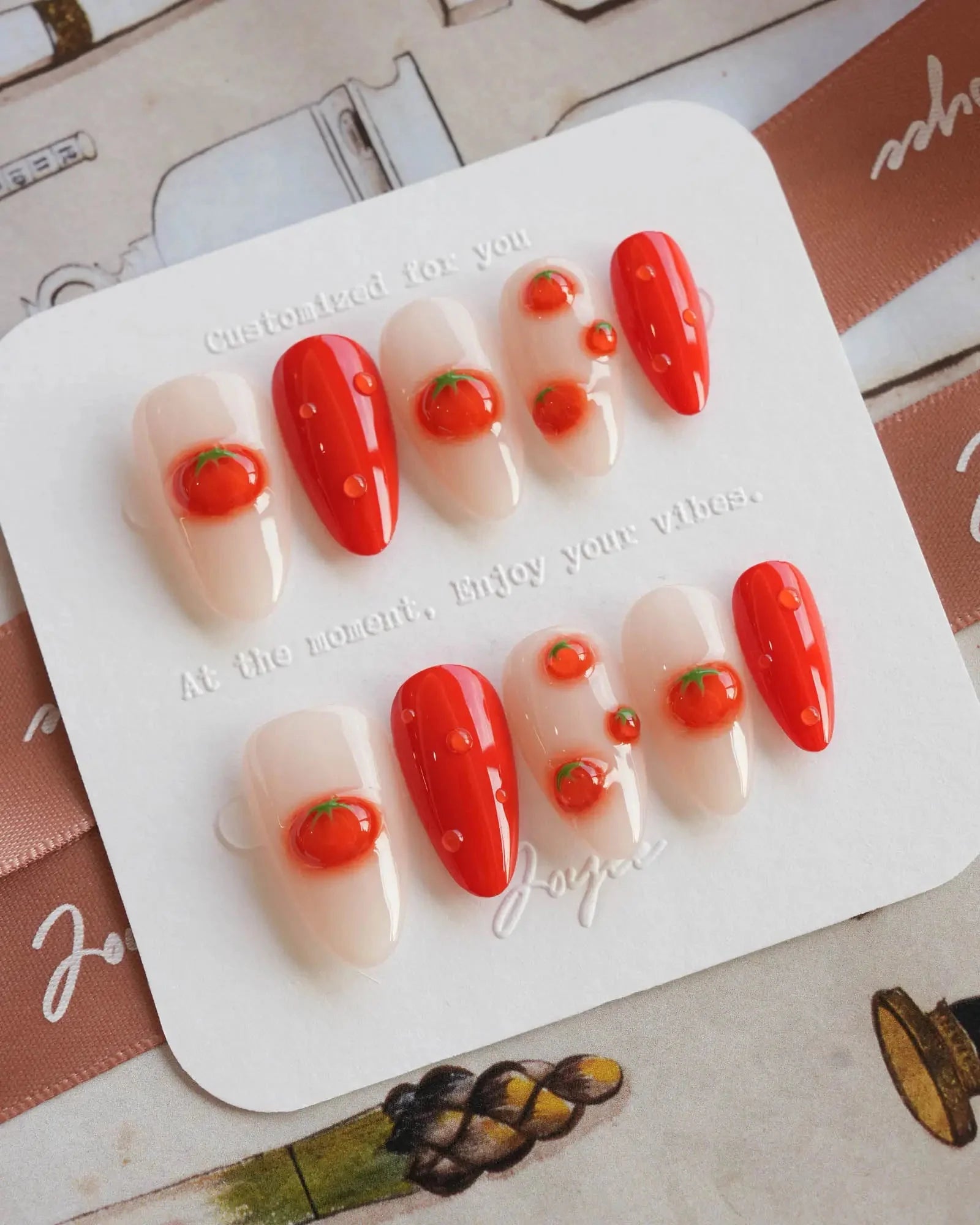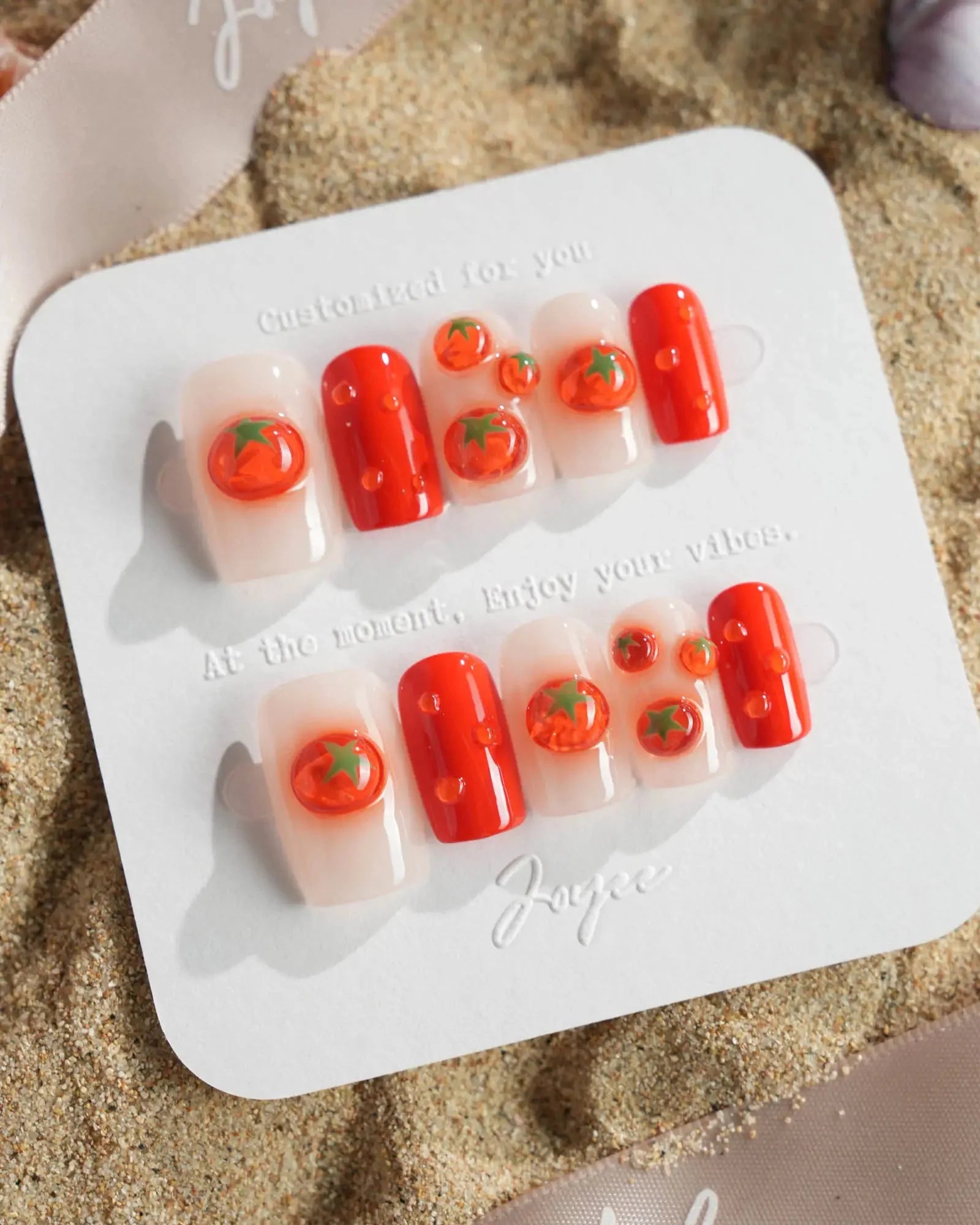 This jelly-finished tomato-inspired design is both simple and surprisingly cute. With its crystal shine and hint of whimsy, it's perfect for slow brunches, fresh white linens, and barefoot weekend lounging.