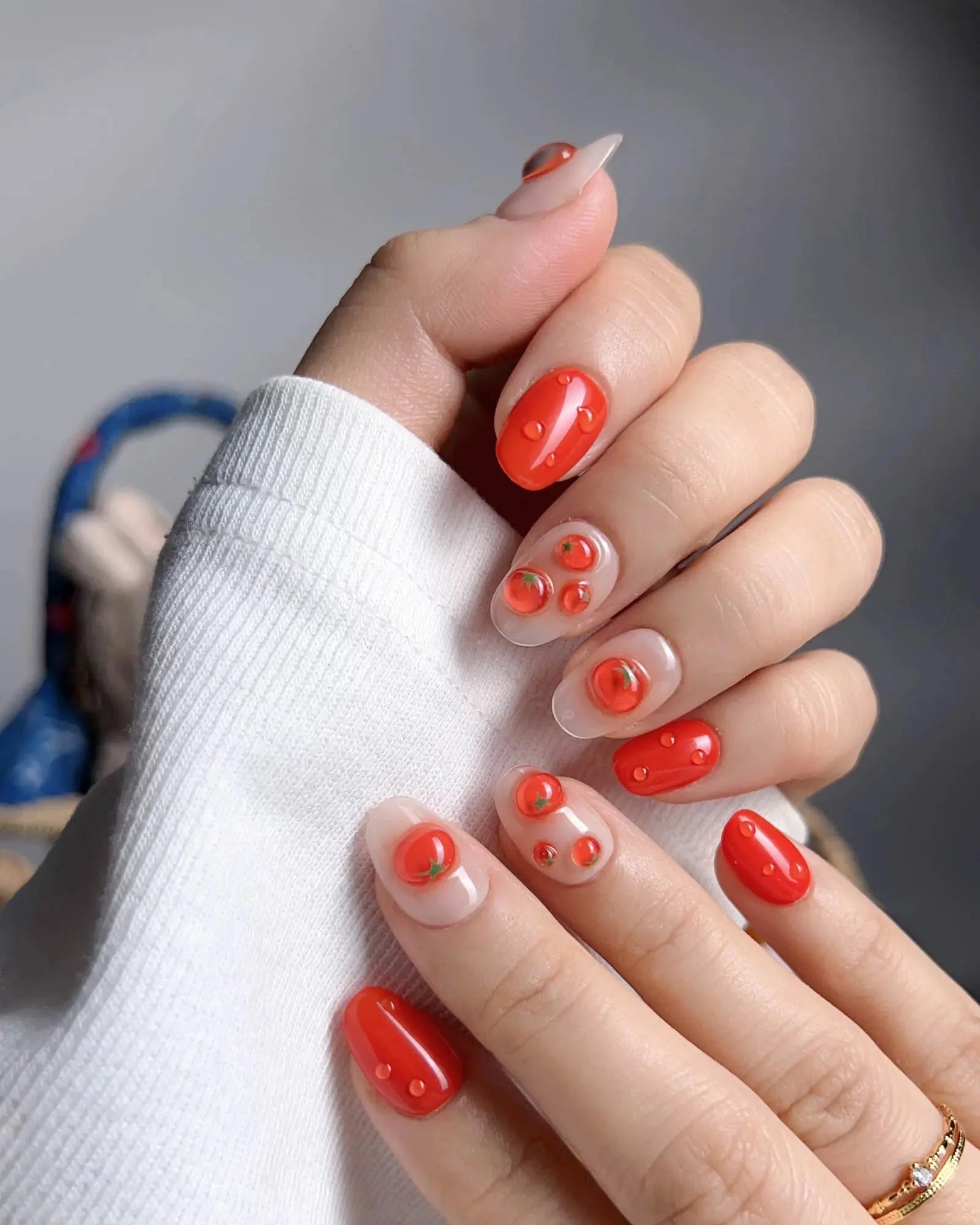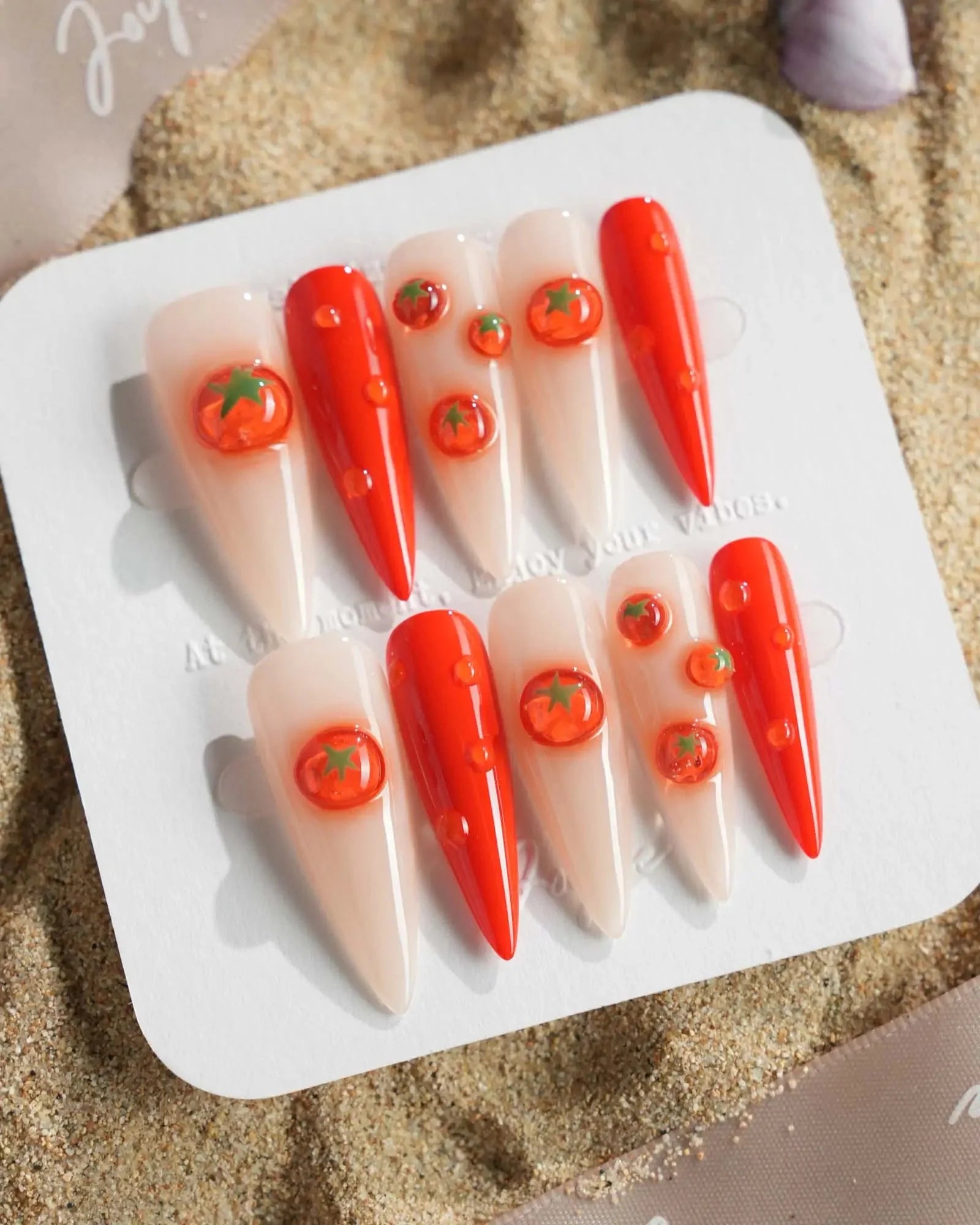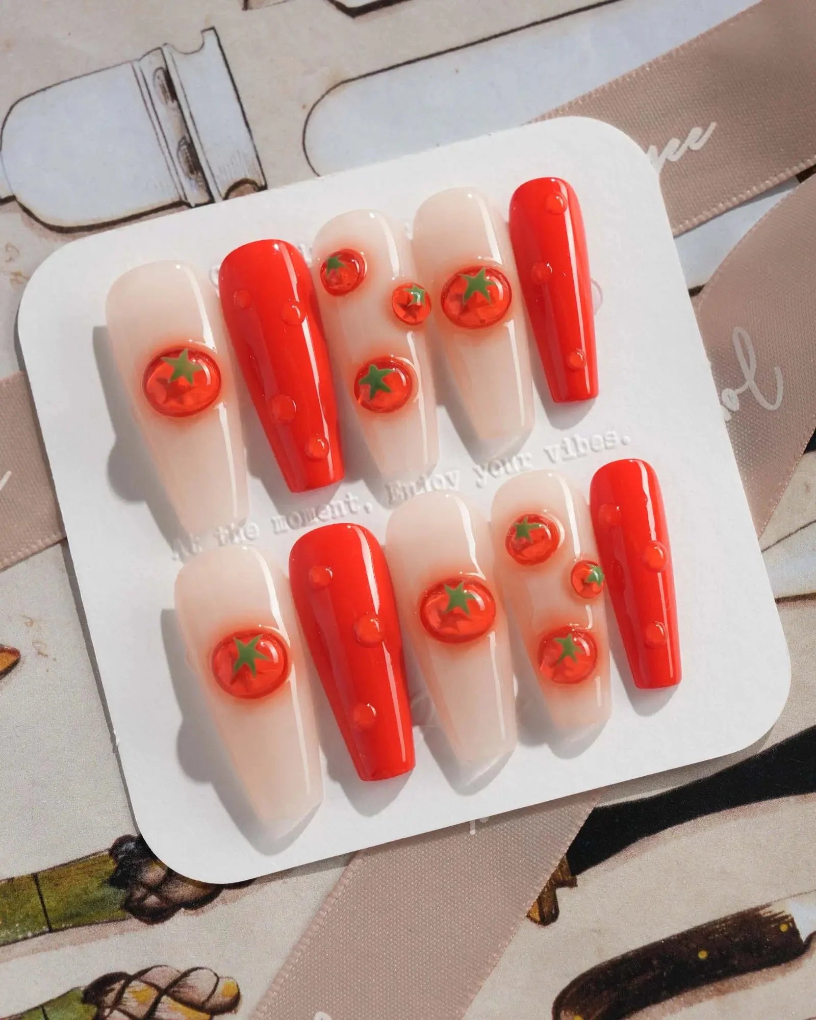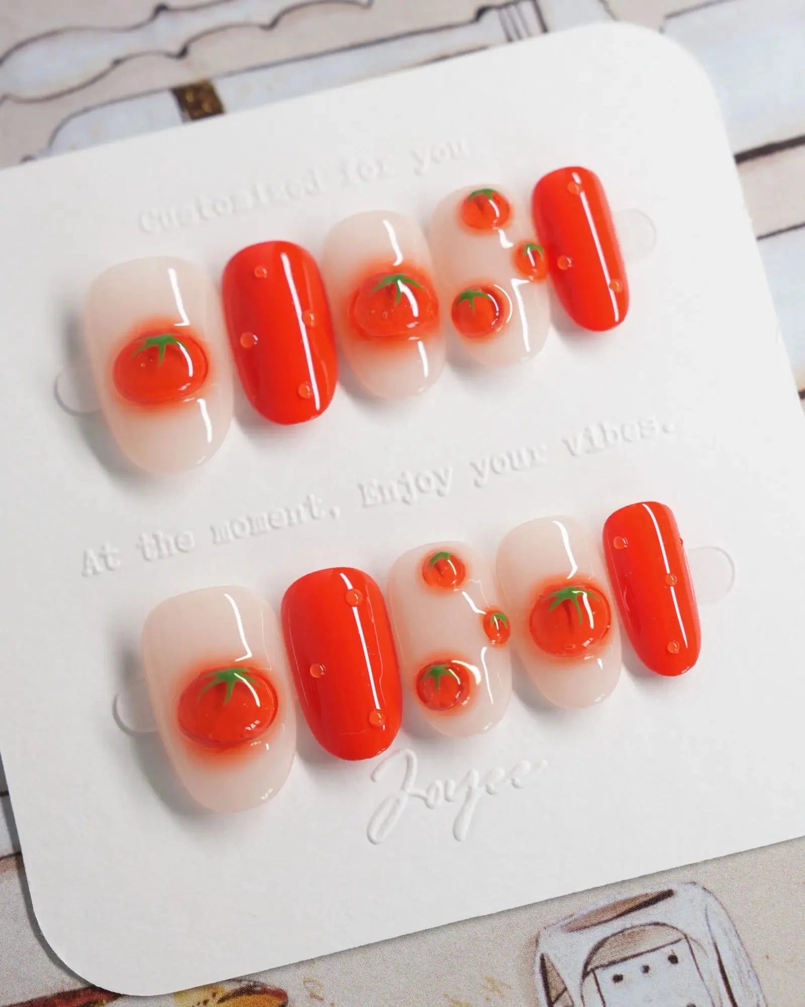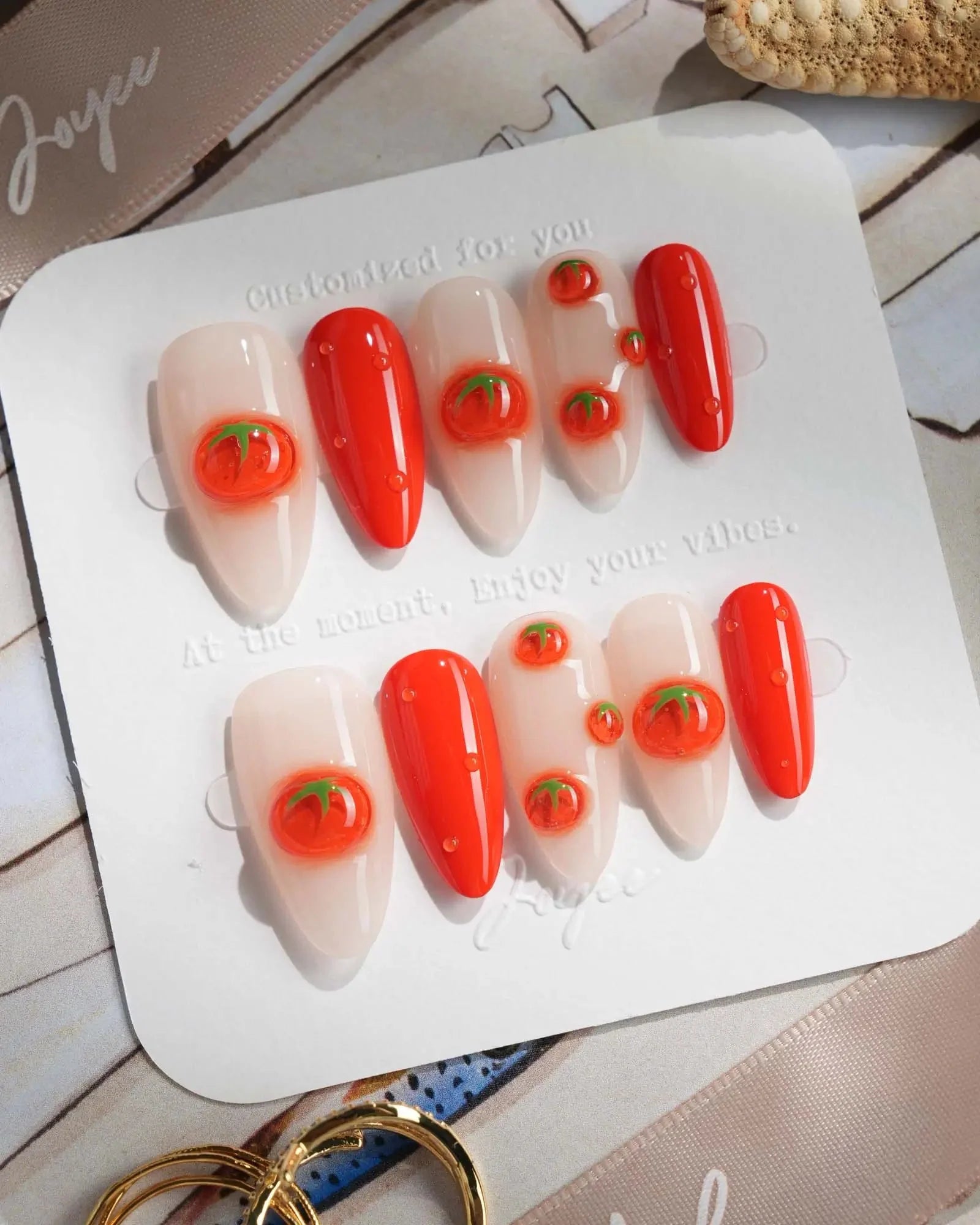 This jelly-finished tomato-inspired design is both simple and surprisingly cute. With its crystal shine and hint of whimsy, it's perfect for slow brunches, fresh white linens, and barefoot weekend lounging.