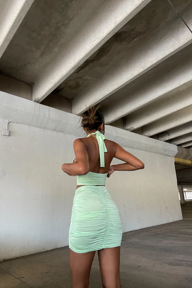 Make a statement in the Iggy Cinched Skirt Set! This funky matching set features a plunging halter neckline and a slinky cinched mini skirt with an adjustable tie detail. Available in lime green. Pair with the Lexi Lace Up Heel in White for a fun girls night out look!