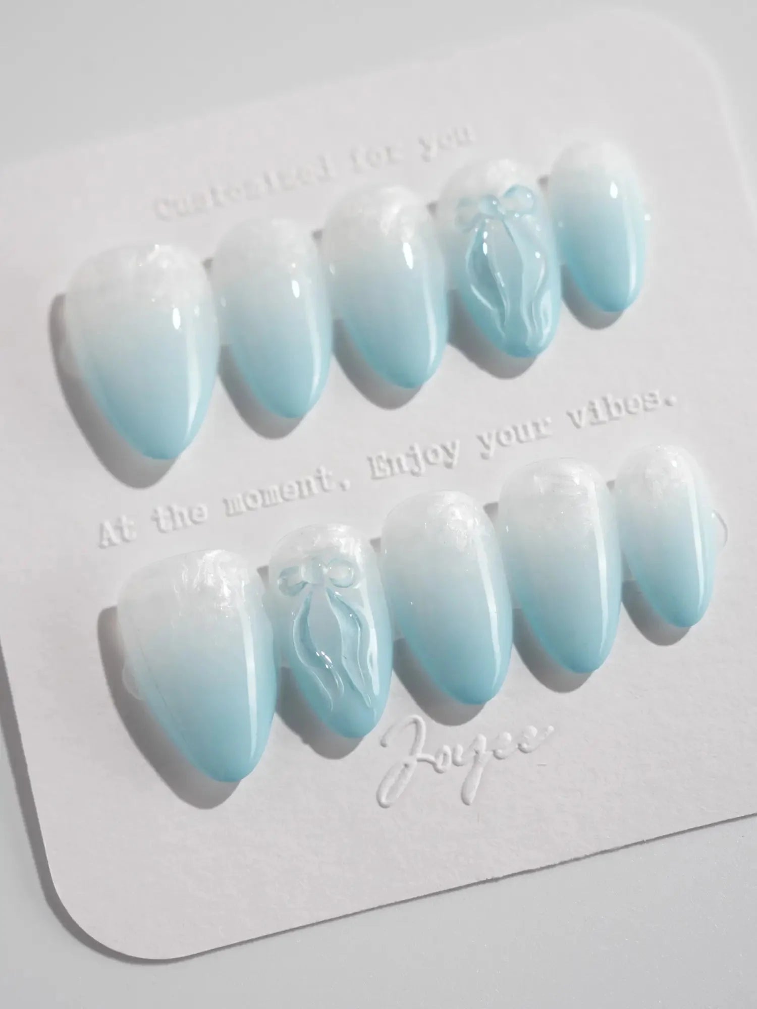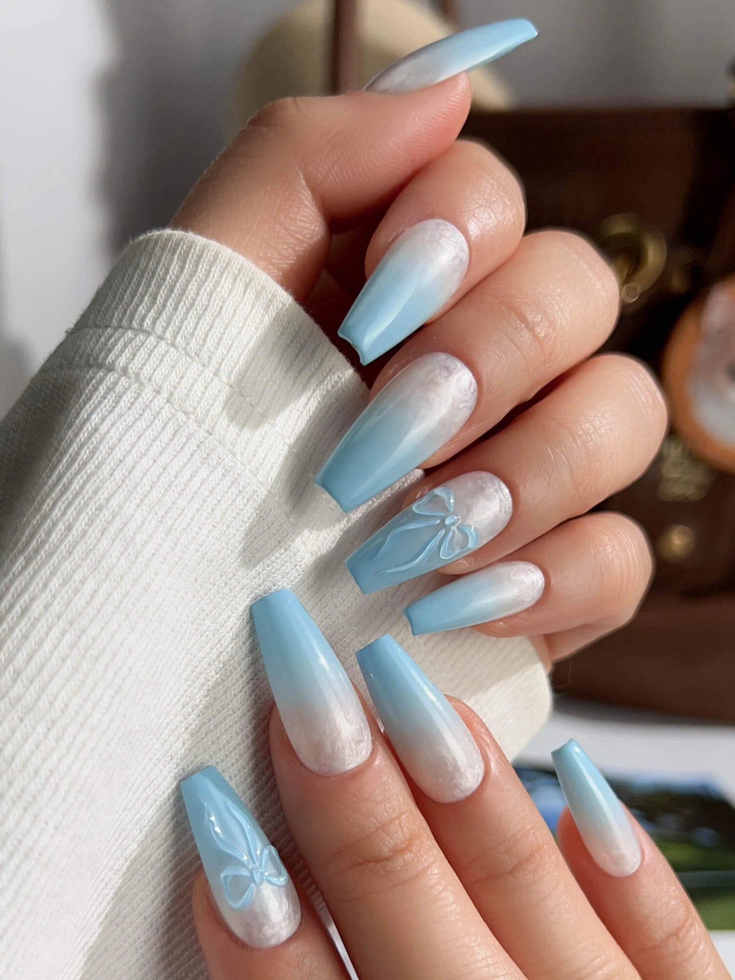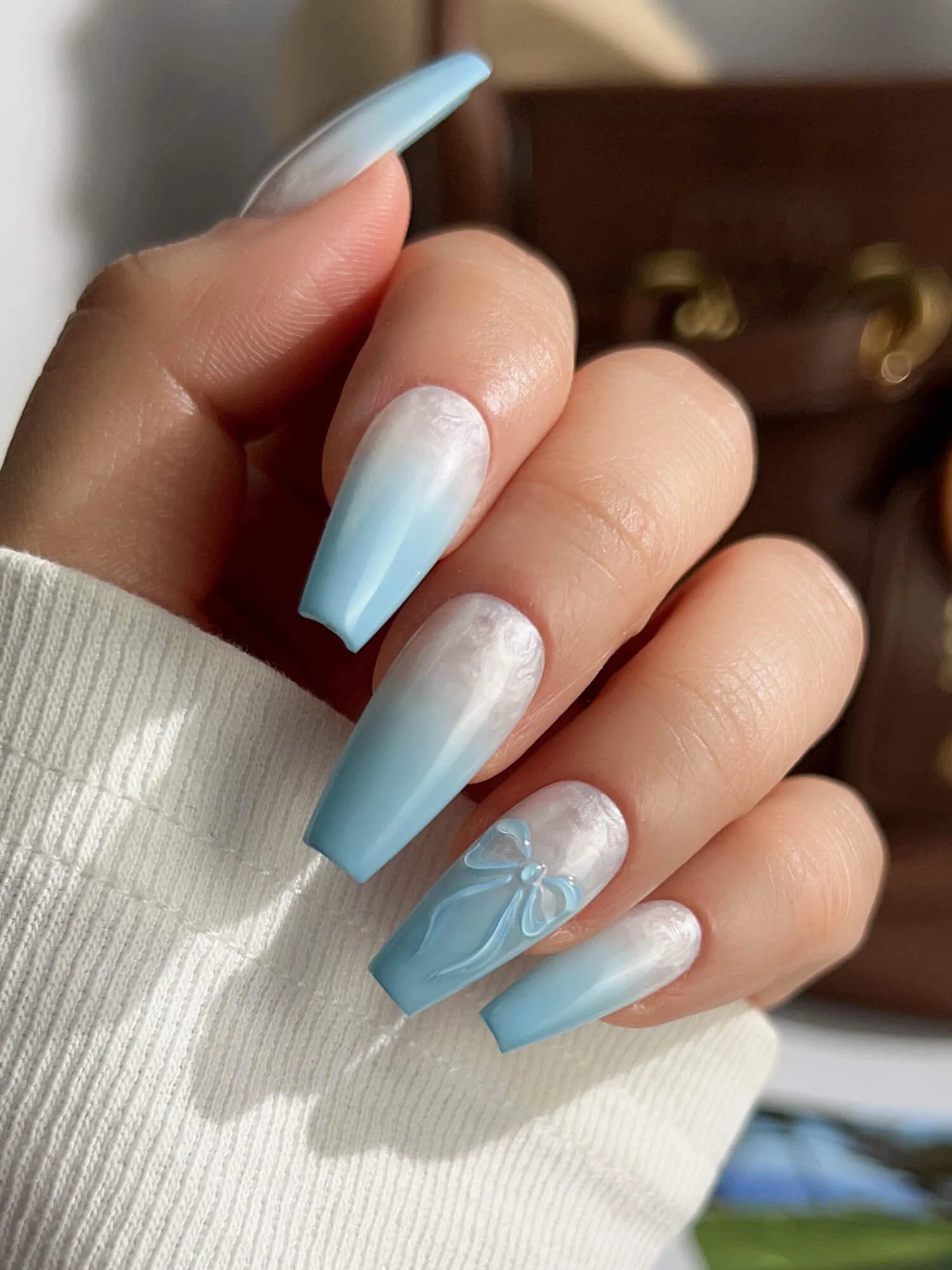 Float into softness with these dreamy baby blue nails. The airy pastel blue base pairs with delicate designs—bows, shimmers, or subtle 3D accents—giving each fingertip a light and ethereal charm. Sweet, soft, and full of glow.