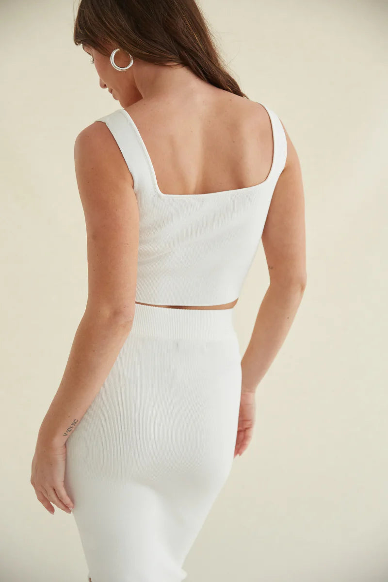 Get ready for warm summer days in the Jacqueline Cropped Knit Tank Top! This ribbed top is complete with a corset-style boning and a square neckline. Available in cream and blue. Pair with the Jacqueline Maxi Skirt to complete the set!