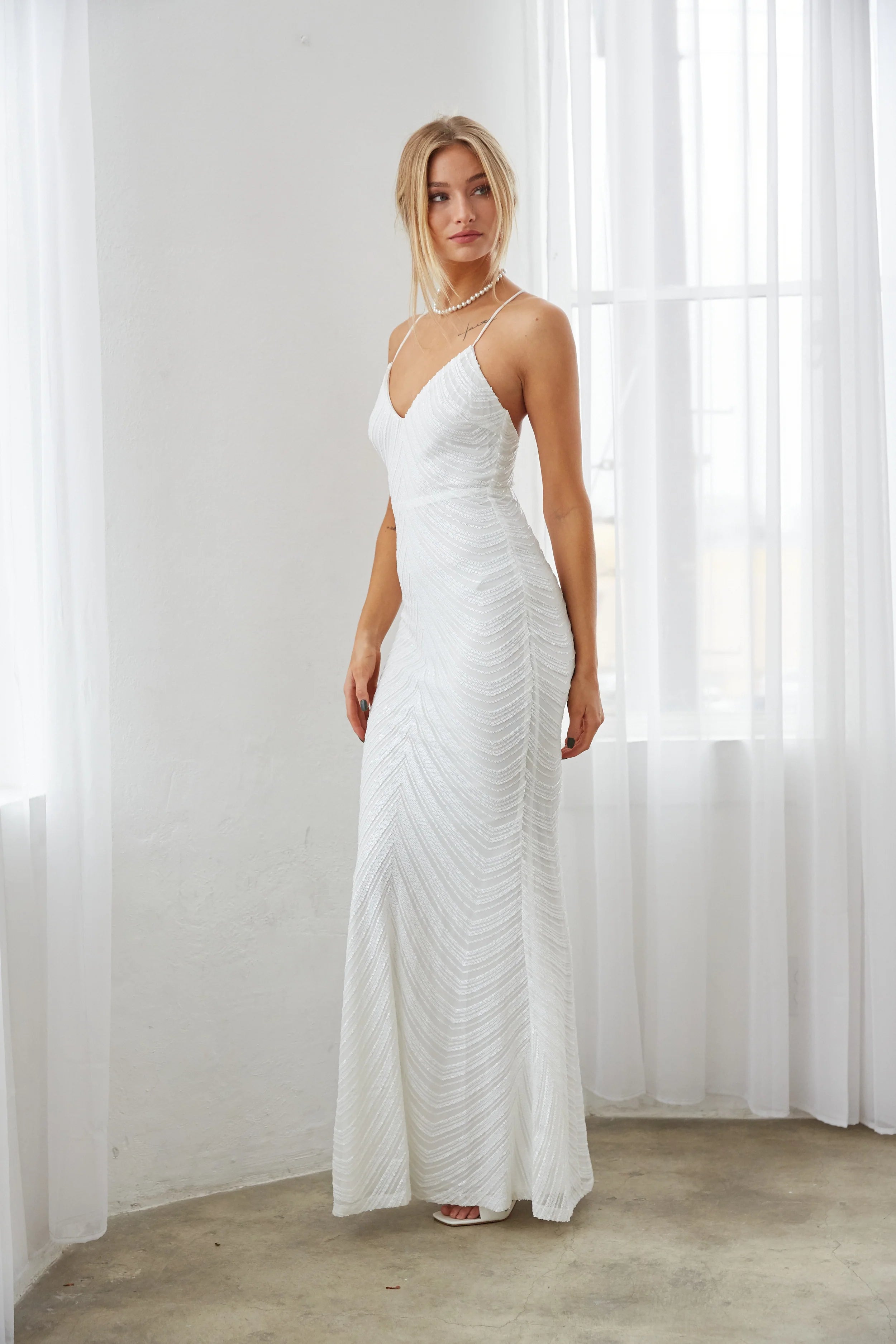 Shine bright in the Jasper Sequin Open Back Maxi Dress! This white stunner features flattering contoured beading, a fitted silhouette with a flare at the bottom, V-neckline, and an open back with criss cross spaghetti straps. Pair this dress with some classic heels and you're ready for any formal event!