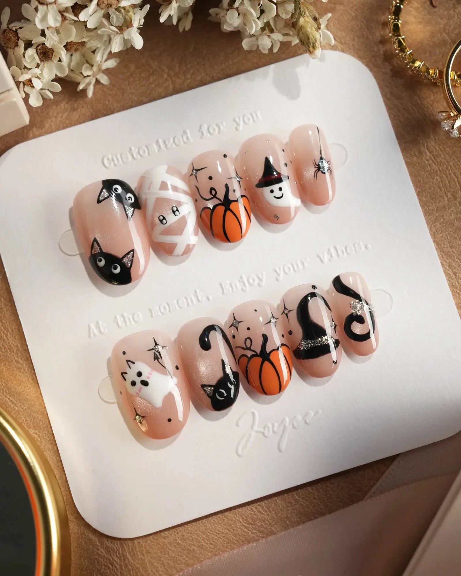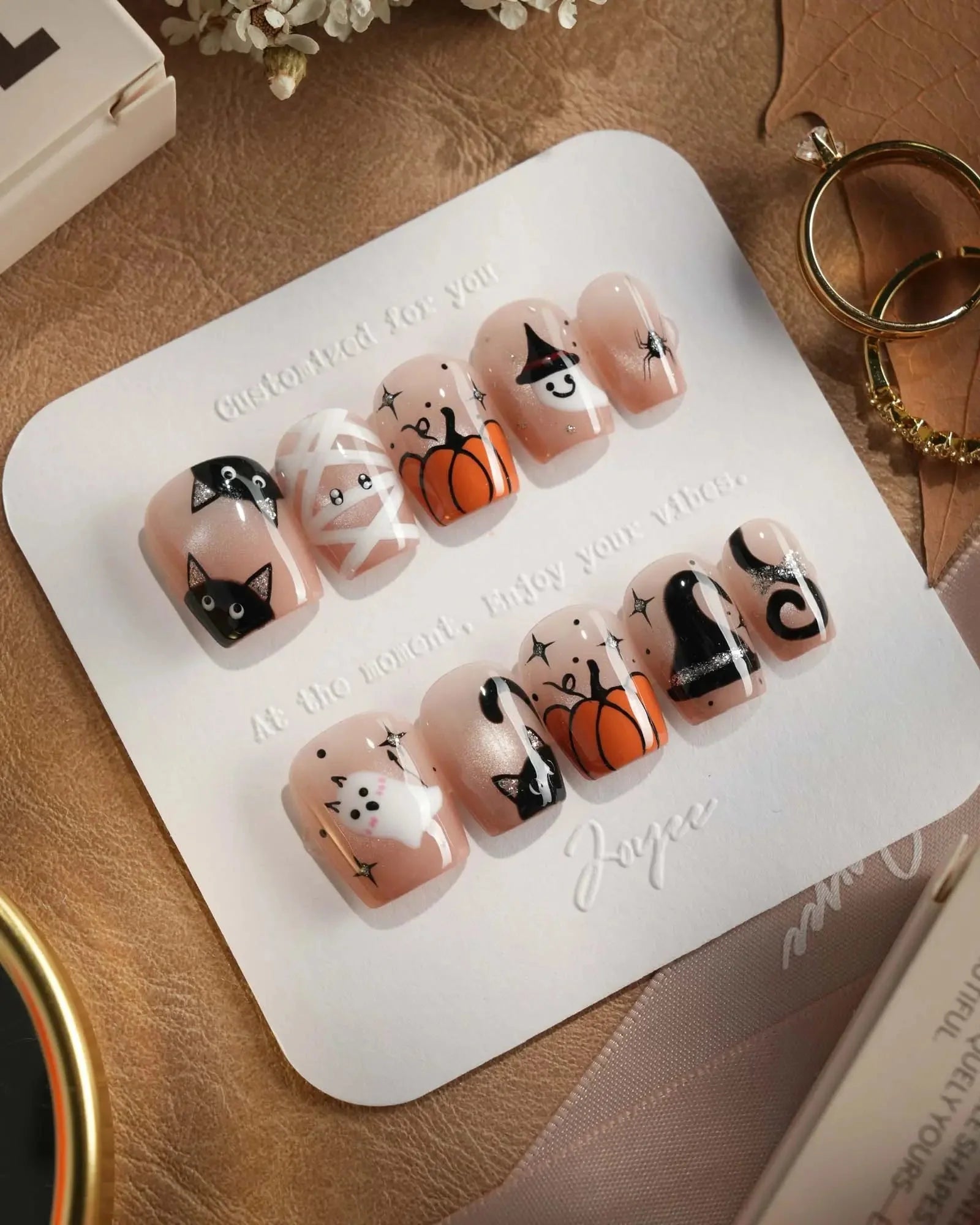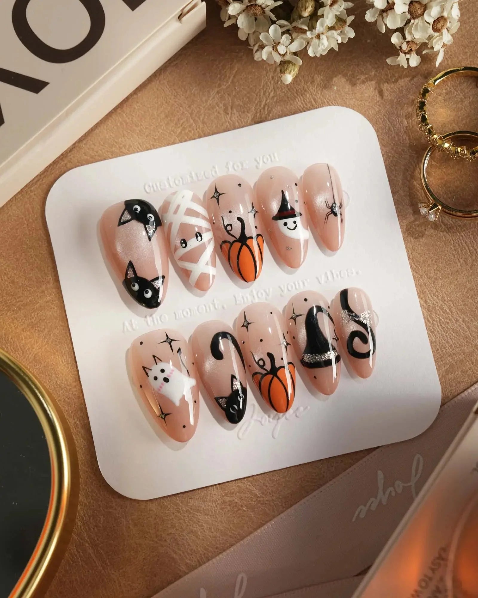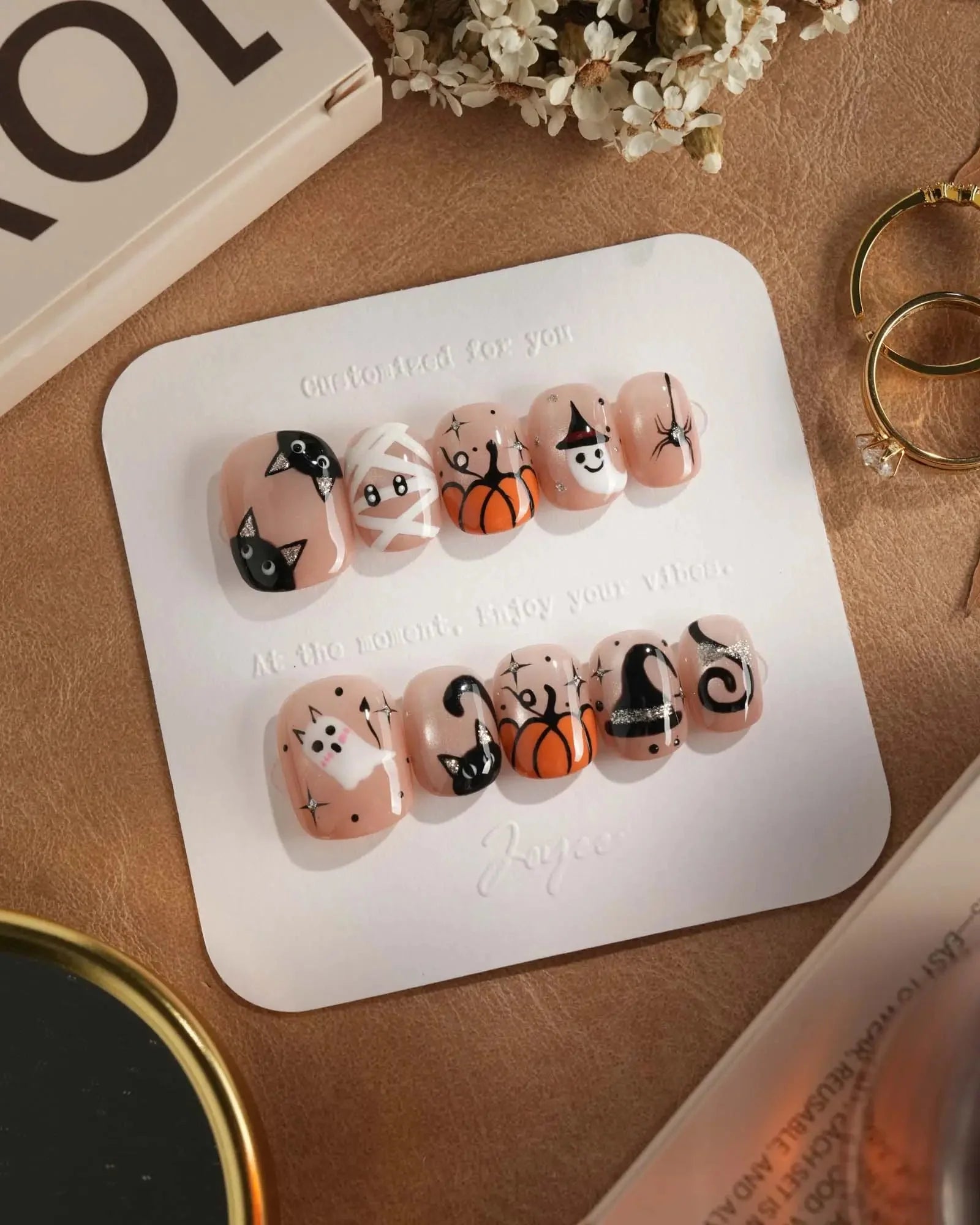 Layers of detail, crafted like a little secret: a shimmering cat-eye base glows like lanterns, a nude gradient softens into skin, and hand-painted black cats, pumpkins, and ghosts plot a playful mischief.