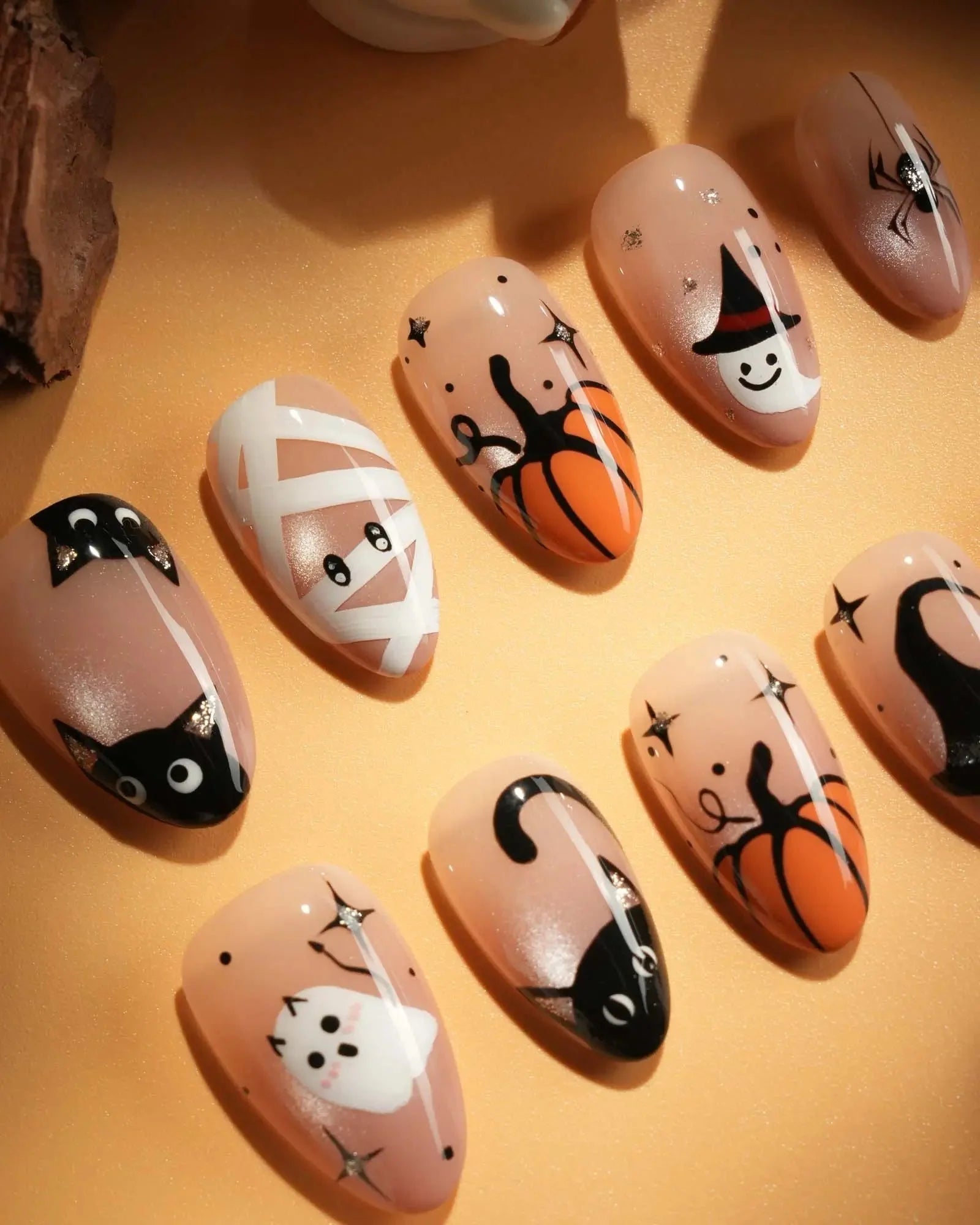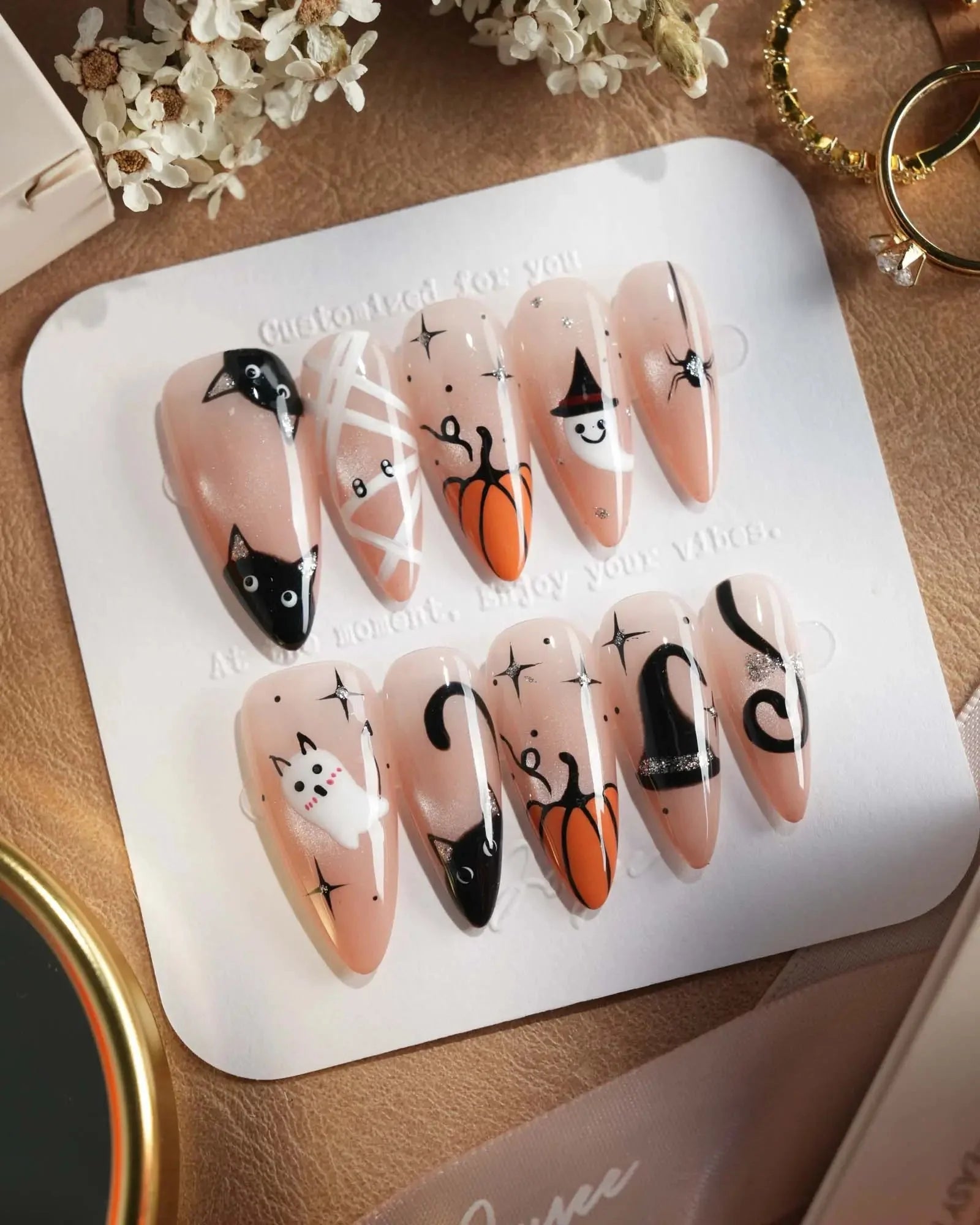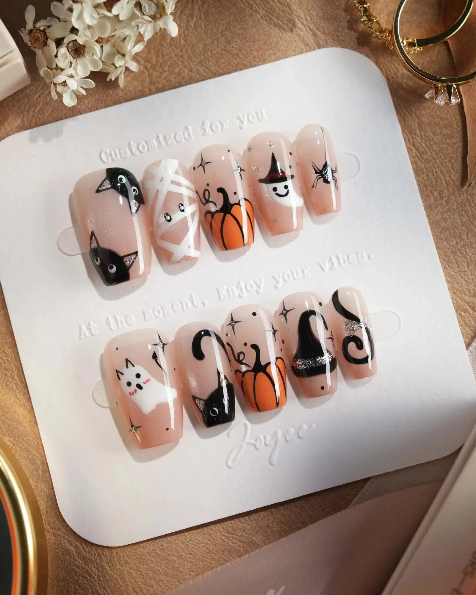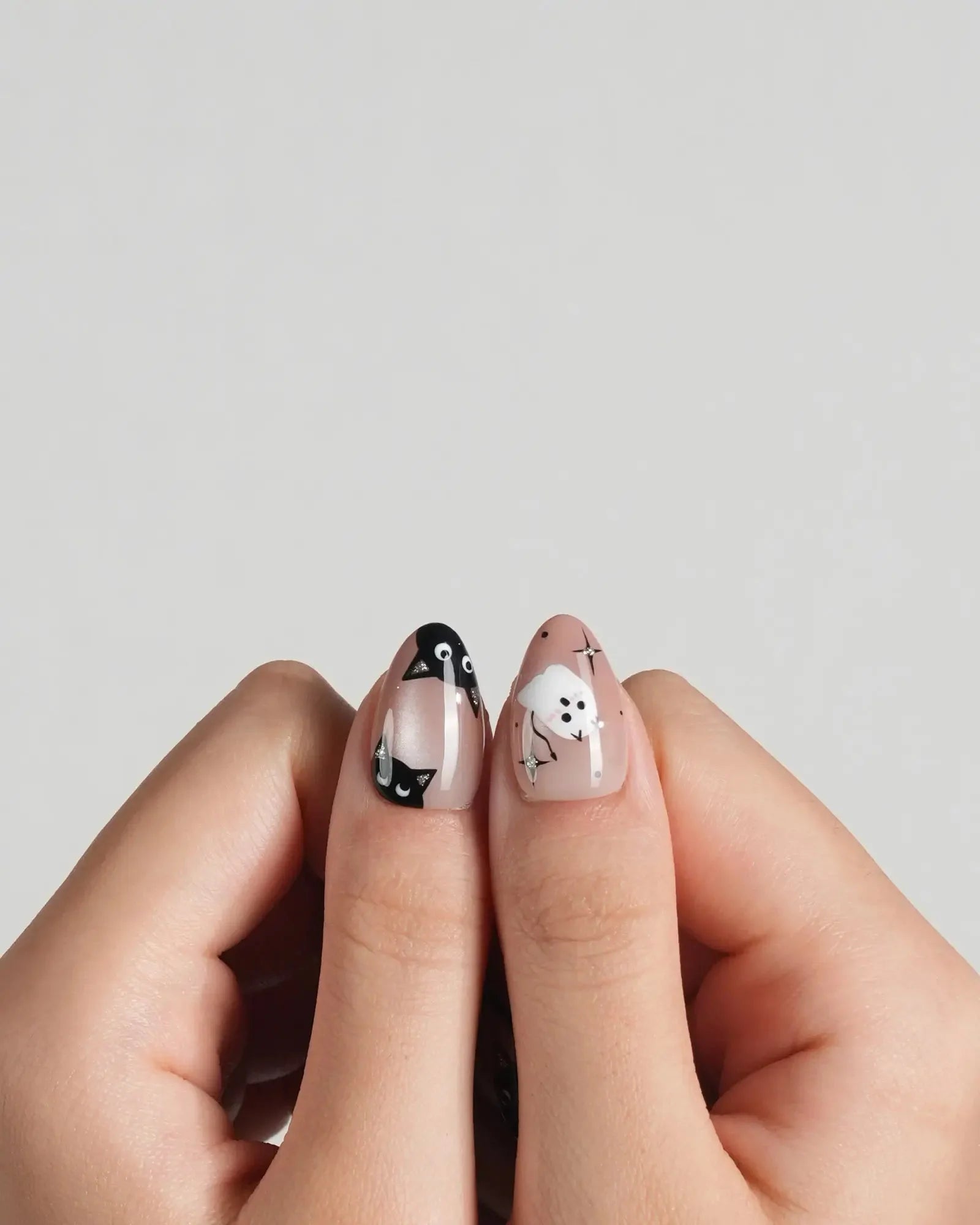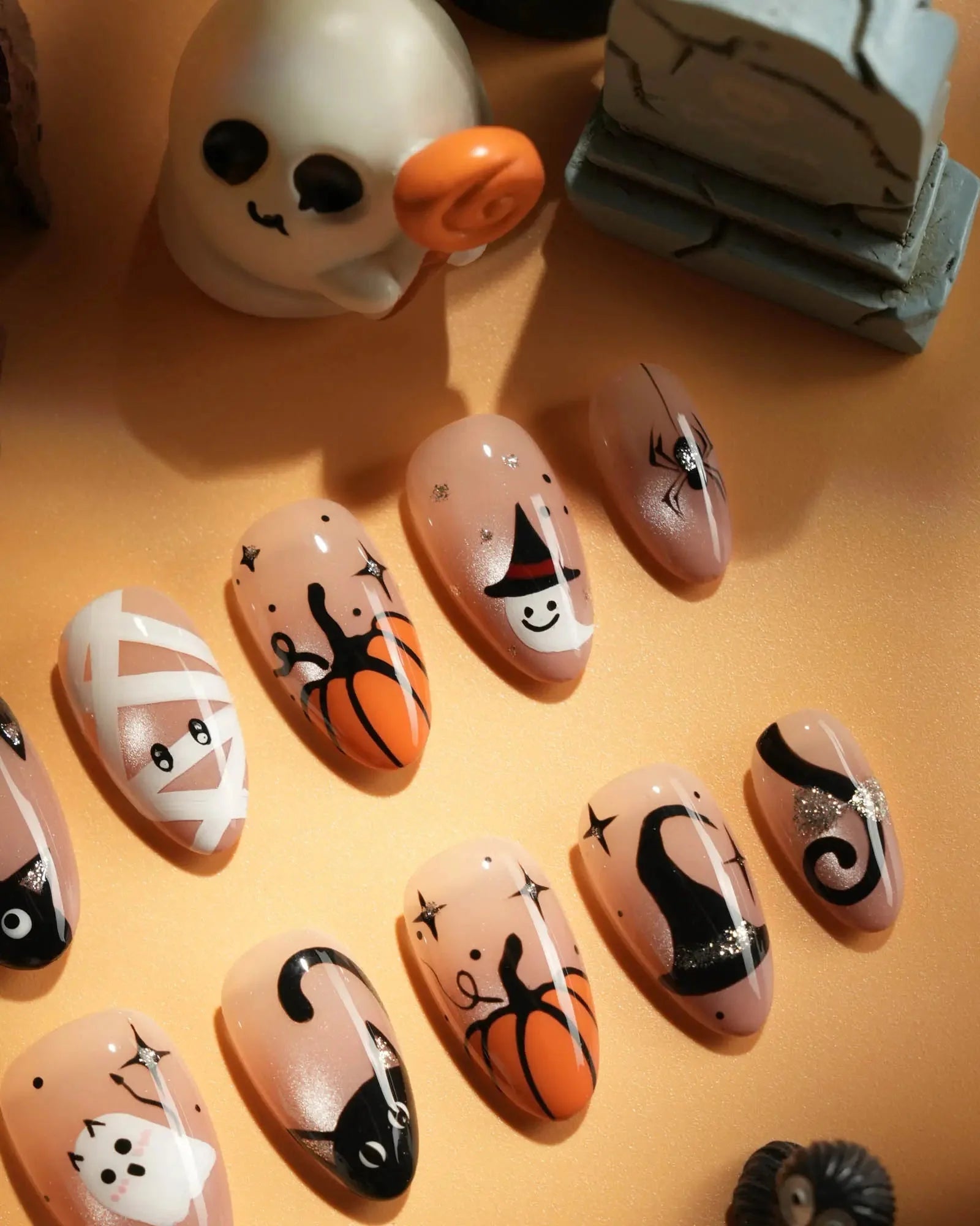 Layers of detail, crafted like a little secret: a shimmering cat-eye base glows like lanterns, a nude gradient softens into skin, and hand-painted black cats, pumpkins, and ghosts plot a playful mischief.
