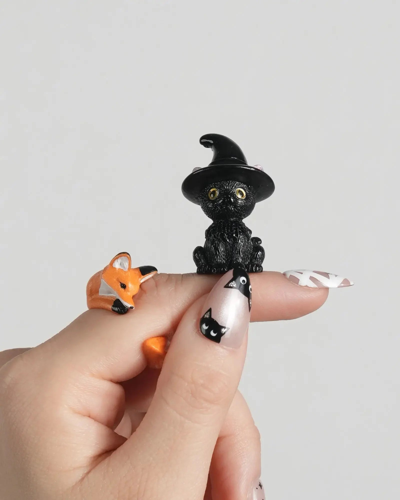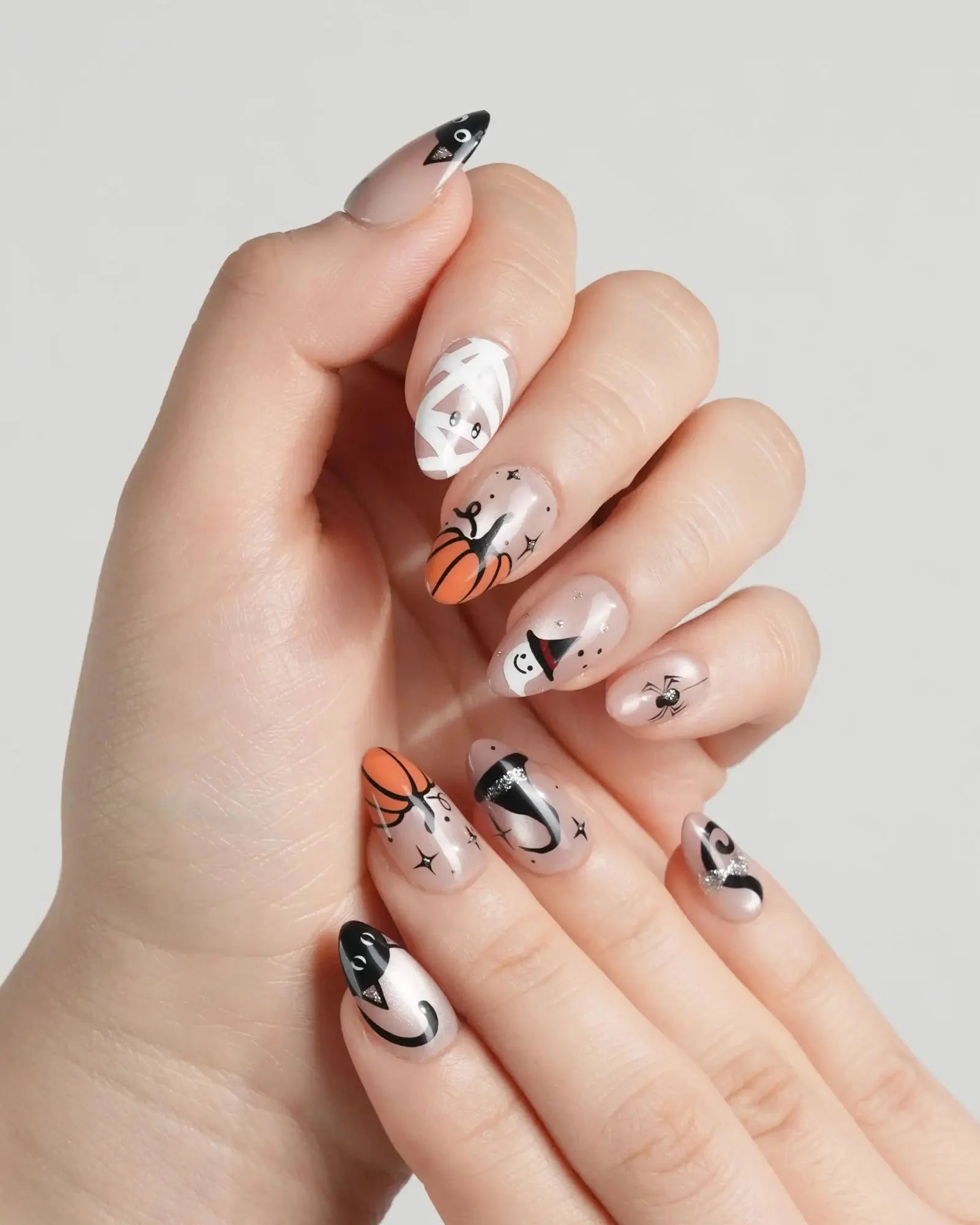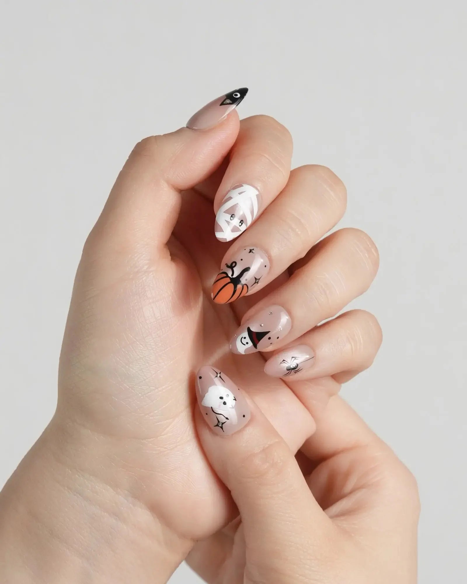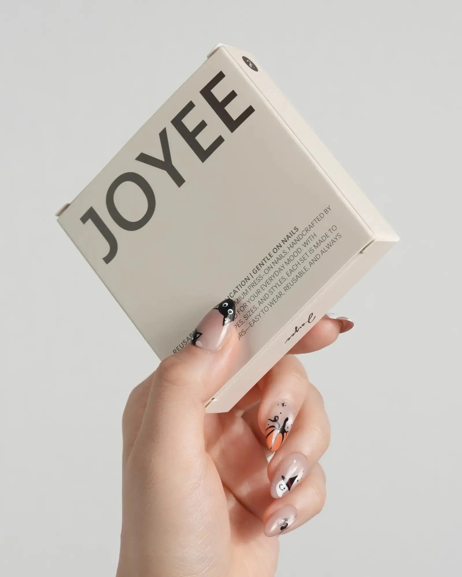 Layers of detail, crafted like a little secret: a shimmering cat-eye base glows like lanterns, a nude gradient softens into skin, and hand-painted black cats, pumpkins, and ghosts plot a playful mischief.