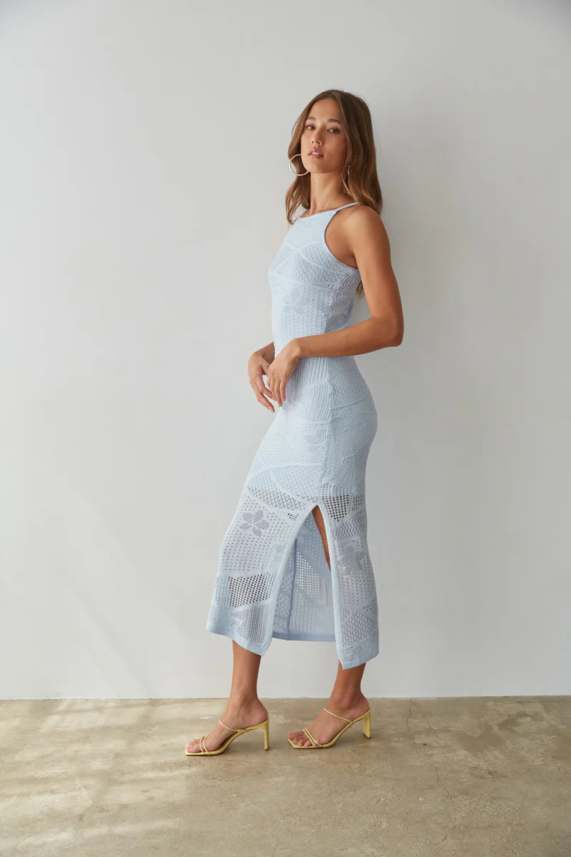 Get vacation ready in the Keilani High Neck Open Knit Midi Dress! This gorgeous dress features an open knit design, high neckline, and side slit. Available in blue and peach. Pair with a simple heel to complete this chic look!