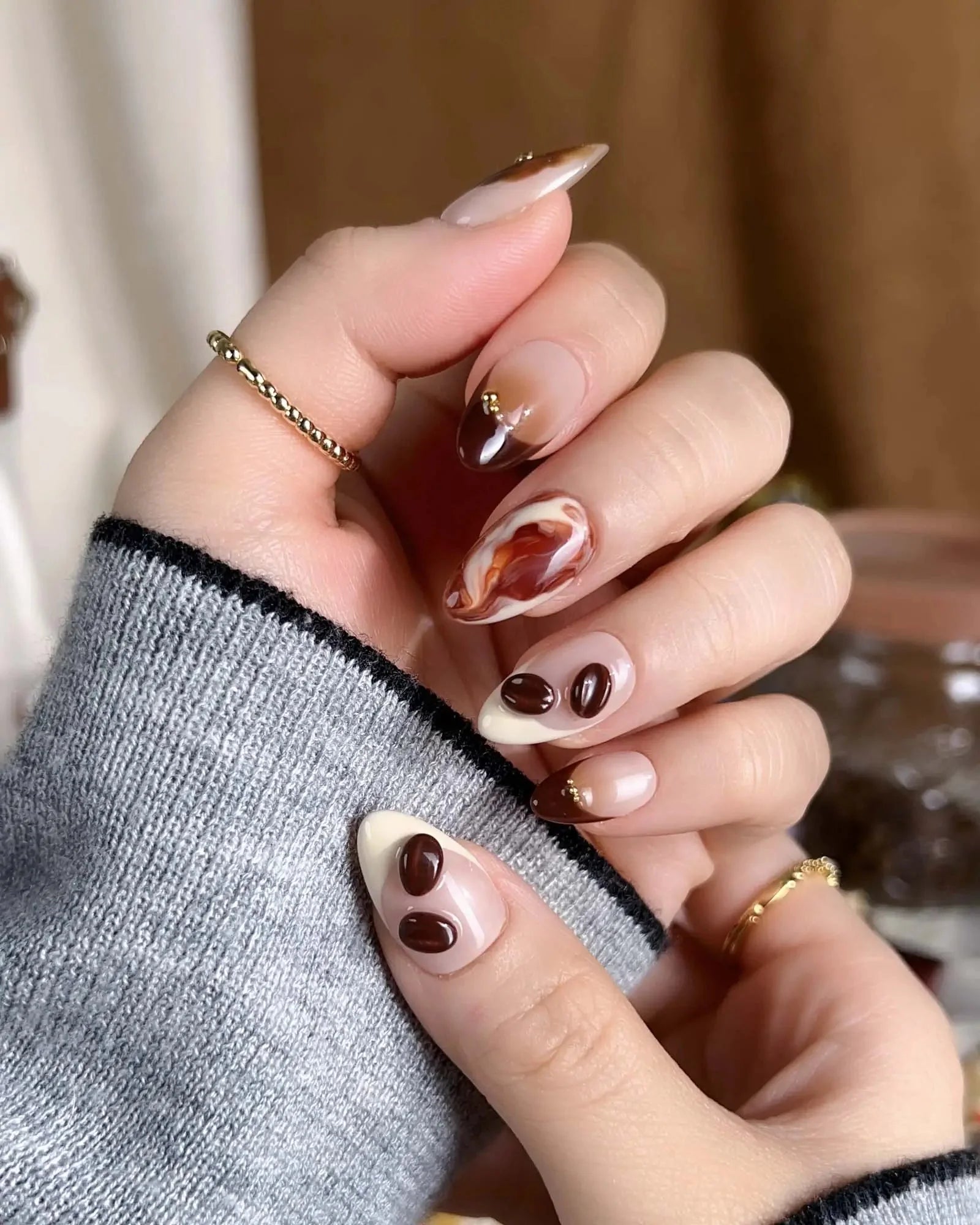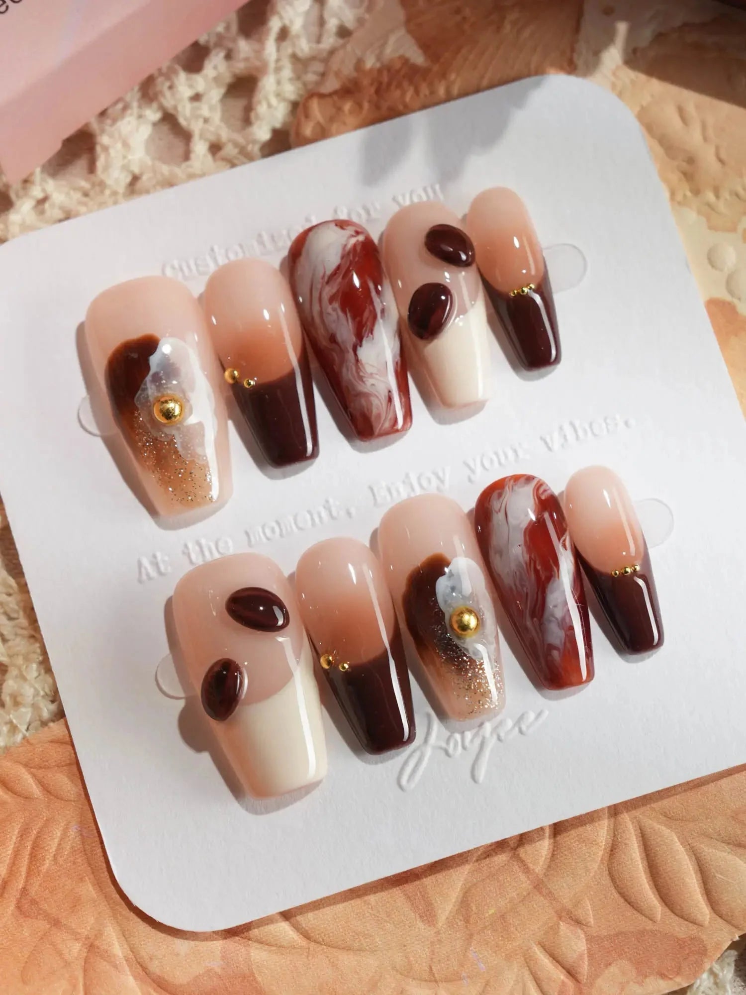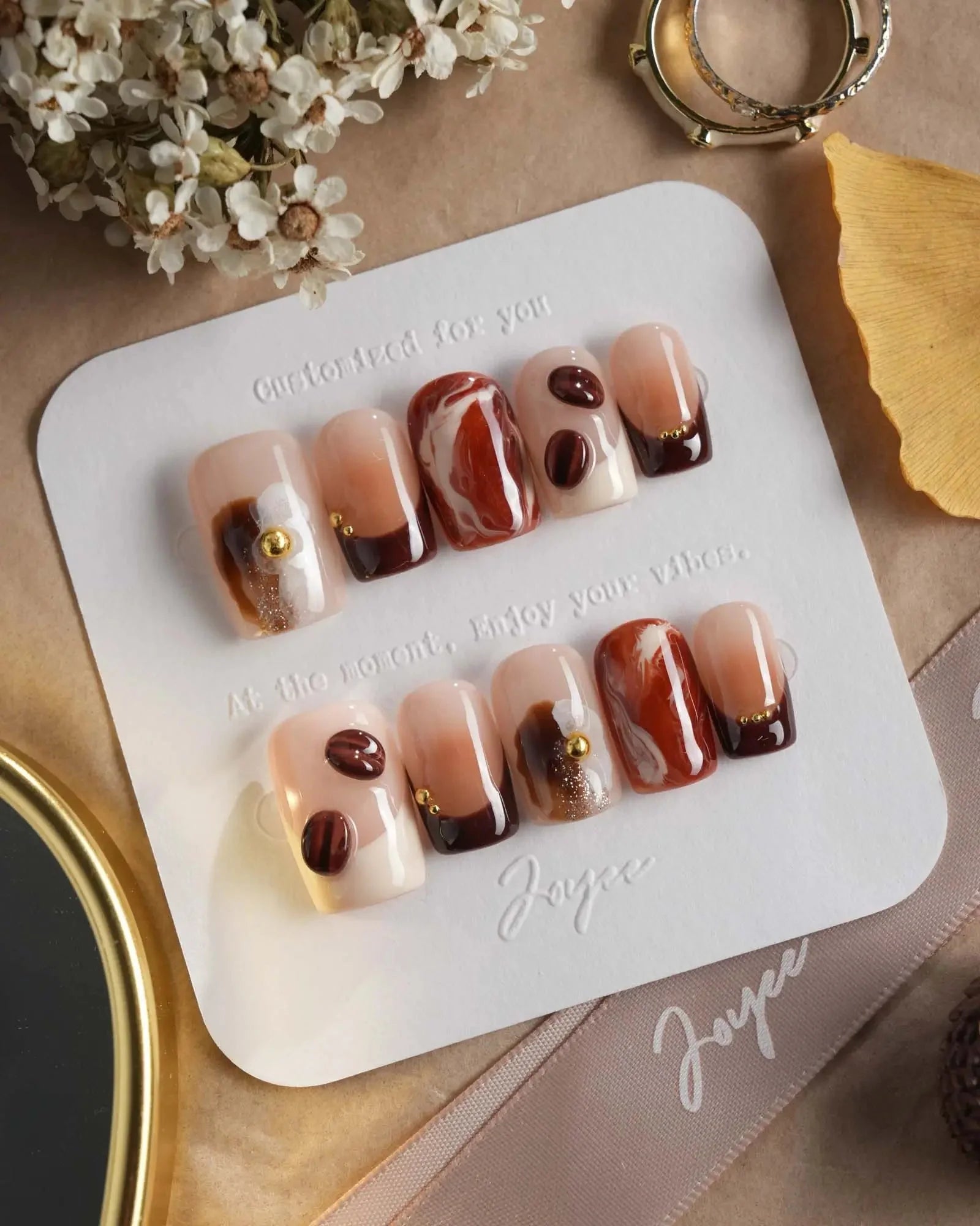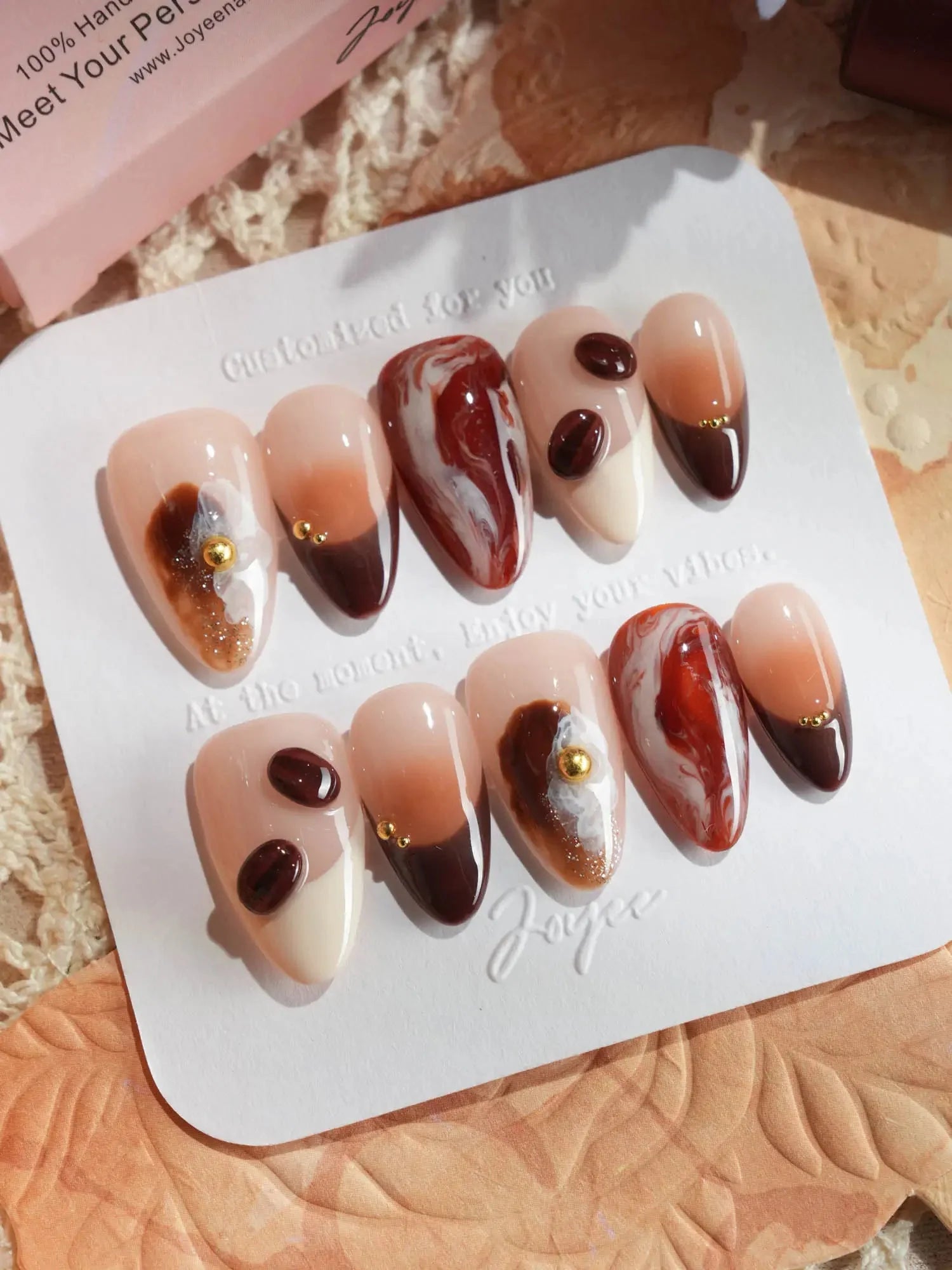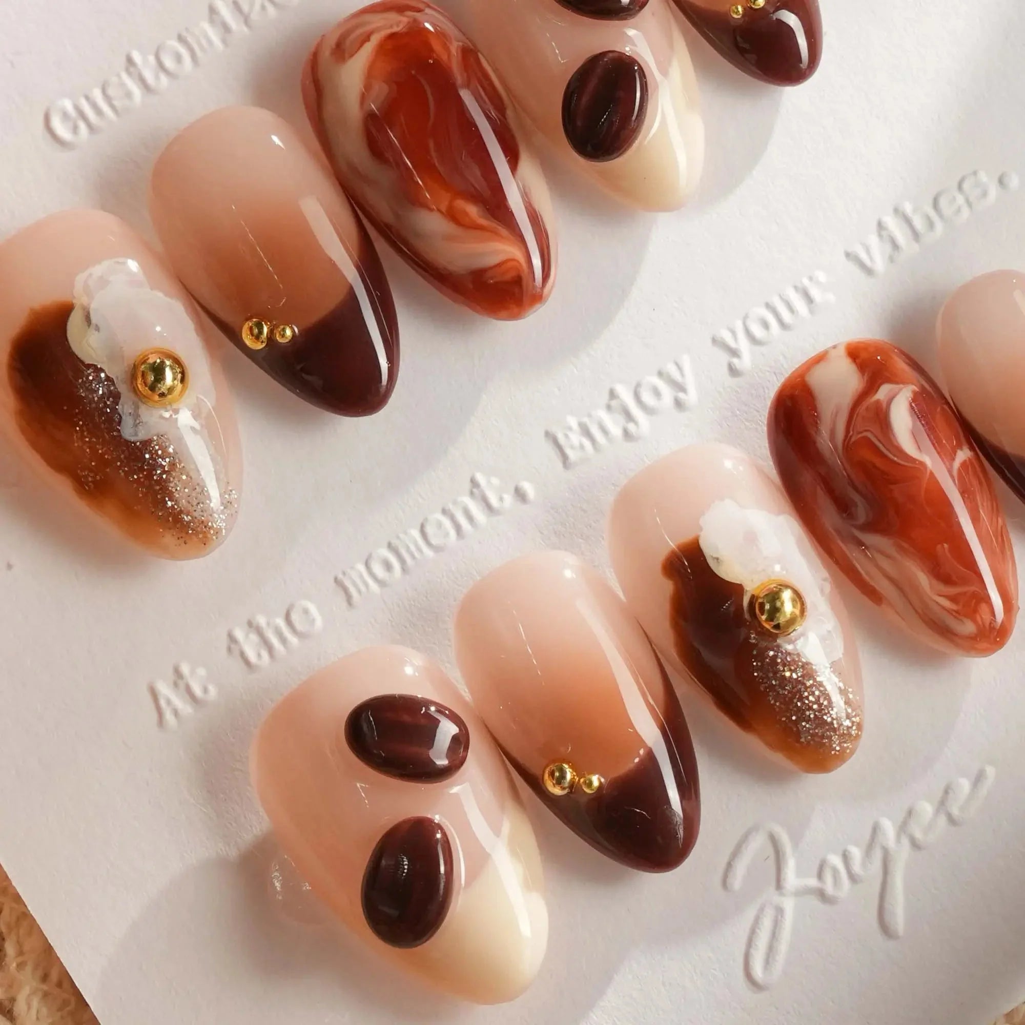 Inspired by the aroma of morning lattes, this set features creamy milk tones, caramel swirls, and 3D coffee bean accents. Pair with your favorite mug—because nails can smell like cozy mornings too.