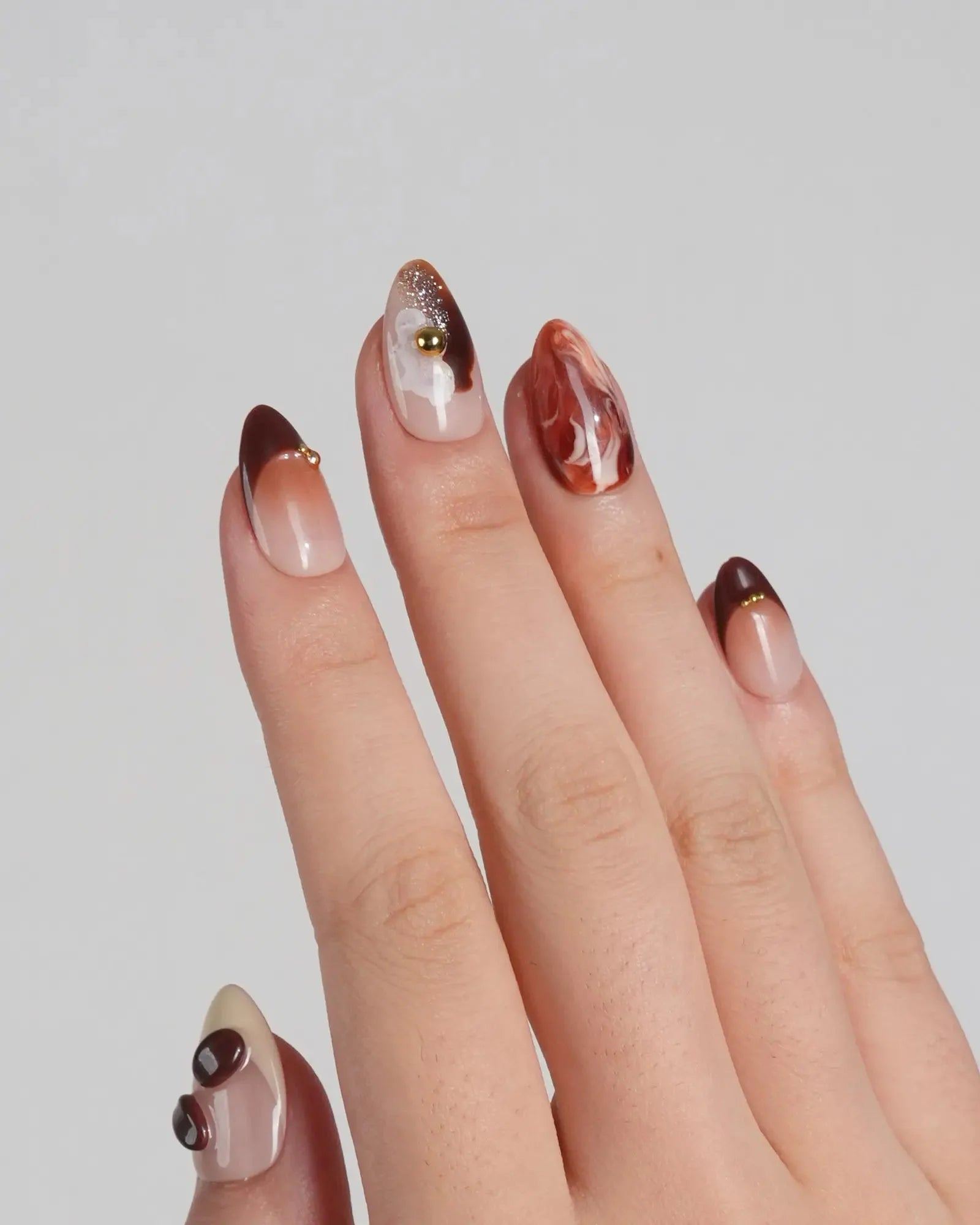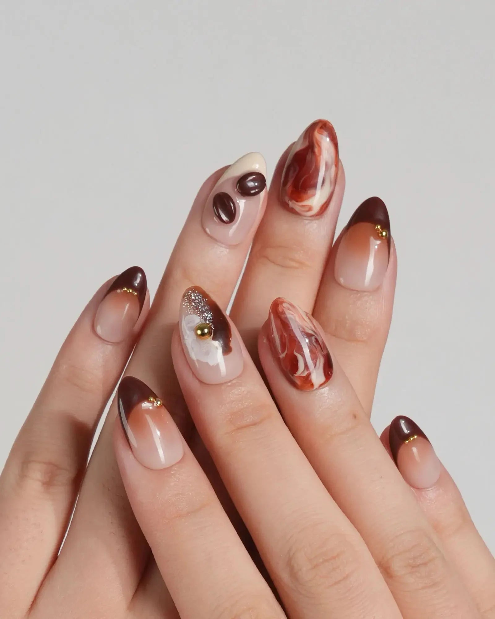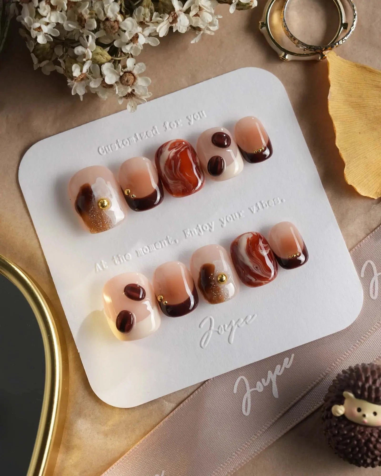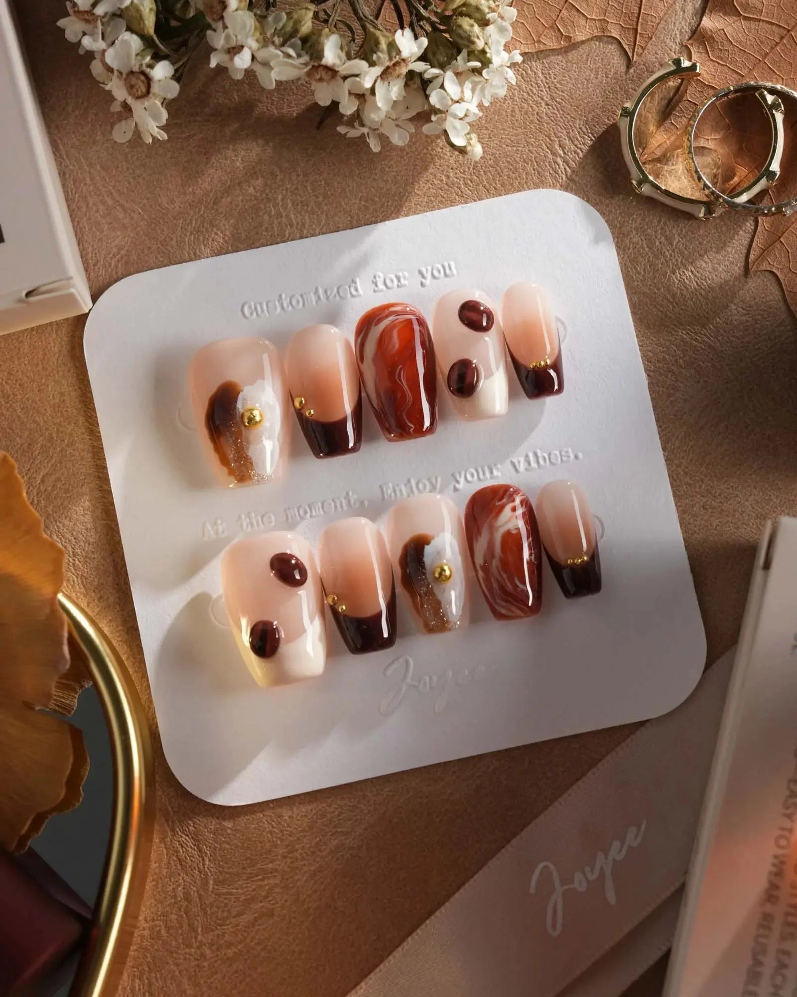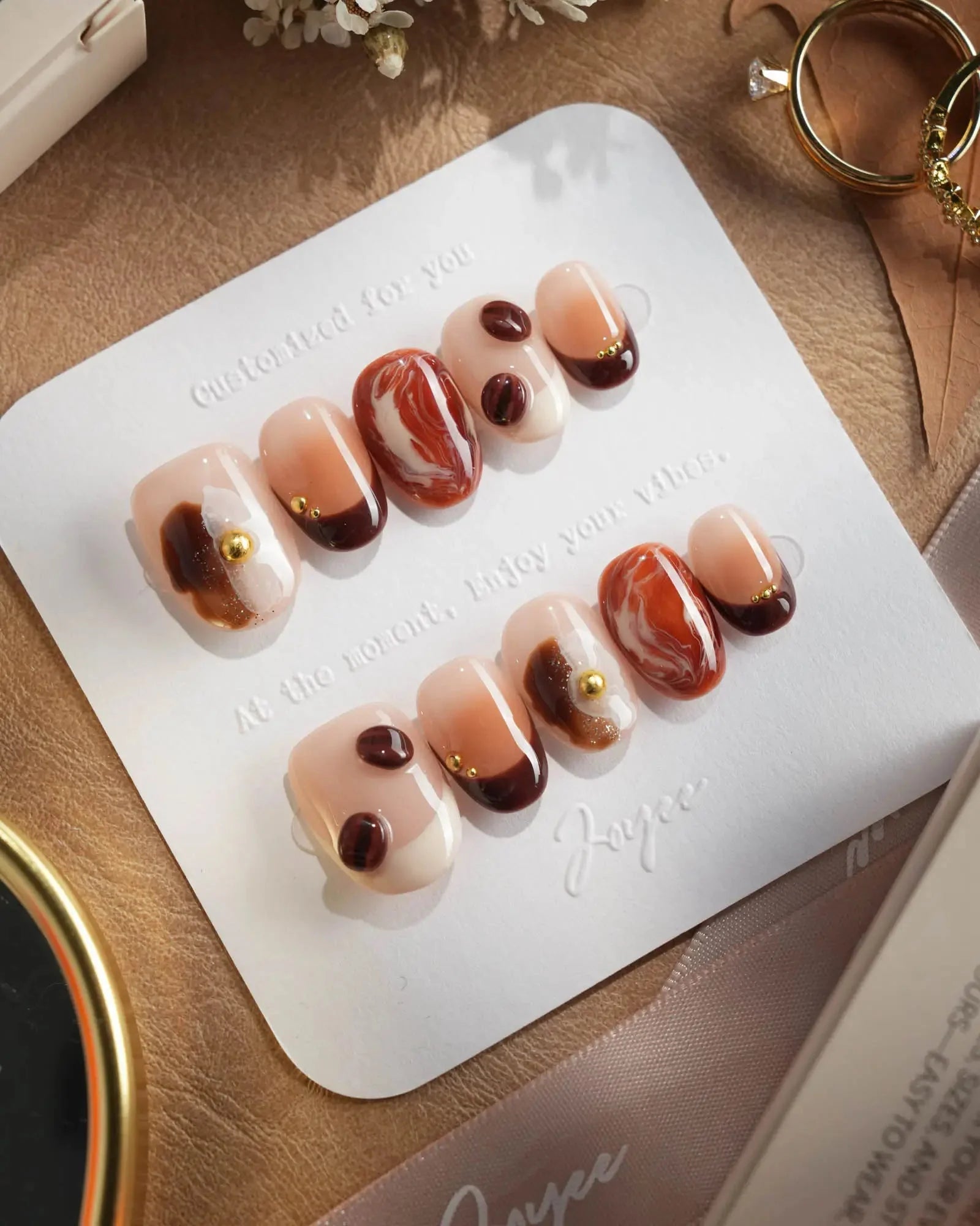 Inspired by the aroma of morning lattes, this set features creamy milk tones, caramel swirls, and 3D coffee bean accents. Pair with your favorite mug—because nails can smell like cozy mornings too.