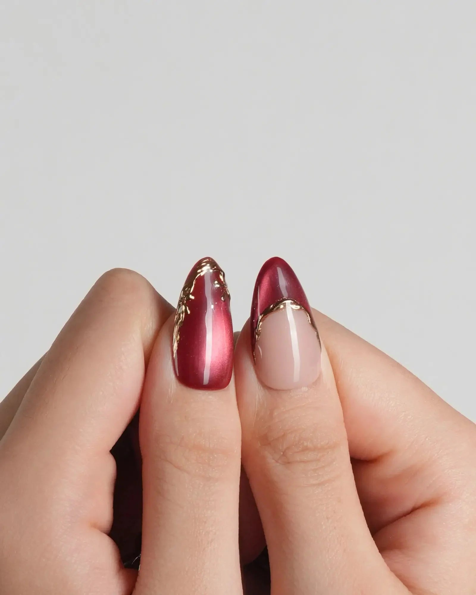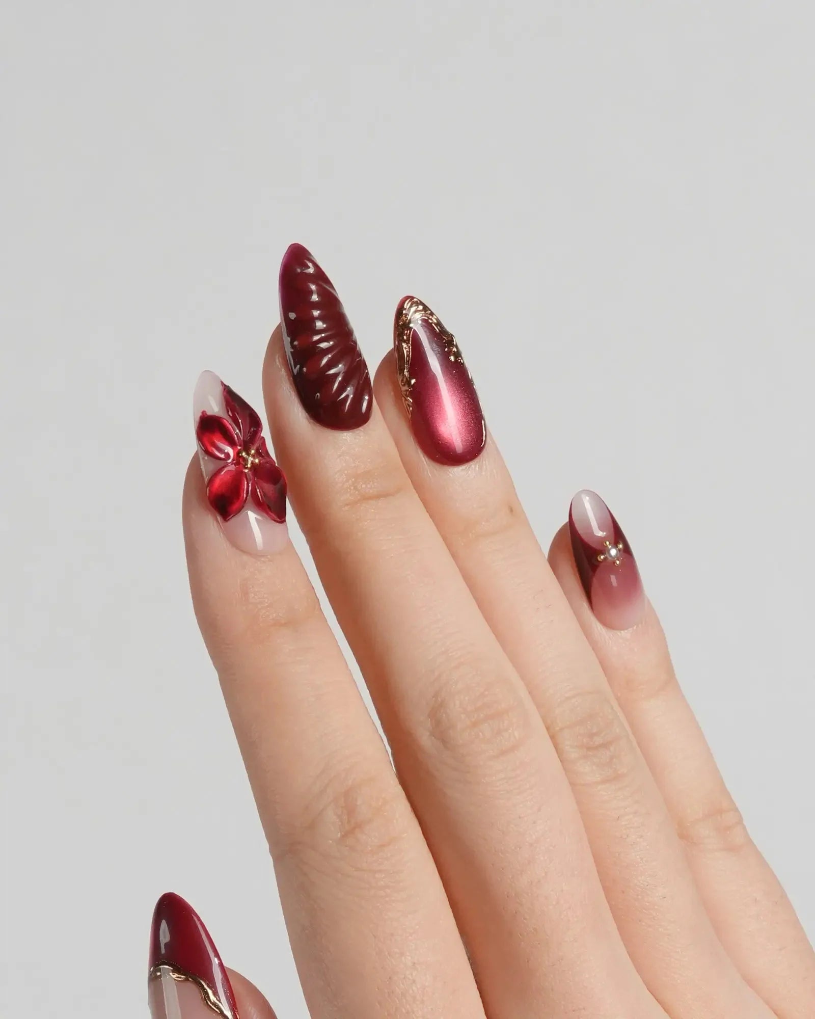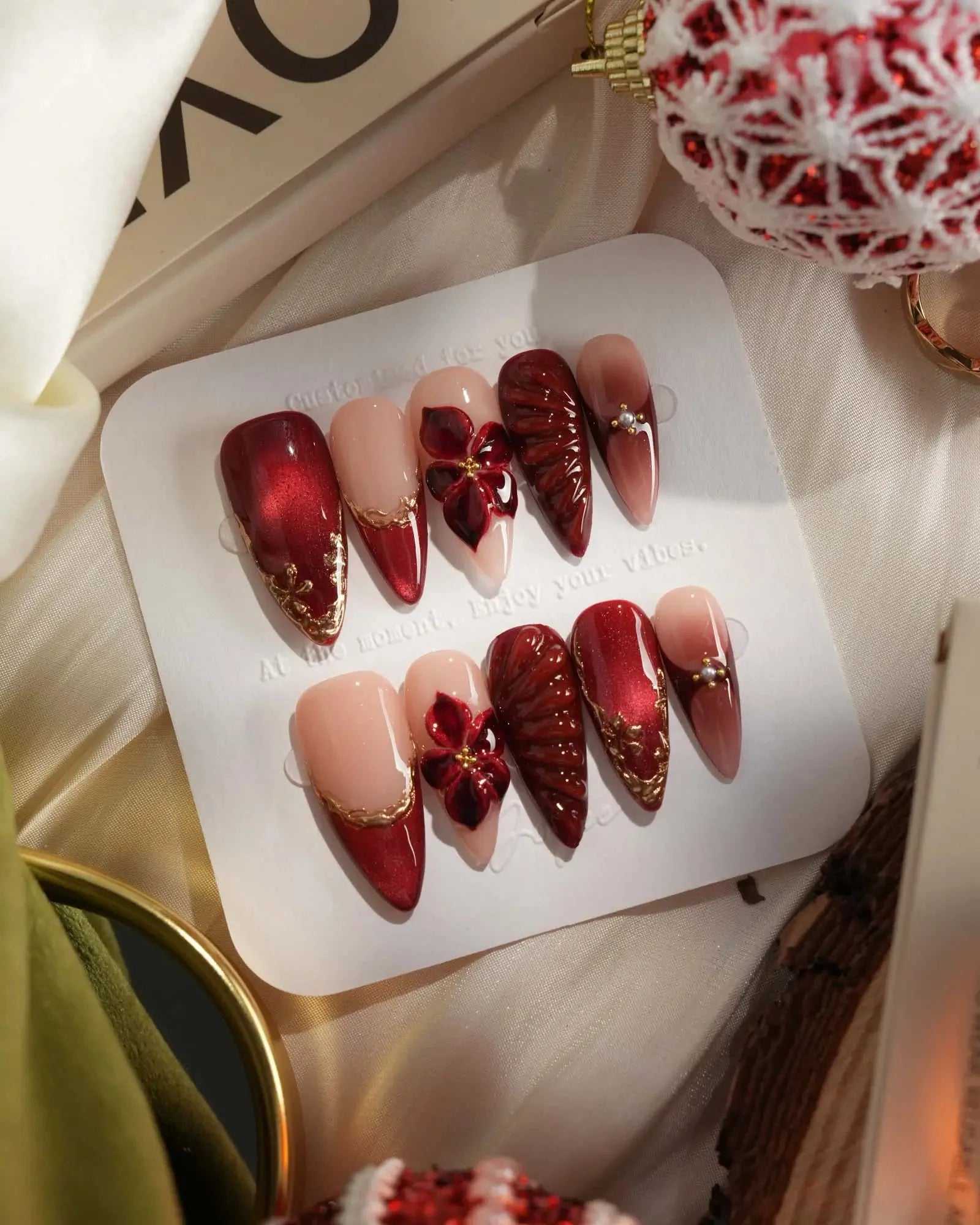 Handcrafted with red cat-eye polish and 3D lily petals, this set blends luxury with modern femininity. The golden French accents elevate its design, making it perfect for festive gatherings or elegant nights out. Lightweight, reusable, and customizable in shape and length, these nails redefine sophistication in every detail.