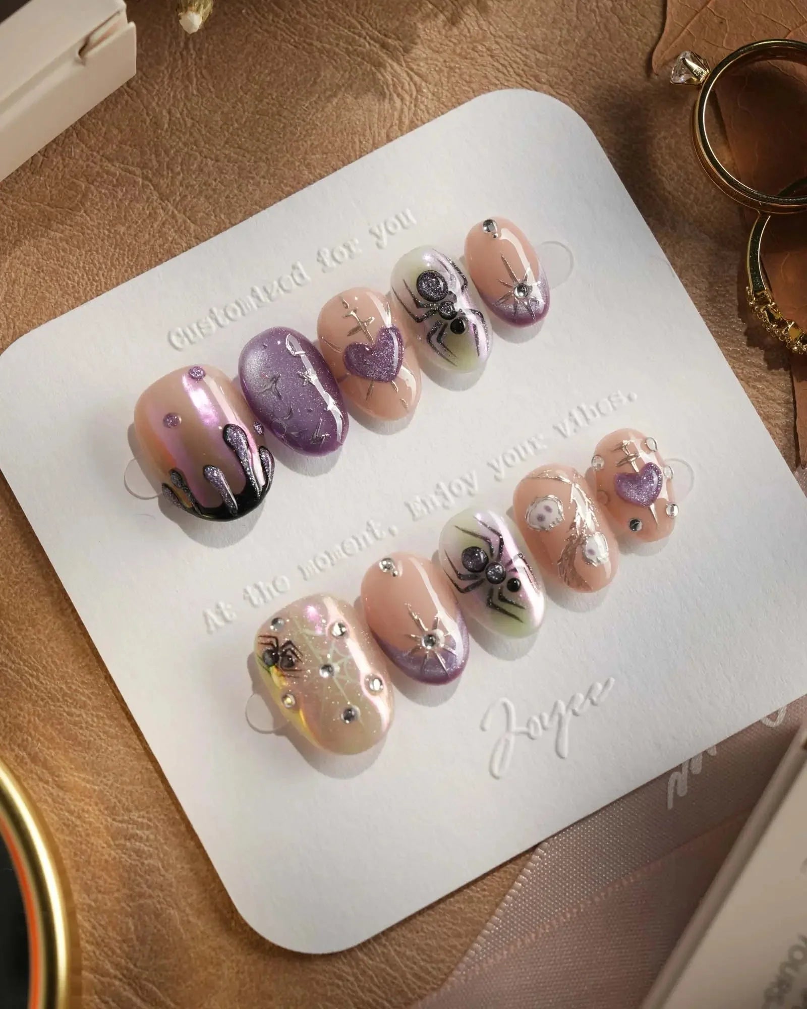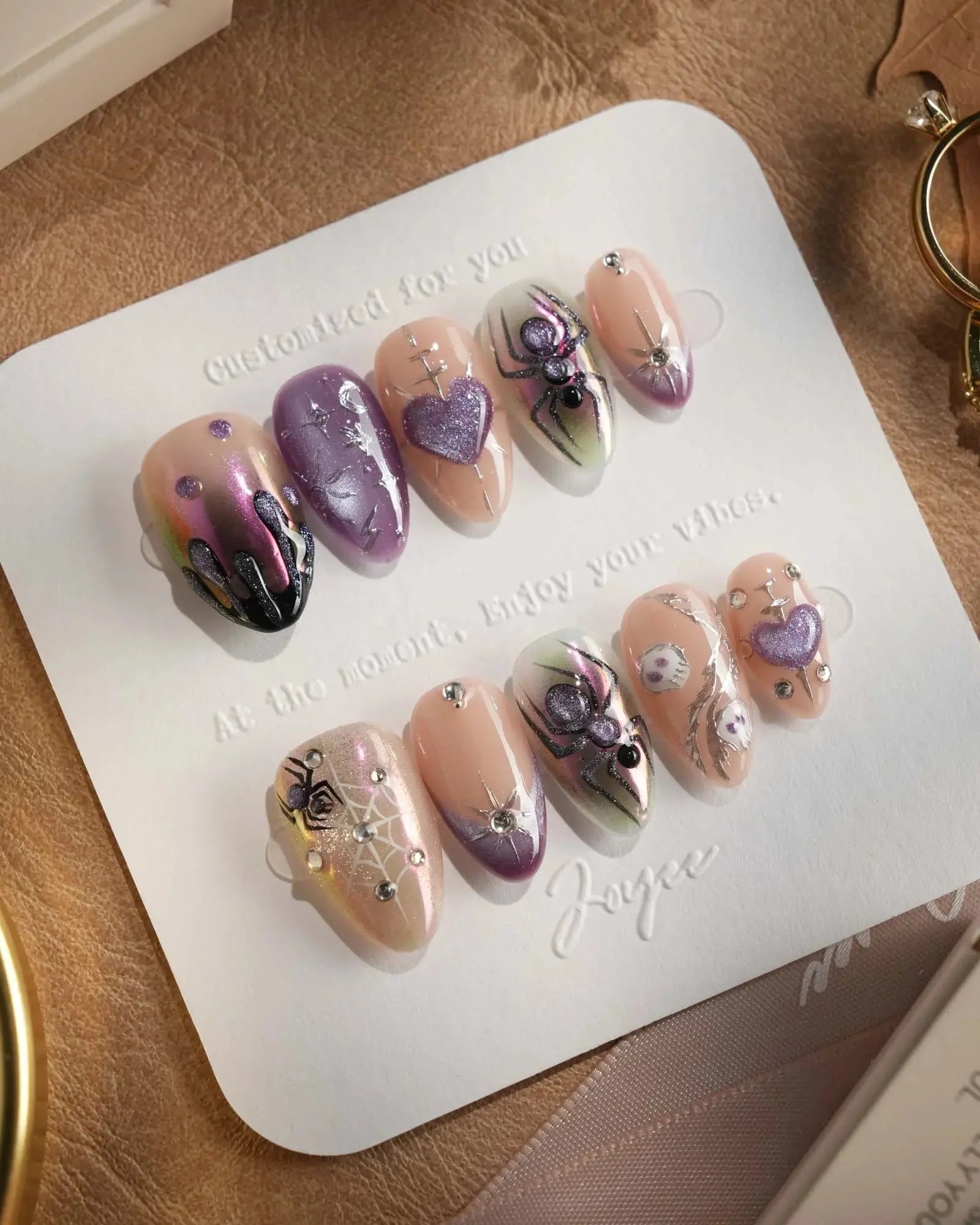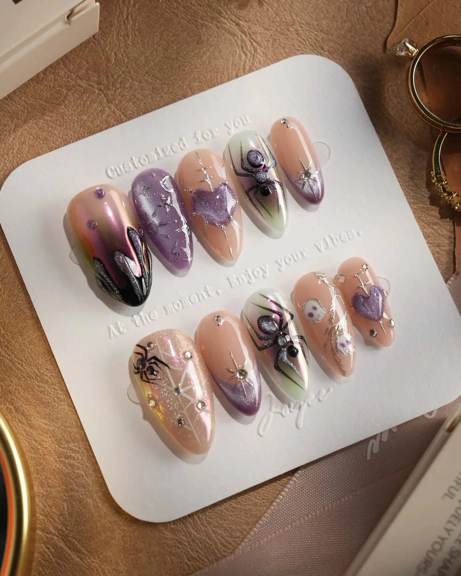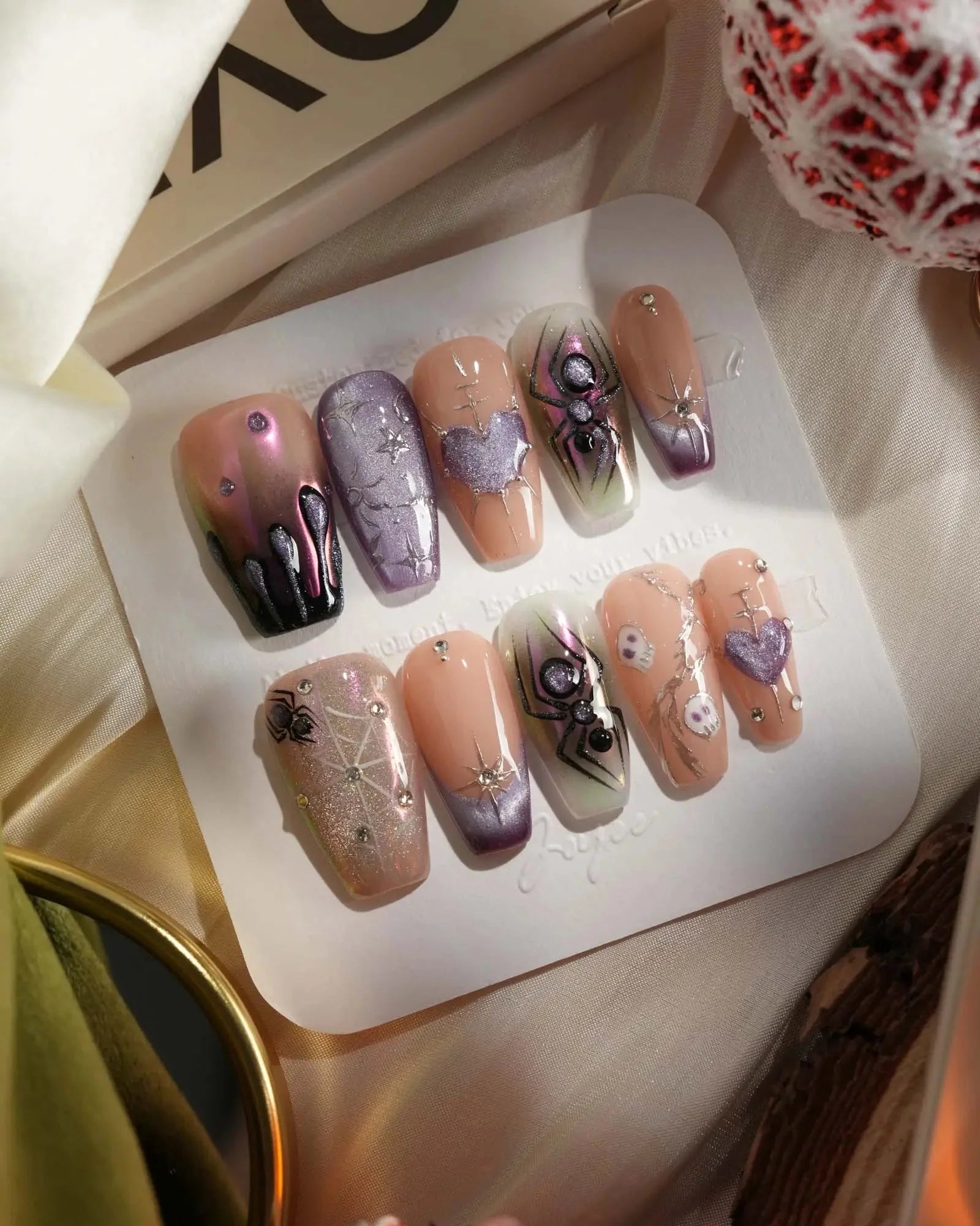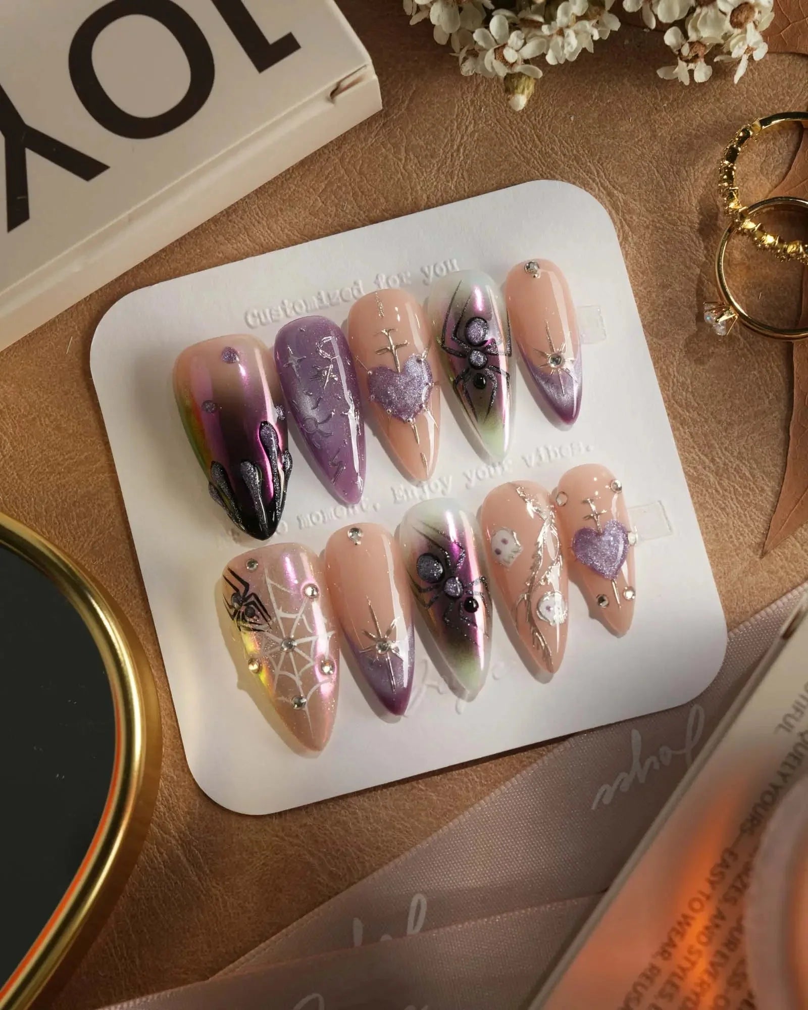 Step into spooky elegance with these purple spider nails designed for Halloween. Featuring 3D spiders, chrome accents, and cat eye shimmer, each nail is handmade for a refined gothic vibe. Customizable in shape and length, these short almond nails are also reusable, making them perfect for parties, cosplay, and festive nights.