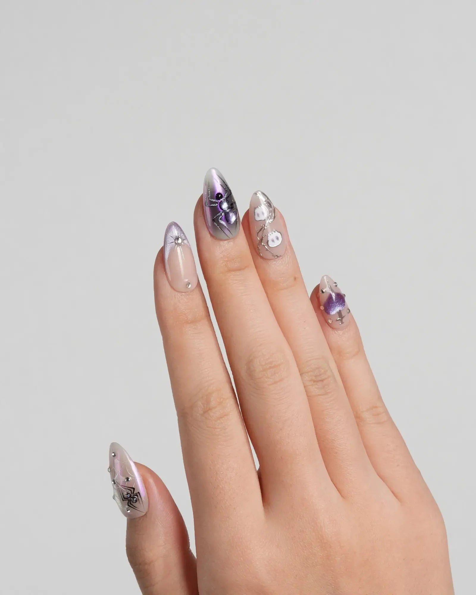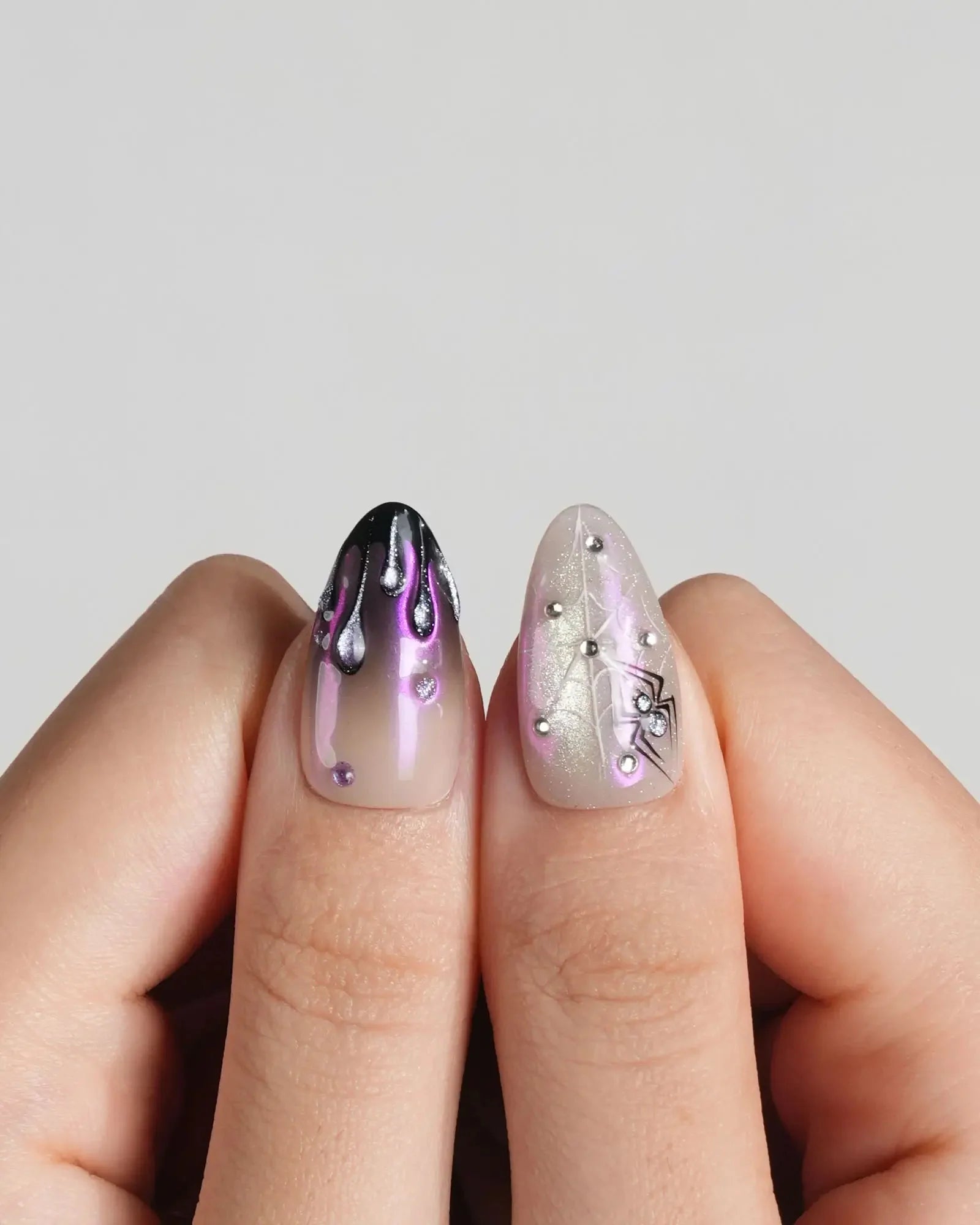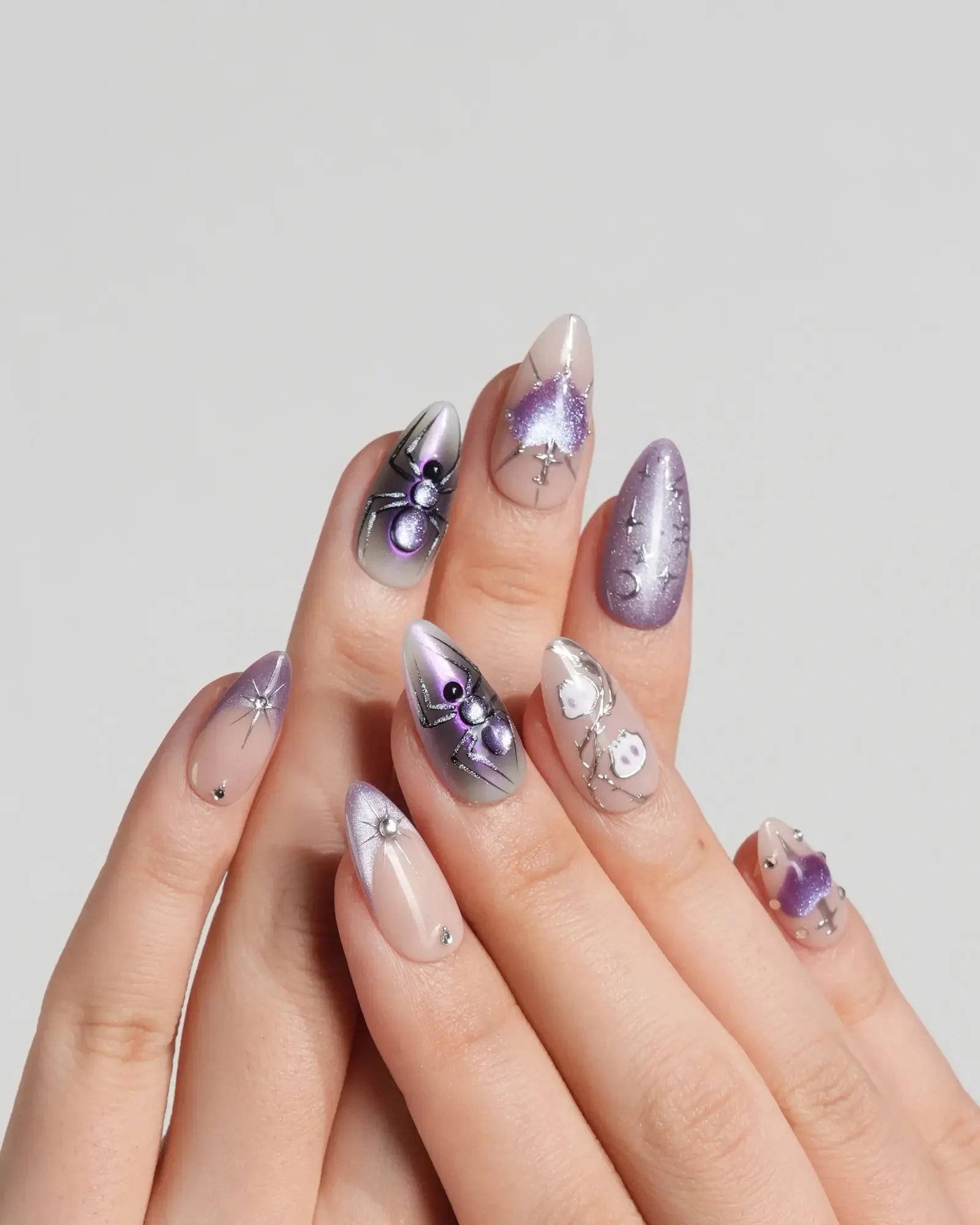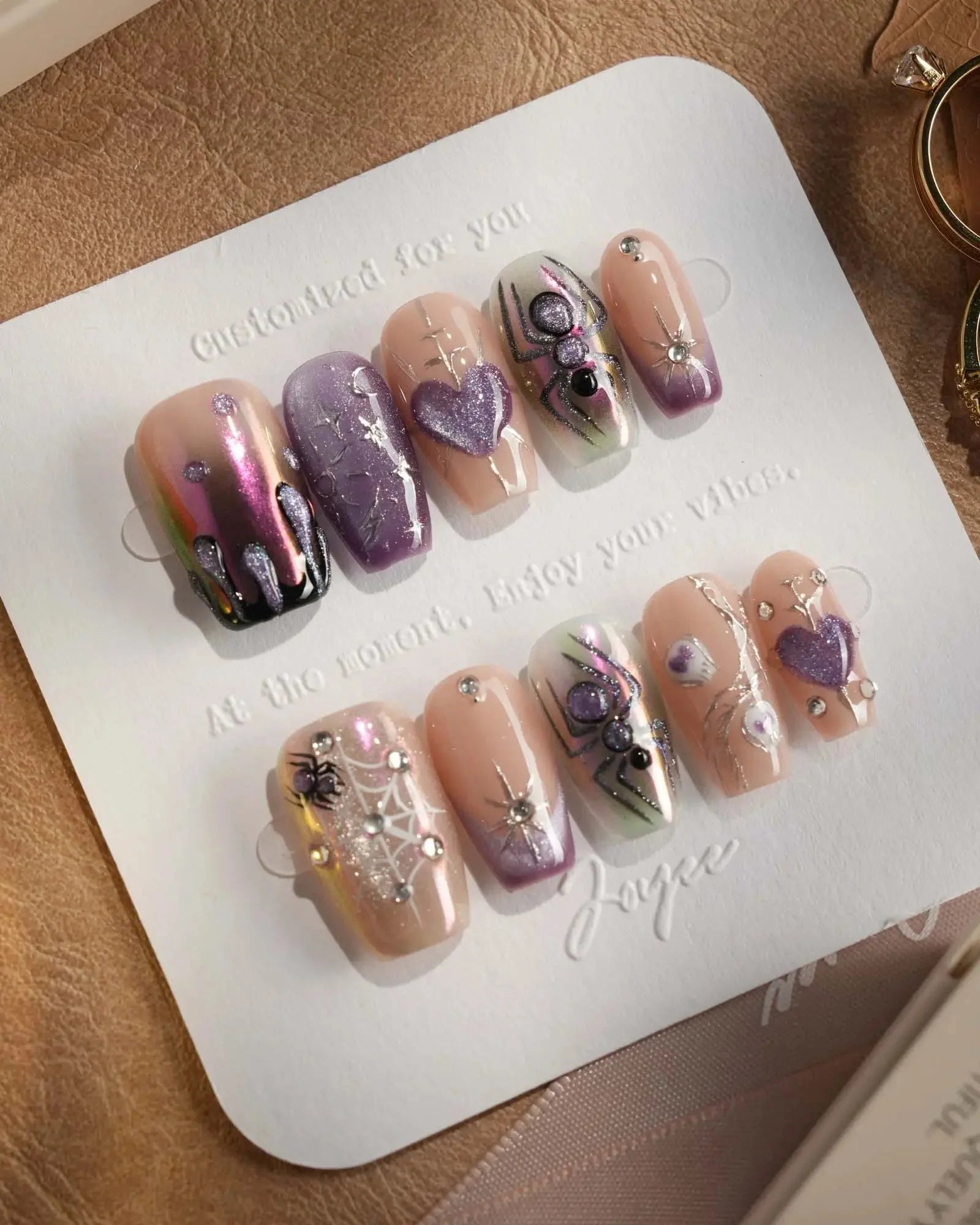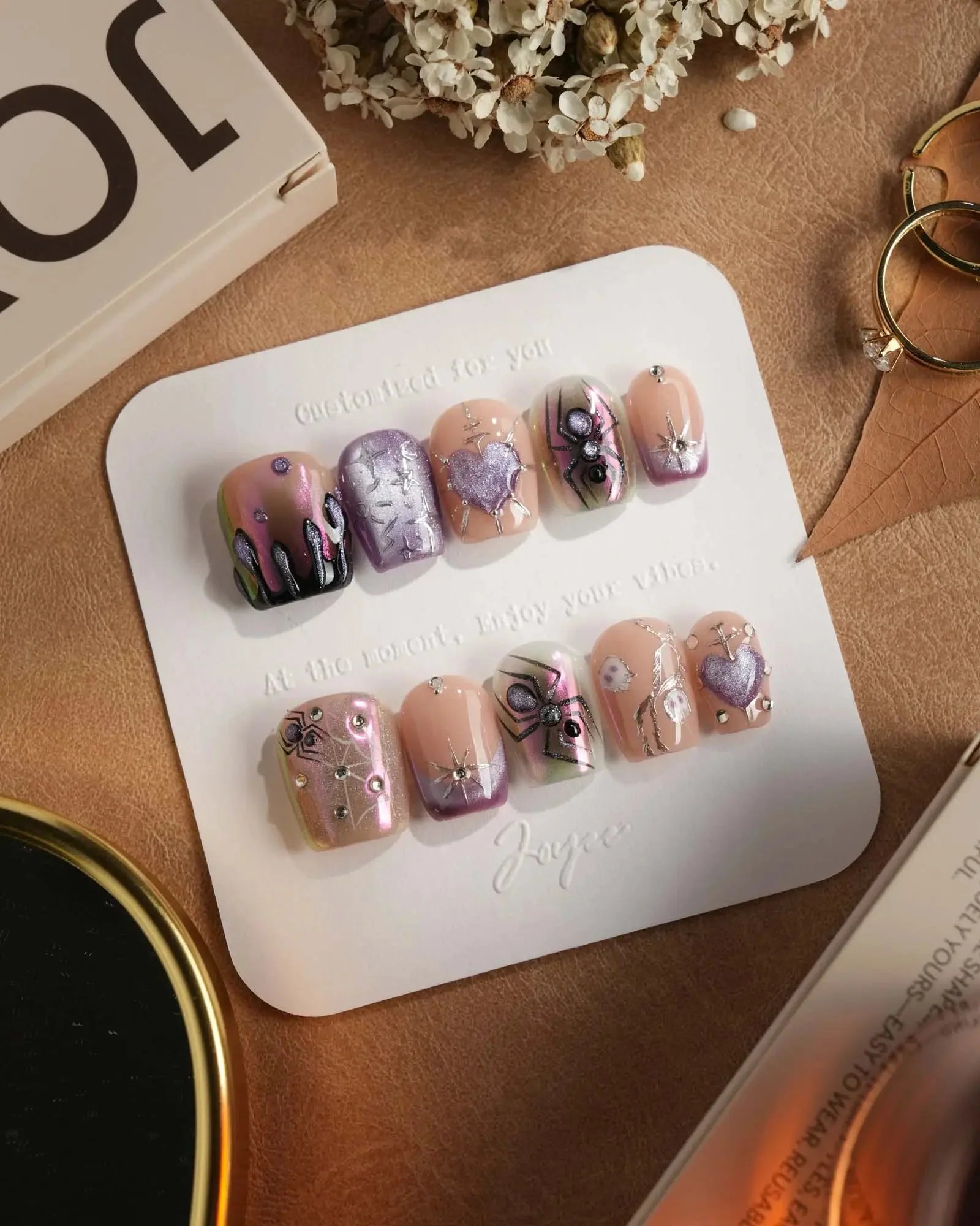 Step into spooky elegance with these purple spider nails designed for Halloween. Featuring 3D spiders, chrome accents, and cat eye shimmer, each nail is handmade for a refined gothic vibe. Customizable in shape and length, these short almond nails are also reusable, making them perfect for parties, cosplay, and festive nights.