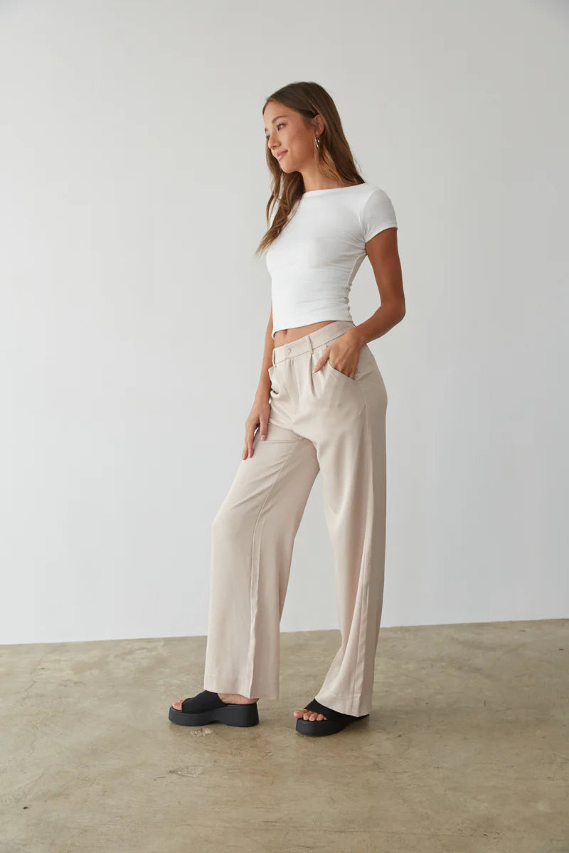 Look instantly polished in the Lyna Wide Leg Trouser Pants! These chic wide leg pants feature a high banded waist, zipper and button fly, and full length hems. Pair with the Aubrey Butter Soft Baby Tee to complete the look!