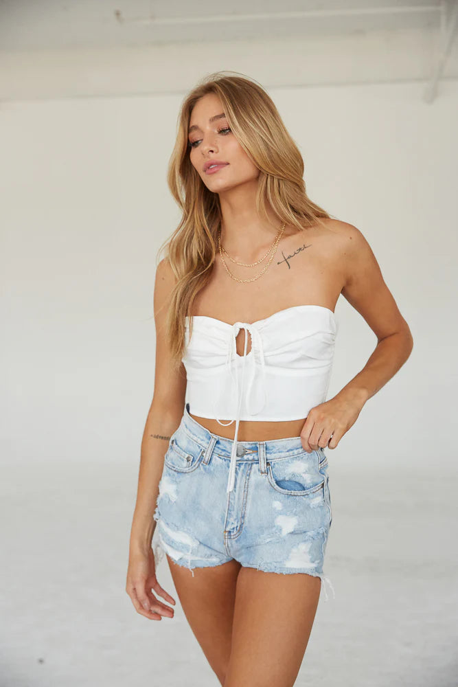 Get ready for your next vacay in the Madrid Crop Top! This essential top can be styled to your favorite fit: a classic halter, tube top, and so much more! Featuring silicone grips for a stay on fit. Available in white and sage green. Finish this summer look with the Rolla's Dusters Shorts in Sylvie Blue!