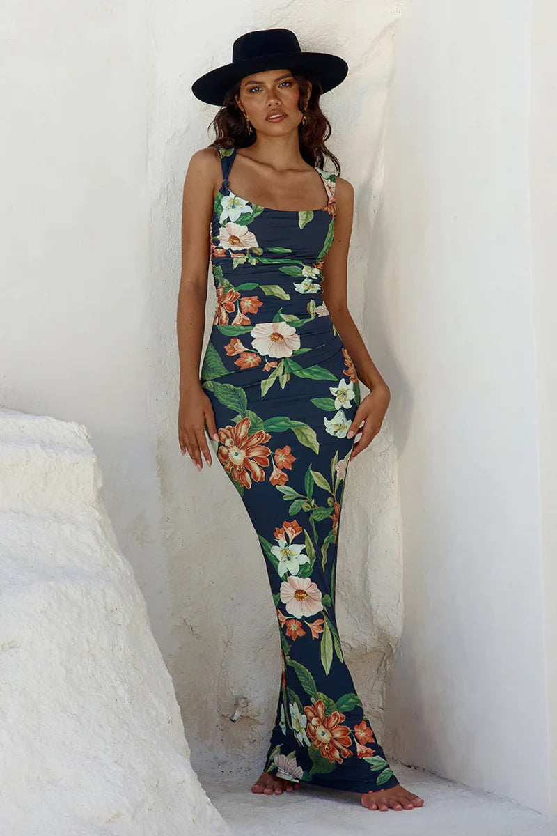 Crafted from a luxe second skin fabric, our Maiori Maxi Dress hugs the body with ruching around the waist, all in a sultry dark floral print. Accessorize to finish off the look!