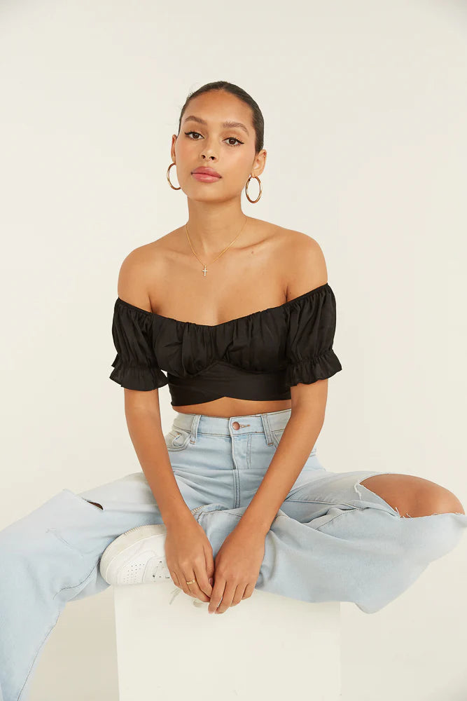 Lookin' cute in the Mara Puff Crop Top! Featuring a sweetheart neckline with a ruched bust, short puff sleeves with a ruffle trim, and a wrap waist tie for a flirty final touch. Available in pink and black.