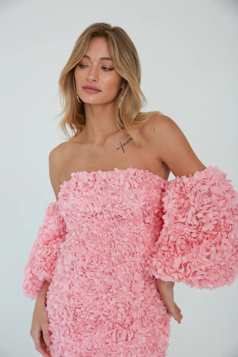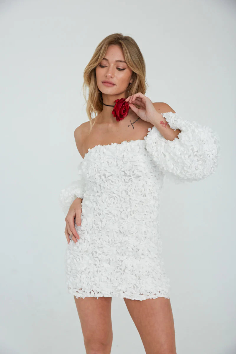 Jumpstart spring with the Maylie Flower Applique Dress! This fun dress features a shift silhouette, straight across neckline, and off the shoulder puff sleeves. Available in white and pink. Pair with a cute pair of heels to complete the look!