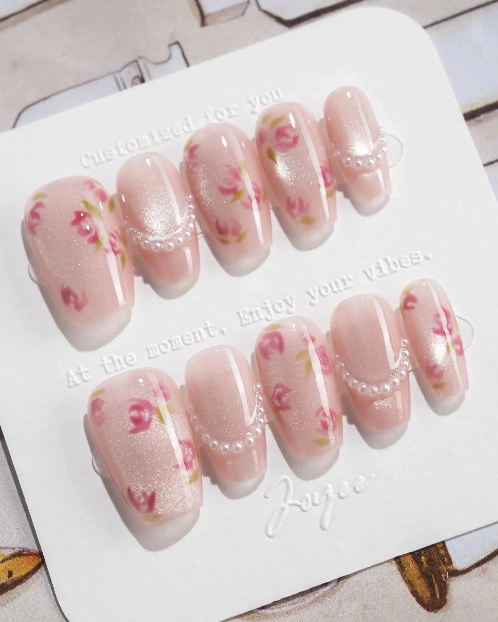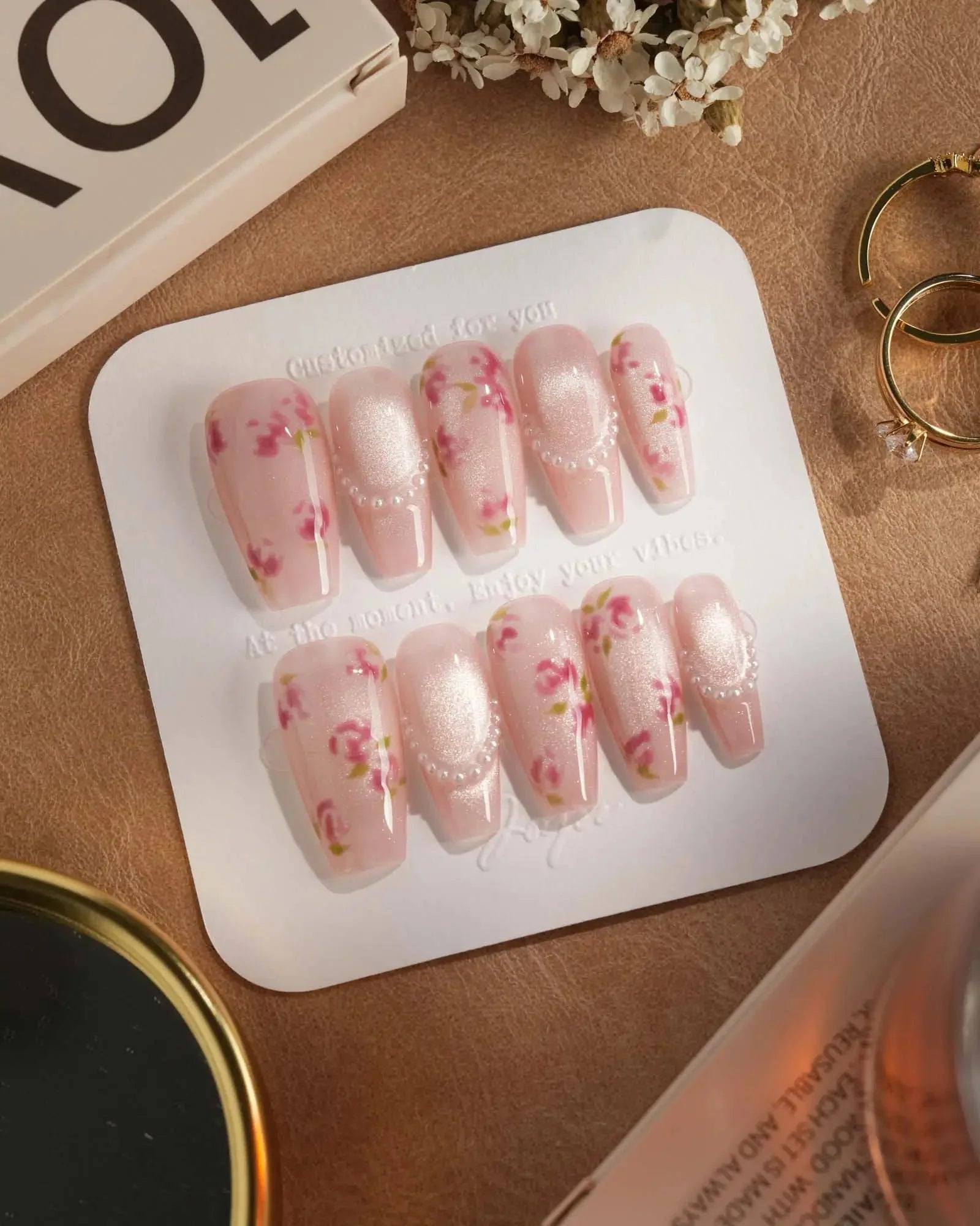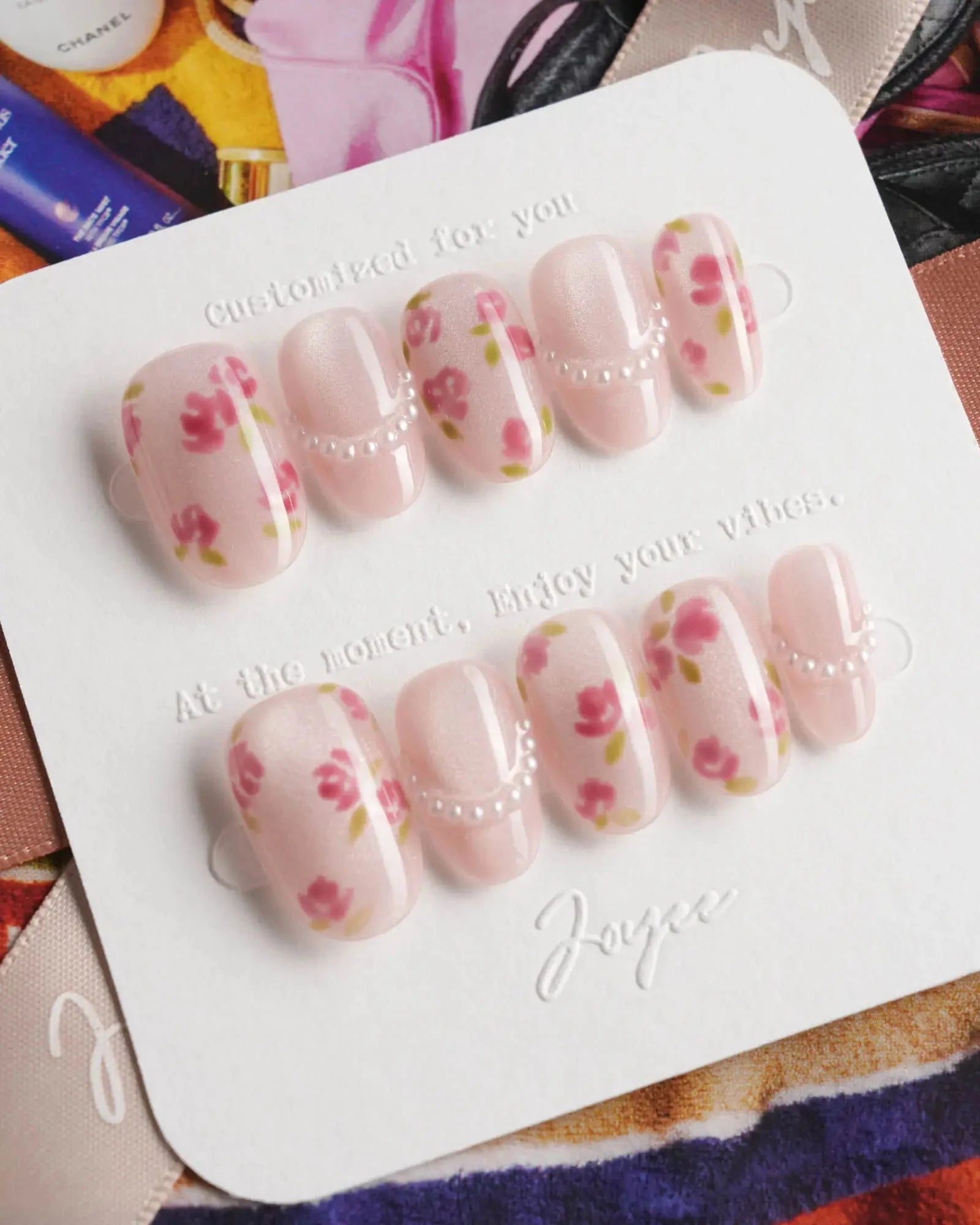 Welcome the warmth of summer with these soft pink nails, decorated with vibrant floral prints and delicate pearl accents. The light pink base combined with tiny red blooms captures the easy, breezy feel of the season. Designed for garden picnics, beach vacations, or simply adding a fresh touch to your everyday summer looks.