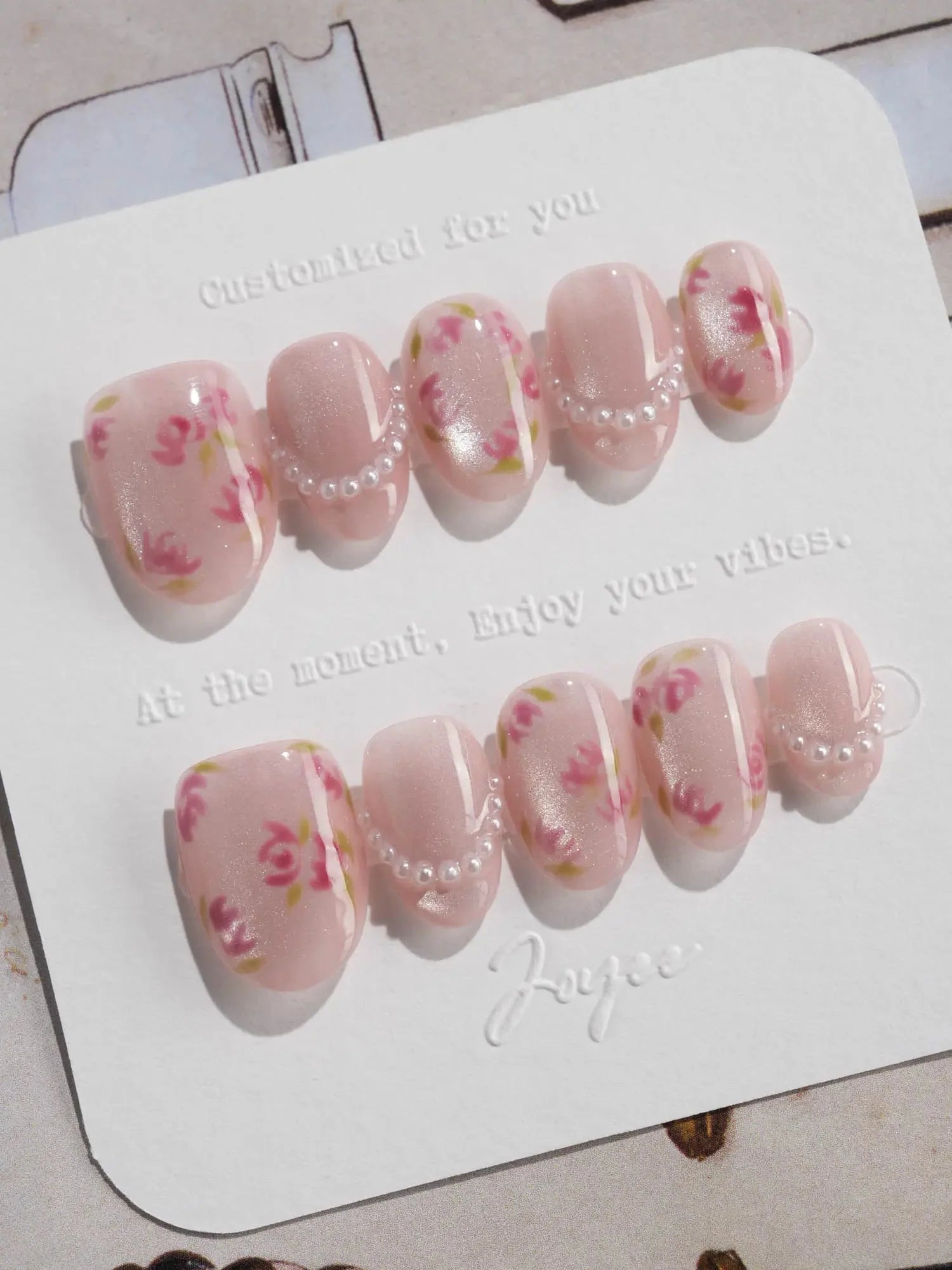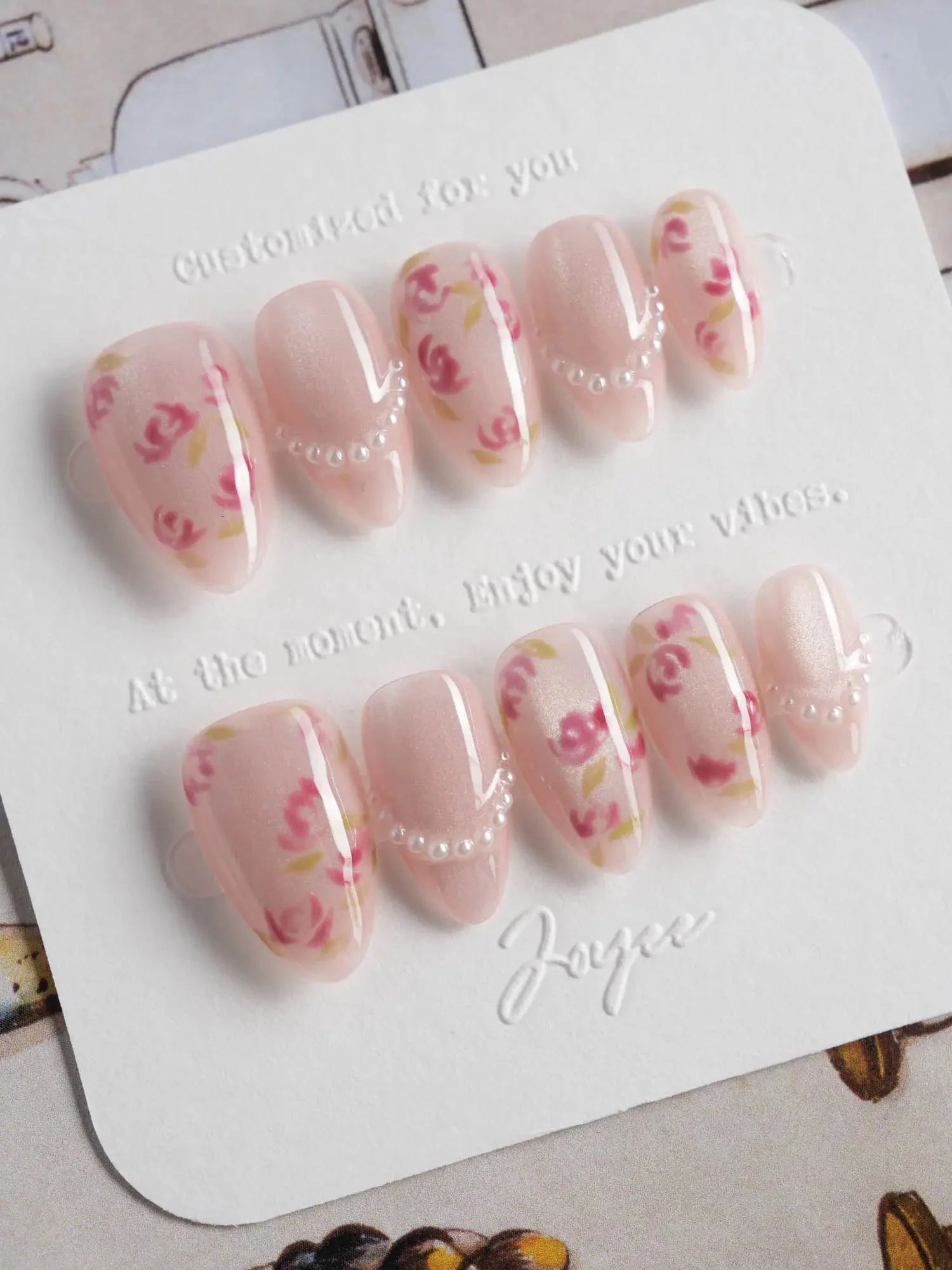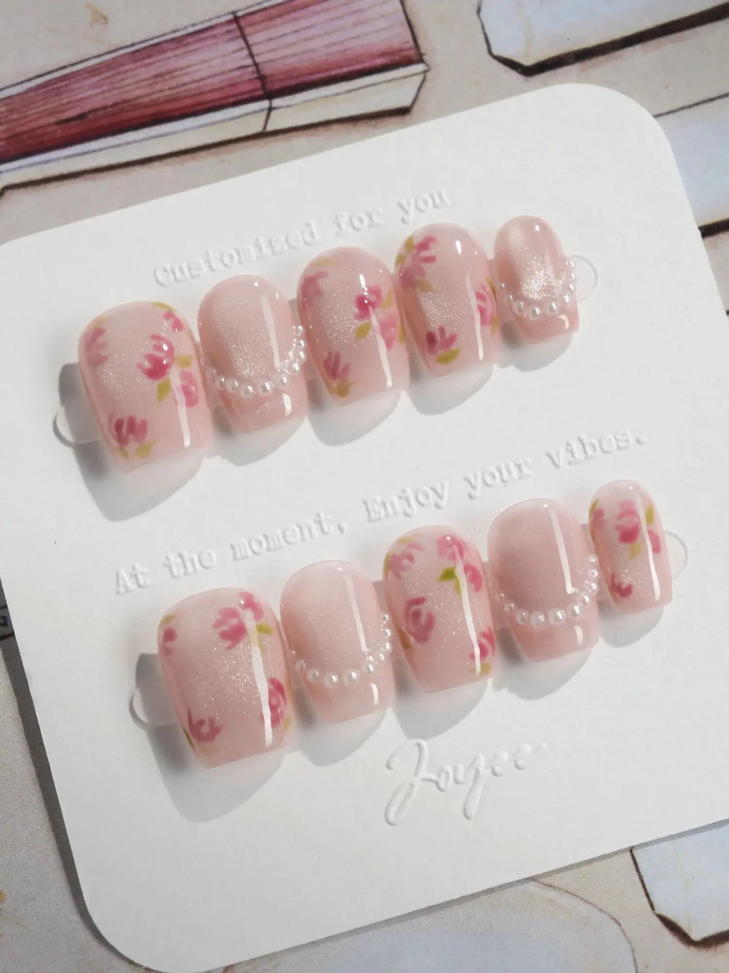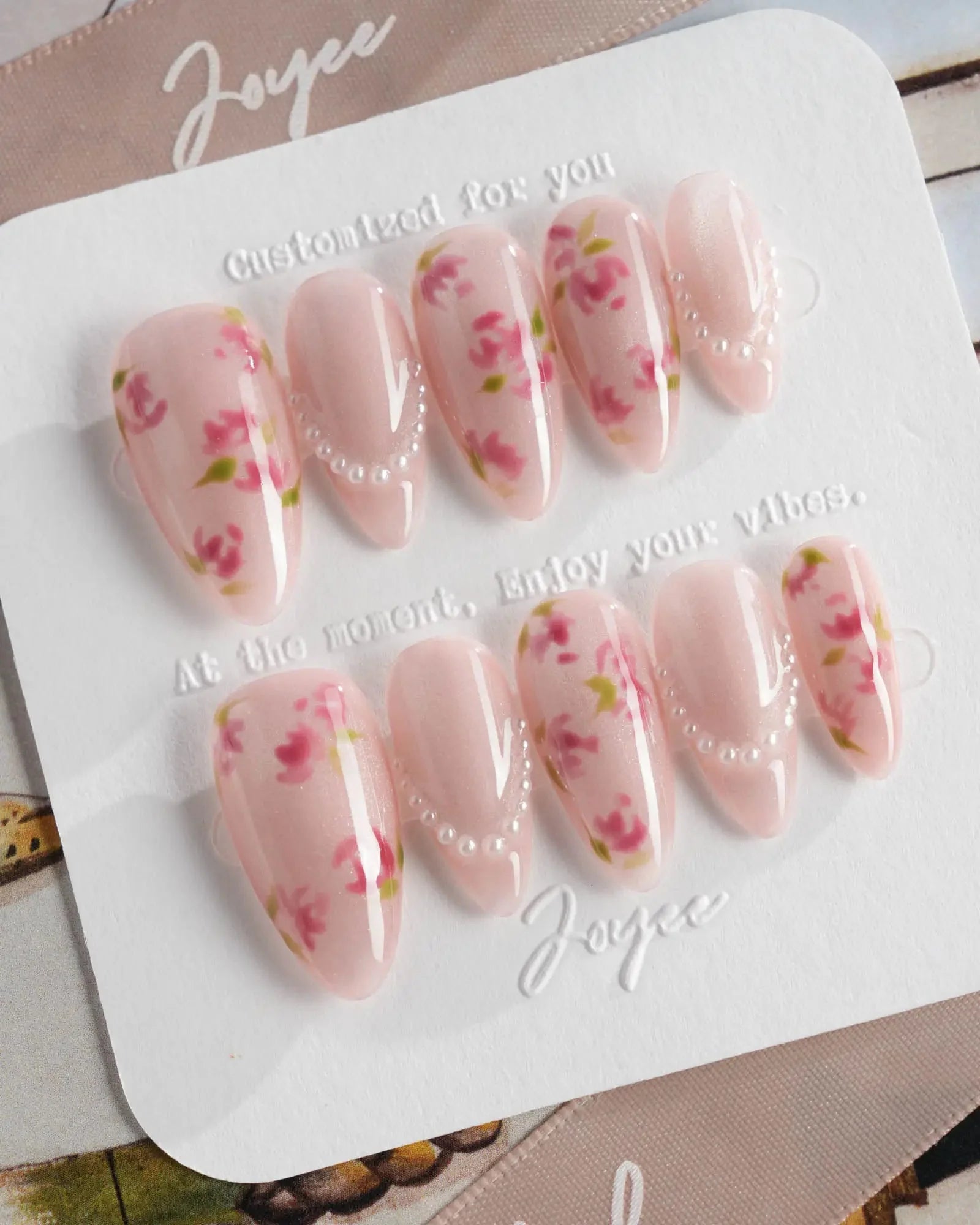 Welcome the warmth of summer with these soft pink nails, decorated with vibrant floral prints and delicate pearl accents. The light pink base combined with tiny red blooms captures the easy, breezy feel of the season. Designed for garden picnics, beach vacations, or simply adding a fresh touch to your everyday summer looks.
