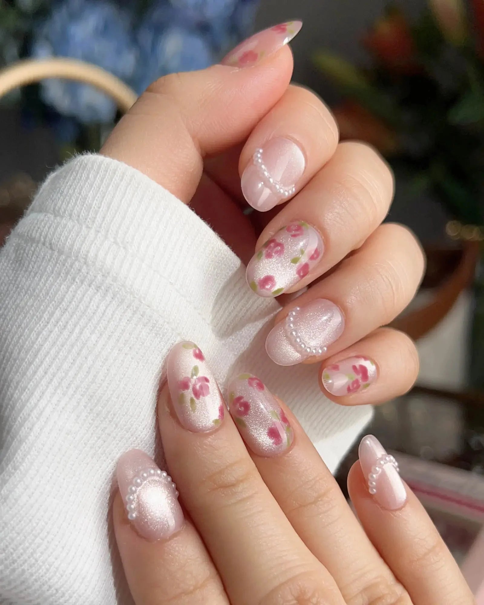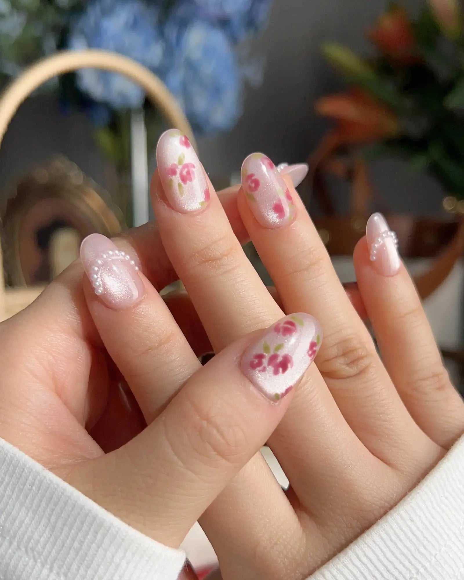 Pink Floral Nails with Pearls | Summer Bloom Charm